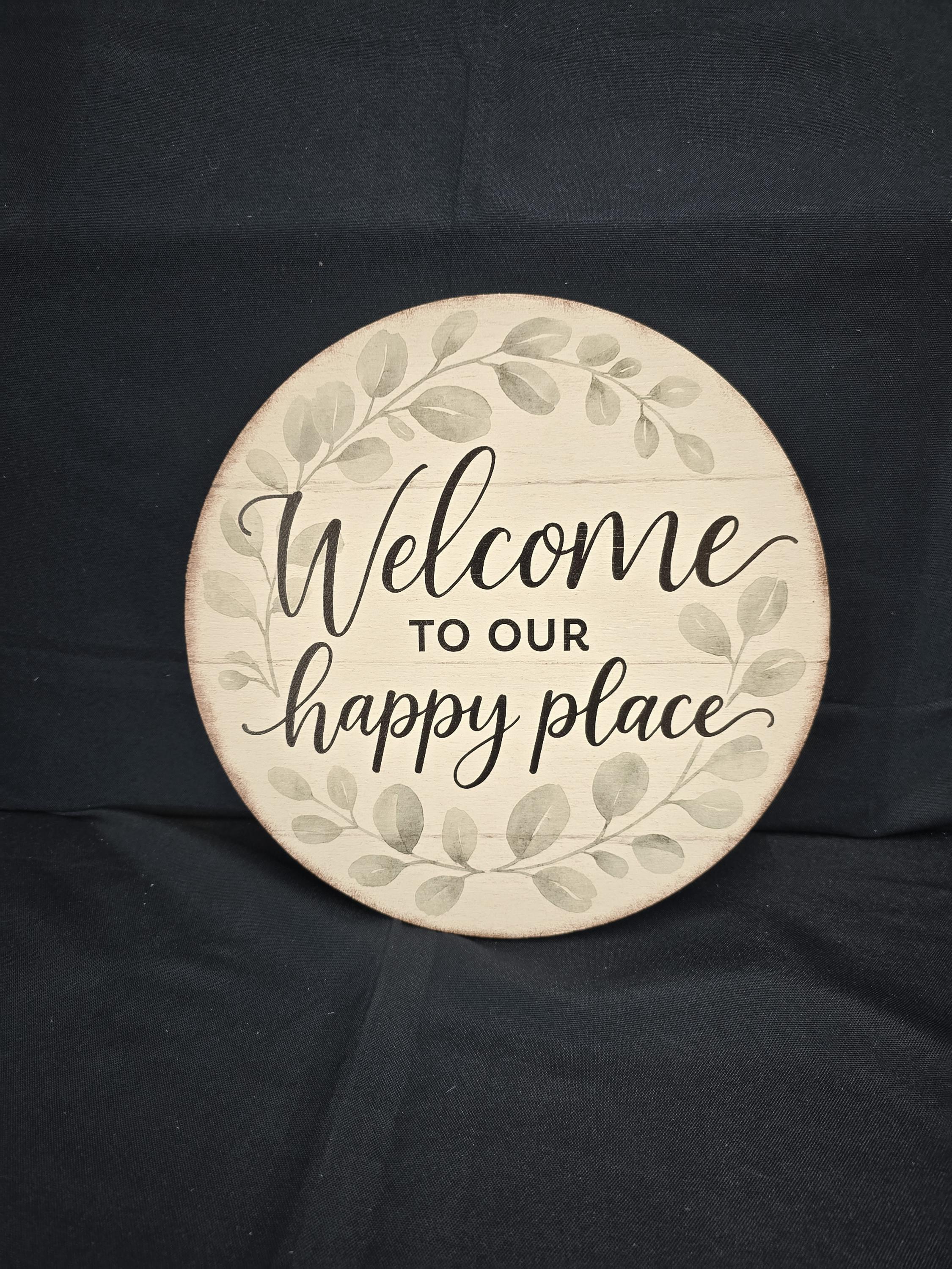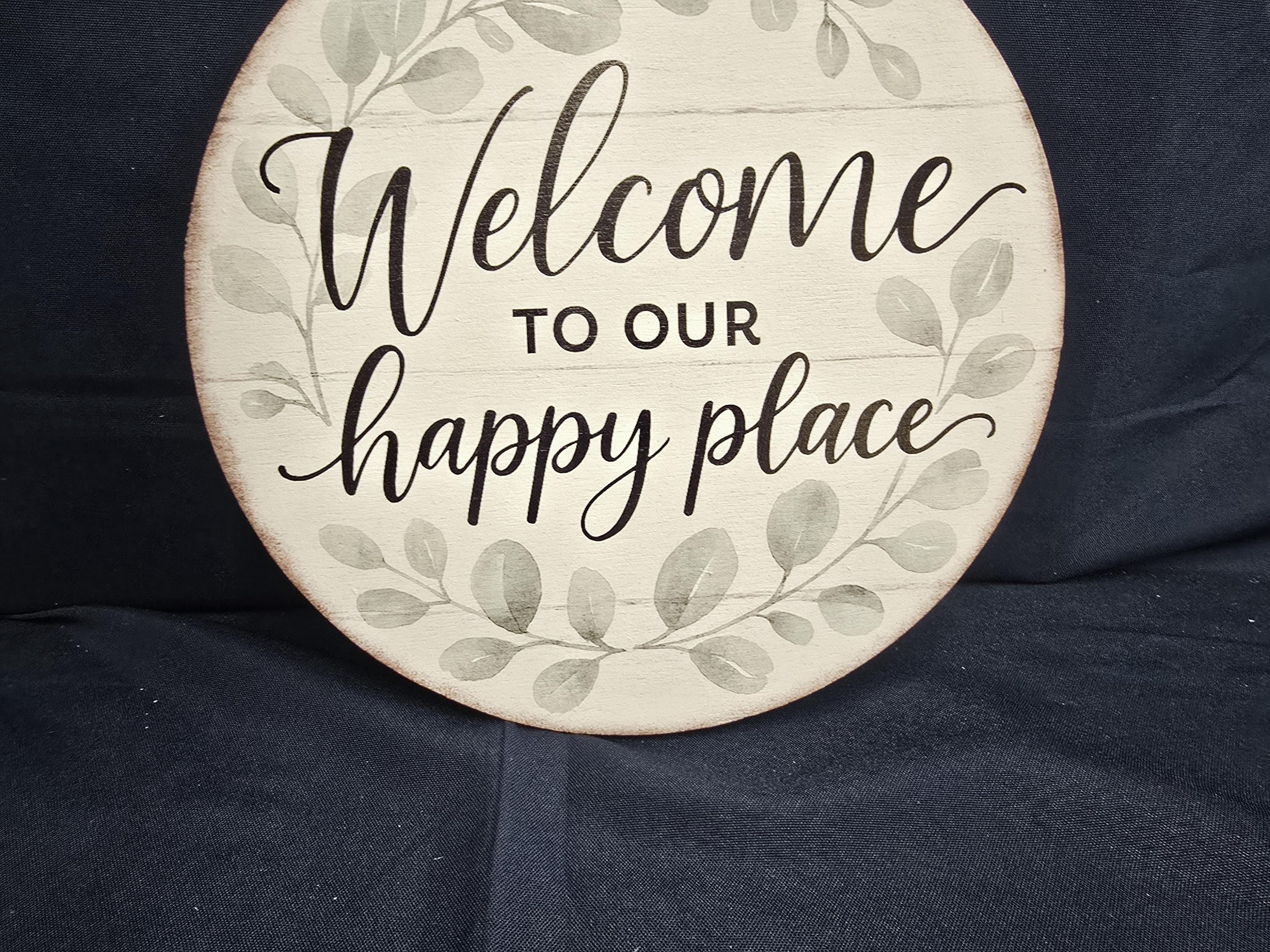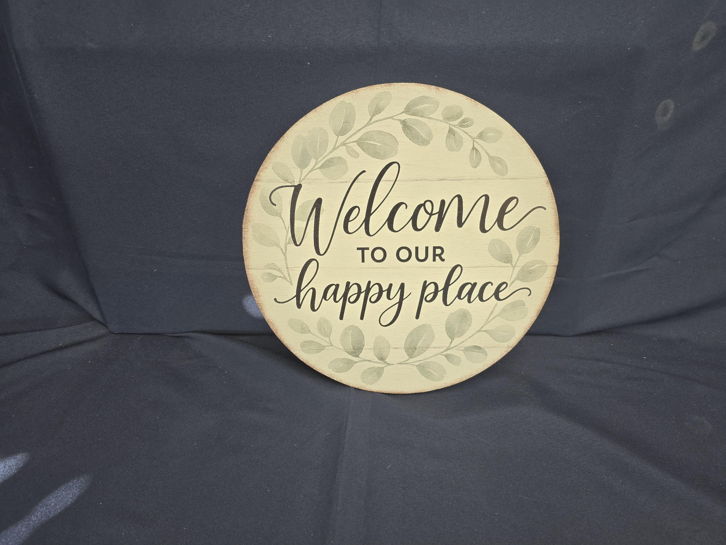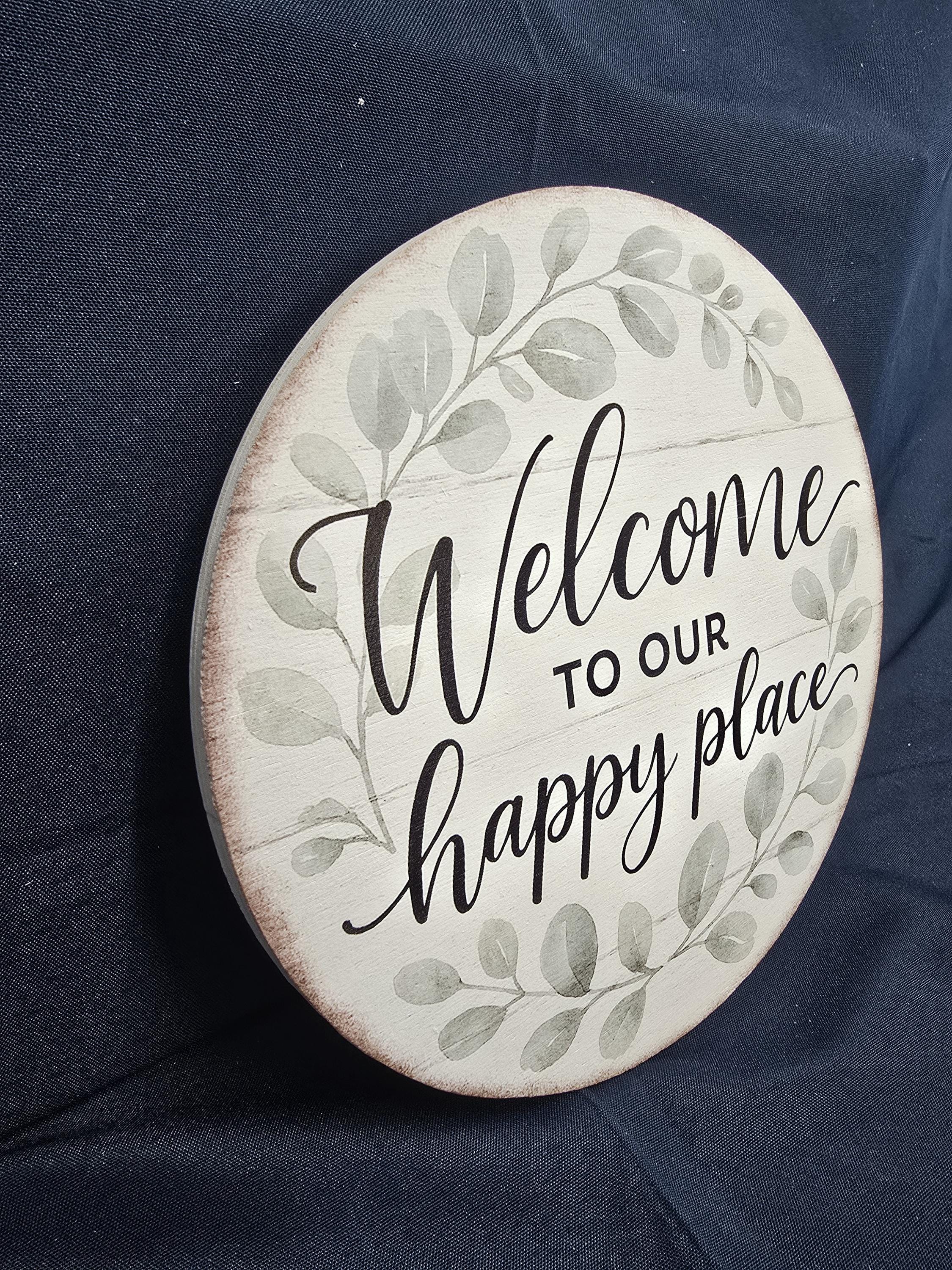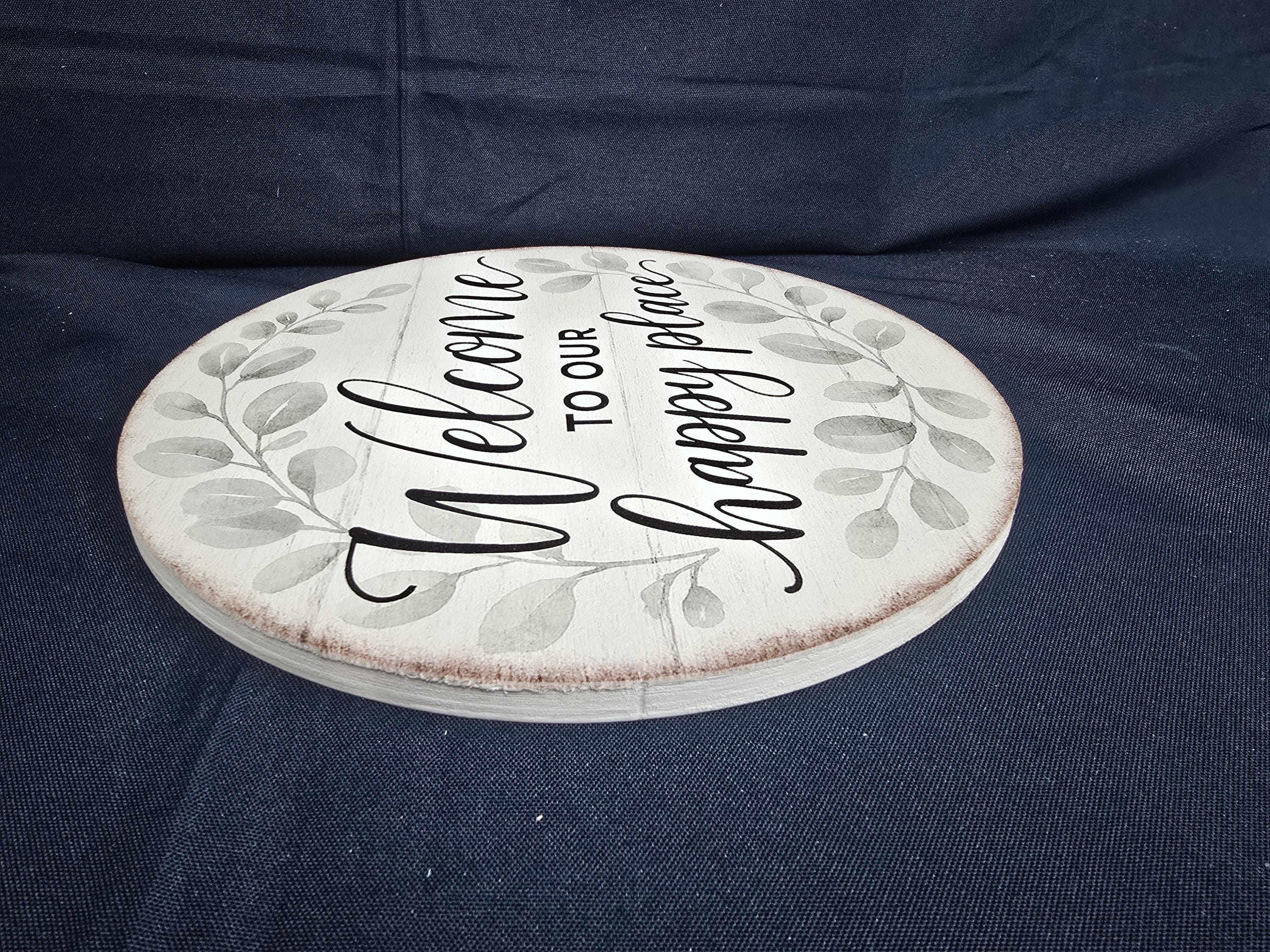 Create a warm and inviting atmosphere with this charming round wooden sign featuring the heartfelt message: “Welcome to our happy place.” Crafted from natural wood with a light beige finish and accented by soft green leafy details, this sign brings a cozy, rustic touch to any space.