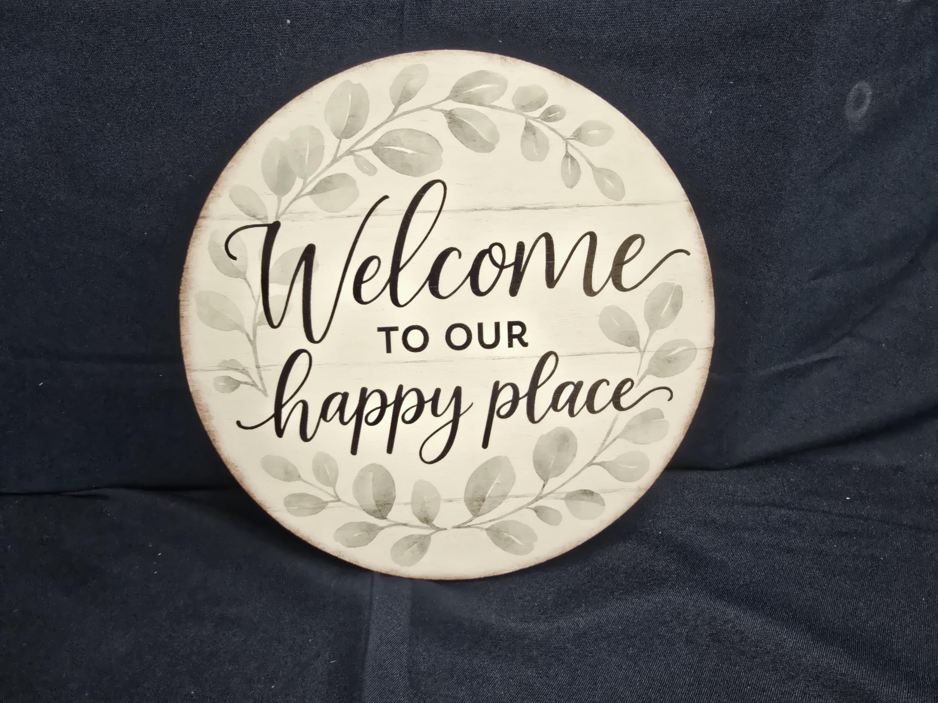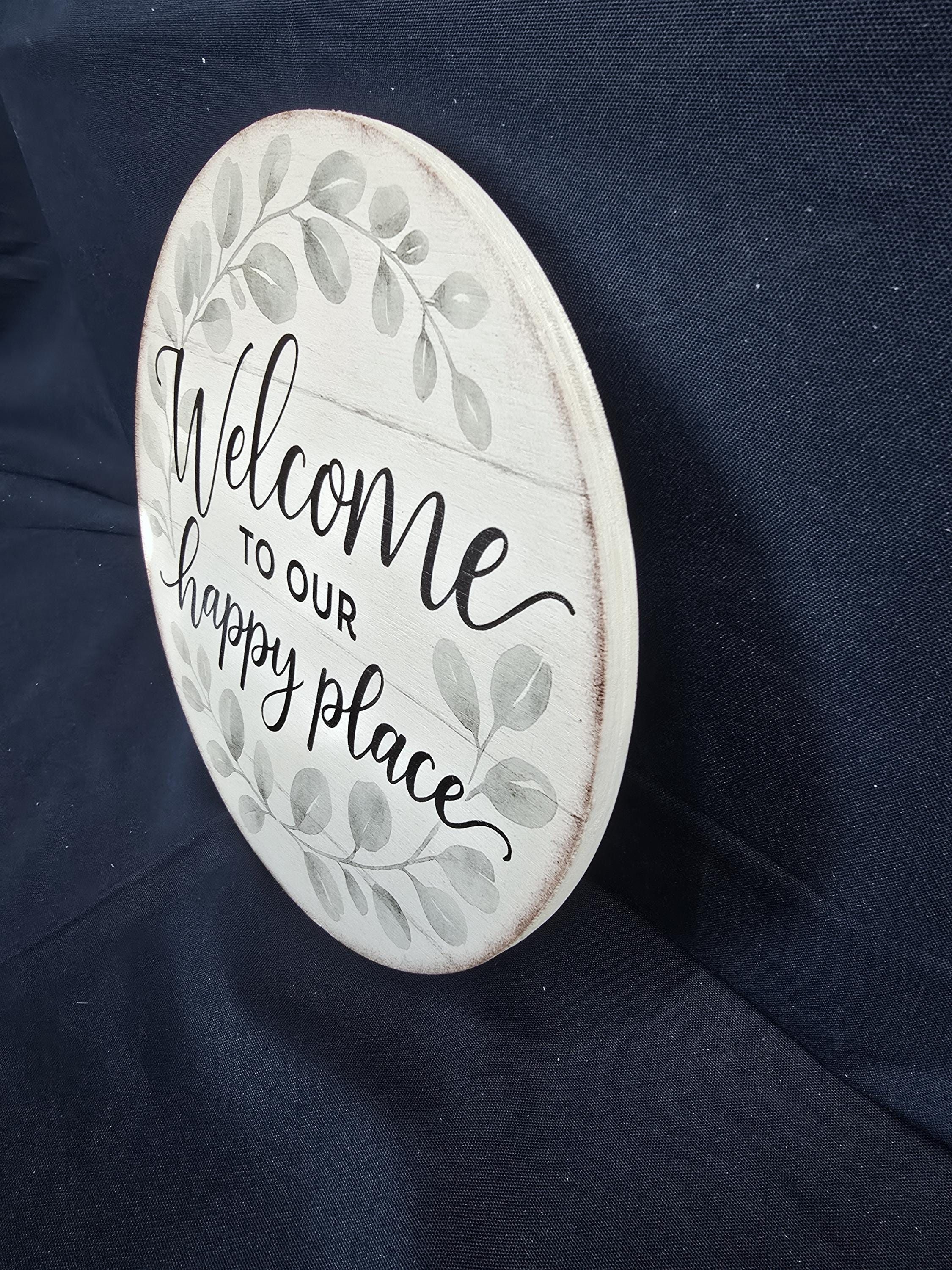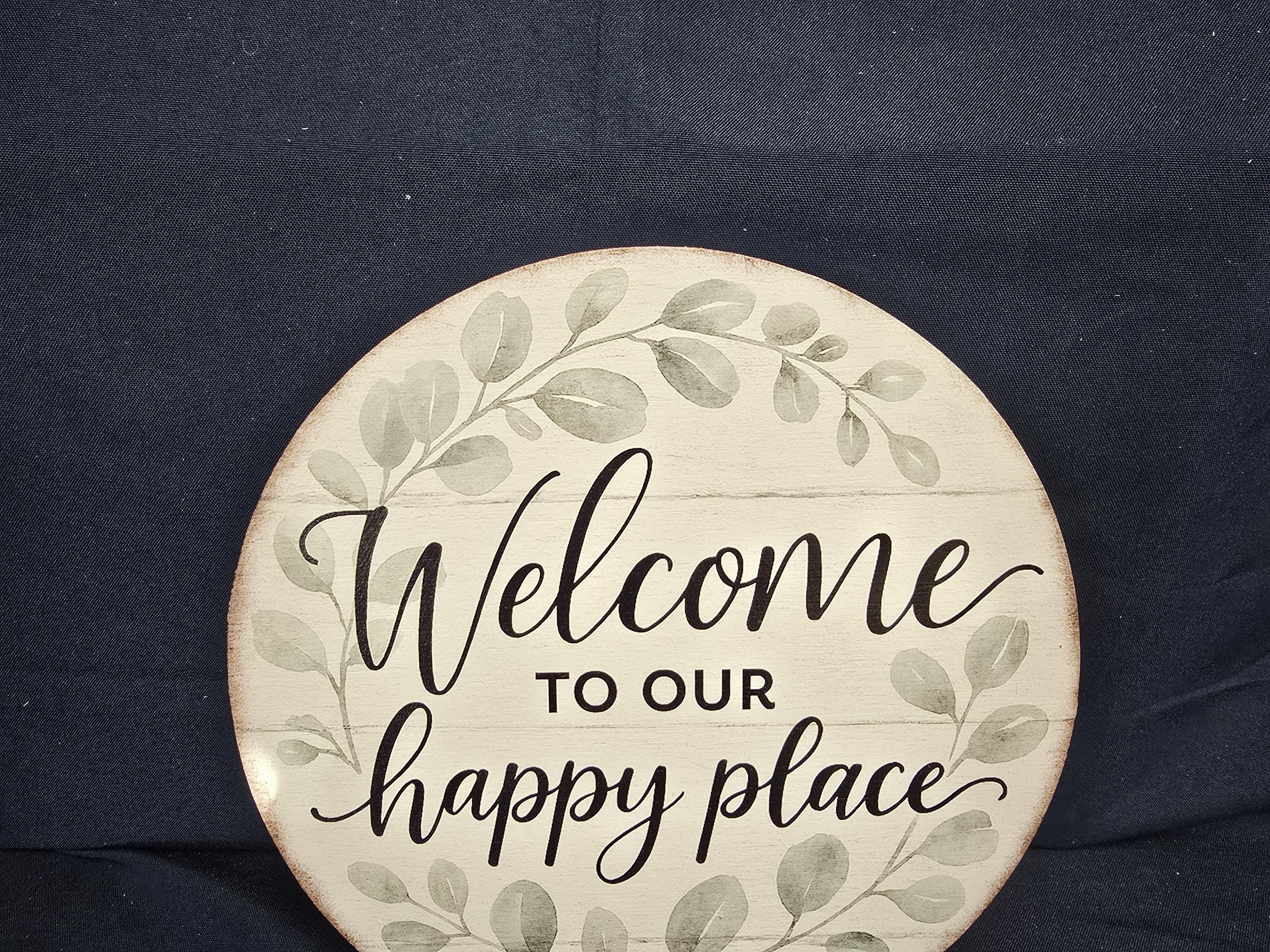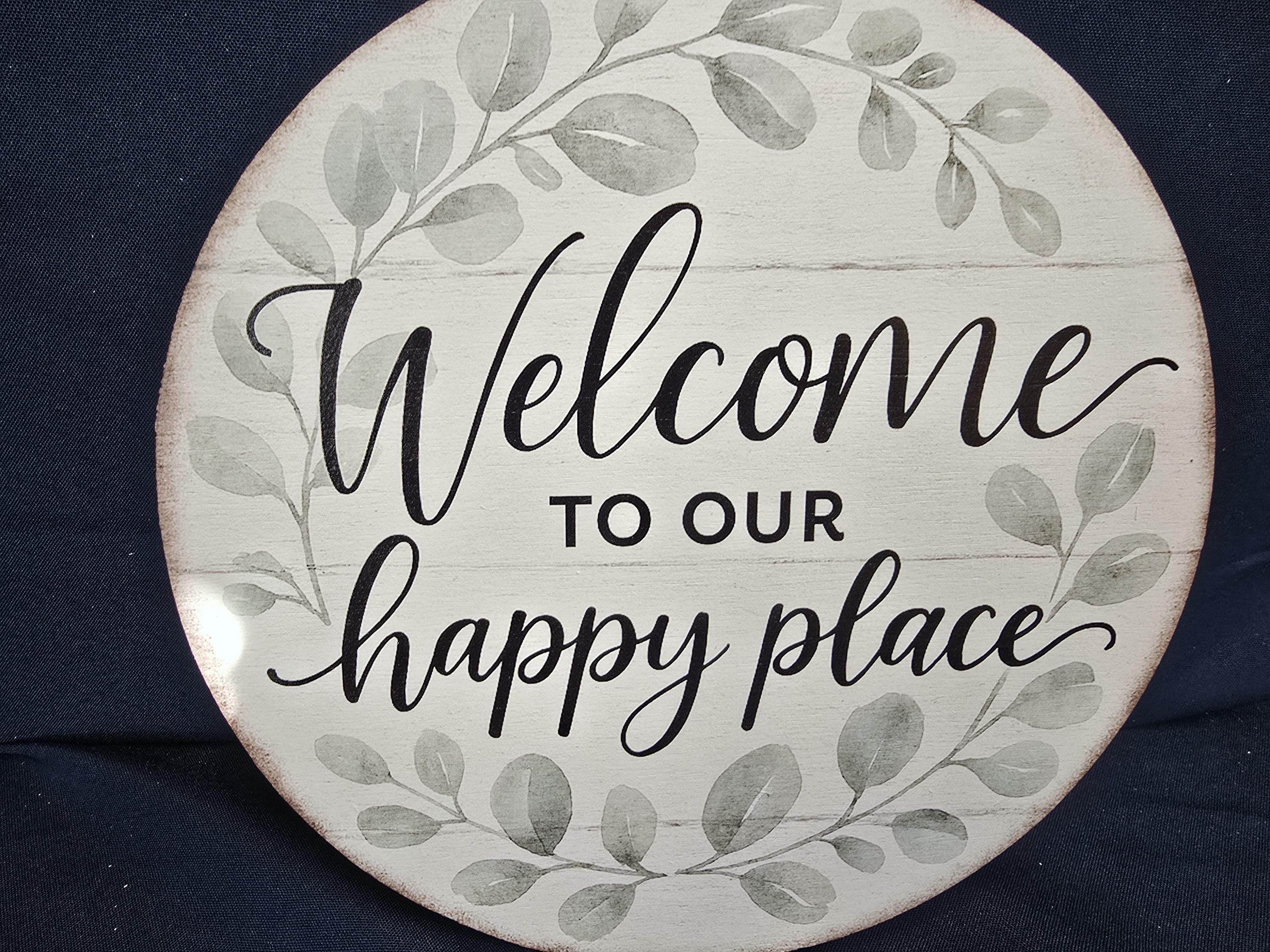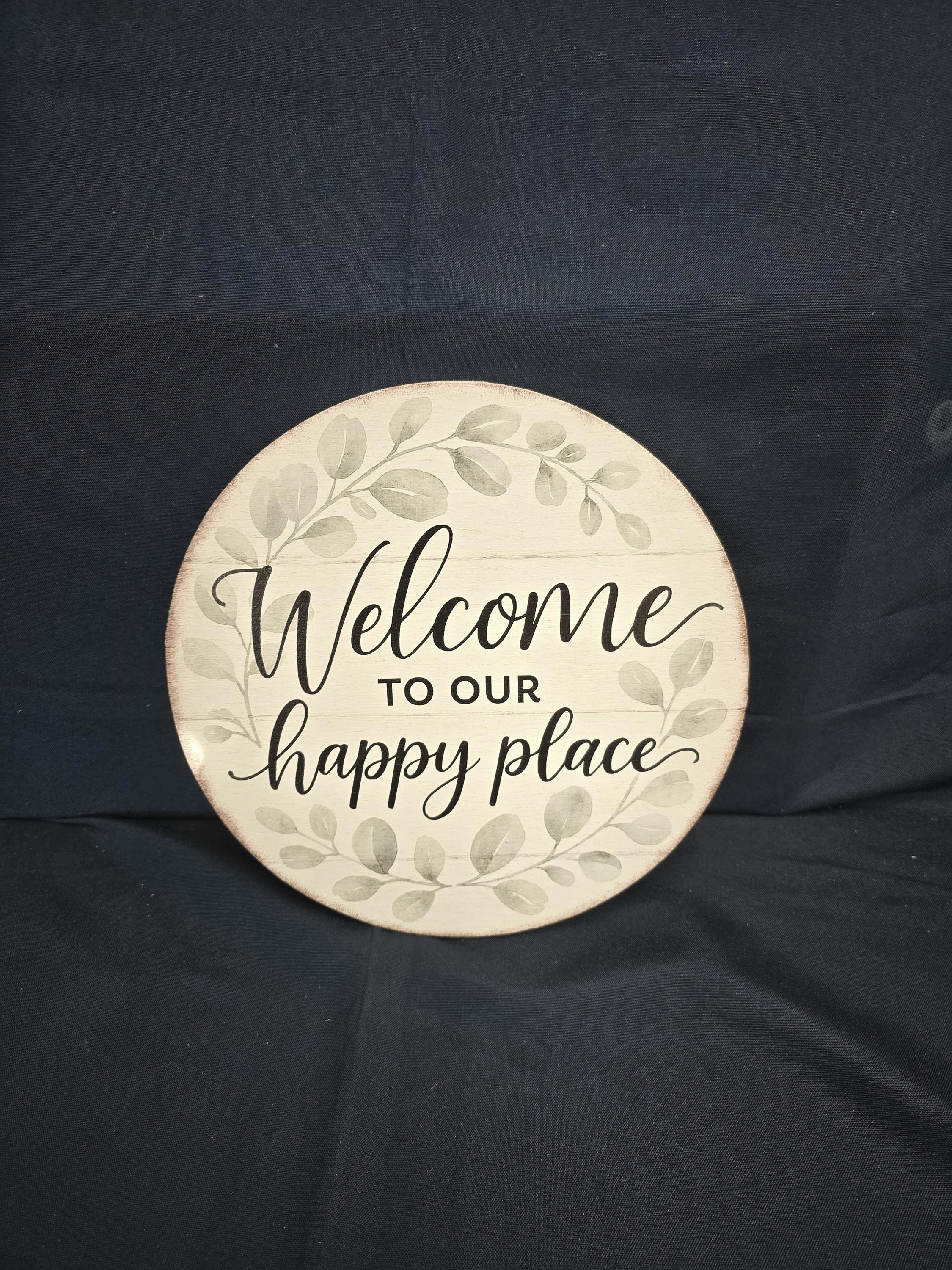 Create a warm and inviting atmosphere with this charming round wooden sign featuring the heartfelt message: “Welcome to our happy place.” Crafted from natural wood with a light beige finish and accented by soft green leafy details, this sign brings a cozy, rustic touch to any space.
