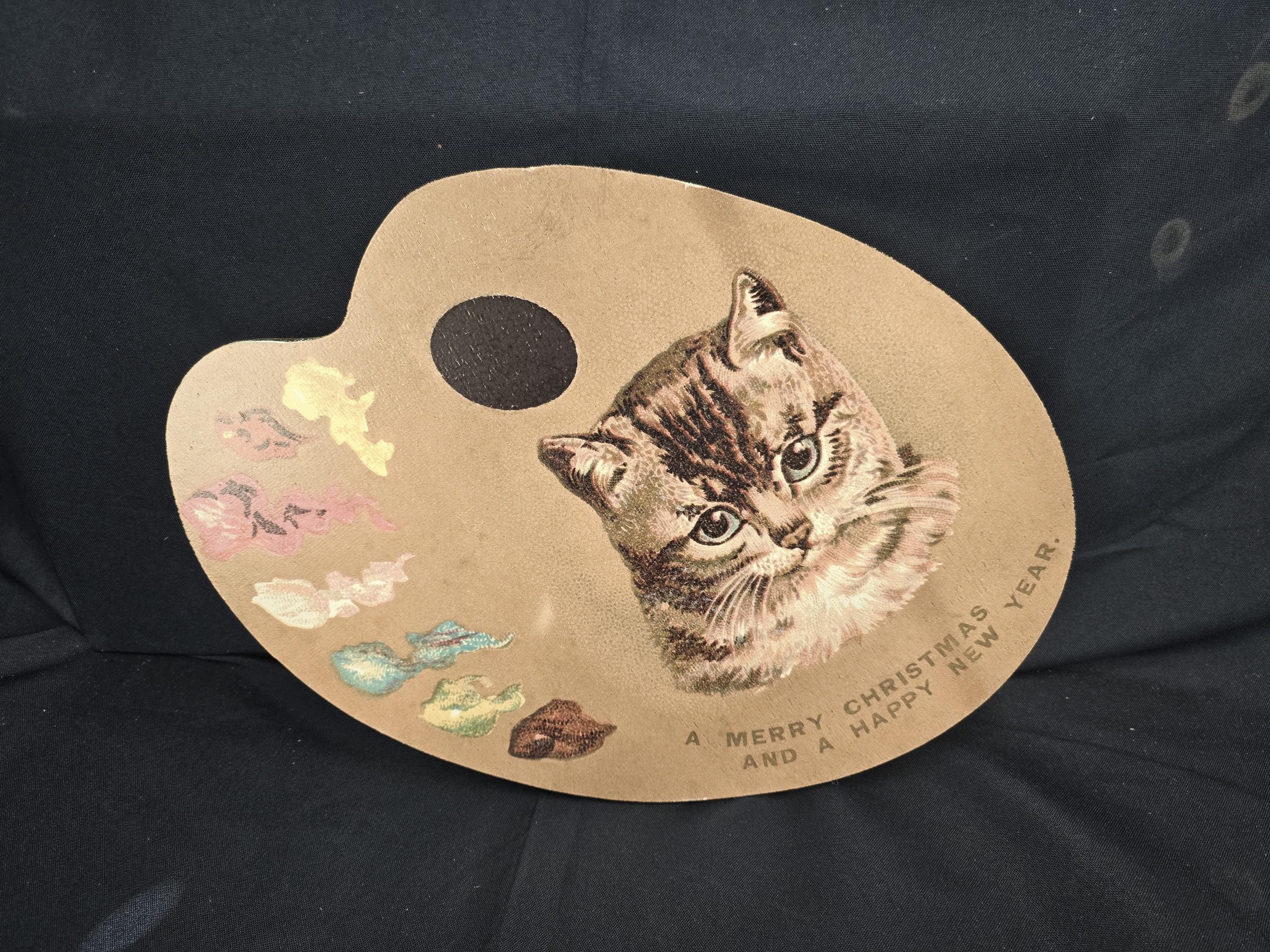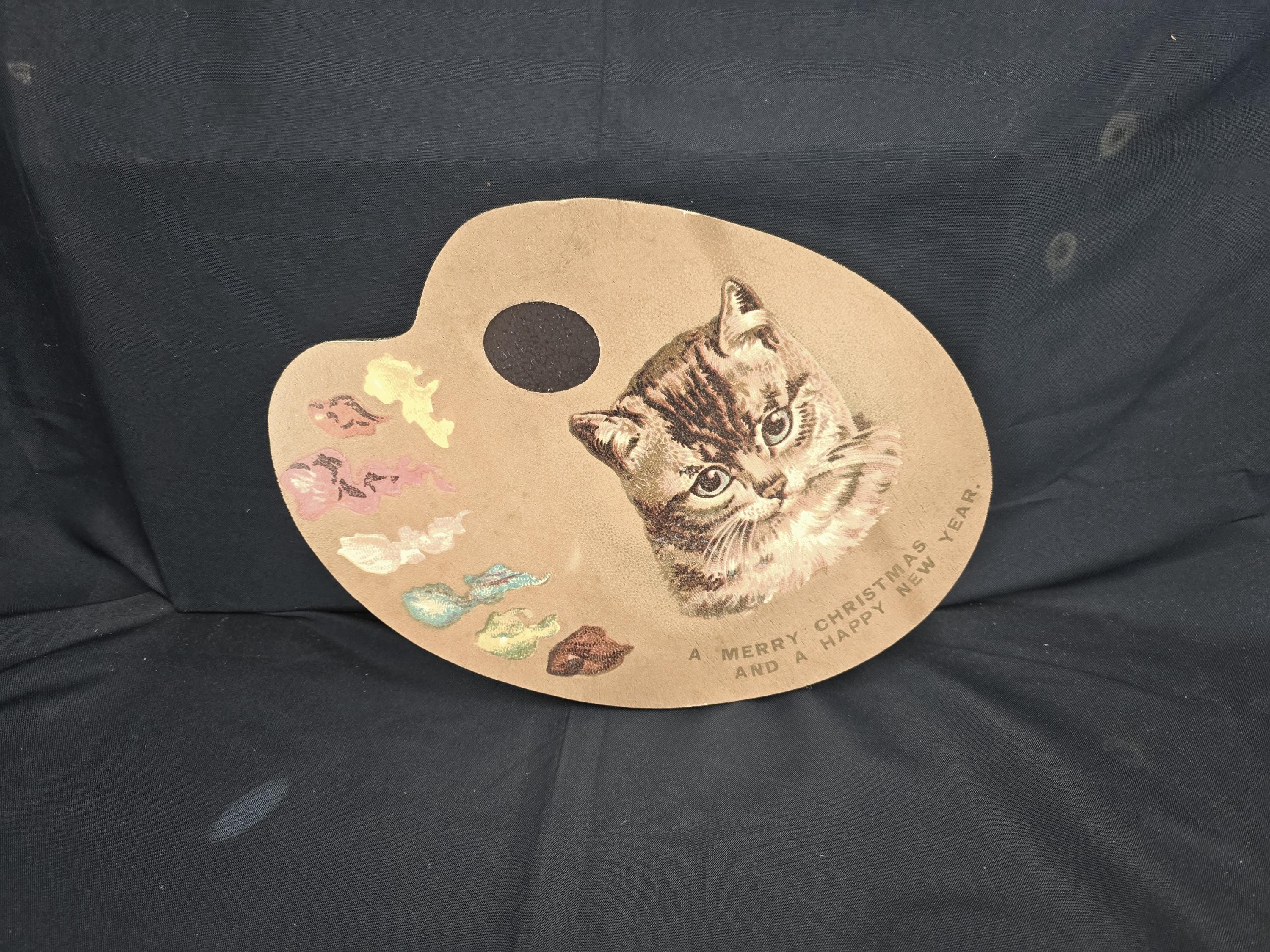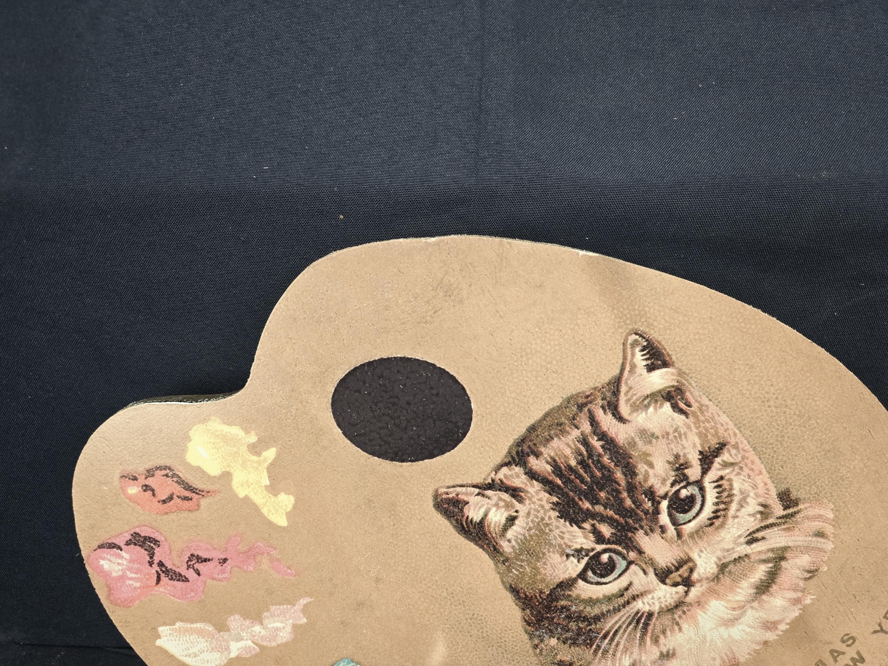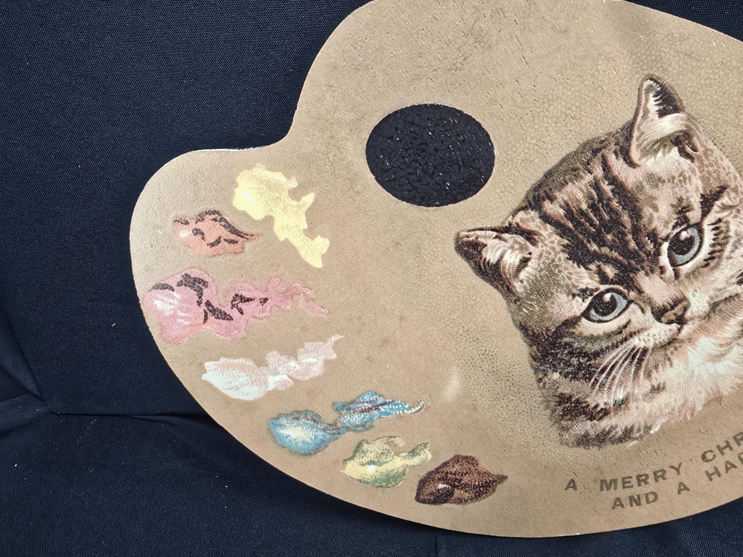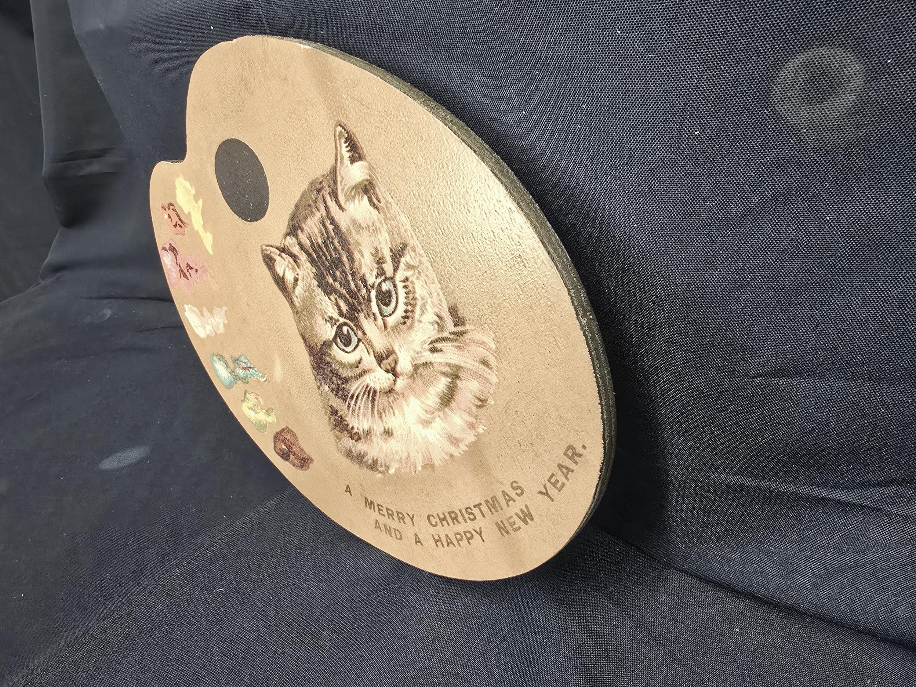 Celebrate the season with artistic flair using this charming vintage-style Christmas sign shaped like an artist’s palette. Featuring a realistic cat illustration surrounded by colorful paint dabs and a festive message, this unique design blends creativity with holiday cheer.