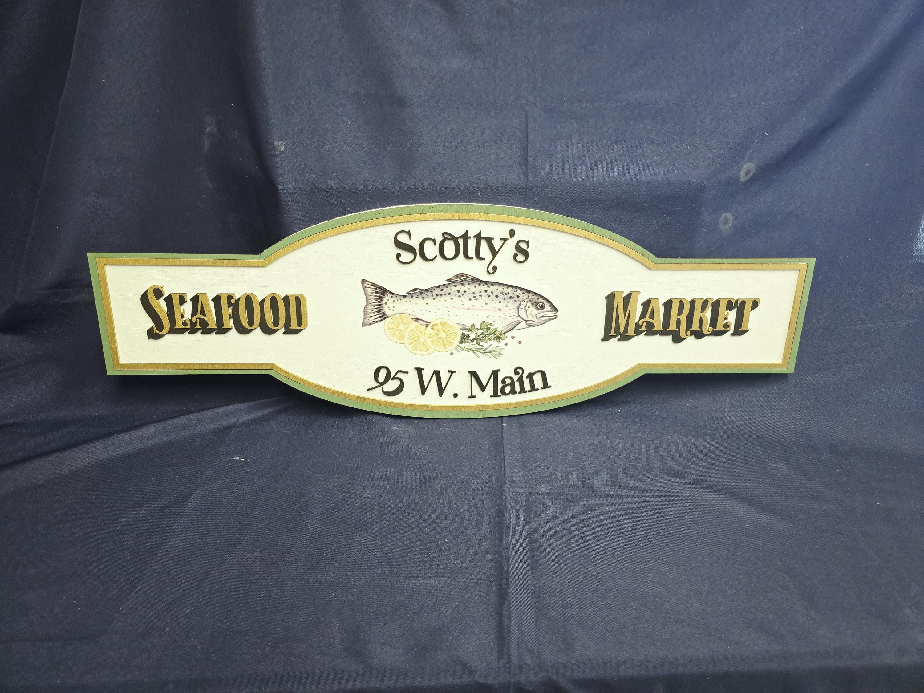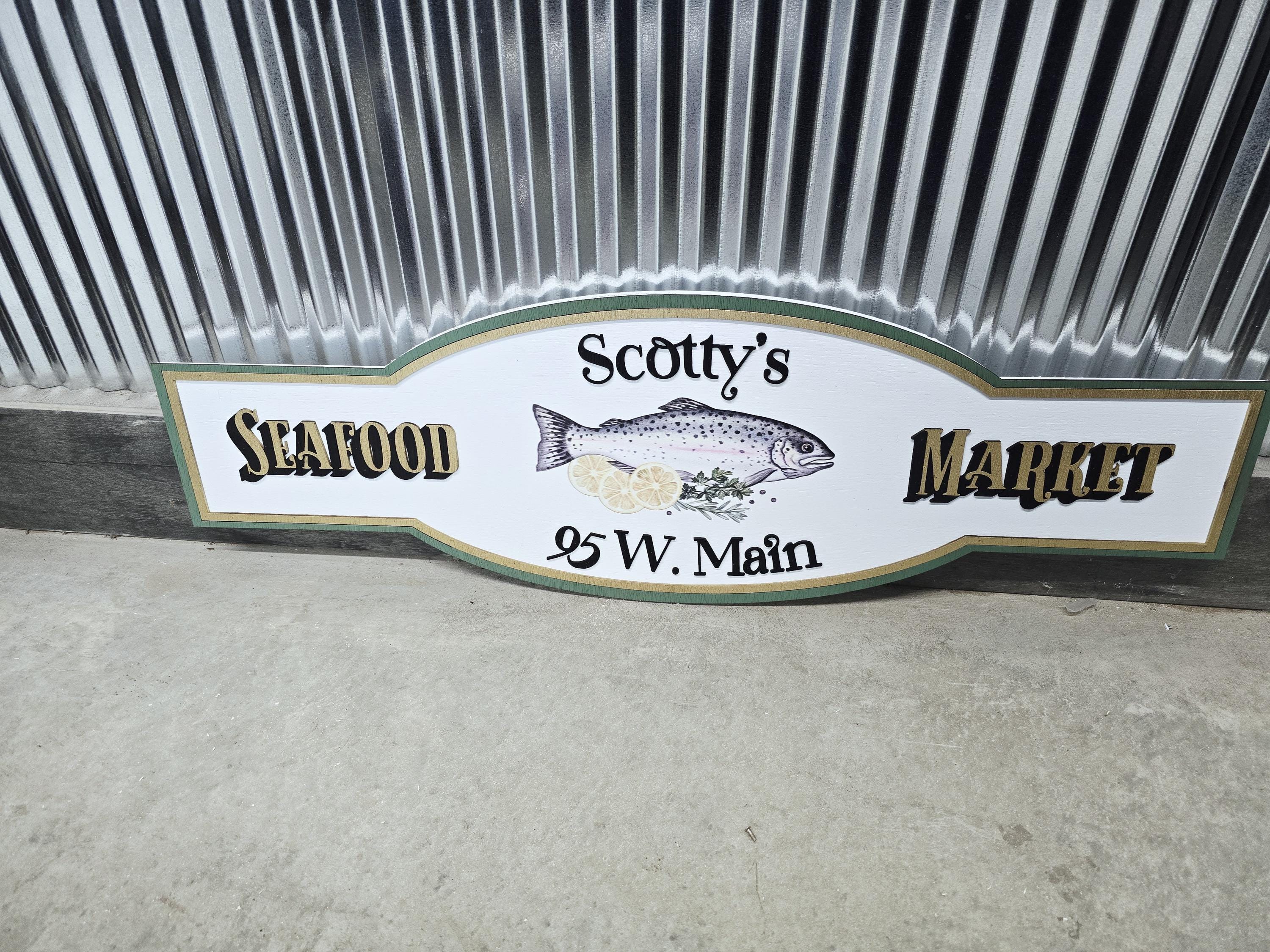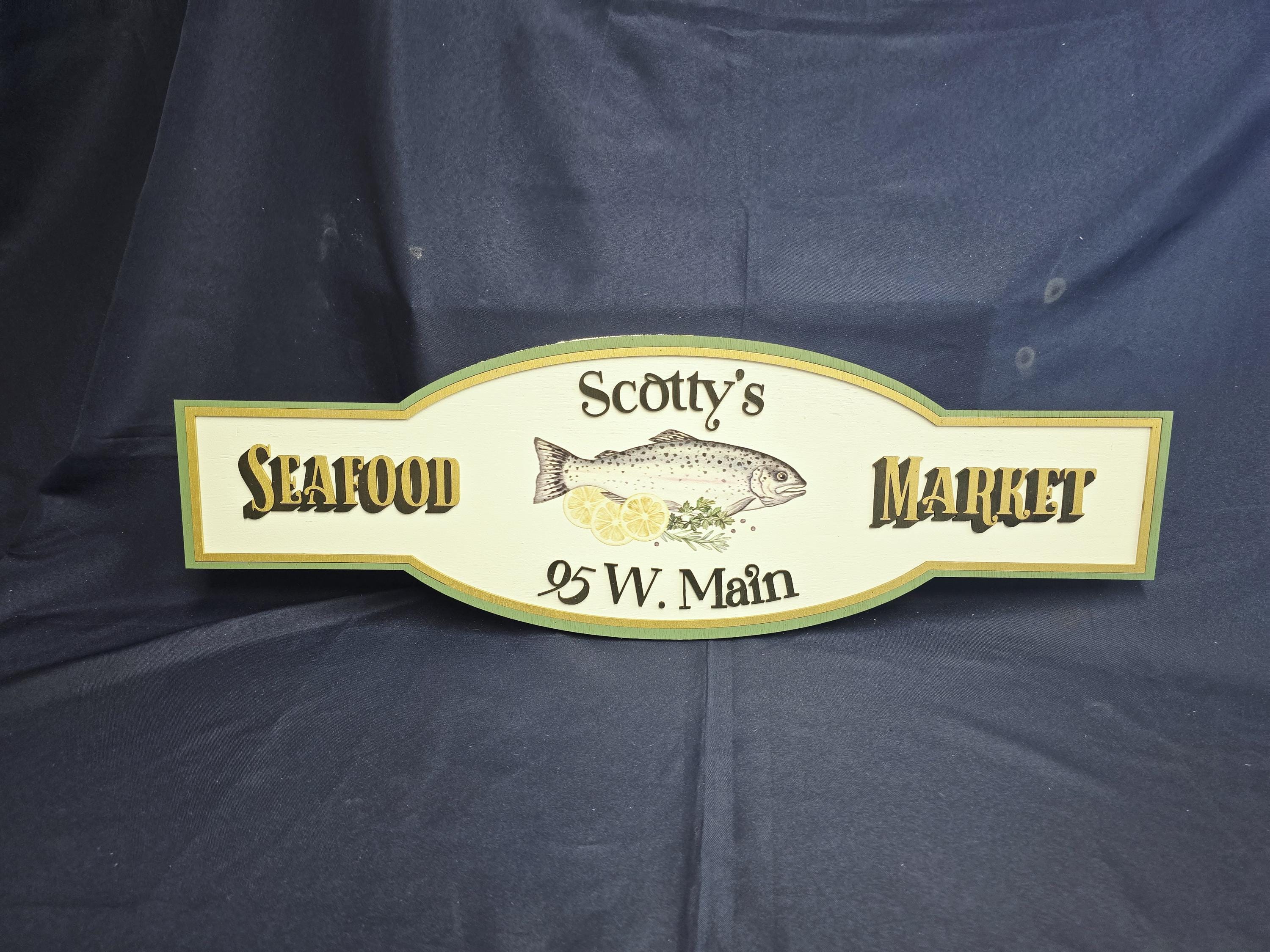 This sign features a vintage‑style fish illustration, bold “Seafood Market” lettering, and your custom name and address — making it a unique, meaningful piece for yourself or a thoughtful gift for someone special