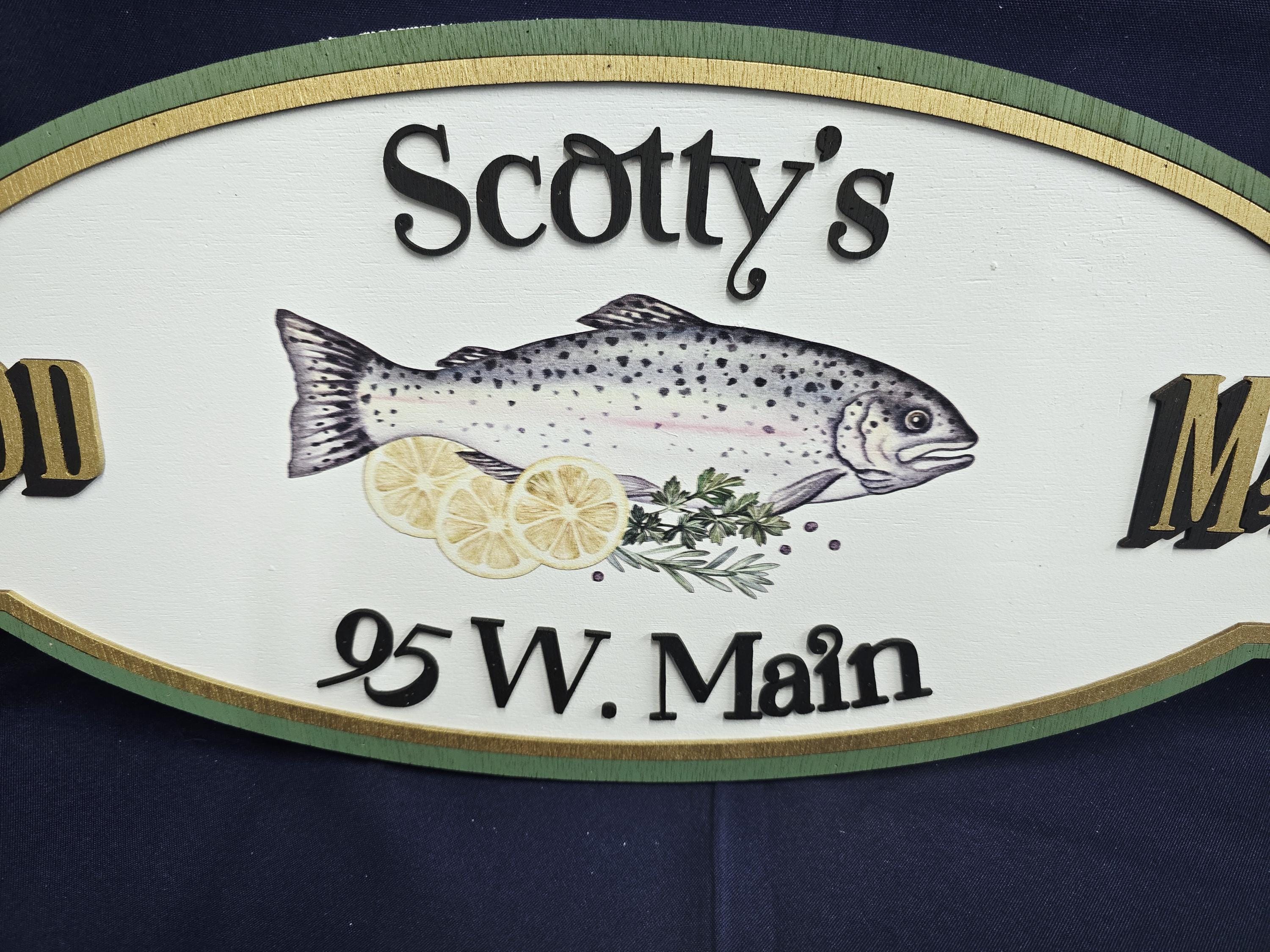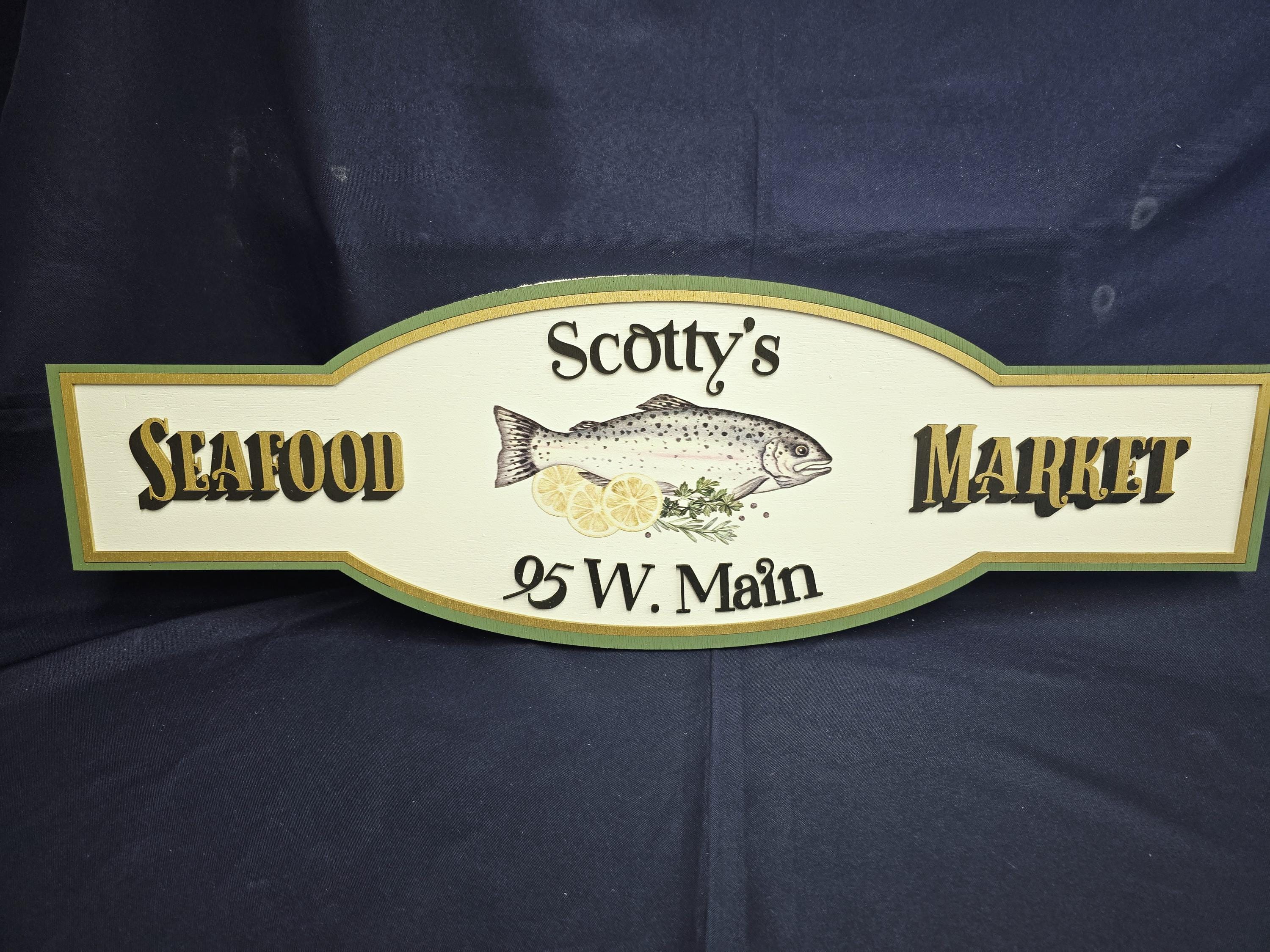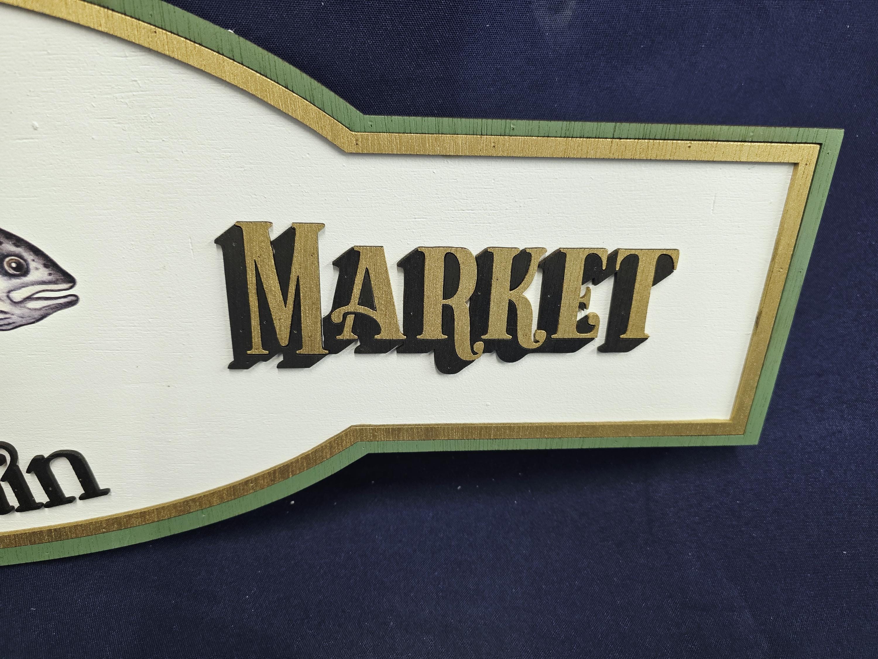 This sign features a vintage‑style fish illustration, bold “Seafood Market” lettering, and your custom name and address — making it a unique, meaningful piece for yourself or a thoughtful gift for someone special