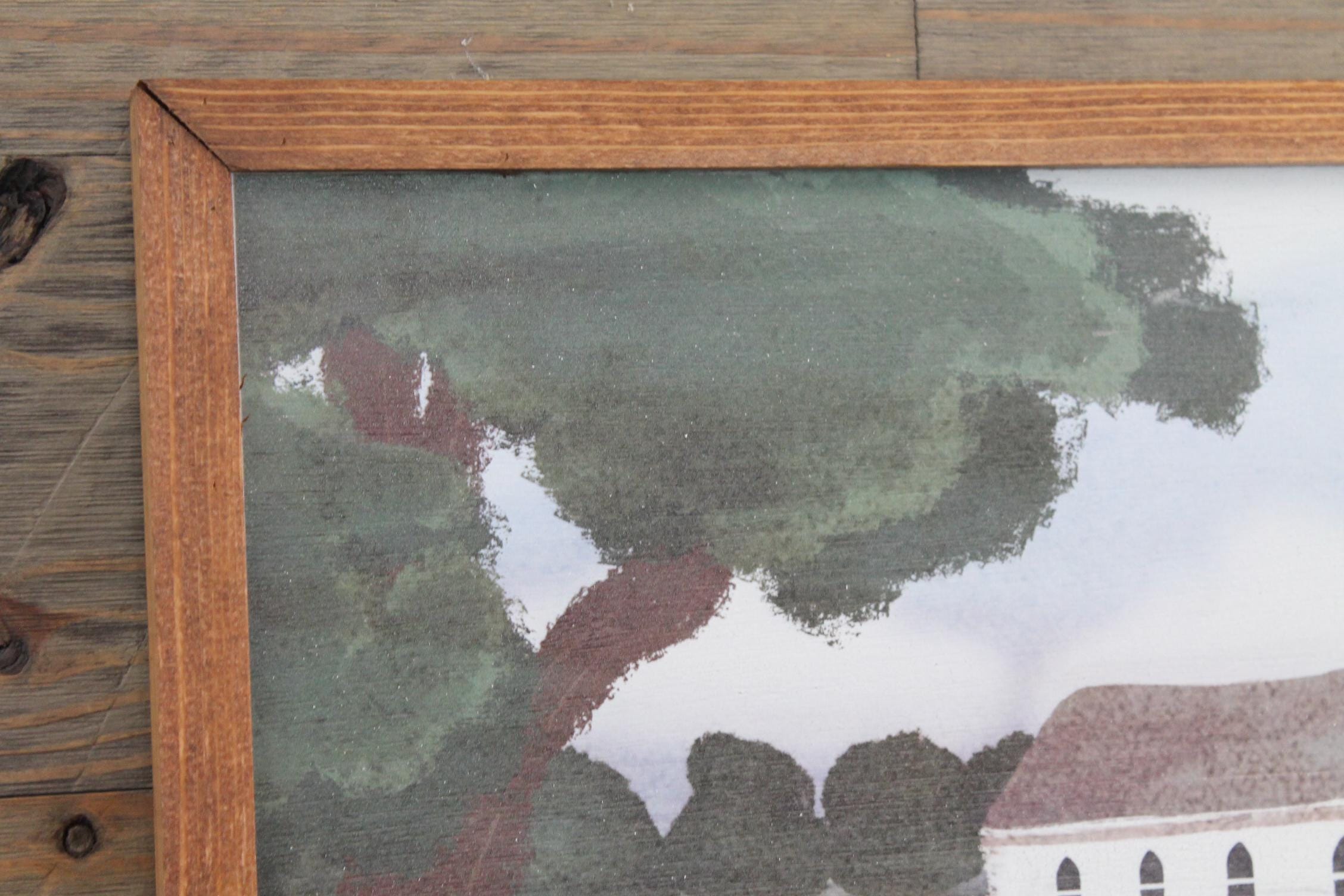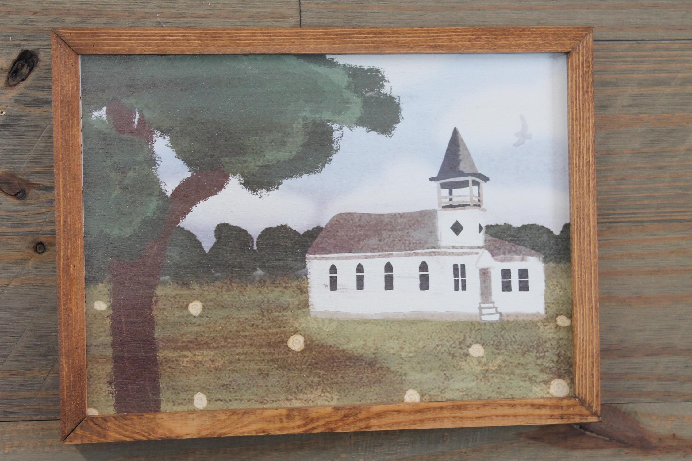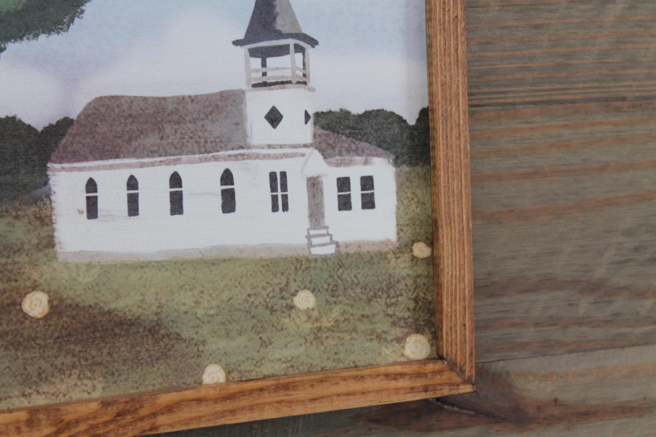 Bring timeless tranquility to your space with this beautifully framed rustic landscape painting. Featuring a classic white church with a steeple nestled in a grassy field beside a towering tree, this artwork evokes the charm of quiet countryside mornings and spiritual serenity. The soft, muted tones and natural textures make it a perfect addition to farmhouse, vintage, or traditional home decor.