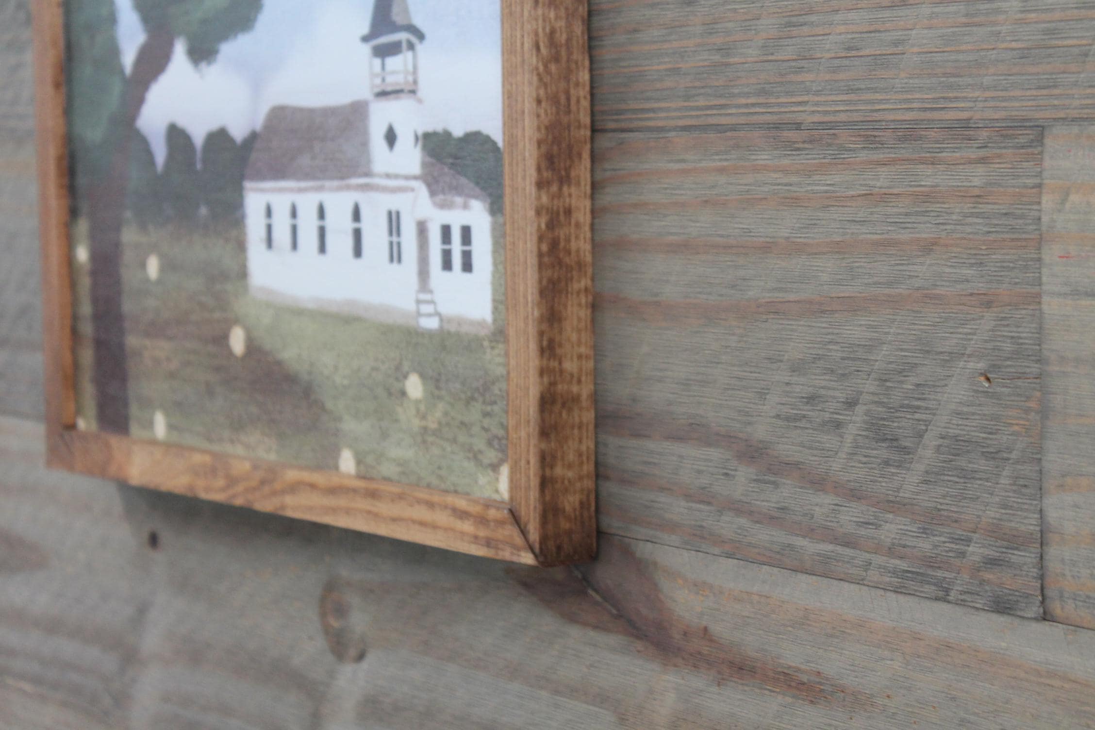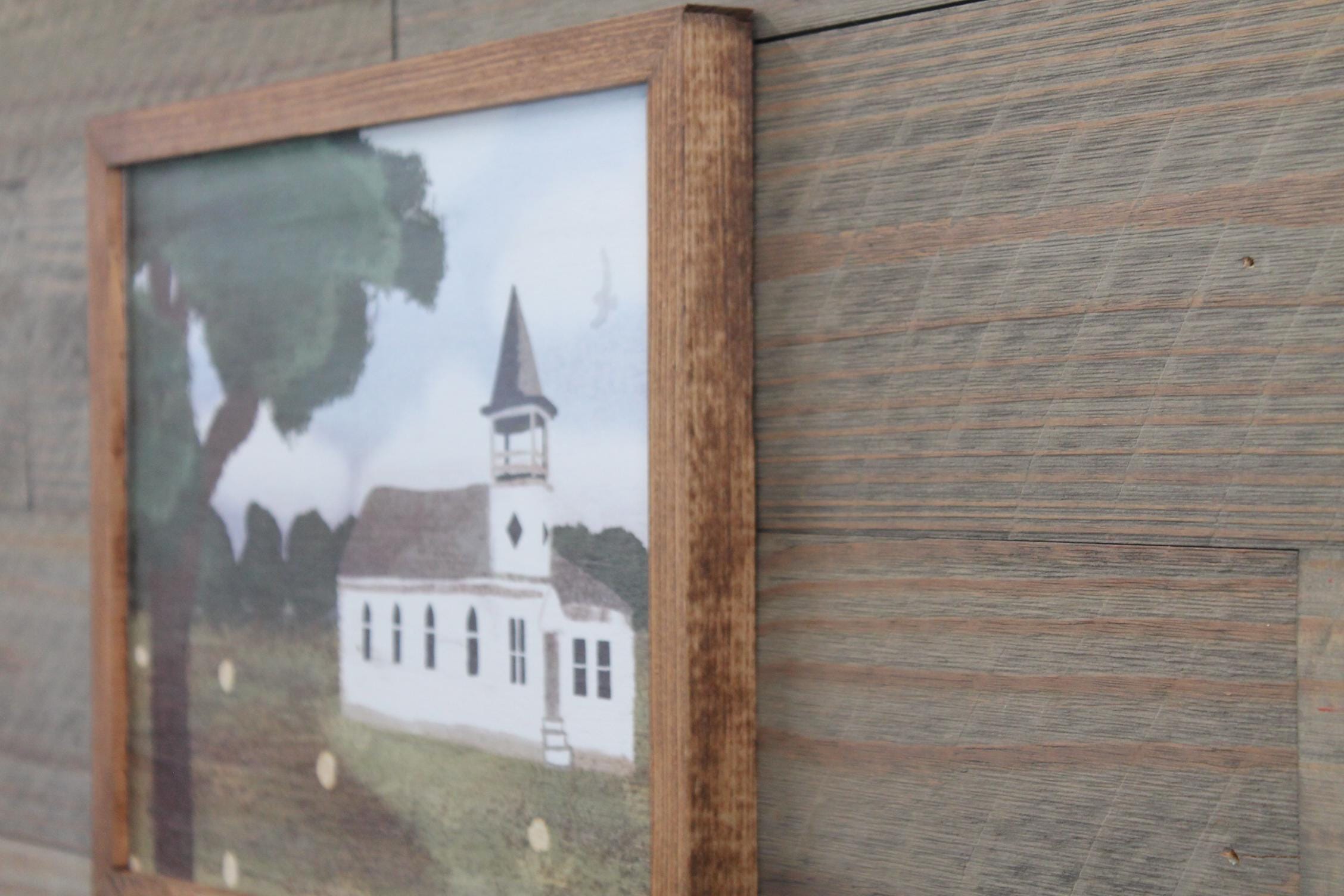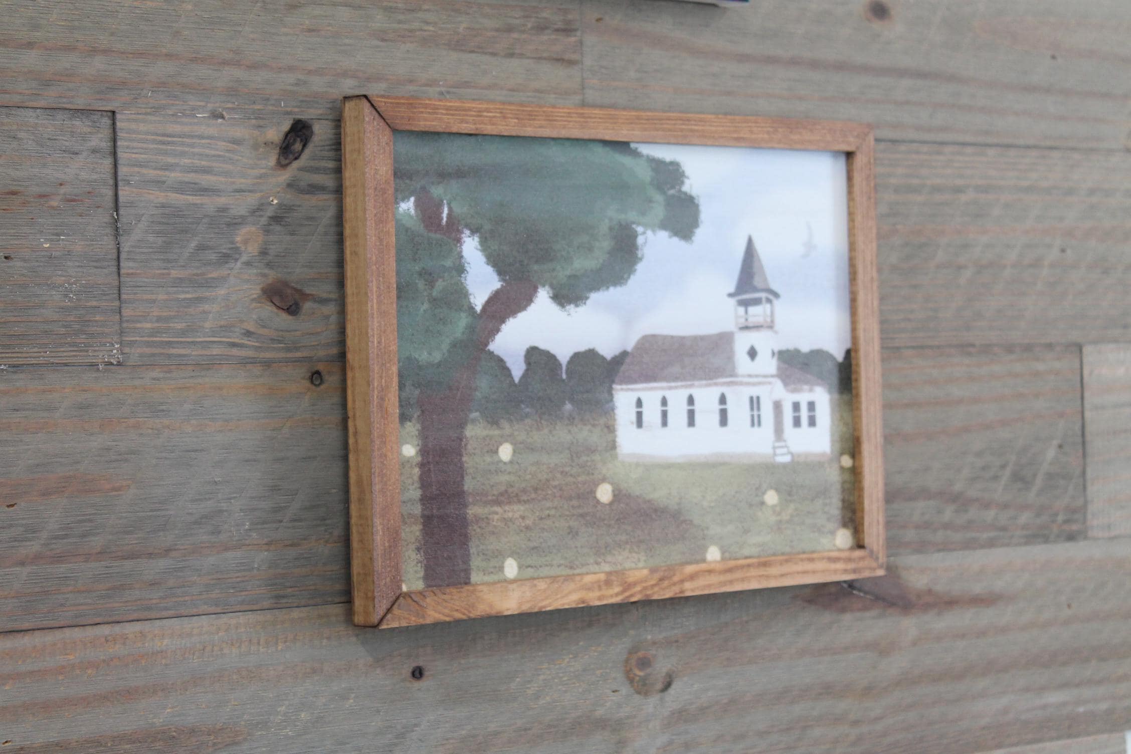 Bring timeless tranquility to your space with this beautifully framed rustic landscape painting. Featuring a classic white church with a steeple nestled in a grassy field beside a towering tree, this artwork evokes the charm of quiet countryside mornings and spiritual serenity. The soft, muted tones and natural textures make it a perfect addition to farmhouse, vintage, or traditional home decor.