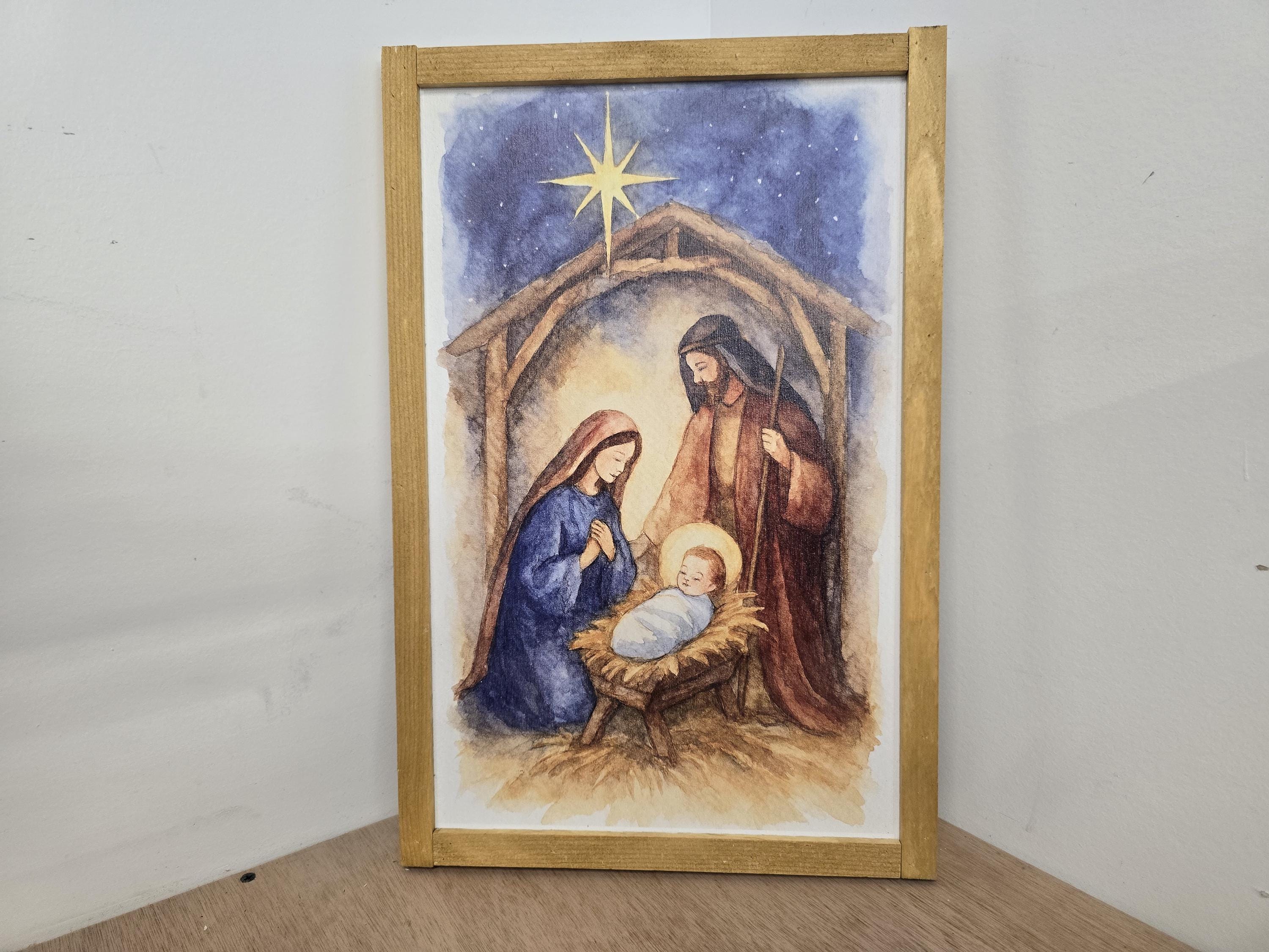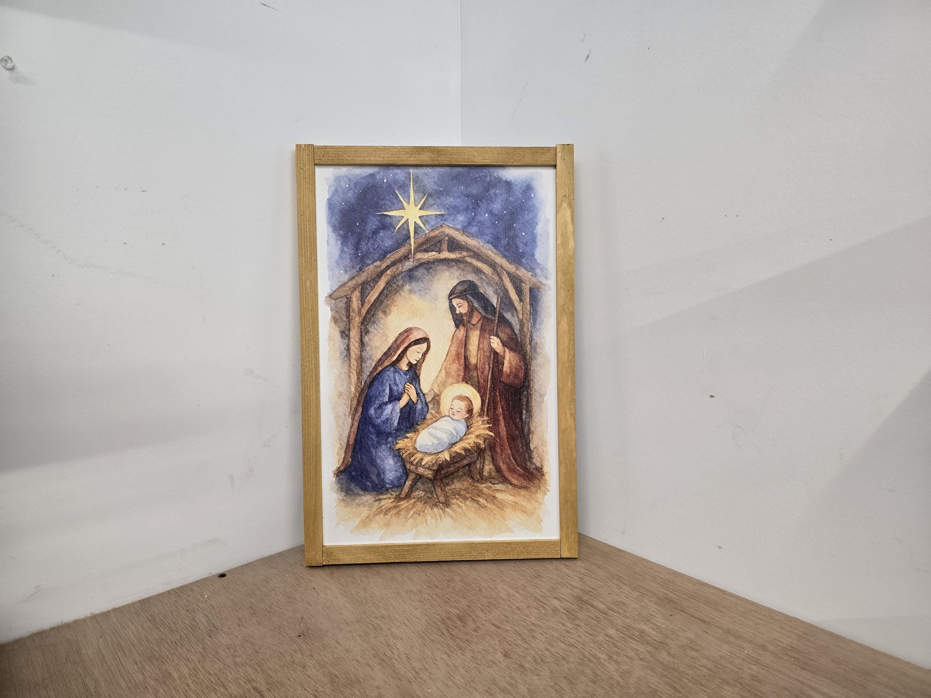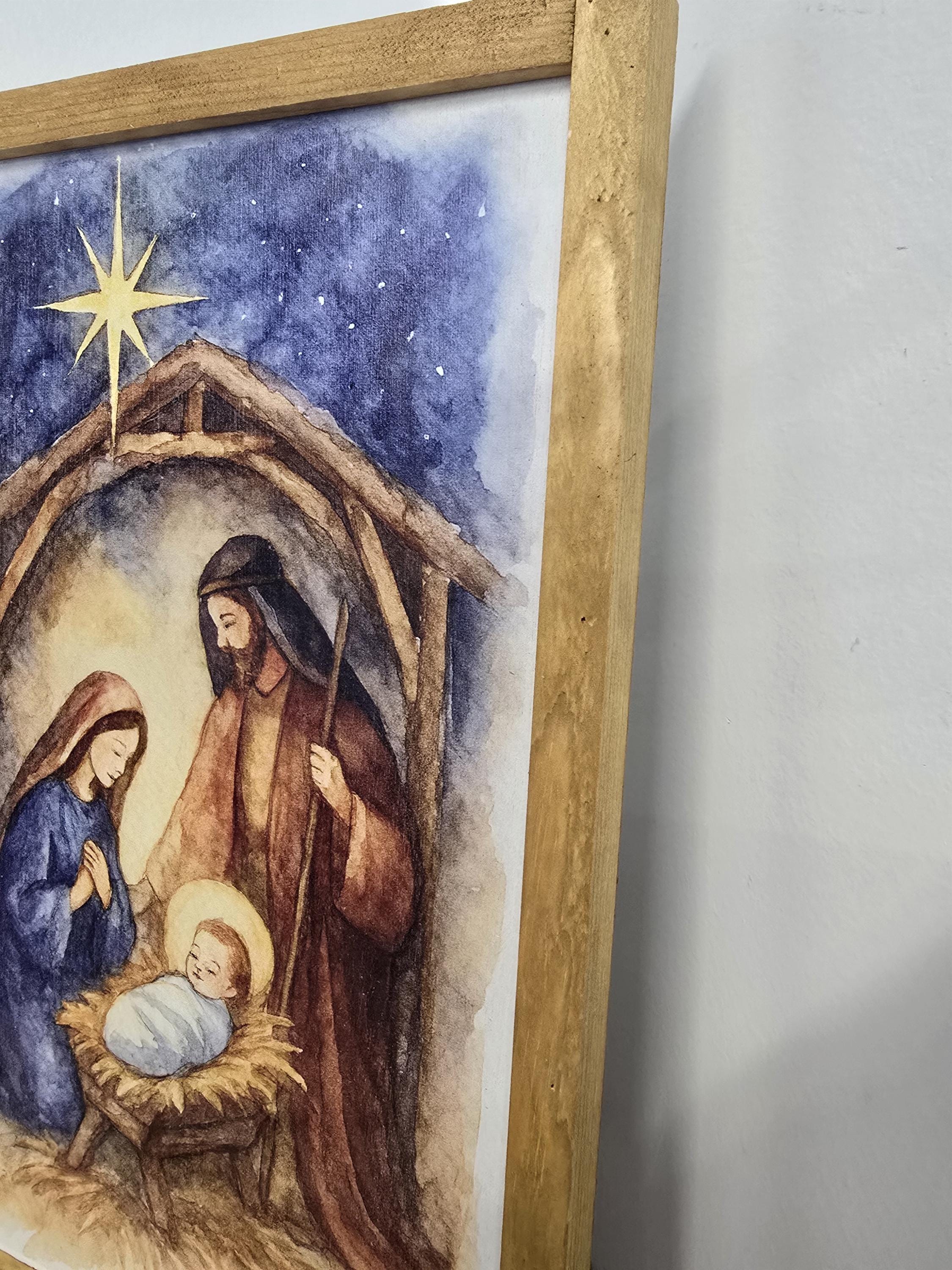 Celebrate the true meaning of Christmas with this beautifully framed nativity scene sign. Featuring a serene illustration of baby Jesus in the manger, surrounded by Mary and Joseph beneath a rustic stable and the radiant Star of Bethlehem, this artwork brings warmth and reverence to your holiday decor. The soft, earthy tones and traditional robes evoke a timeless charm, perfect for mantels, entryways, or gift-giving. Each piece is crafted to honor the spirit of the season and the story of Christ’s birth.