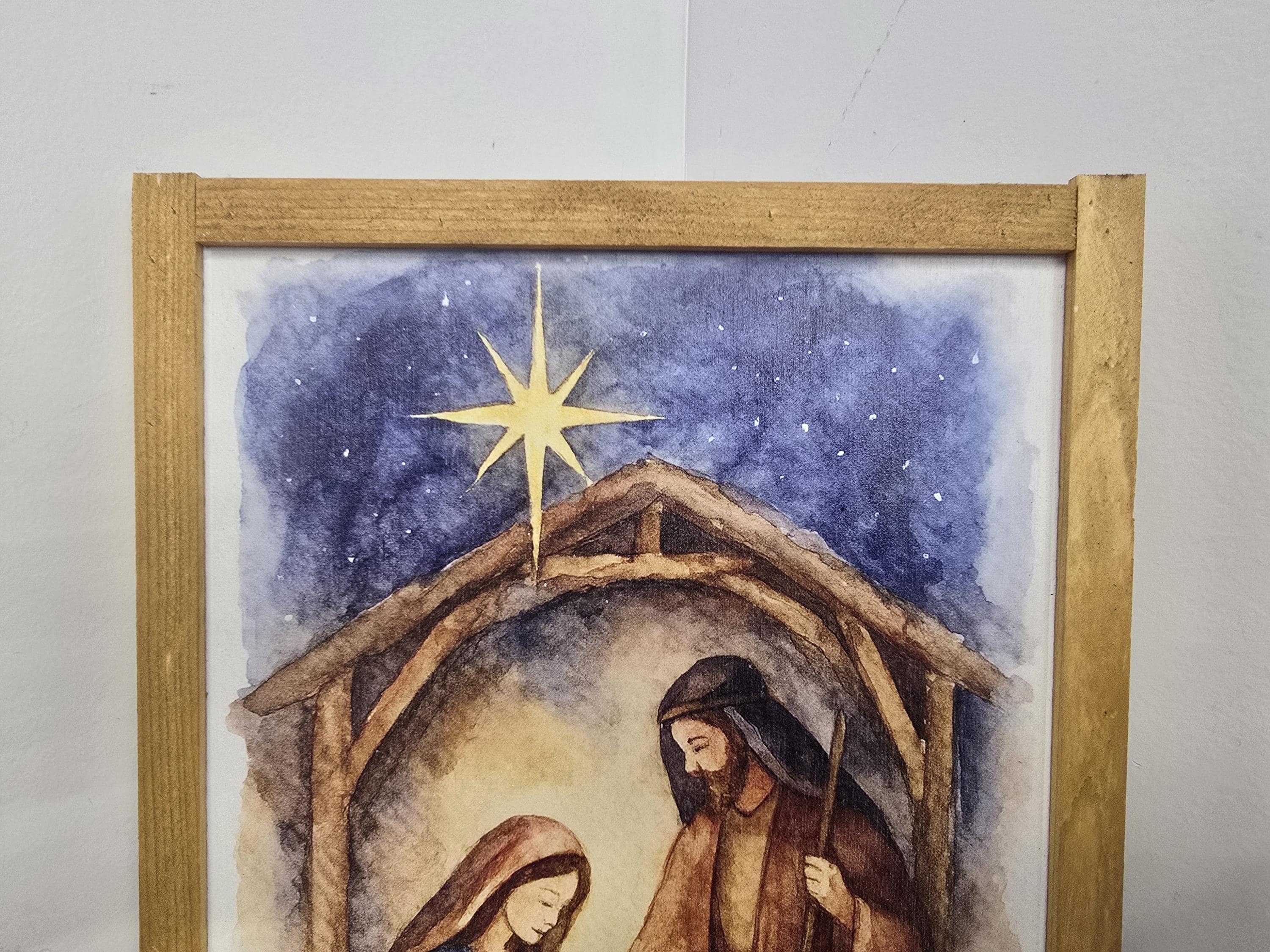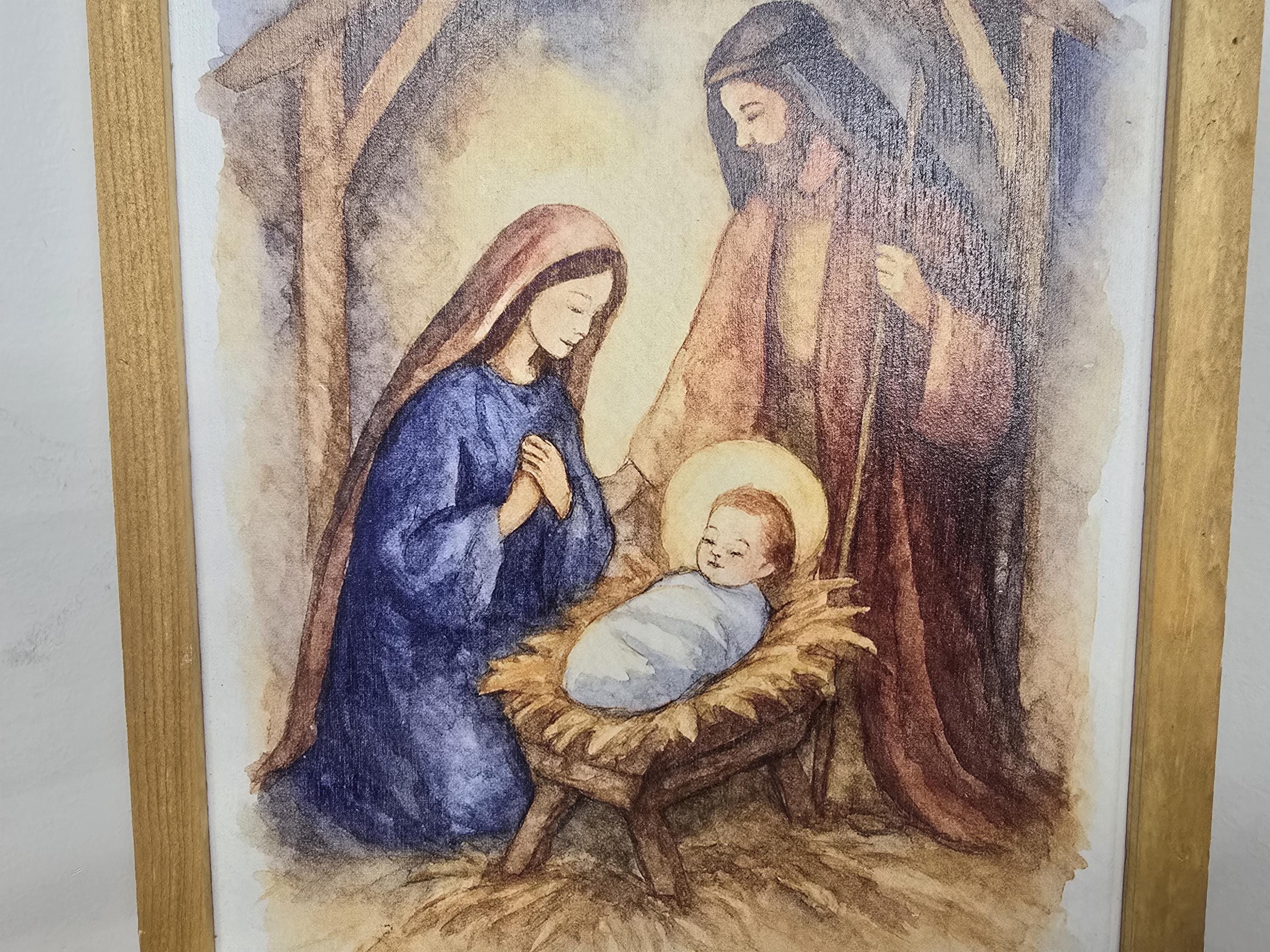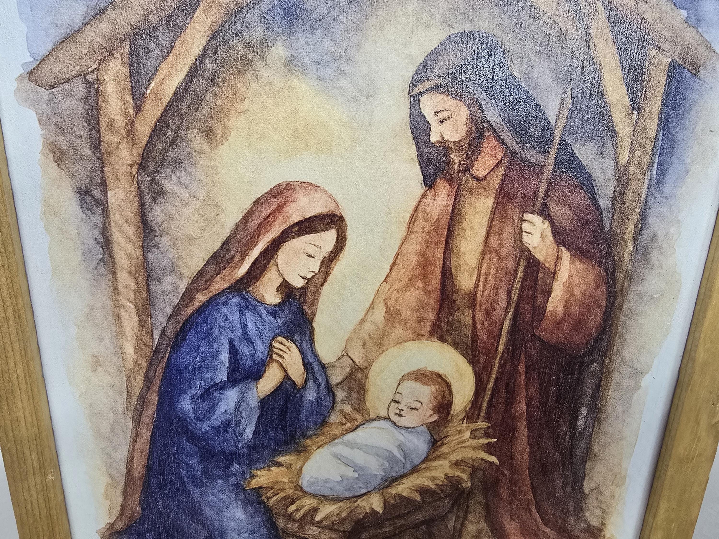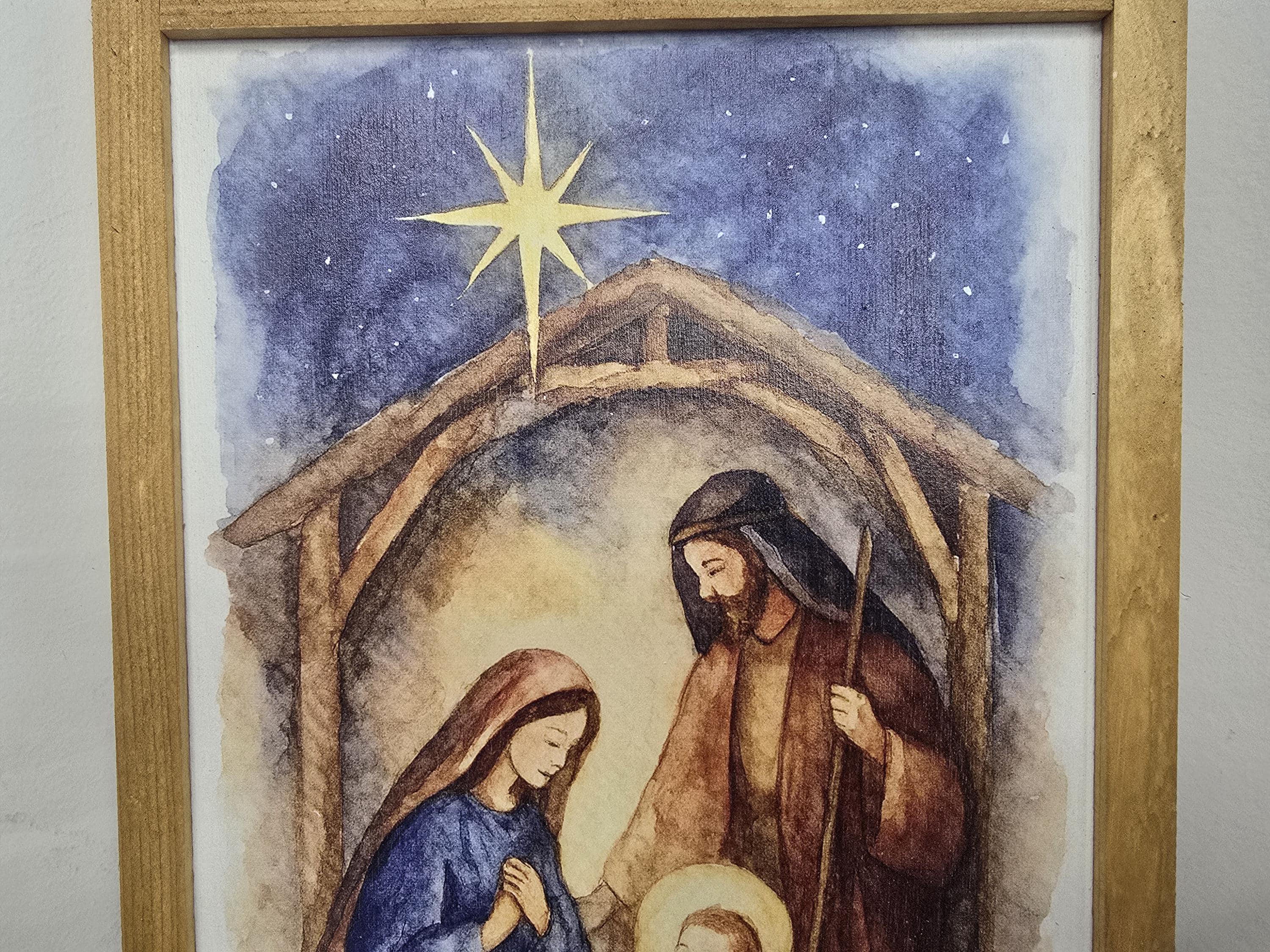 Celebrate the true meaning of Christmas with this beautifully framed nativity scene sign. Featuring a serene illustration of baby Jesus in the manger, surrounded by Mary and Joseph beneath a rustic stable and the radiant Star of Bethlehem, this artwork brings warmth and reverence to your holiday decor. The soft, earthy tones and traditional robes evoke a timeless charm, perfect for mantels, entryways, or gift-giving. Each piece is crafted to honor the spirit of the season and the story of Christ’s birth.