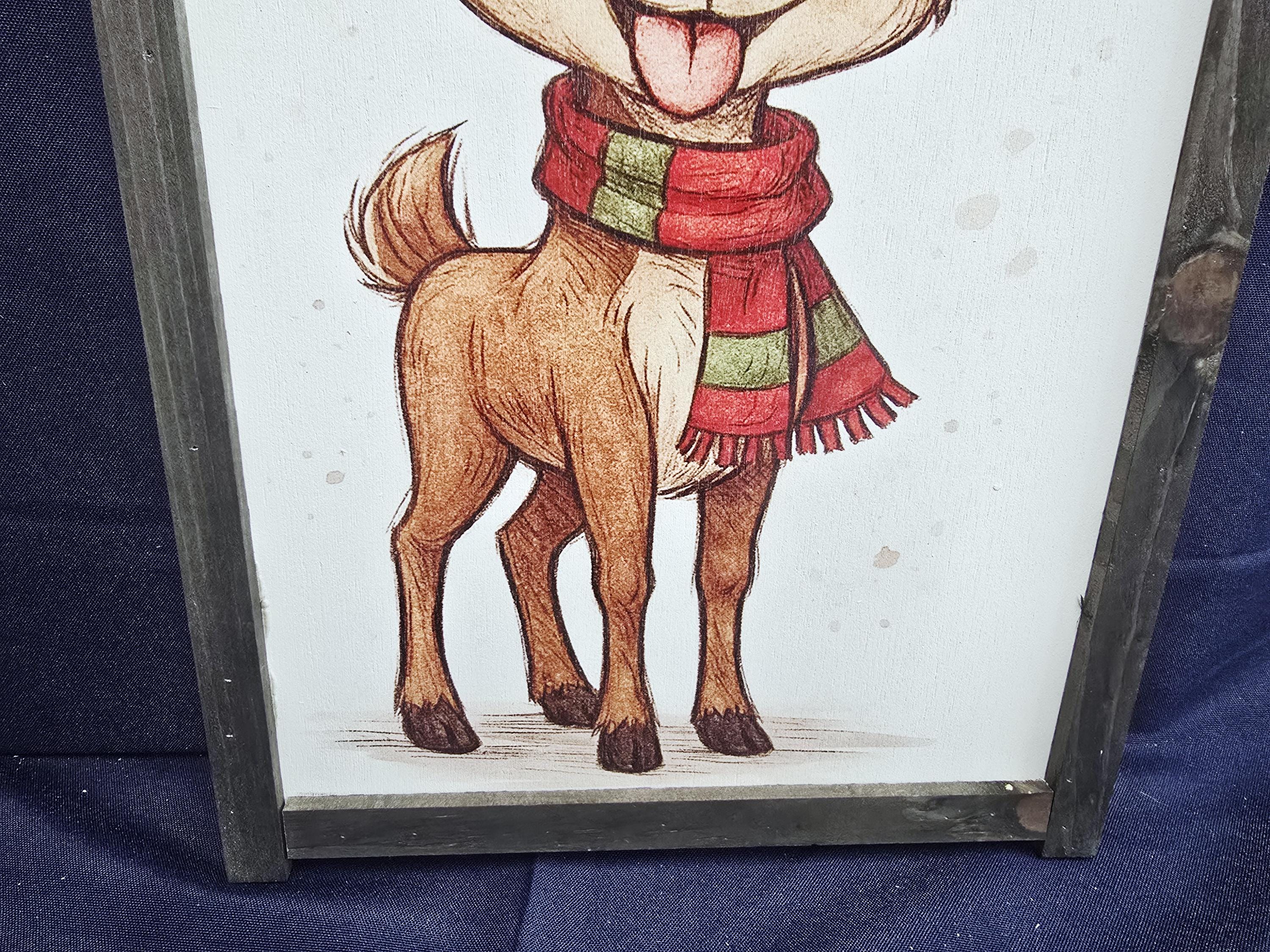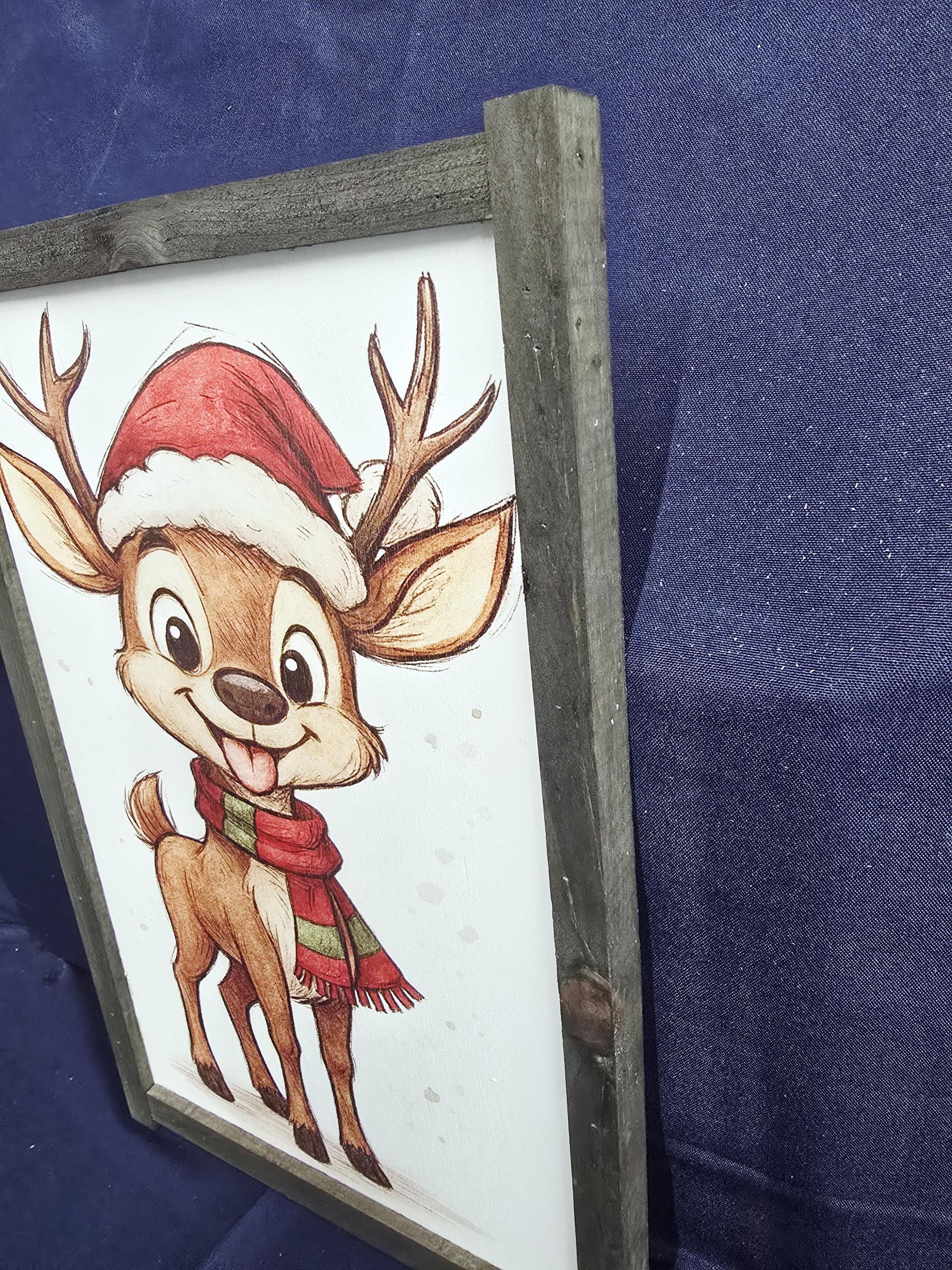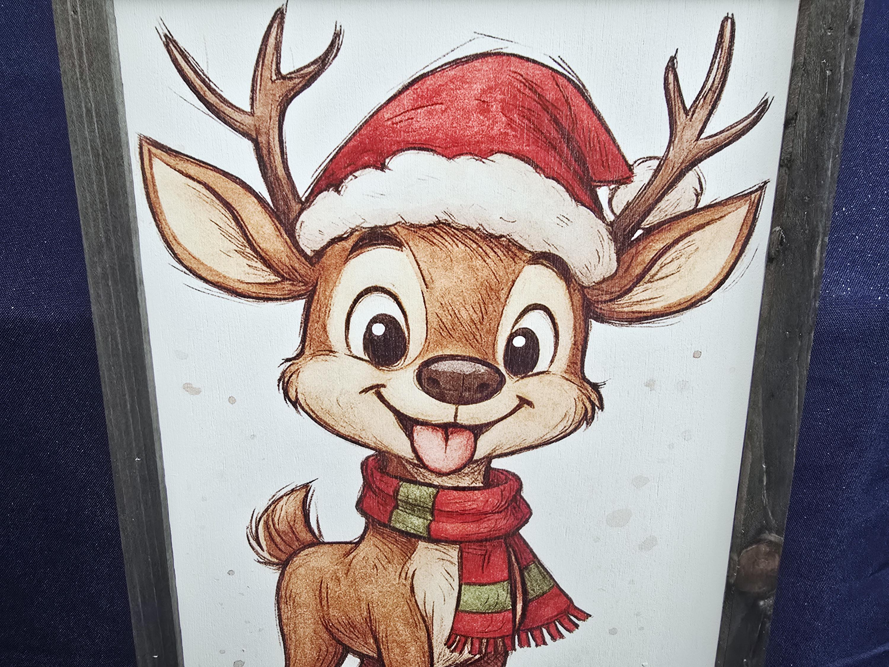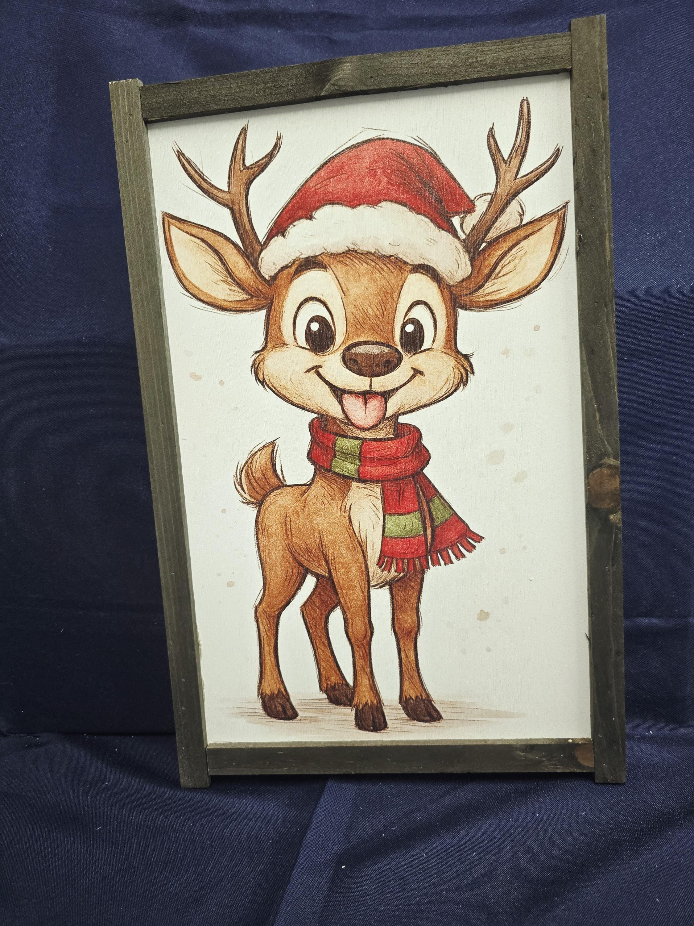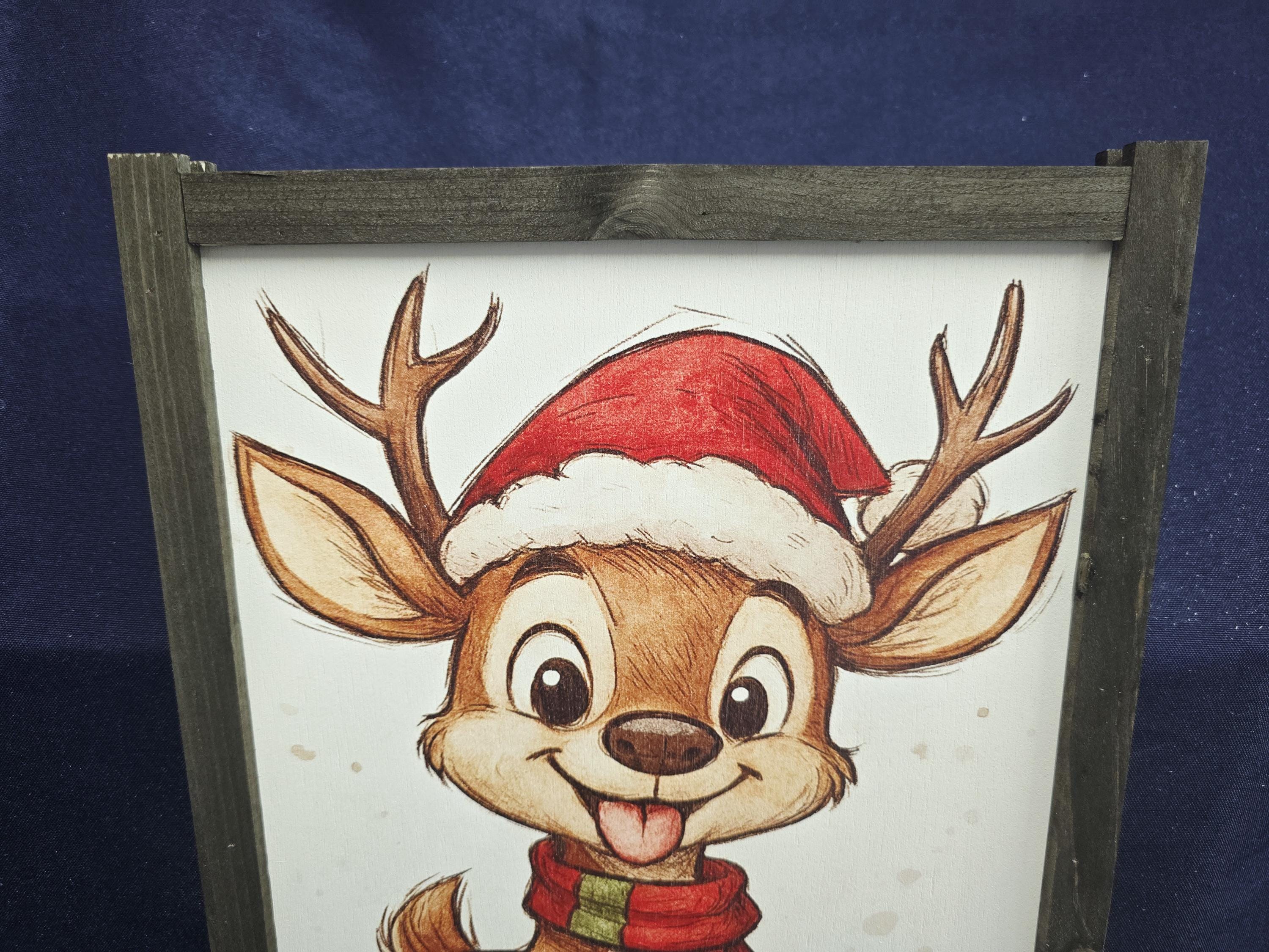 Add a dash of festive fun to your holiday decor with this charming framed sign featuring a cartoon reindeer dressed in a Santa hat and striped scarf. With its joyful expression and bright, playful design, this piece brings warmth and whimsy to any room. Perfect for kids’ spaces, holiday parties, or cozy seasonal displays, it’s a delightful way to celebrate the spirit of Christmas with a smile.