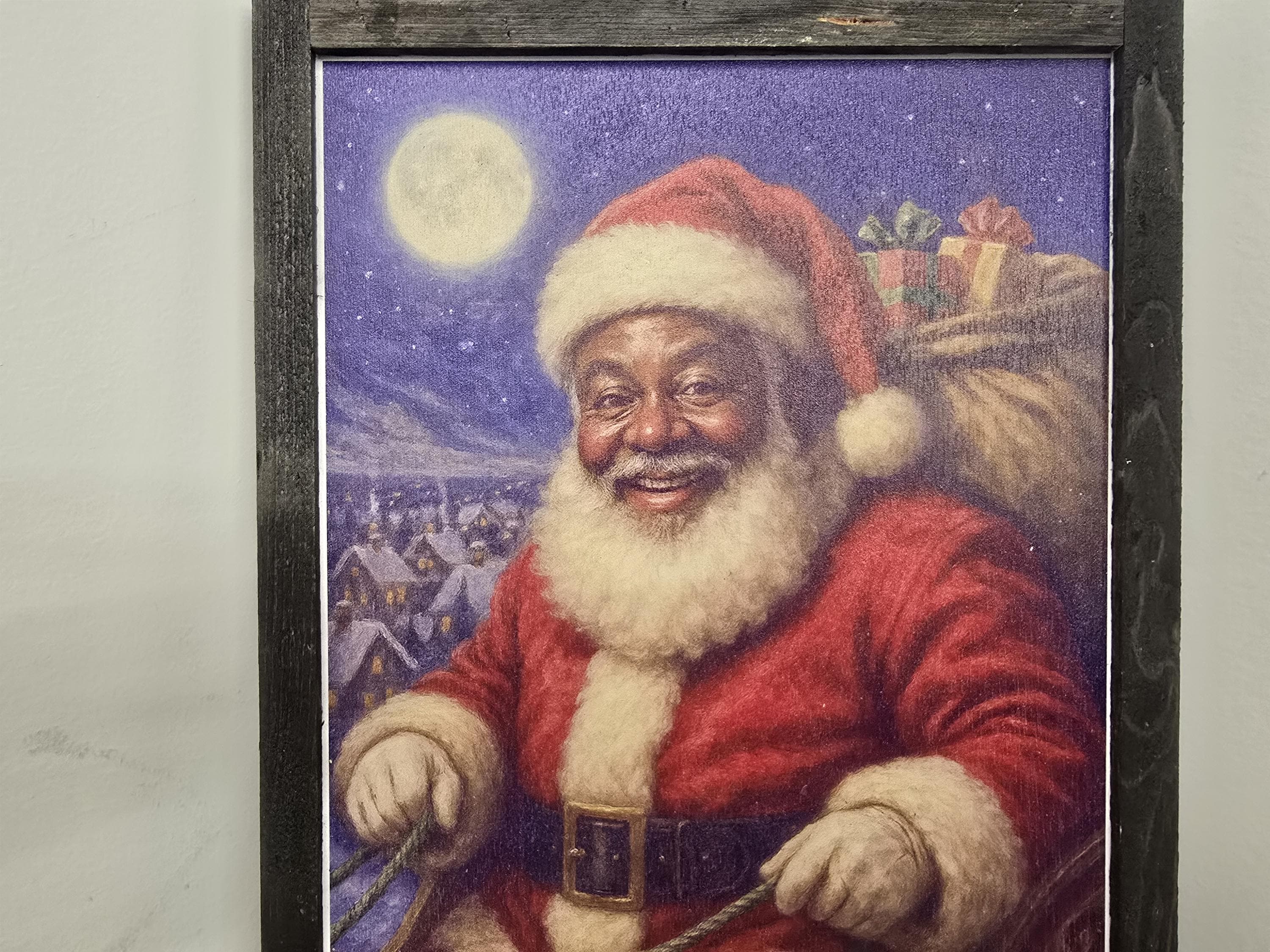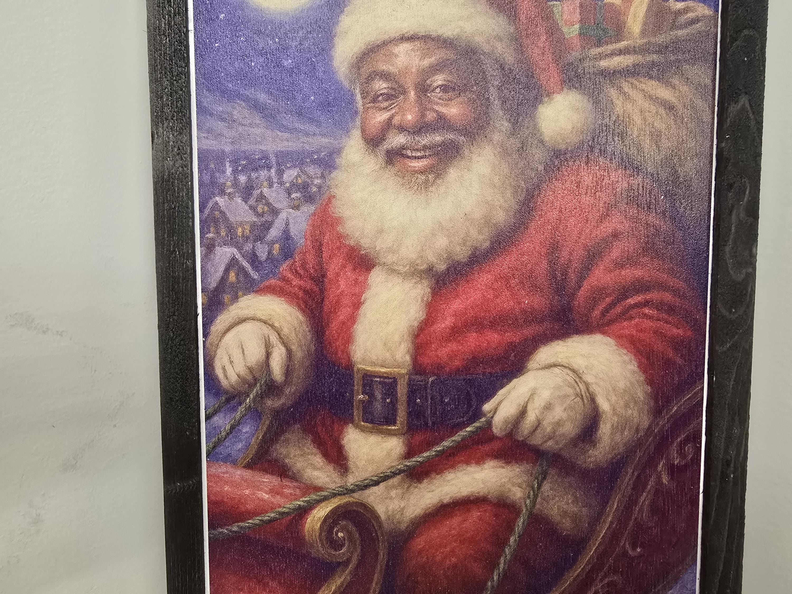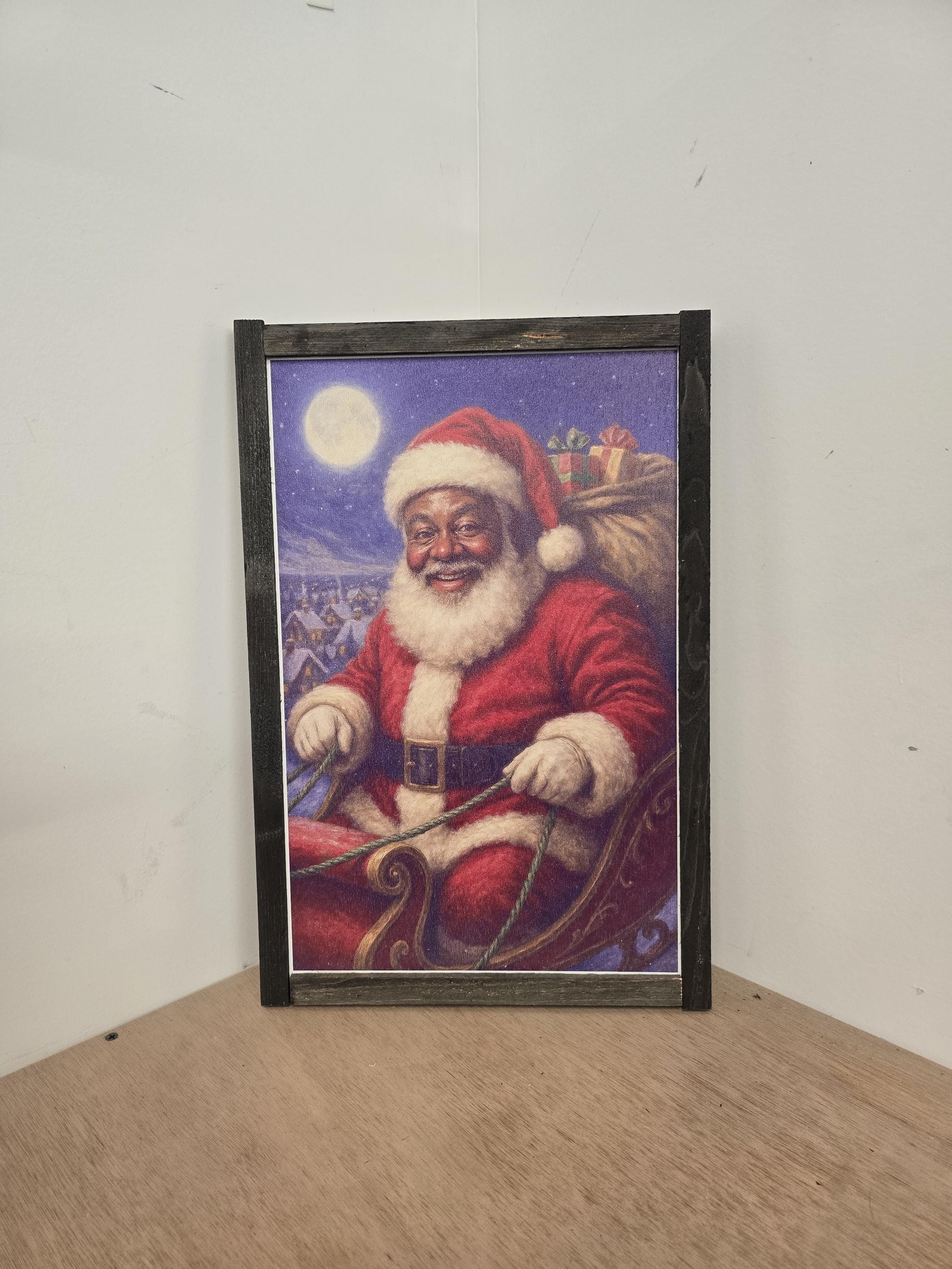 Celebrate the magic of Christmas with this beautifully framed artwork featuring Santa Claus in his iconic red suit, holding the reins of his sleigh and a sack full of presents. Set against a snowy village backdrop under a glowing full moon, this detailed illustration captures the warmth, generosity, and wonder of the holiday season. A perfect addition to your festive decor, this piece brings nostalgic charm to mantels, entryways, or gift displays.