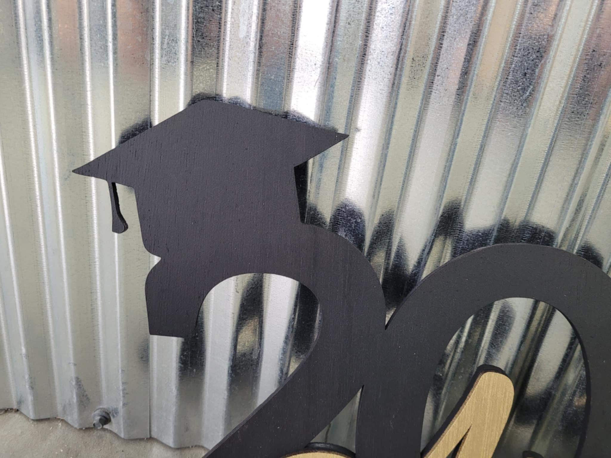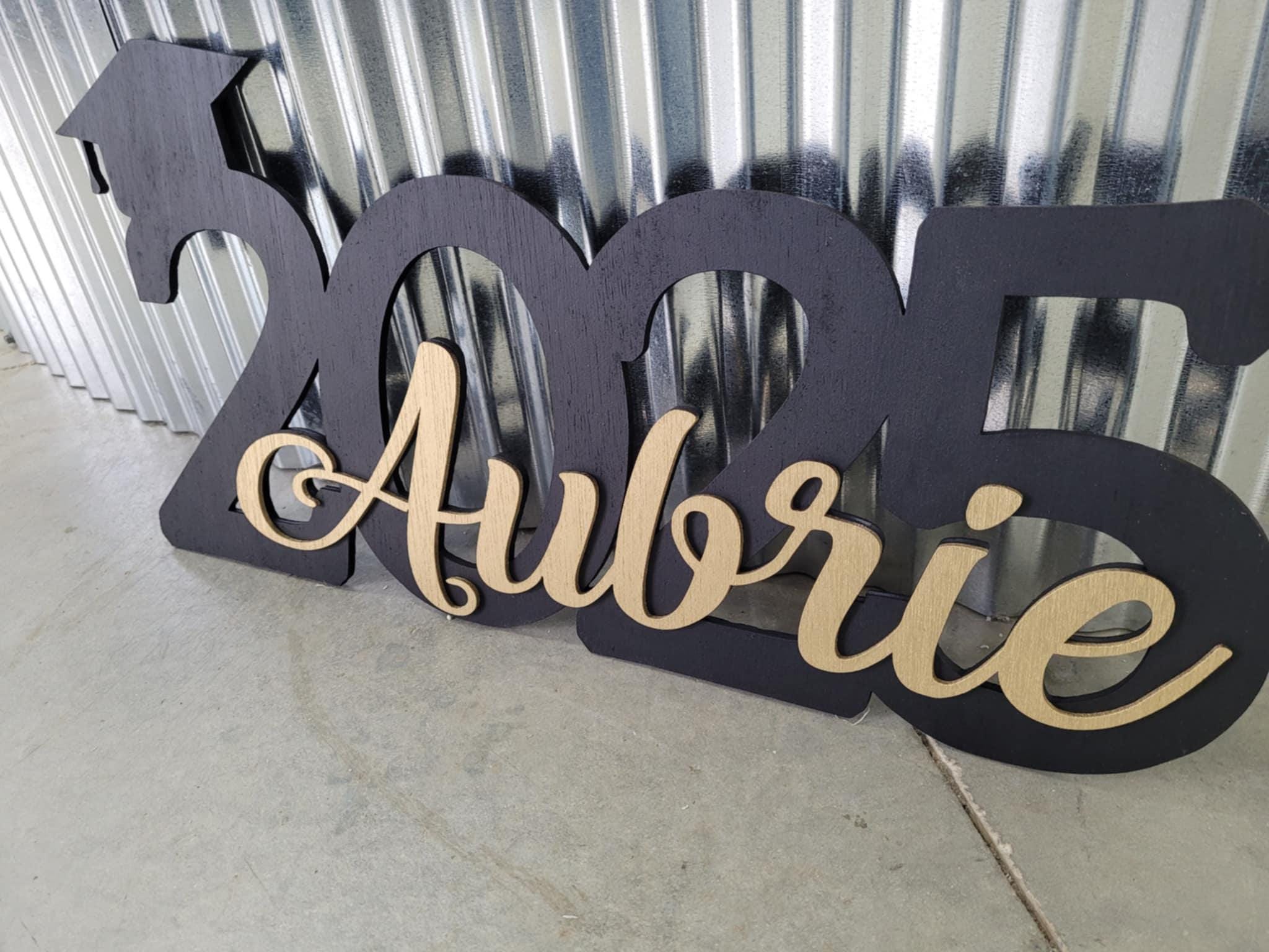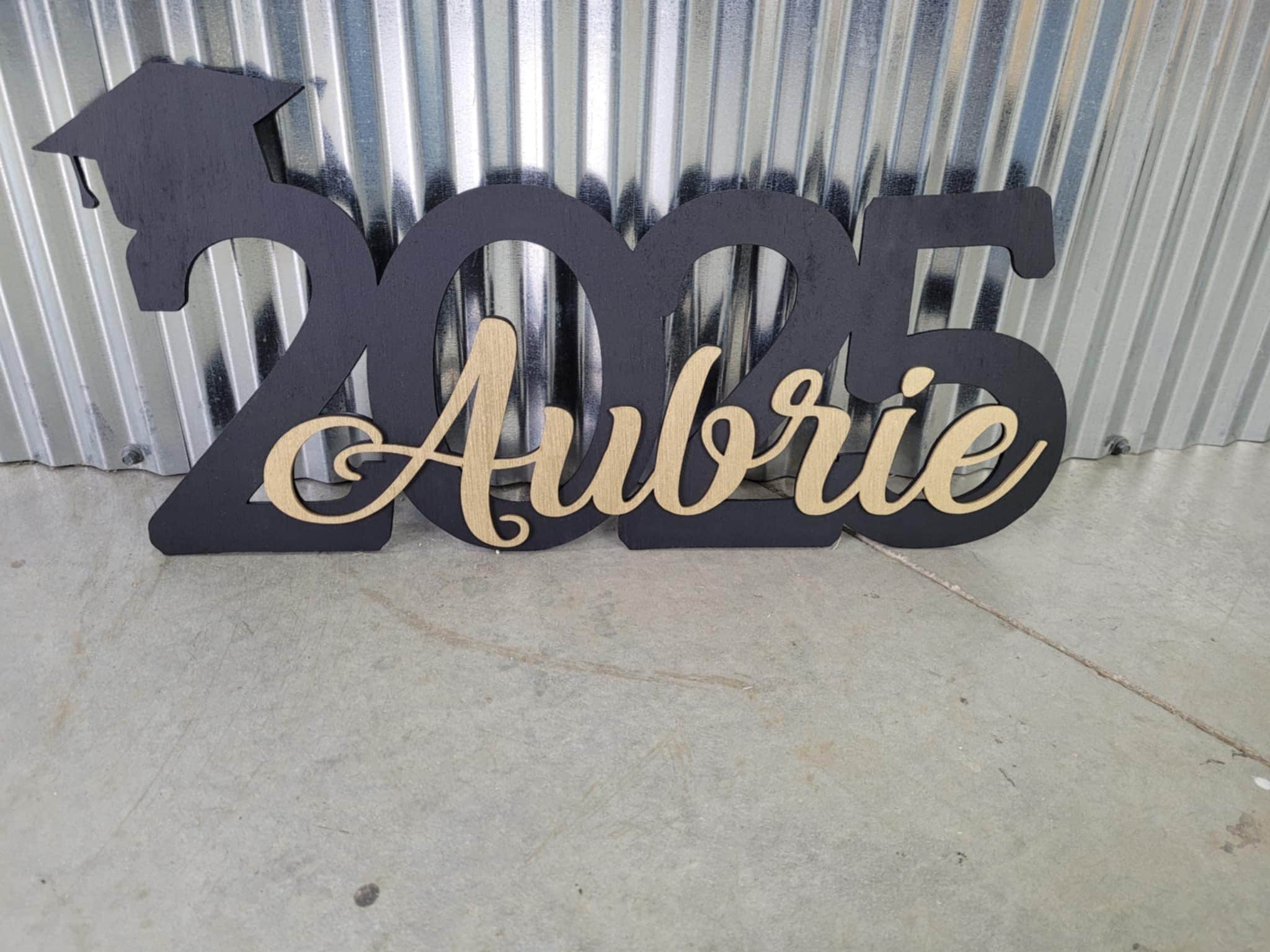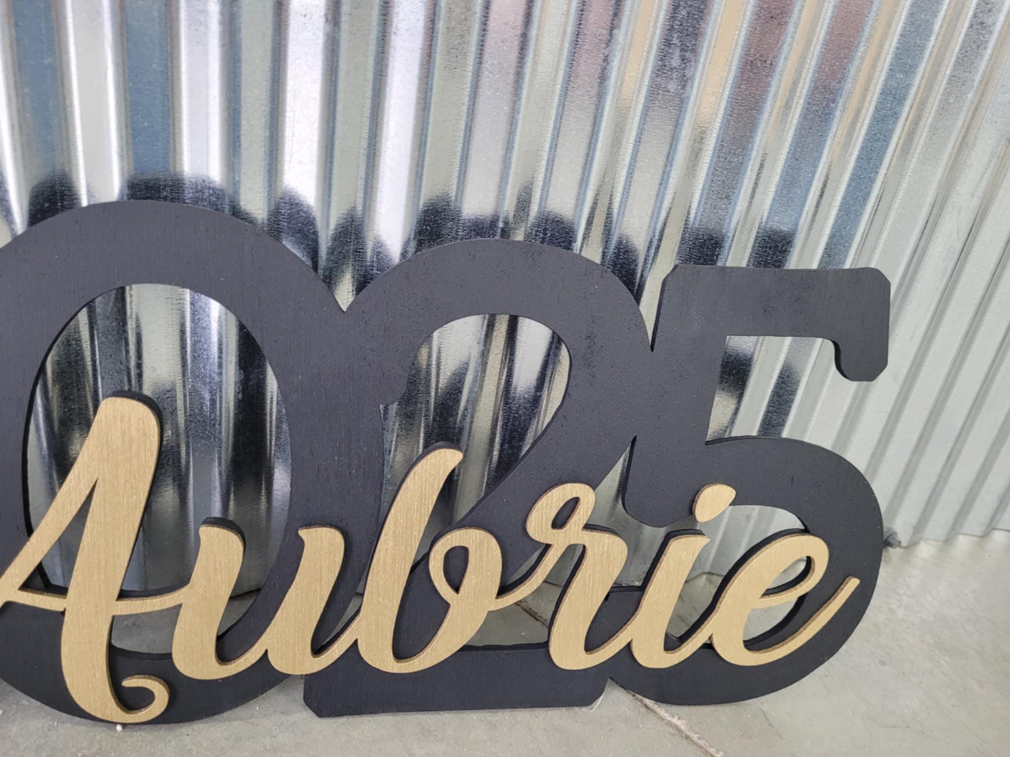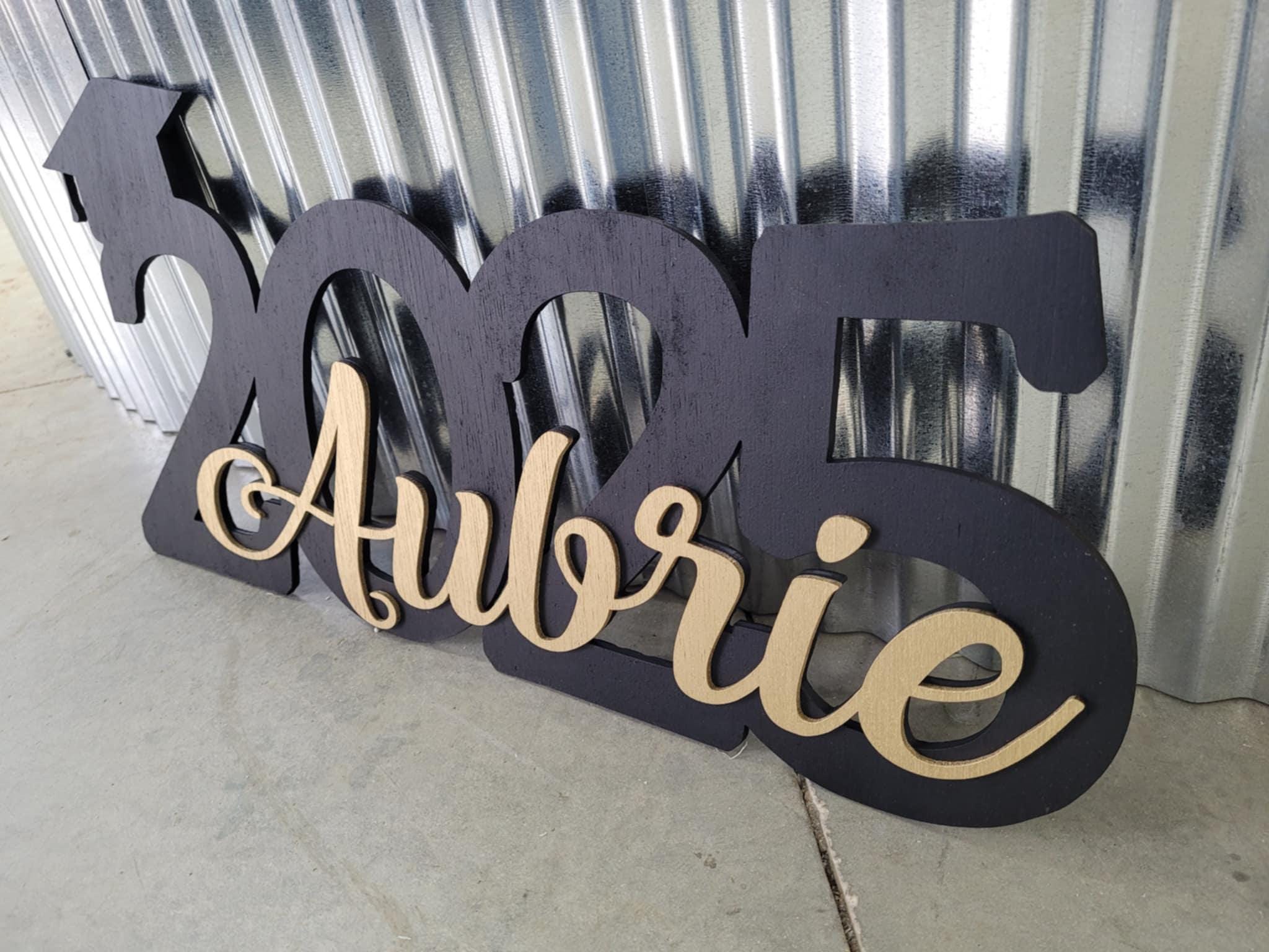It has laser cut plywood letters and graphics. Your custom sign will NOT come standard with these graphics or lettering. All components can be customized. This sign is unframed, has a black painted backer backerboard, and metallic gold painted letters.
