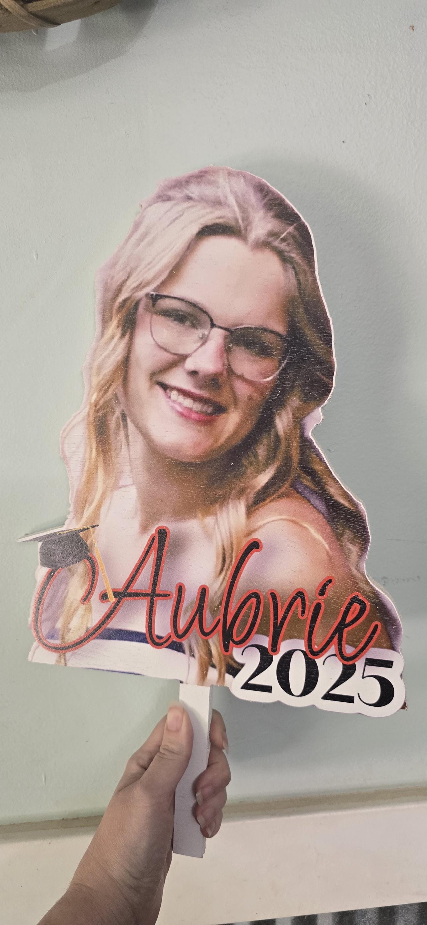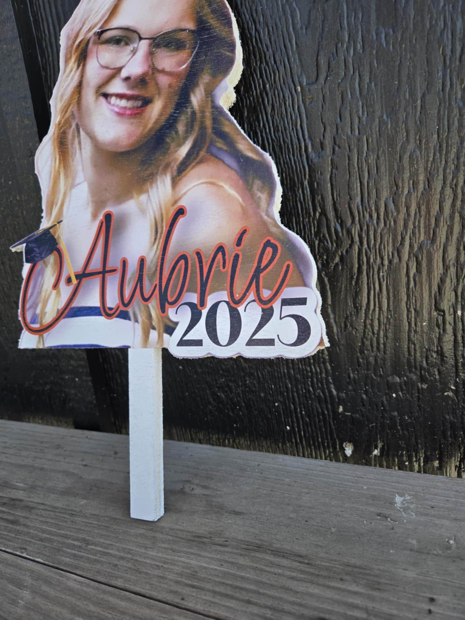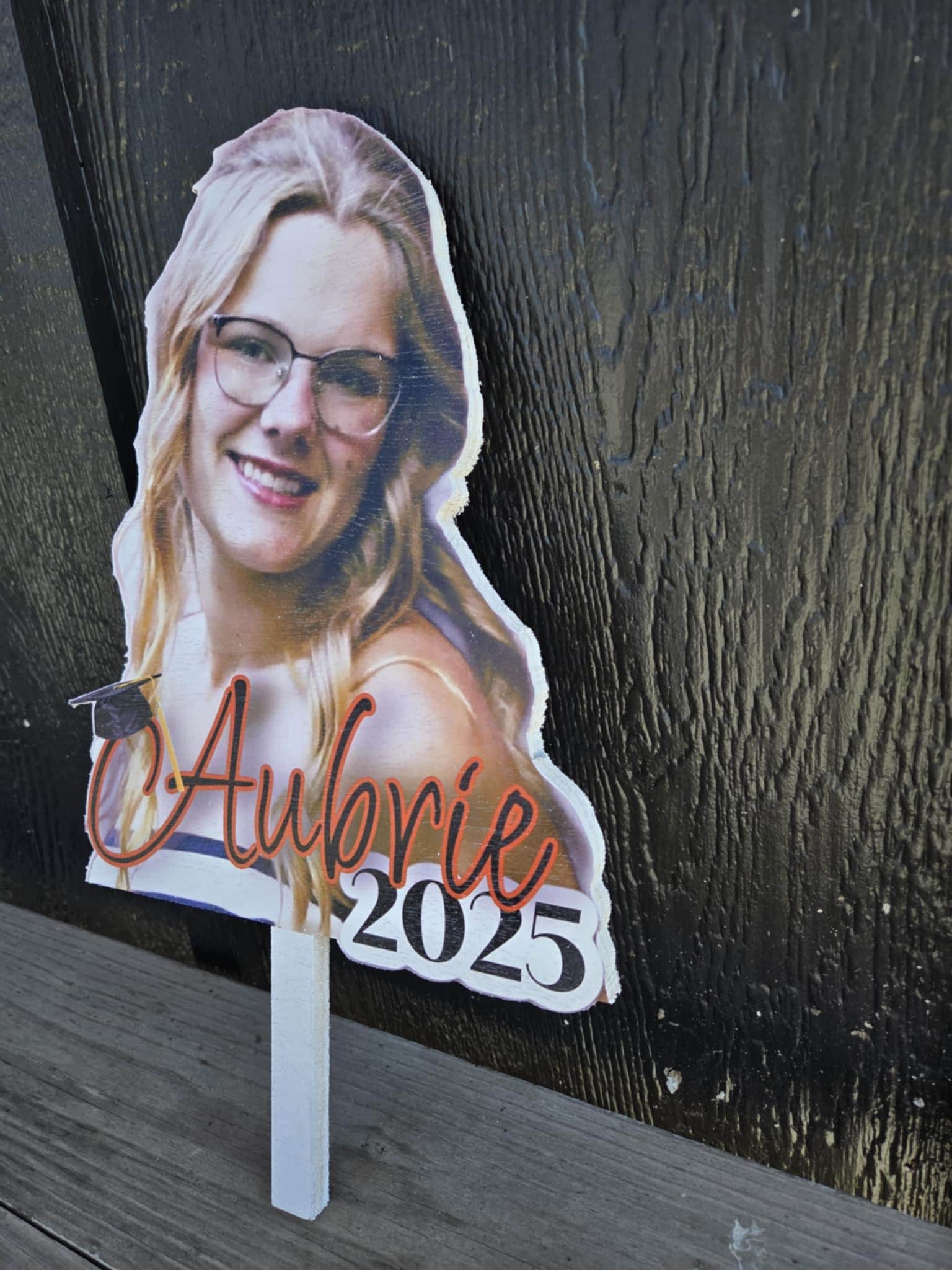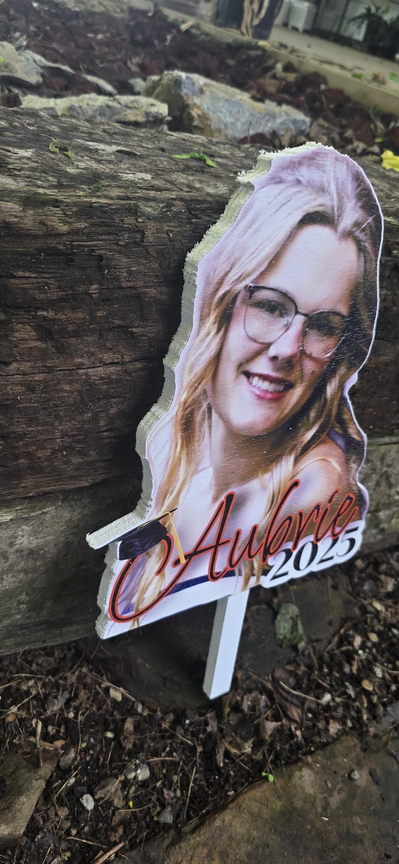 Celebrate your graduate with a custom wood‑printed photo cutout sign that’s full of personality and perfect for display. Each sign is crafted from durable wood and printed with a high‑quality image, shaped around the subject for a bold, modern look. The name and graduation year are added in vibrant lettering, creating a standout keepsake they’ll treasure long after the tassel turns.