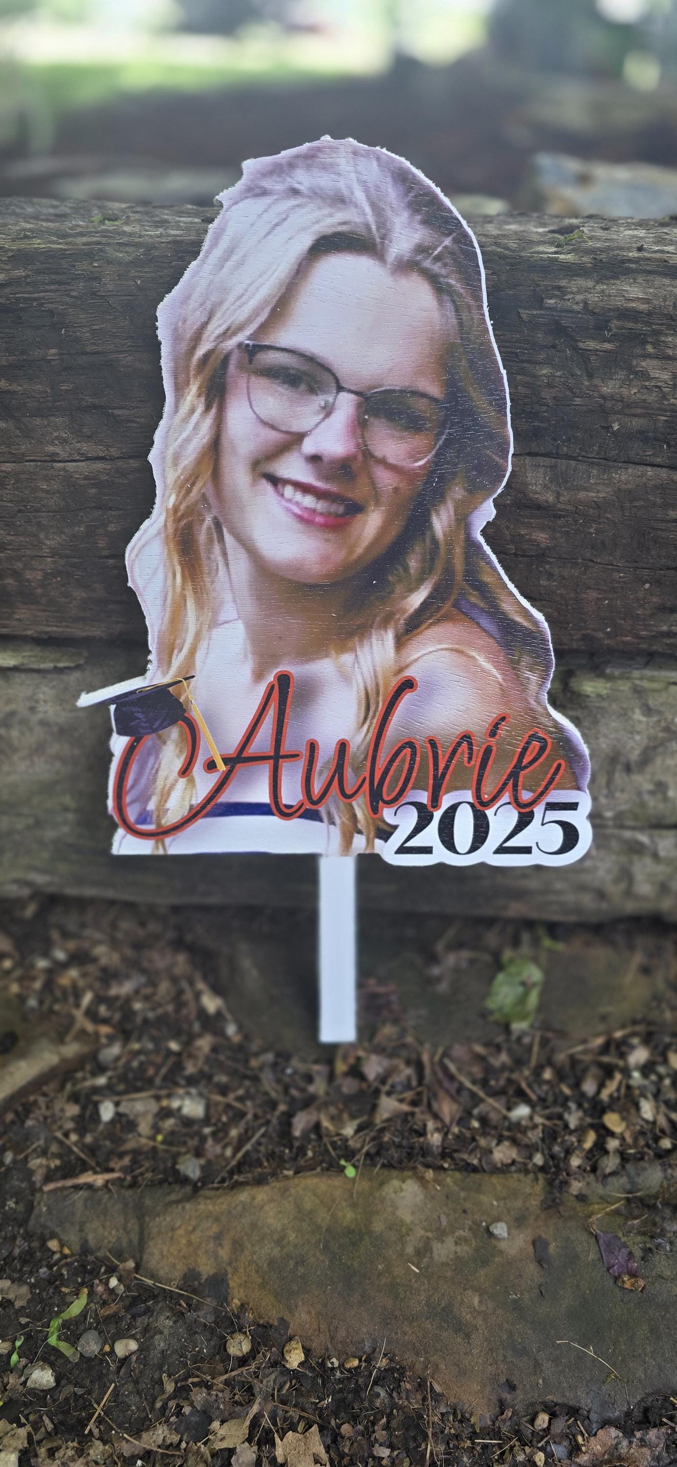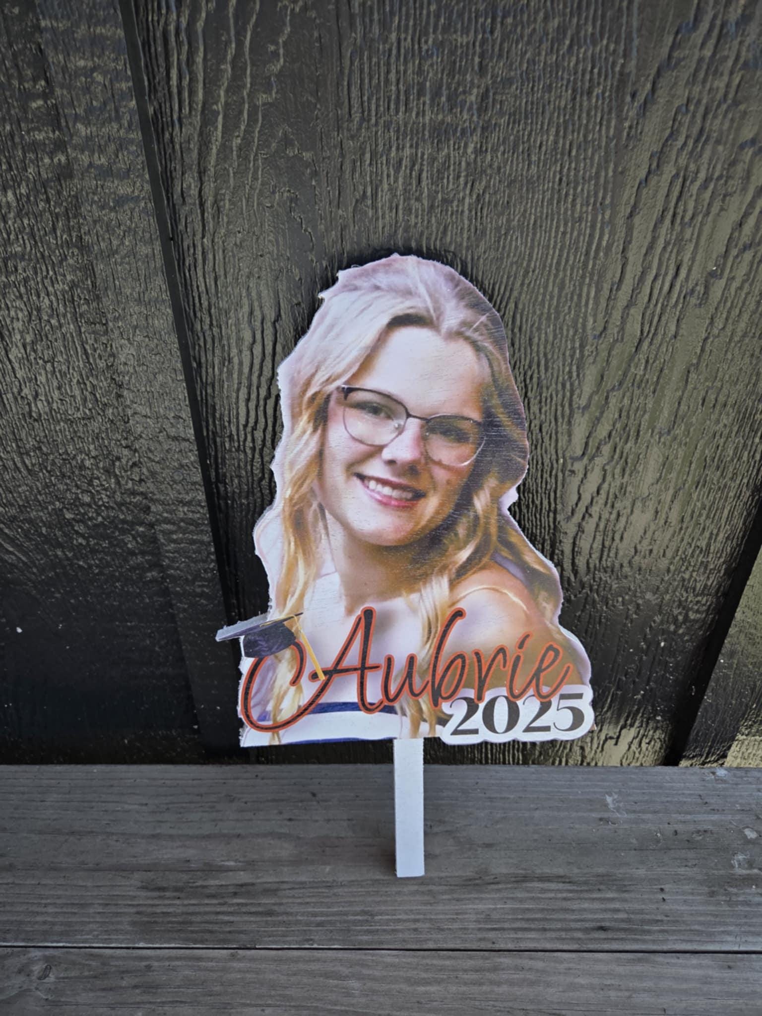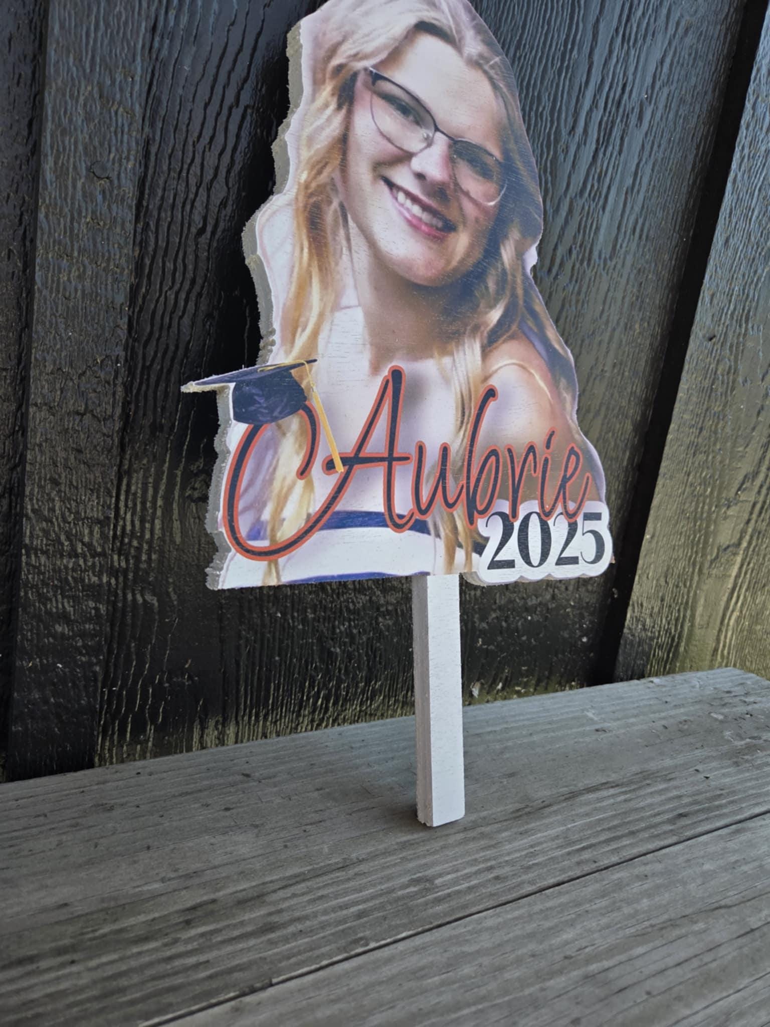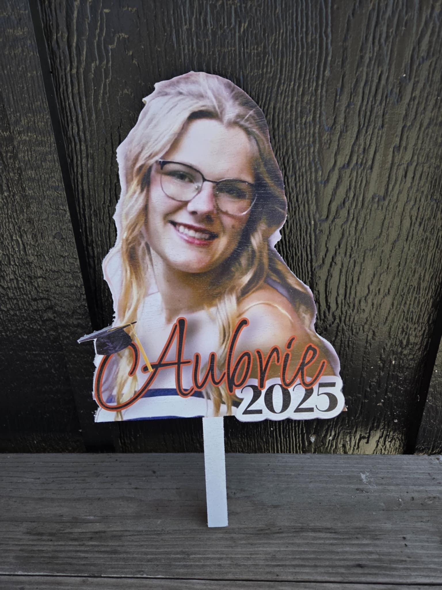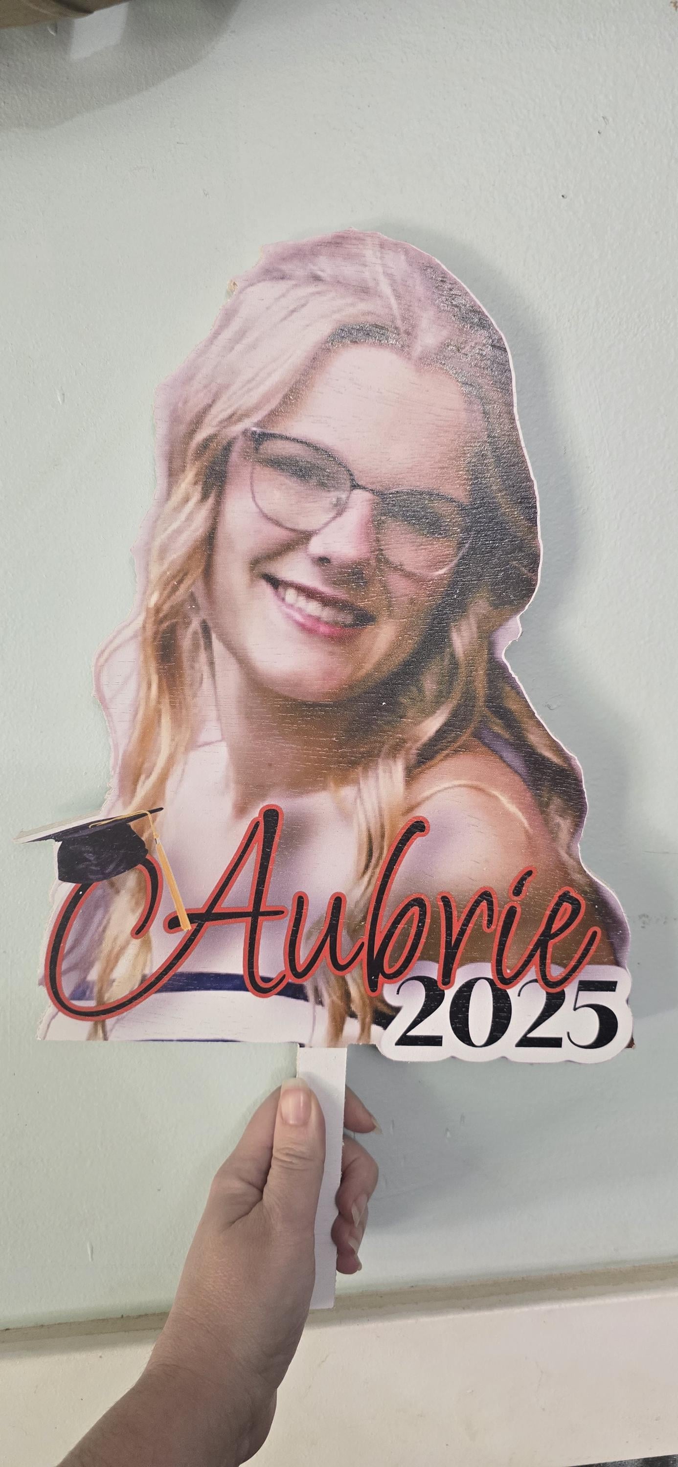 Celebrate your graduate with a custom wood‑printed photo cutout sign that’s full of personality and perfect for display. Each sign is crafted from durable wood and printed with a high‑quality image, shaped around the subject for a bold, modern look. The name and graduation year are added in vibrant lettering, creating a standout keepsake they’ll treasure long after the tassel turns.