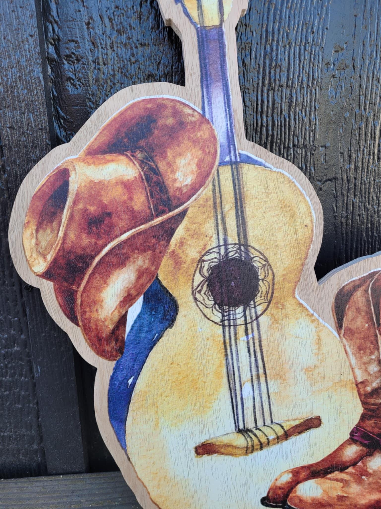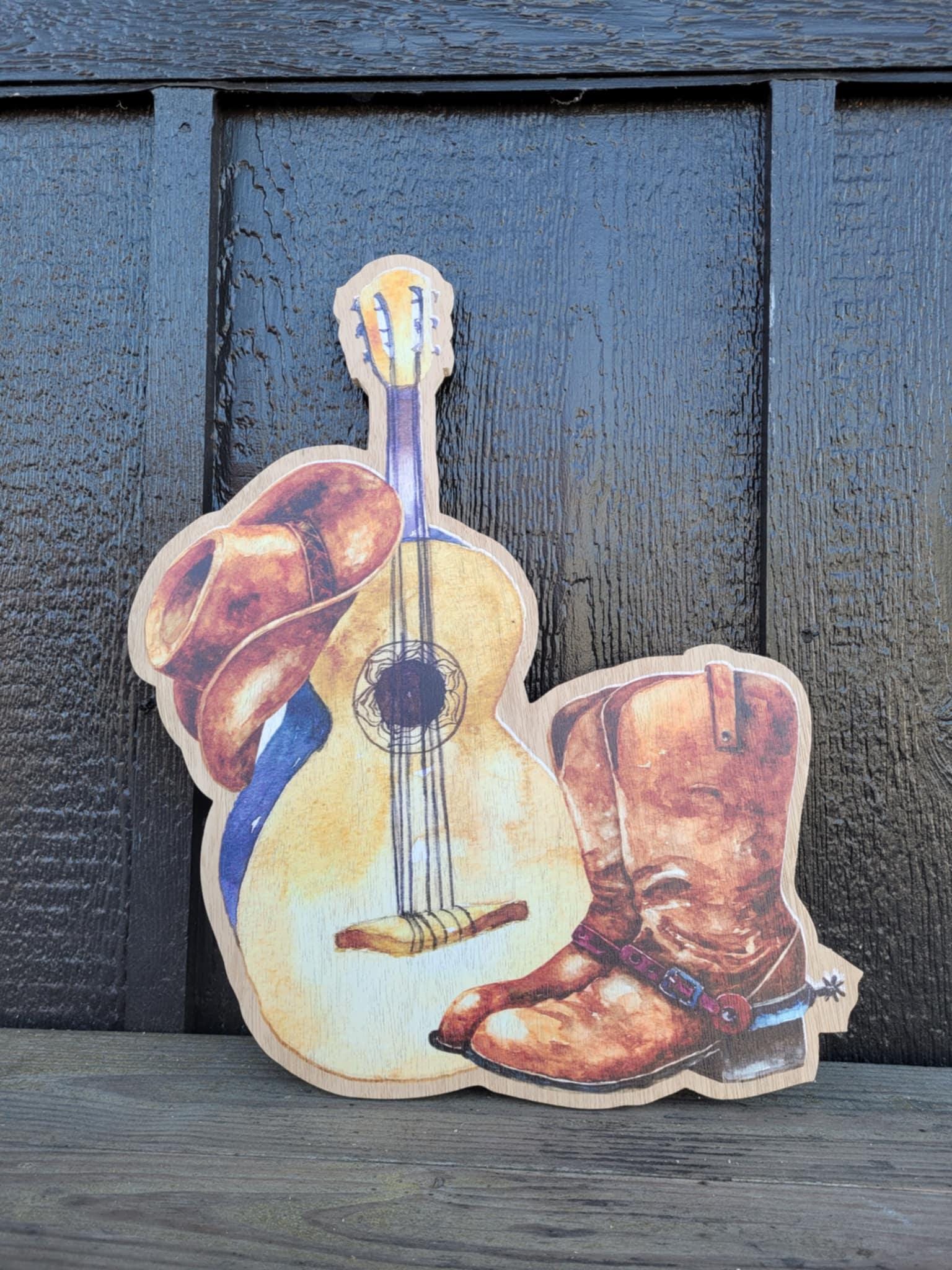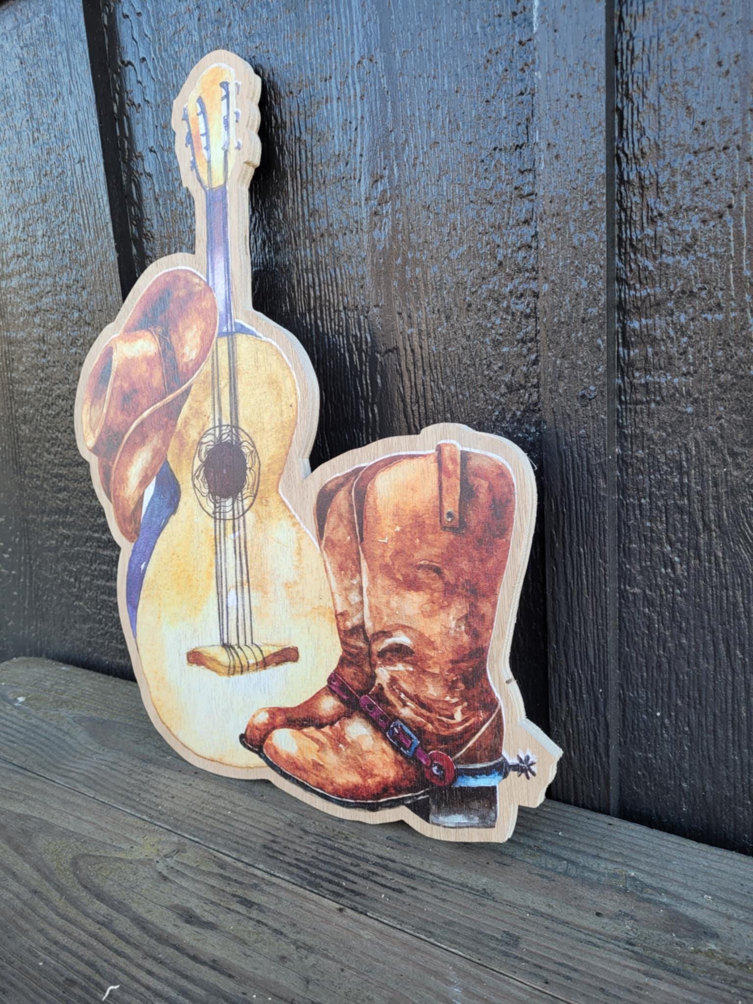 Cowboy hat, guitar, and boots design are printed onto a 3/8" thick wooden backer. The printing is flat on the surface.