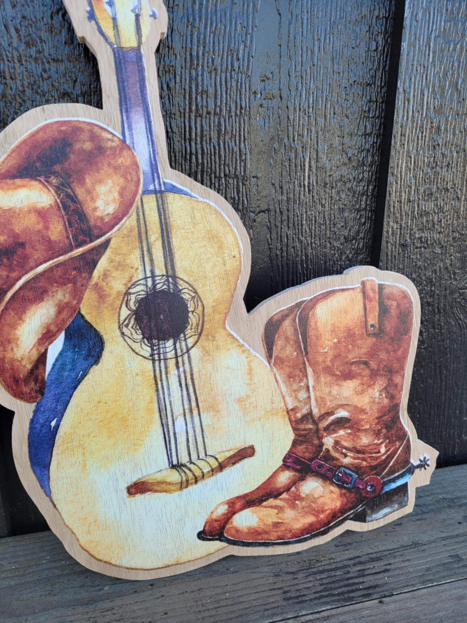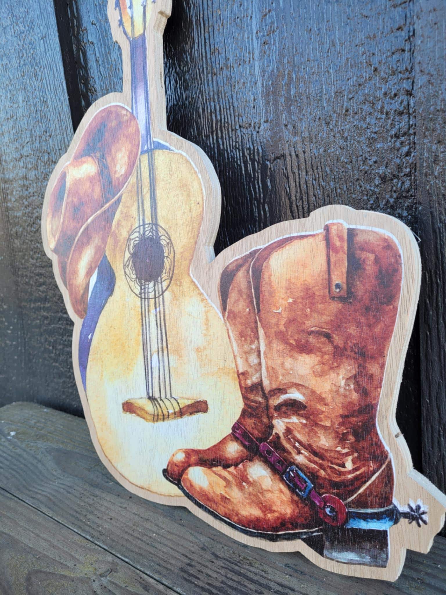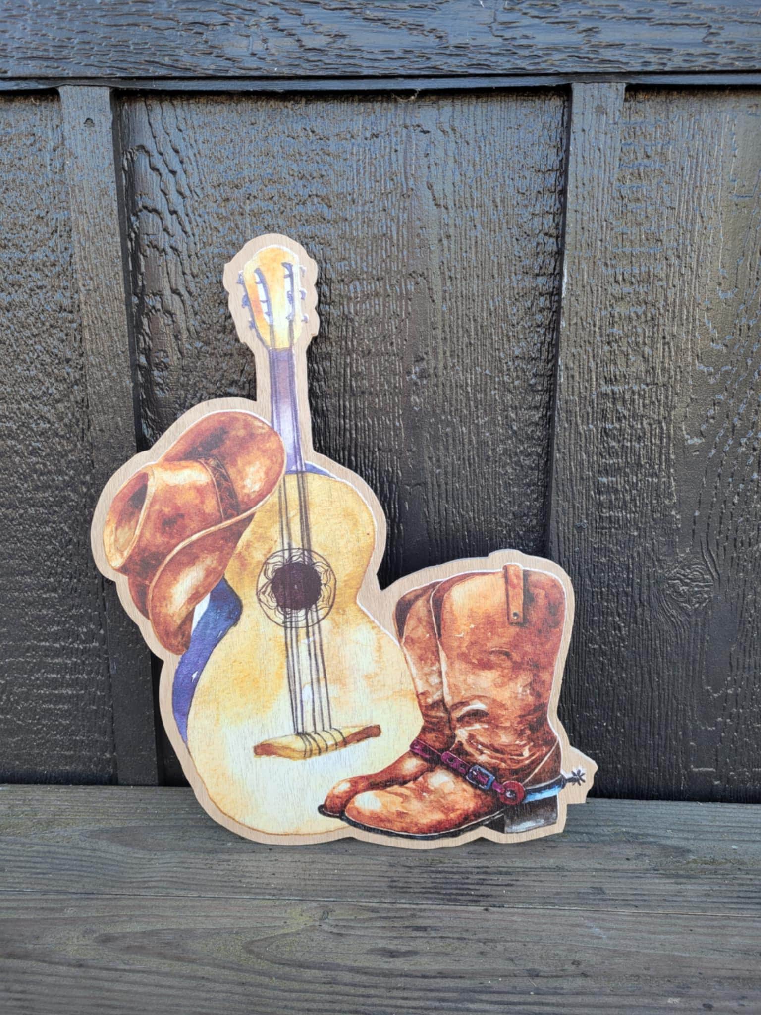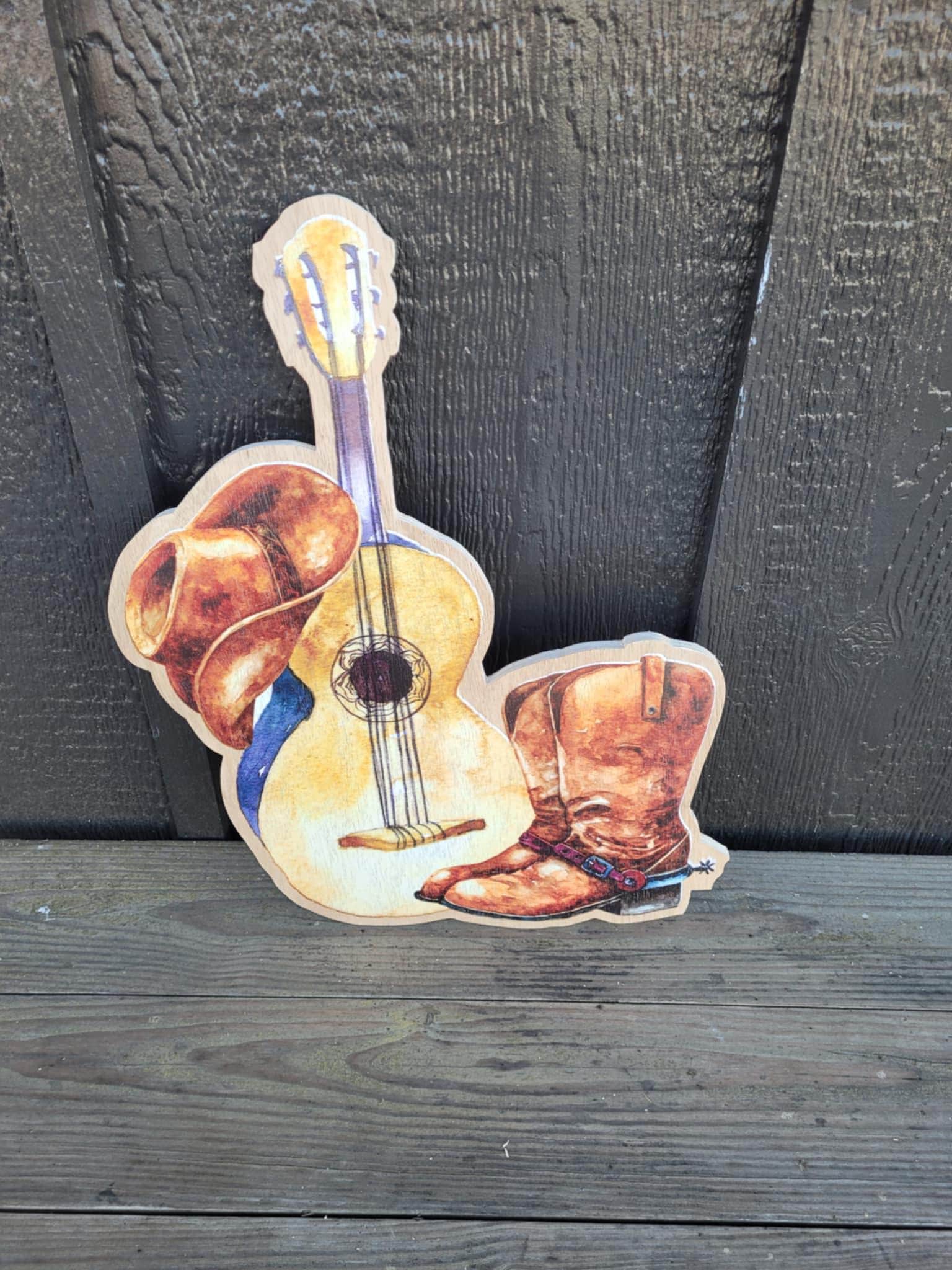 Cowboy hat, guitar, and boots design are printed onto a 3/8" thick wooden backer. The printing is flat on the surface.