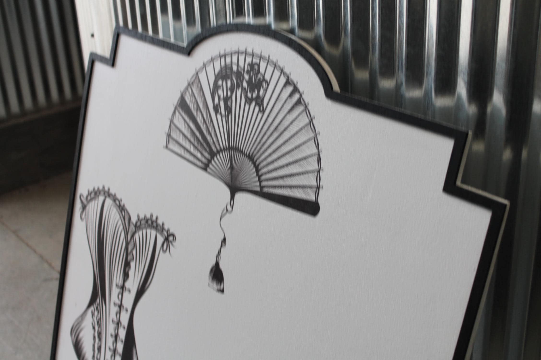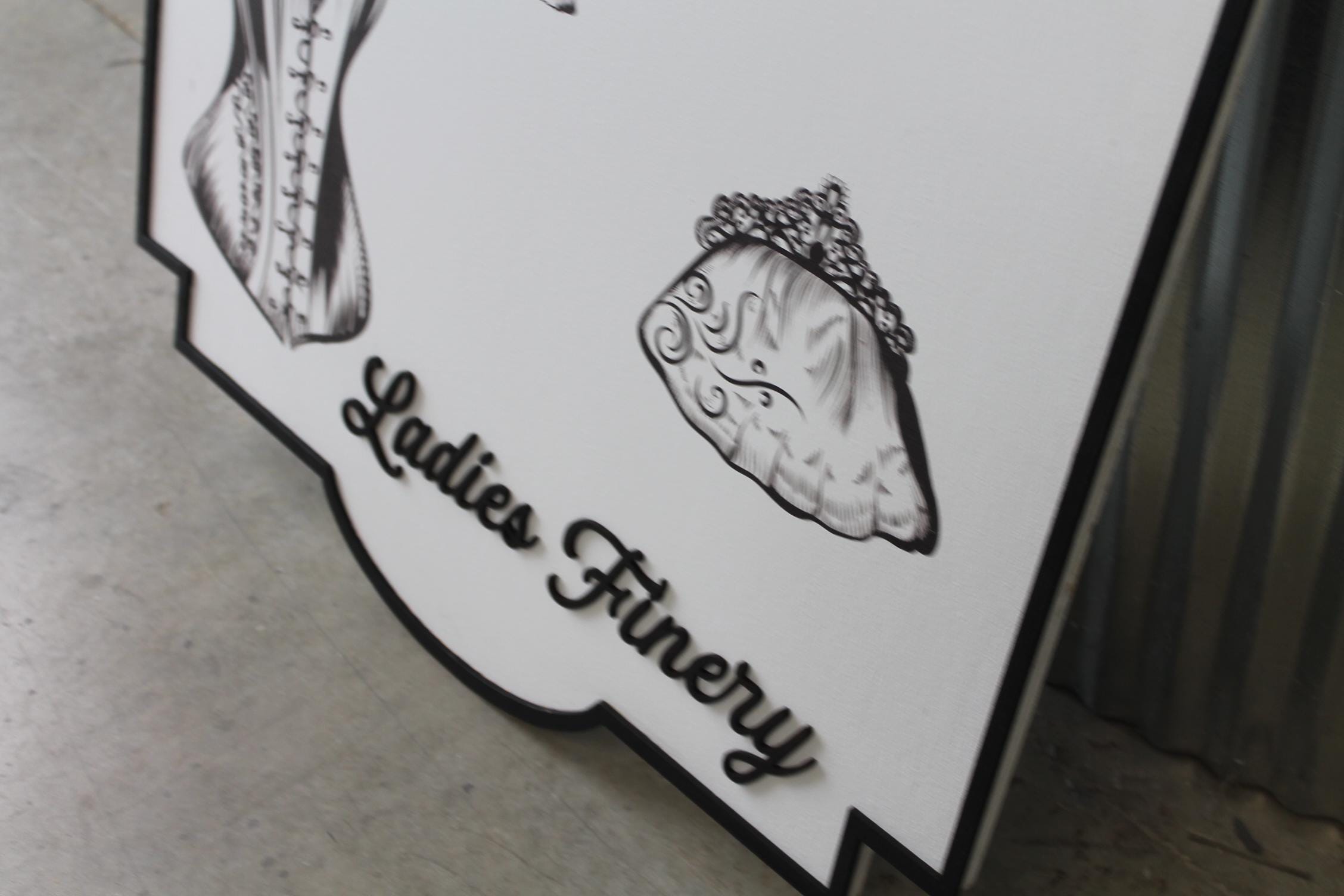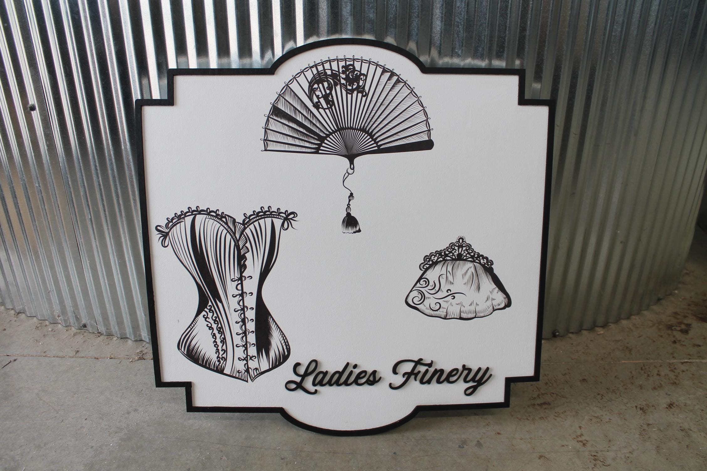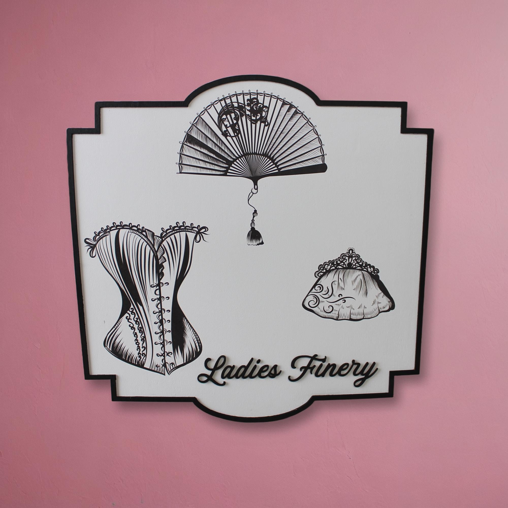 Vintage “Ladies Finery” Wall Sign – Retro Corset, Fan & Purse Décor – Feminine Boutique Style Home Decor, Vanity or Dressing Room Art