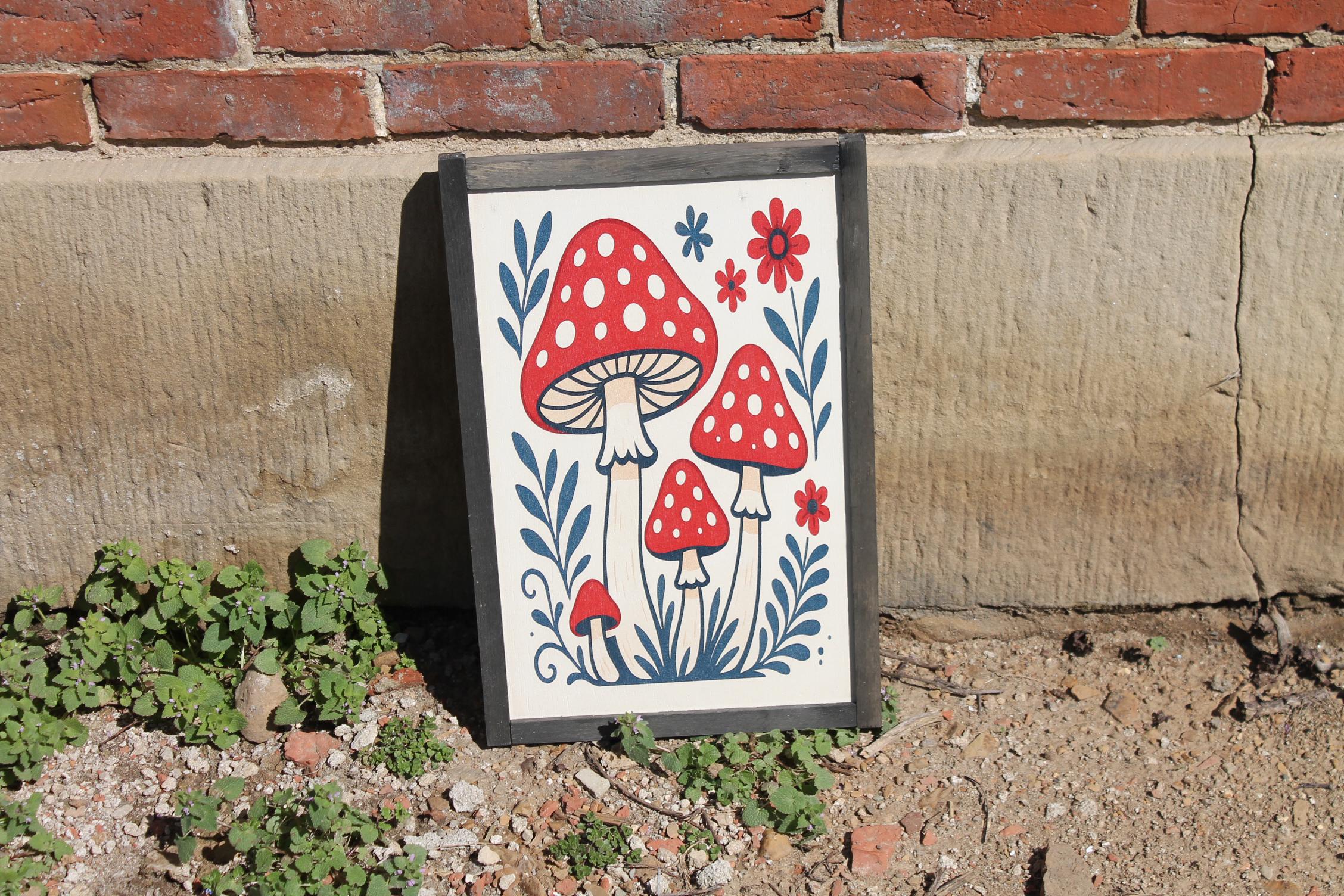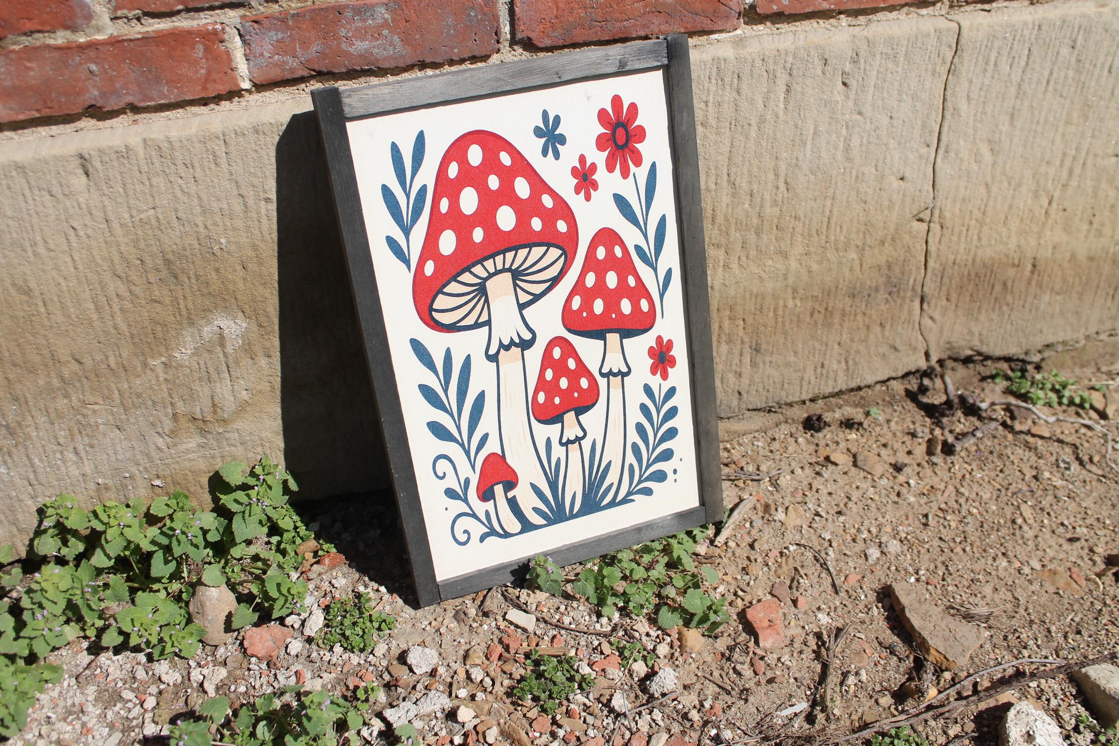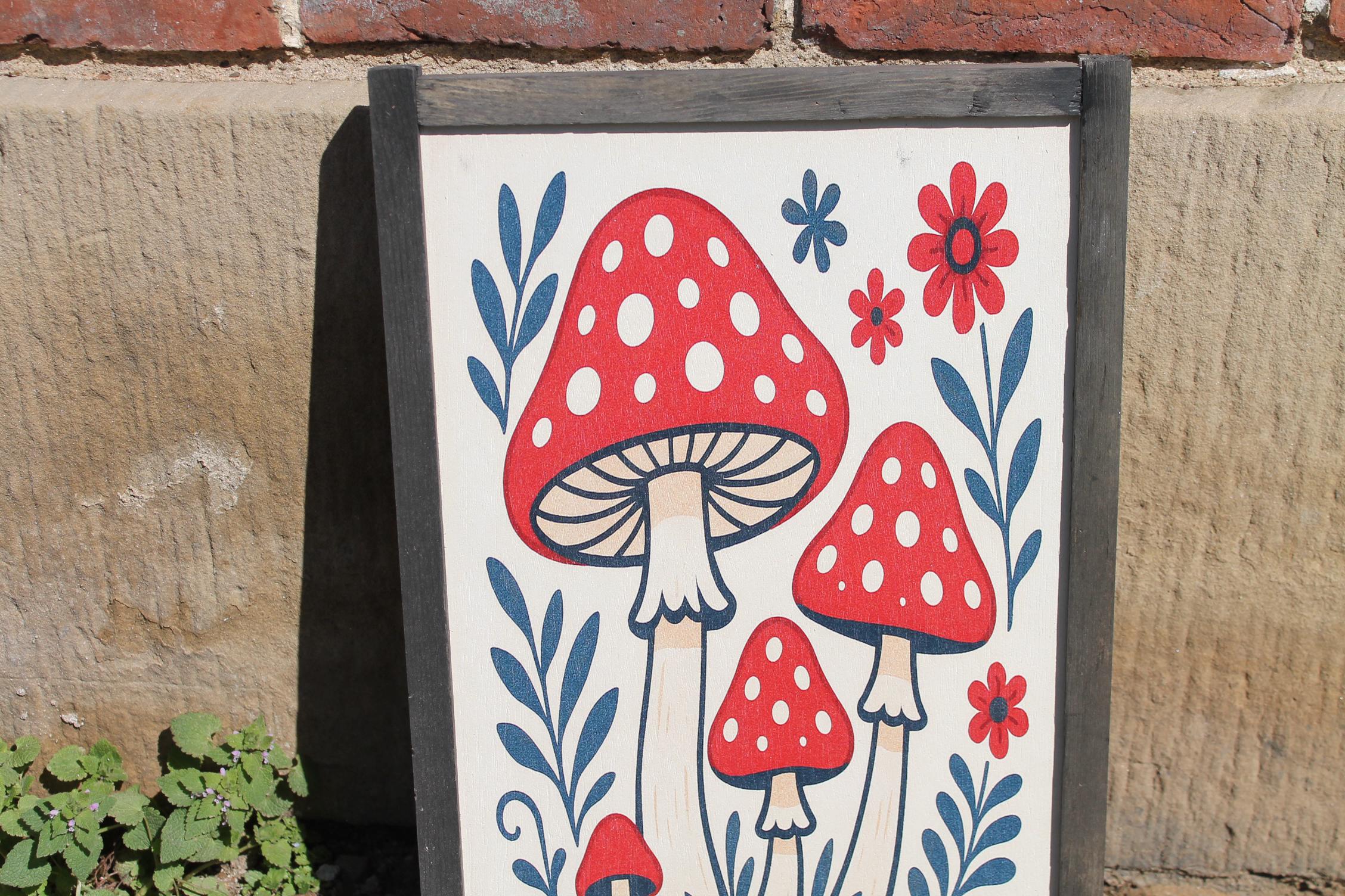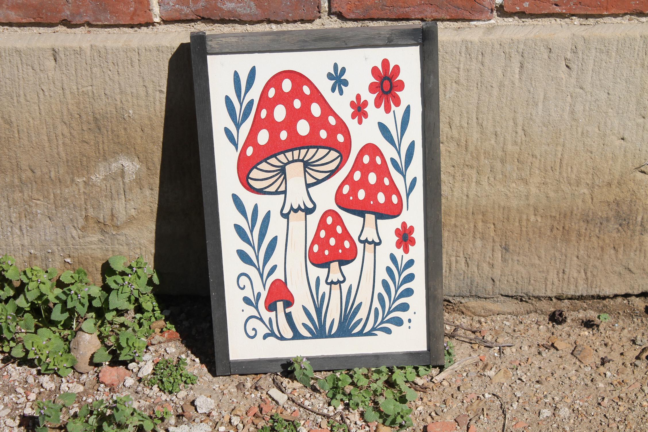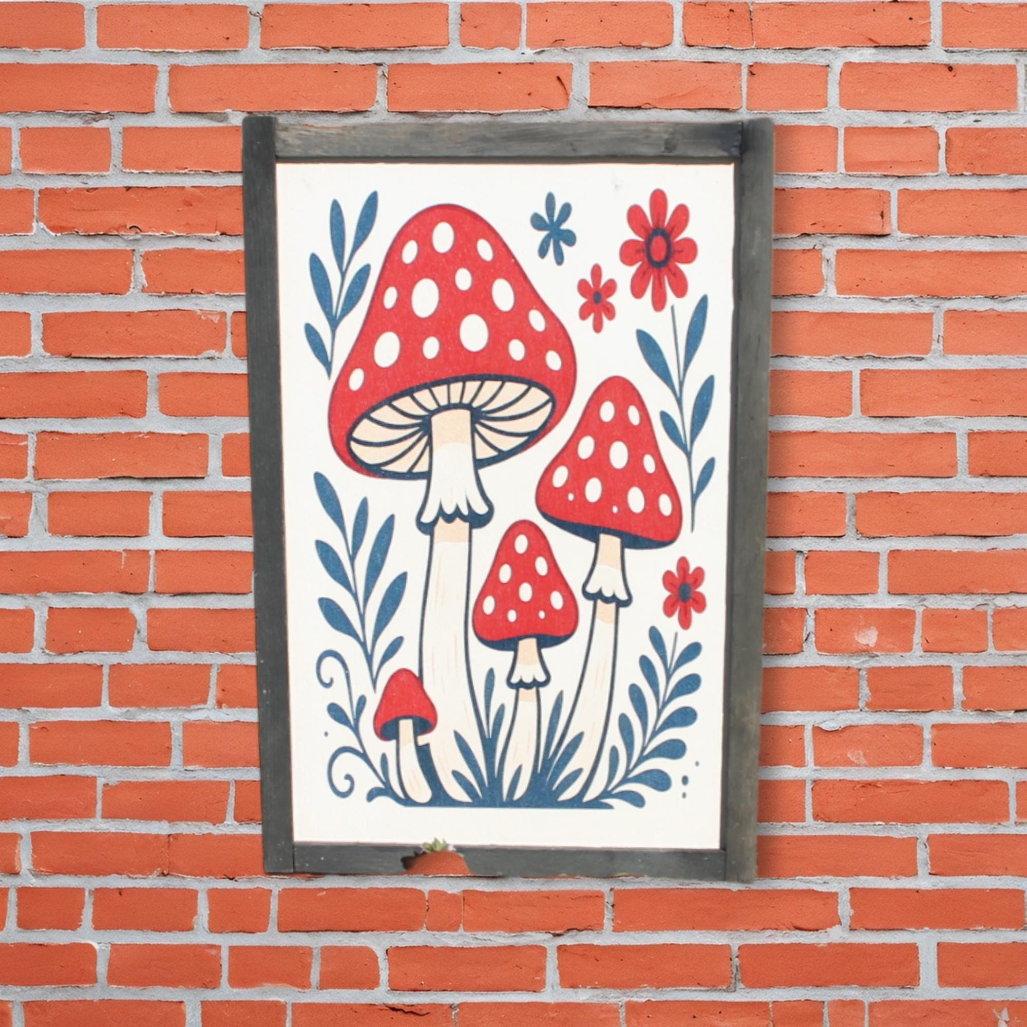 Folk Art Mushroom Wall Print – Red Toadstool Illustration with Flowers & Leaves – Whimsical Cottagecore Nature Decor for Home or Nursery