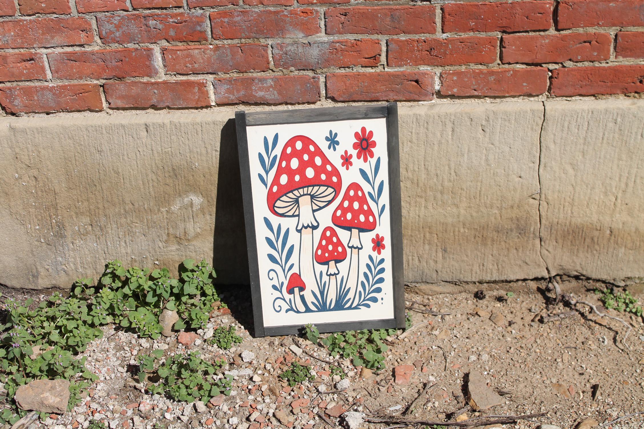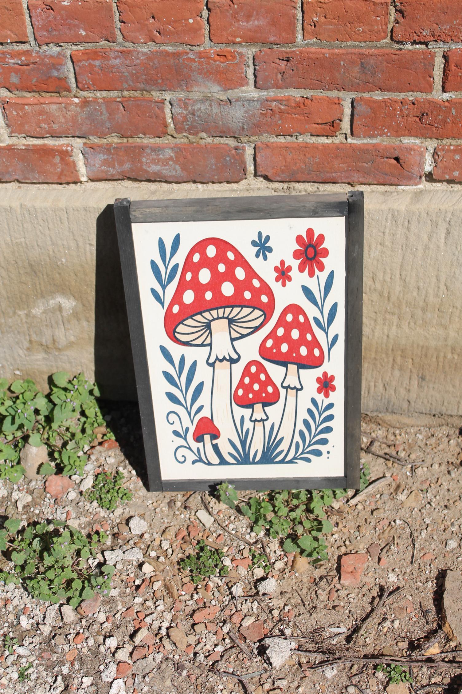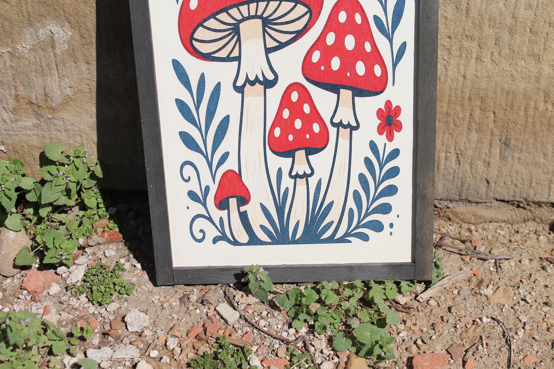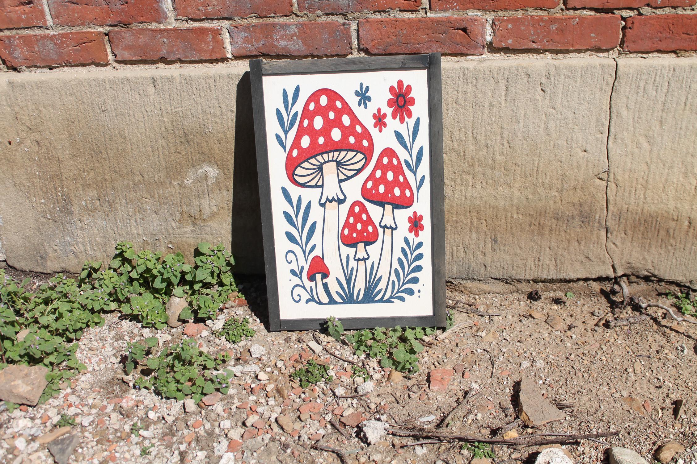 Folk Art Mushroom Wall Print – Red Toadstool Illustration with Flowers & Leaves – Whimsical Cottagecore Nature Decor for Home or Nursery