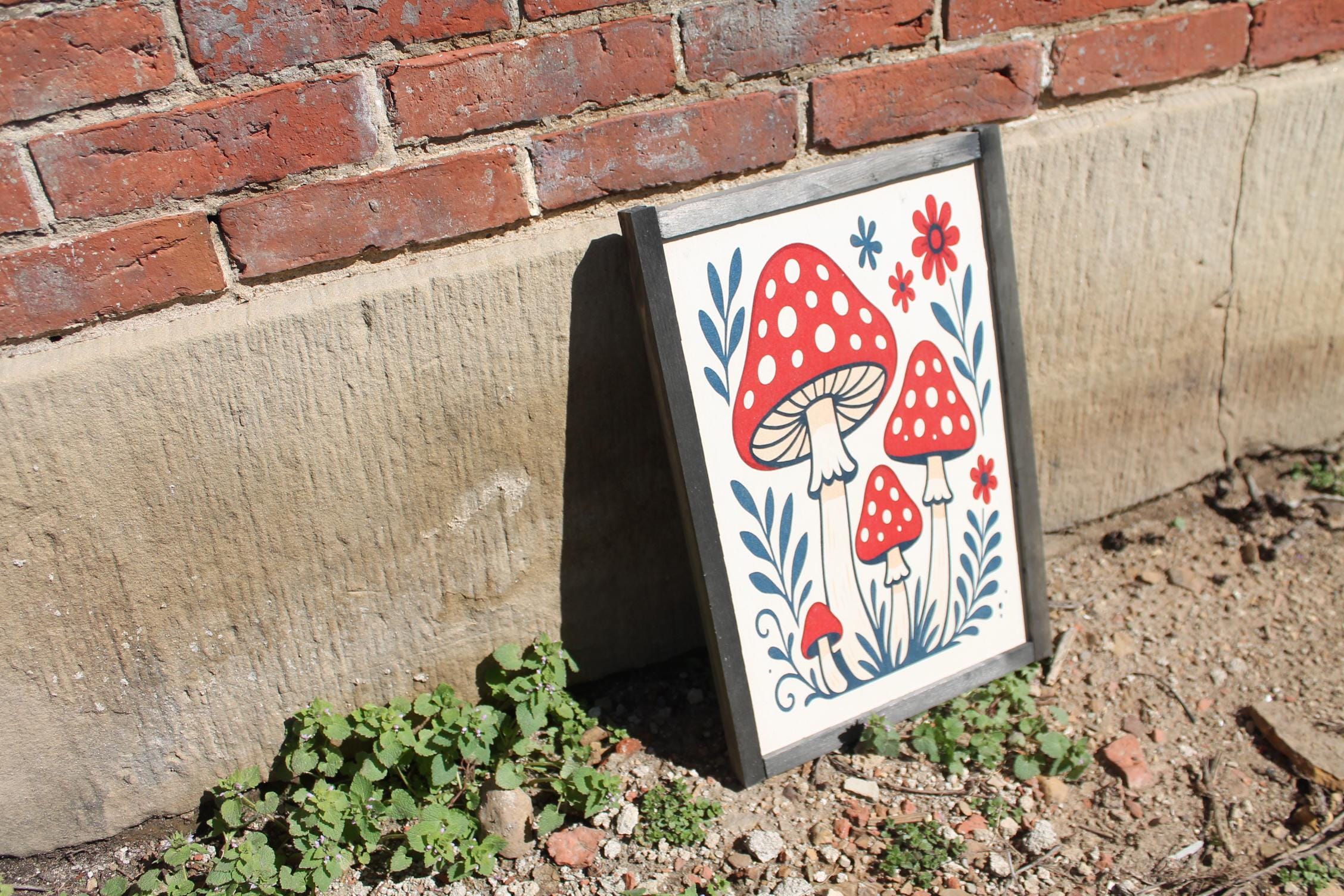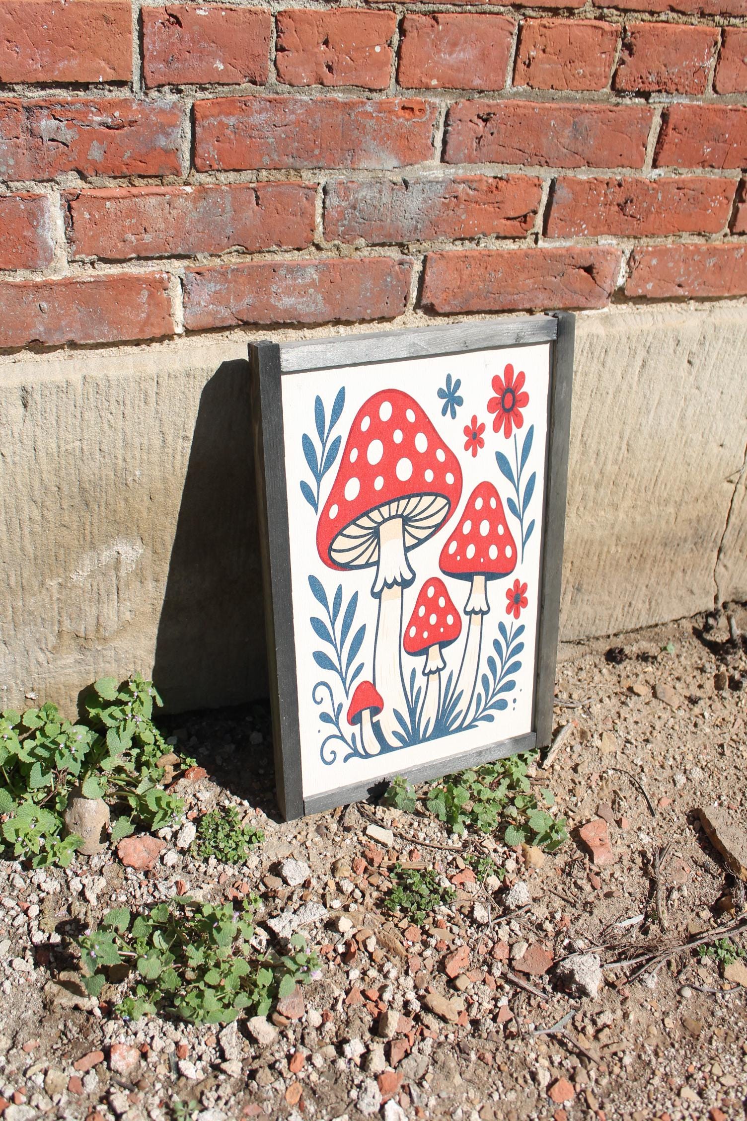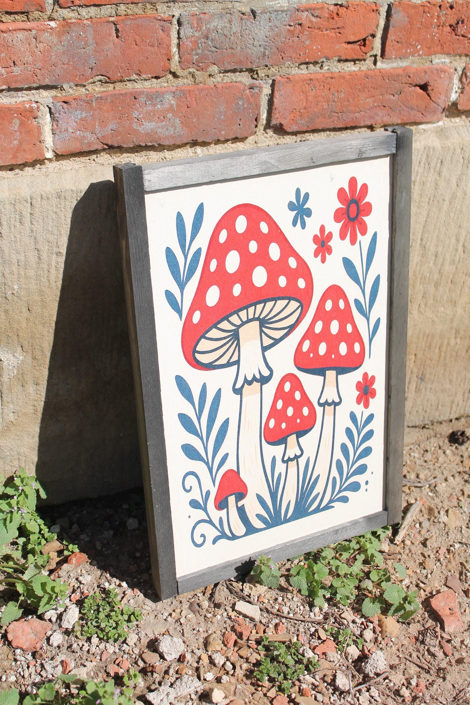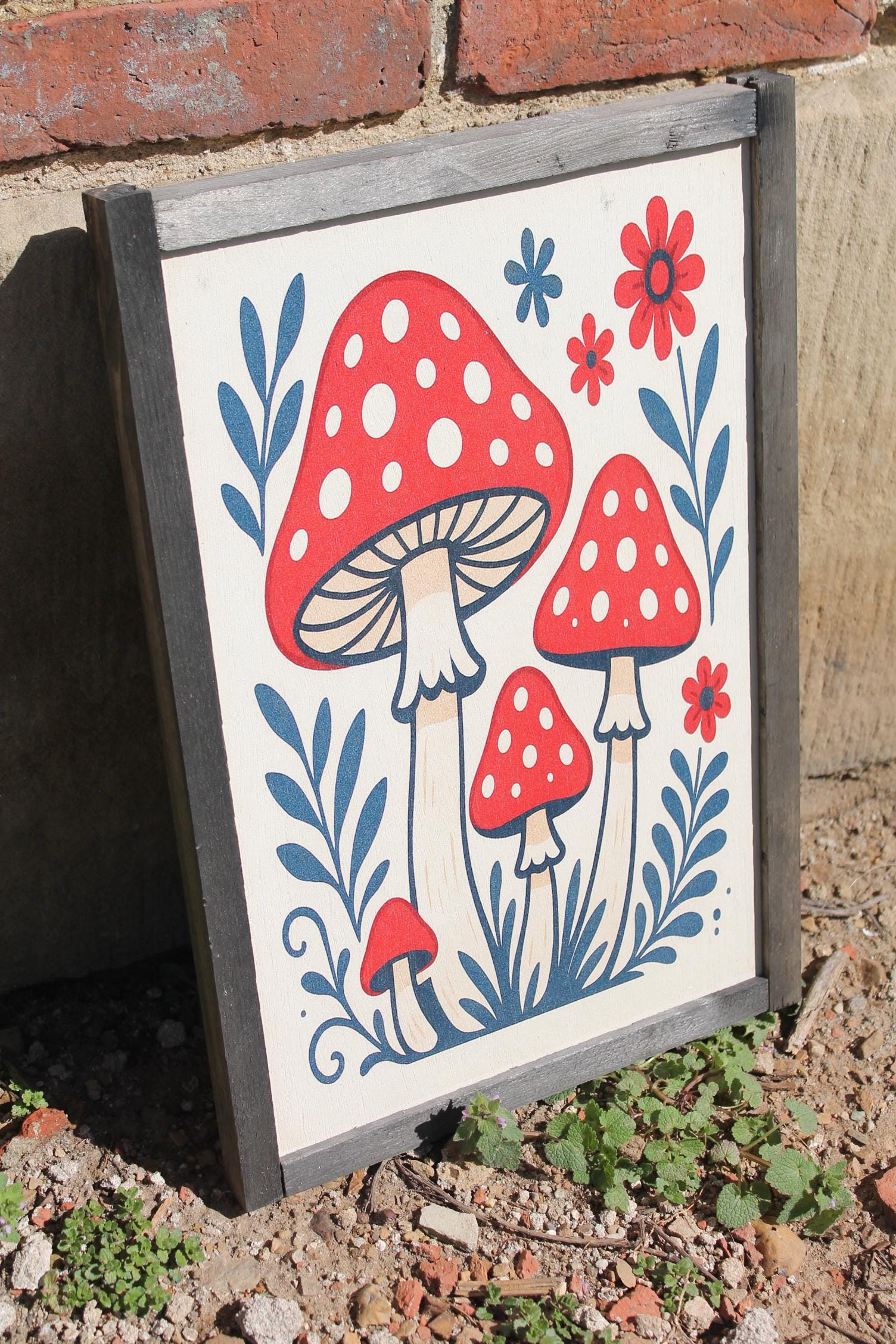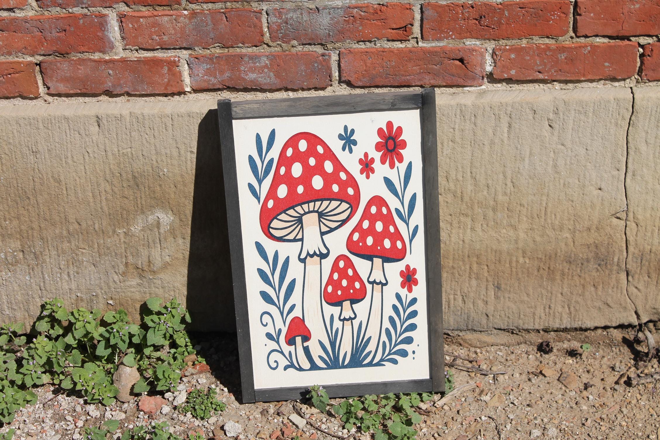 Folk Art Mushroom Wall Print – Red Toadstool Illustration with Flowers & Leaves – Whimsical Cottagecore Nature Decor for Home or Nursery