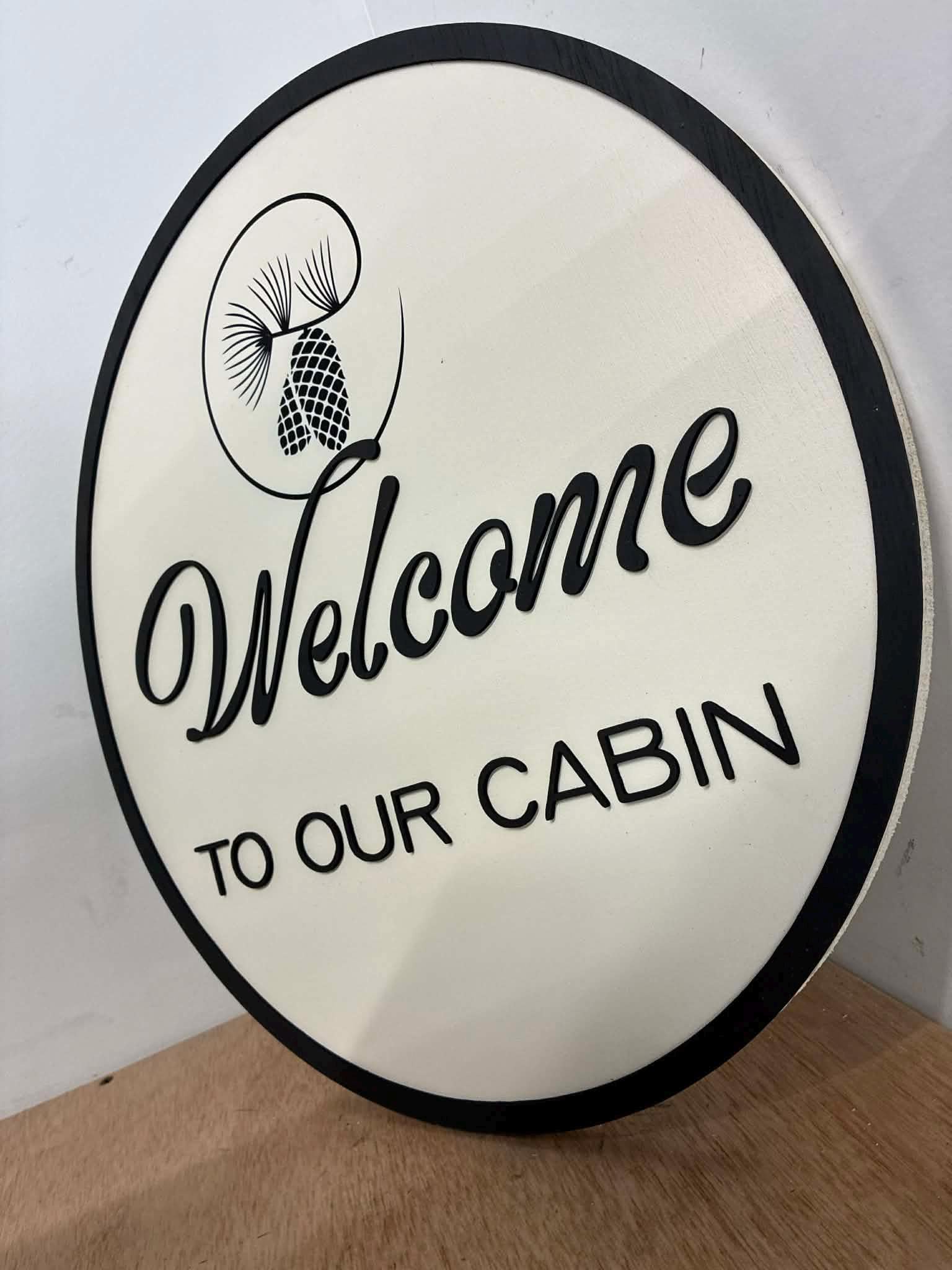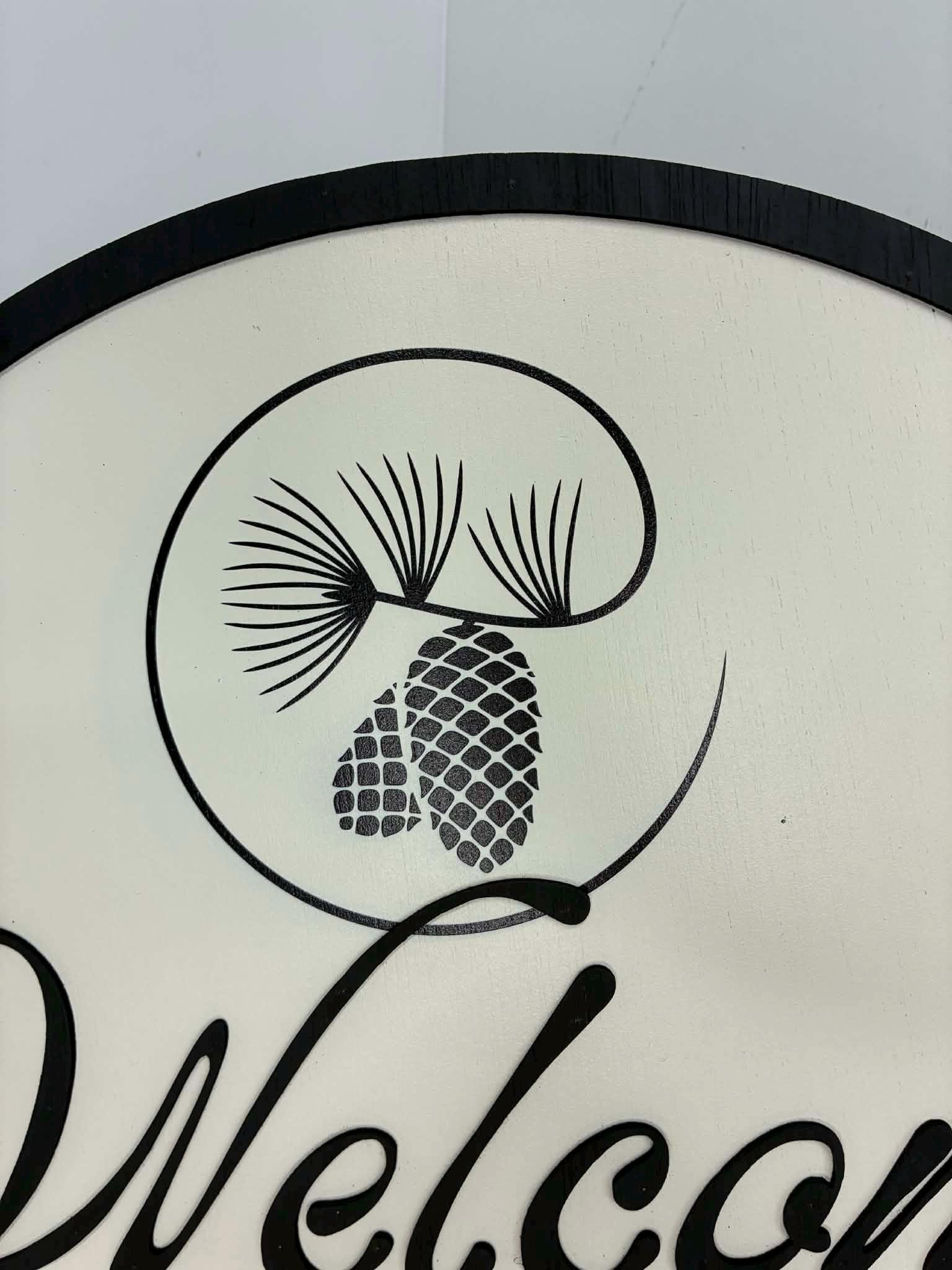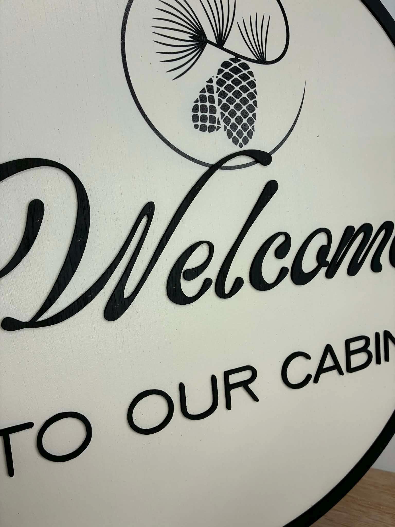 This listing is of a cute cabin welcome sign. The border and letters are 3d and stands off of the backerboard. The pinecones are printed directly onto the sign.