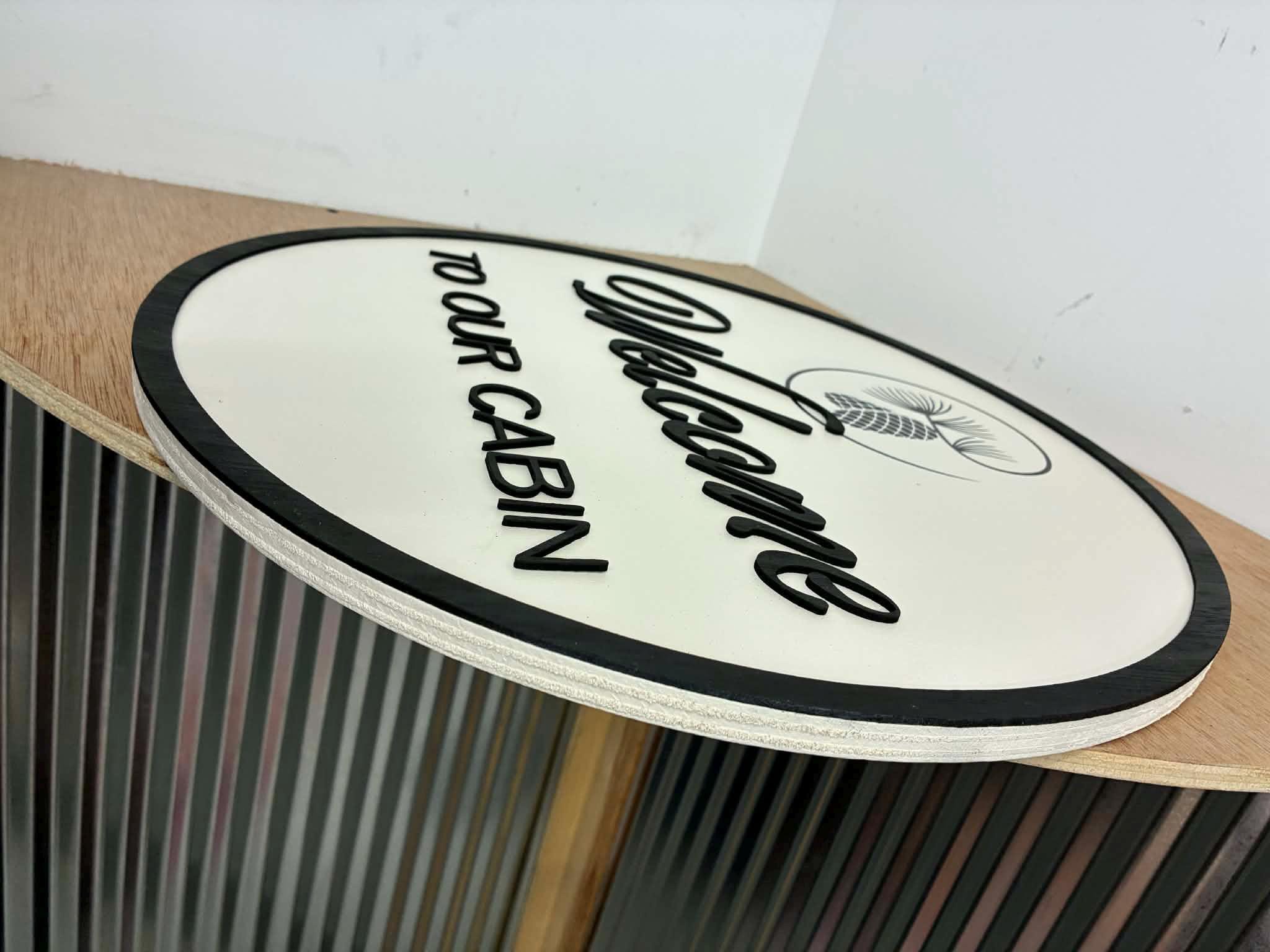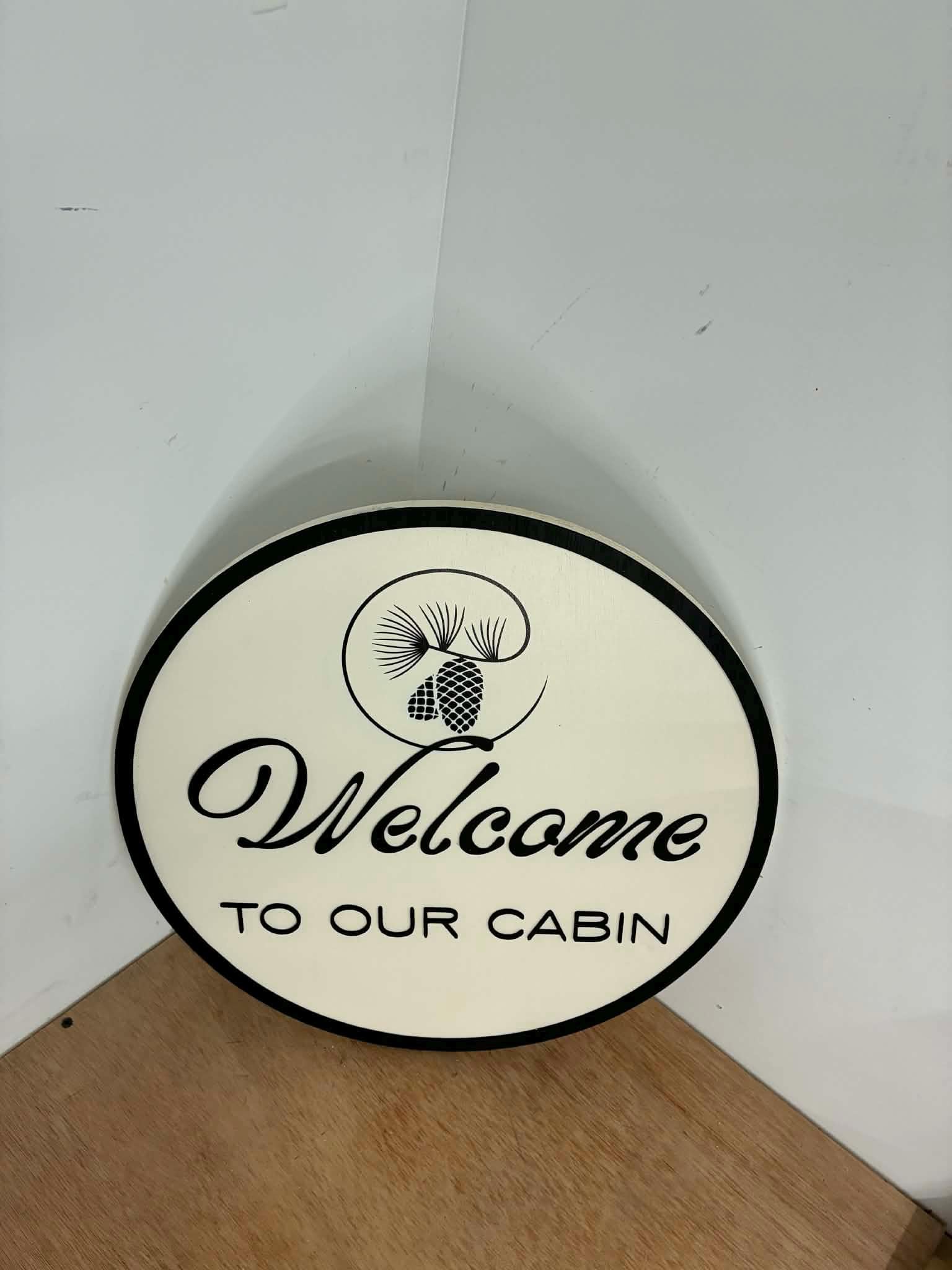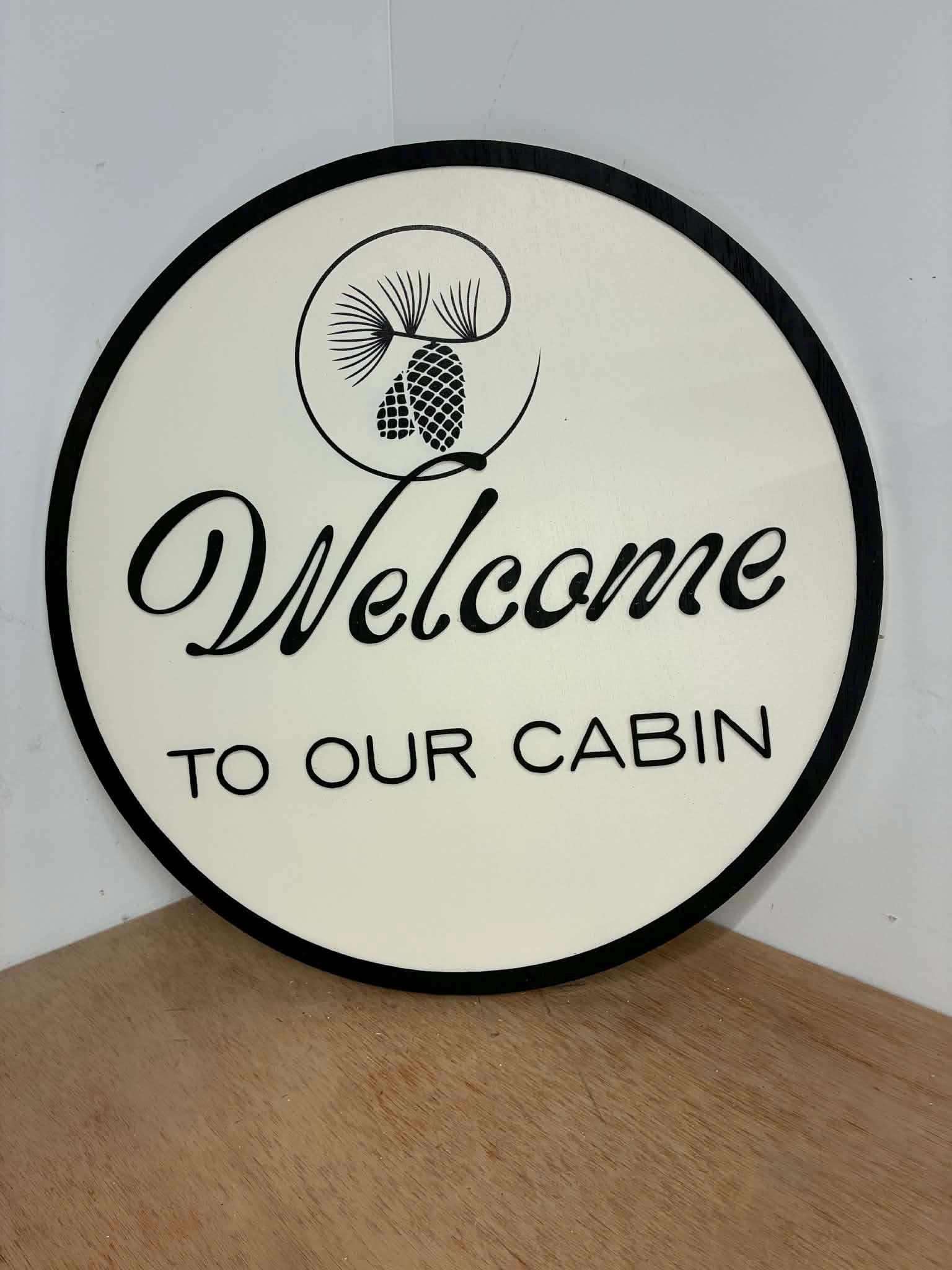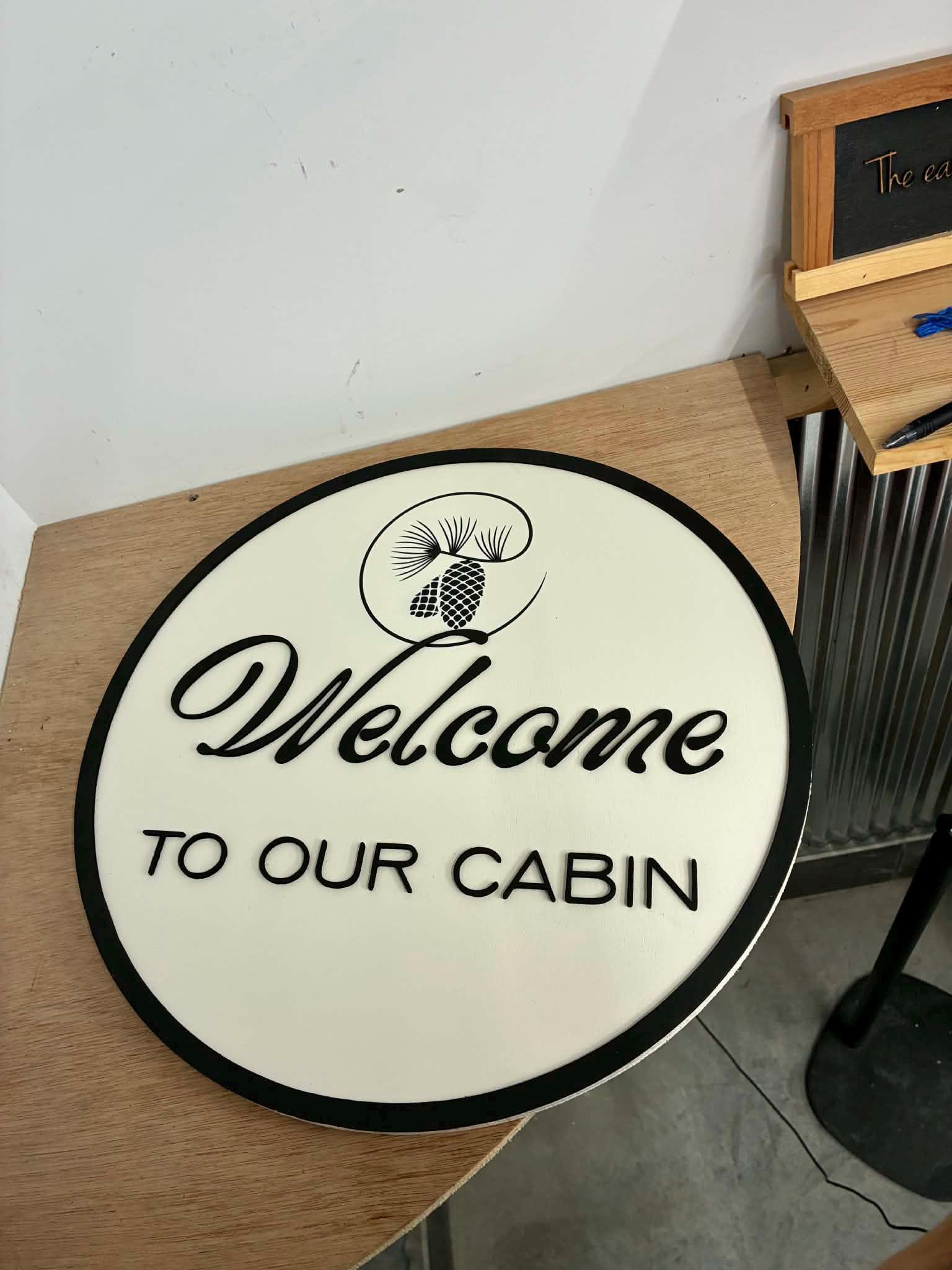 This listing is of a cute cabin welcome sign. The border and letters are 3d and stands off of the backerboard. The pinecones are printed directly onto the sign.