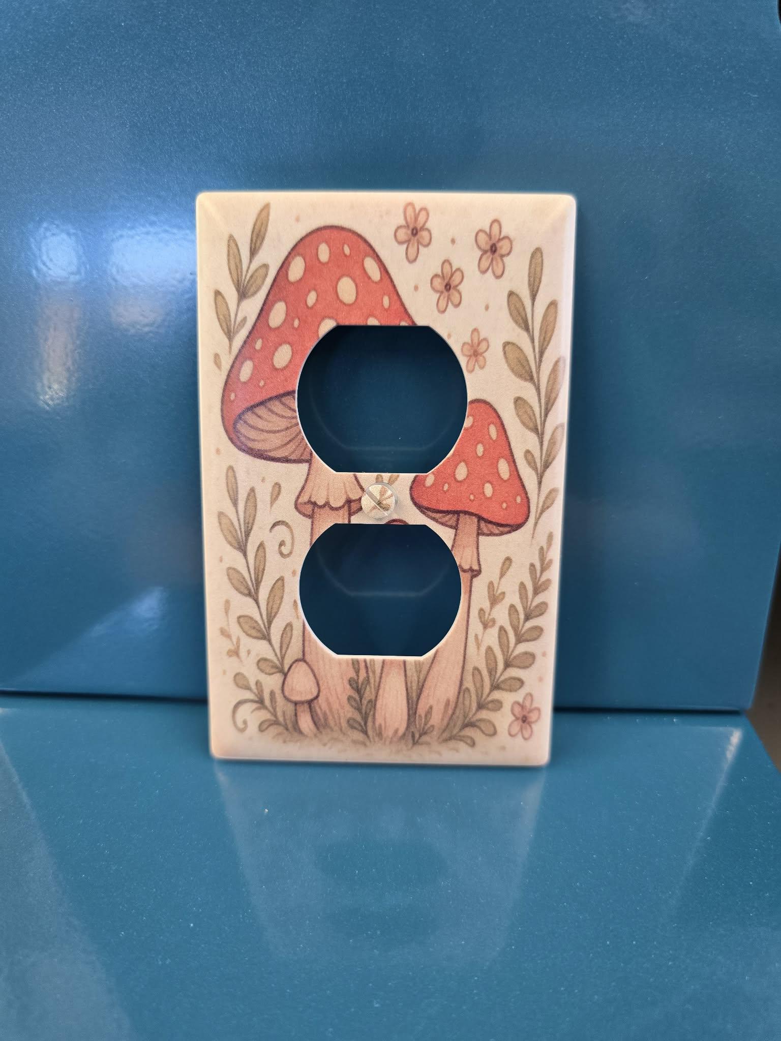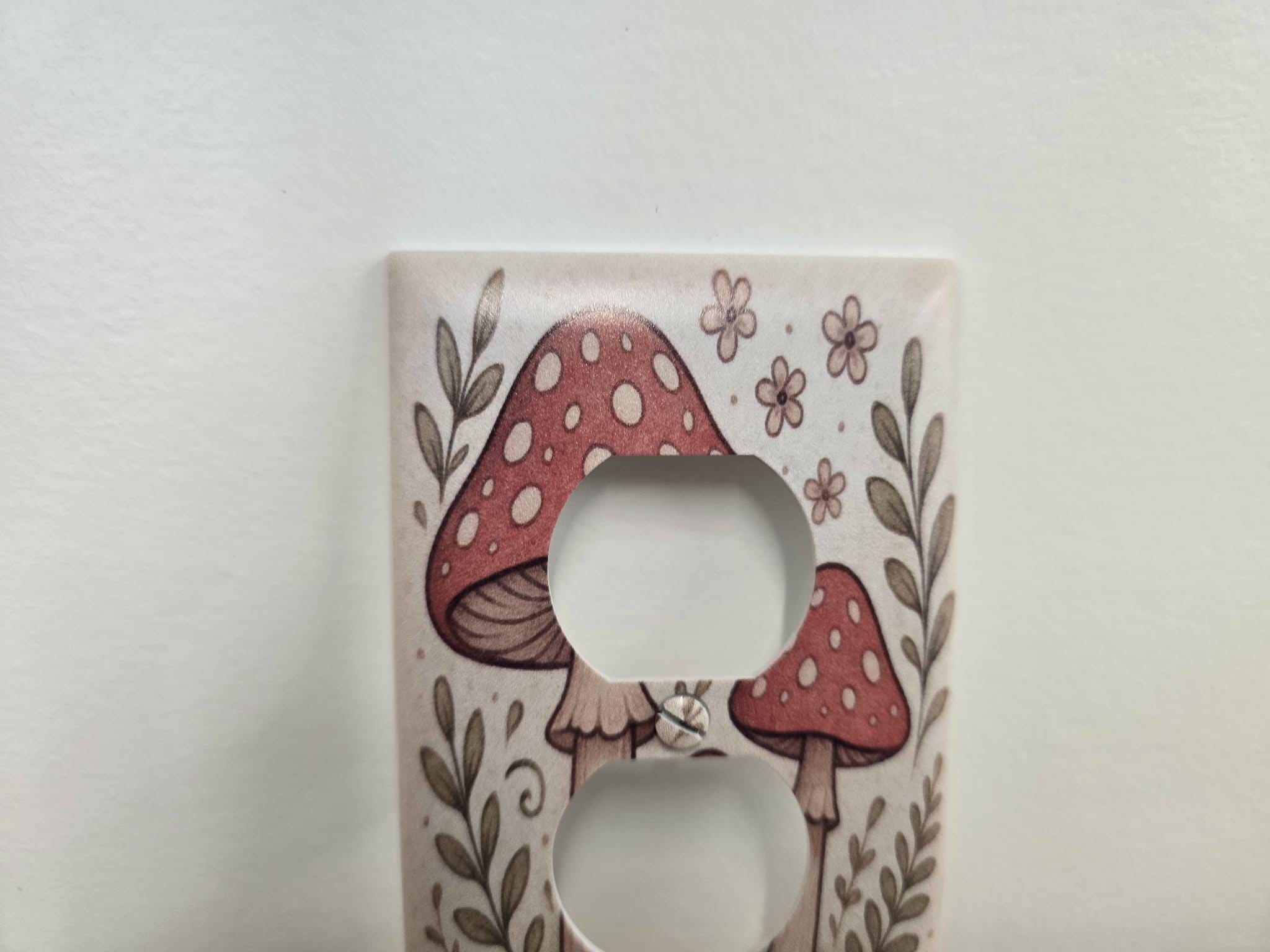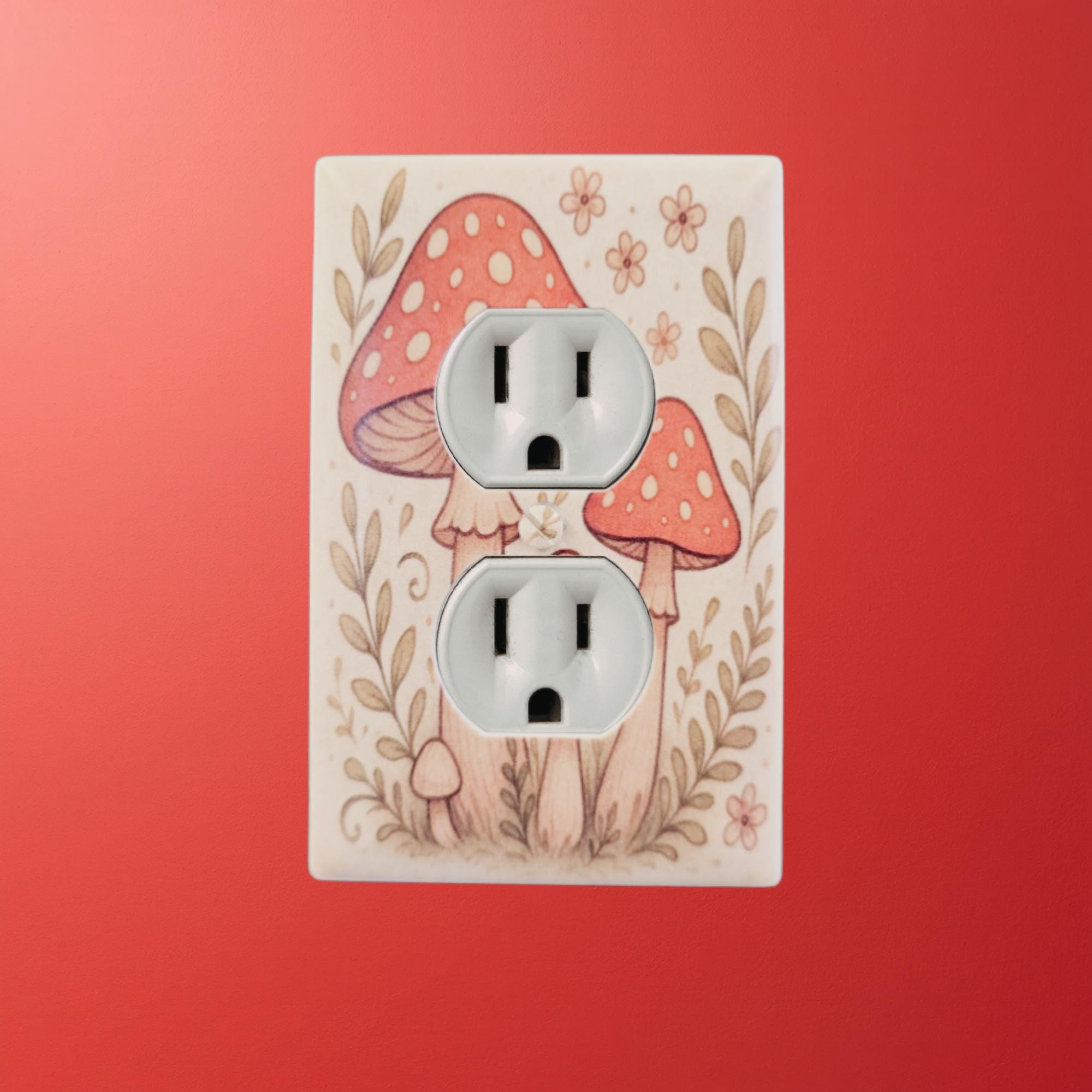 Red Mushroom Outlet Cover – Whimsical Toadstool and Floral Illustration in Retro Cottagecore Style for Cute Nature‑Inspired Home Decor
