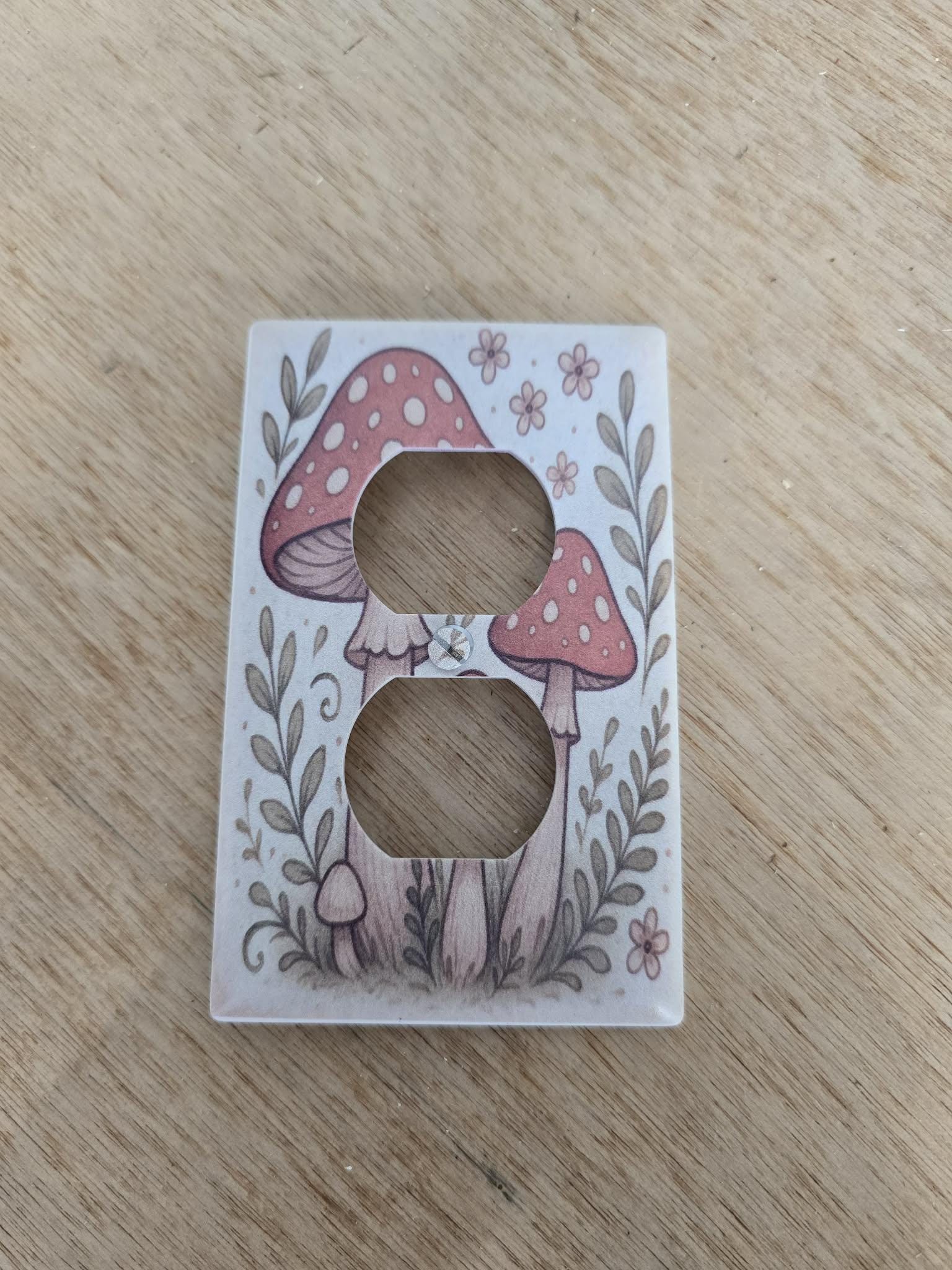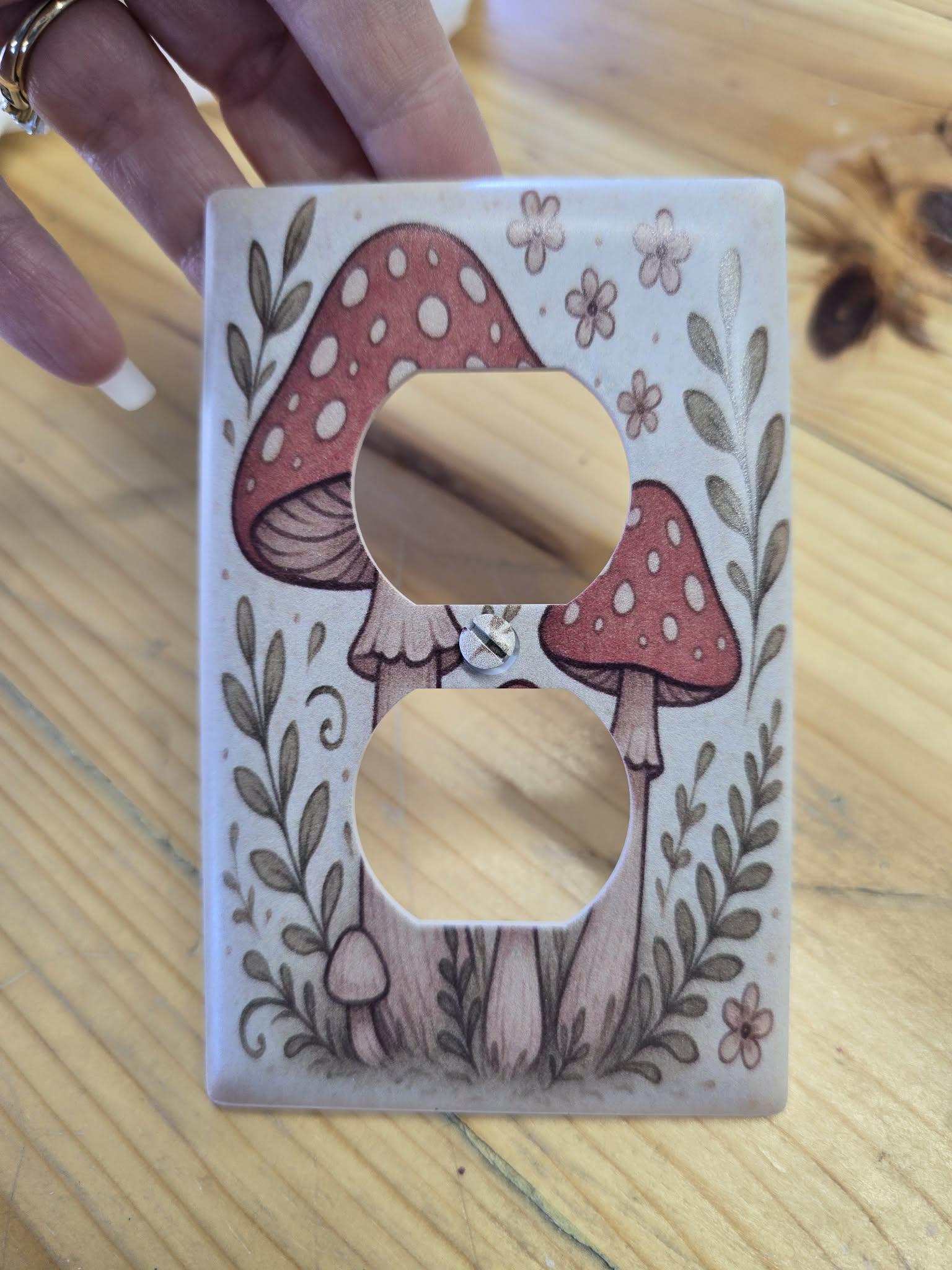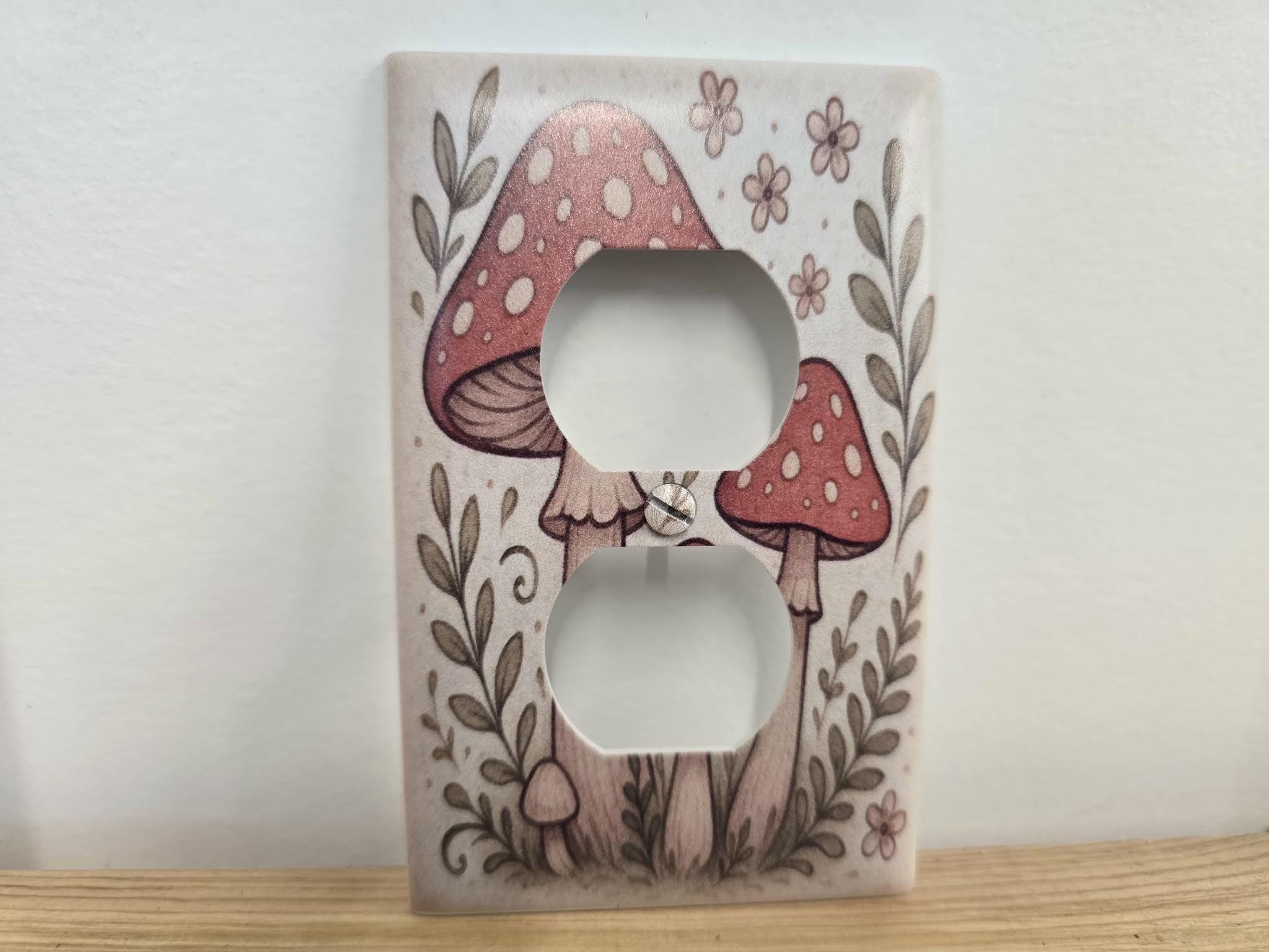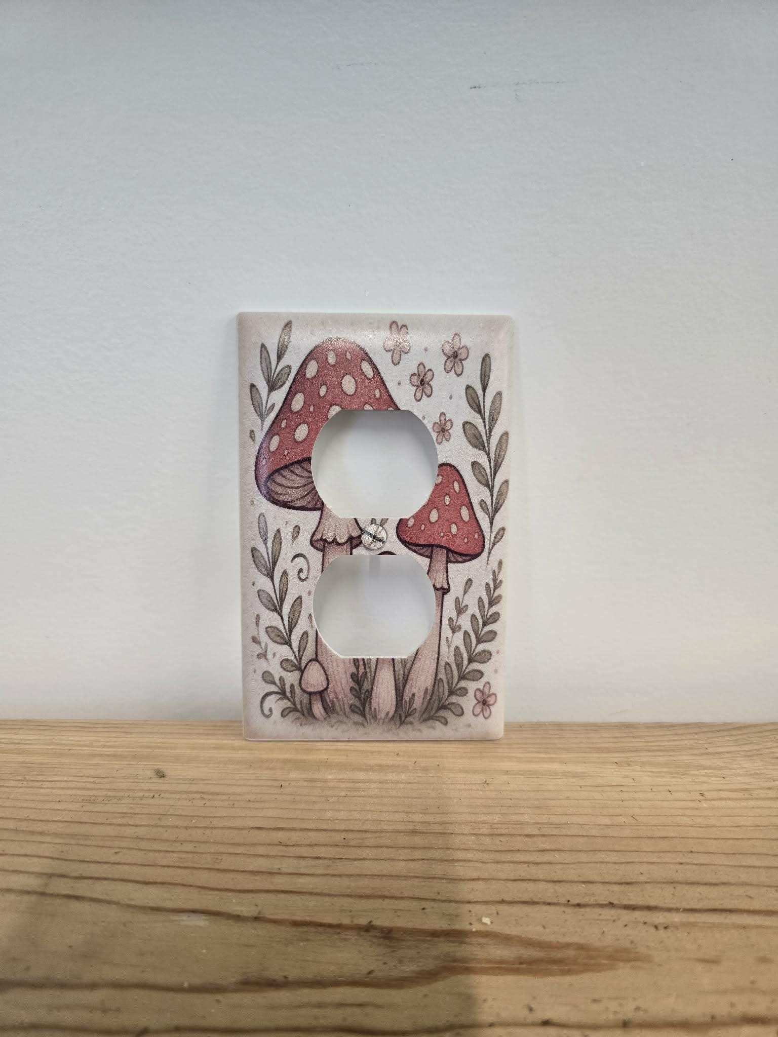 Red Mushroom Outlet Cover – Whimsical Toadstool and Floral Illustration in Retro Cottagecore Style for Cute Nature‑Inspired Home Decor