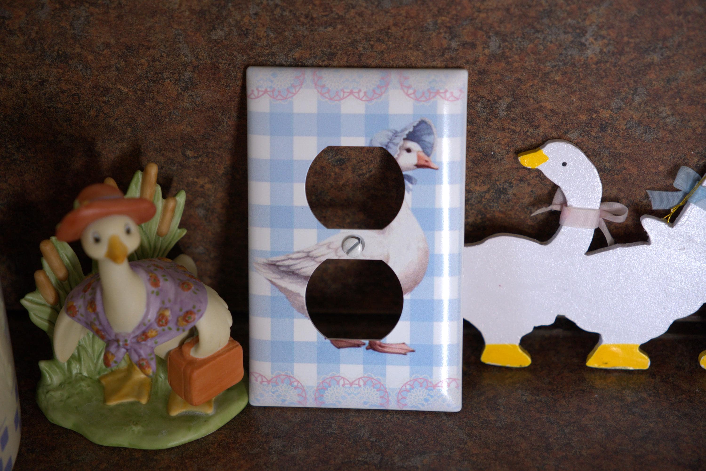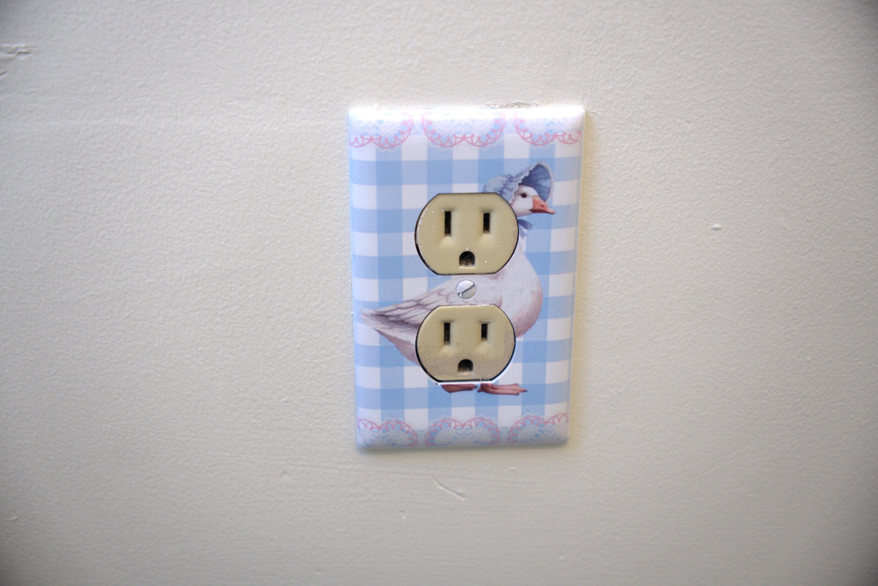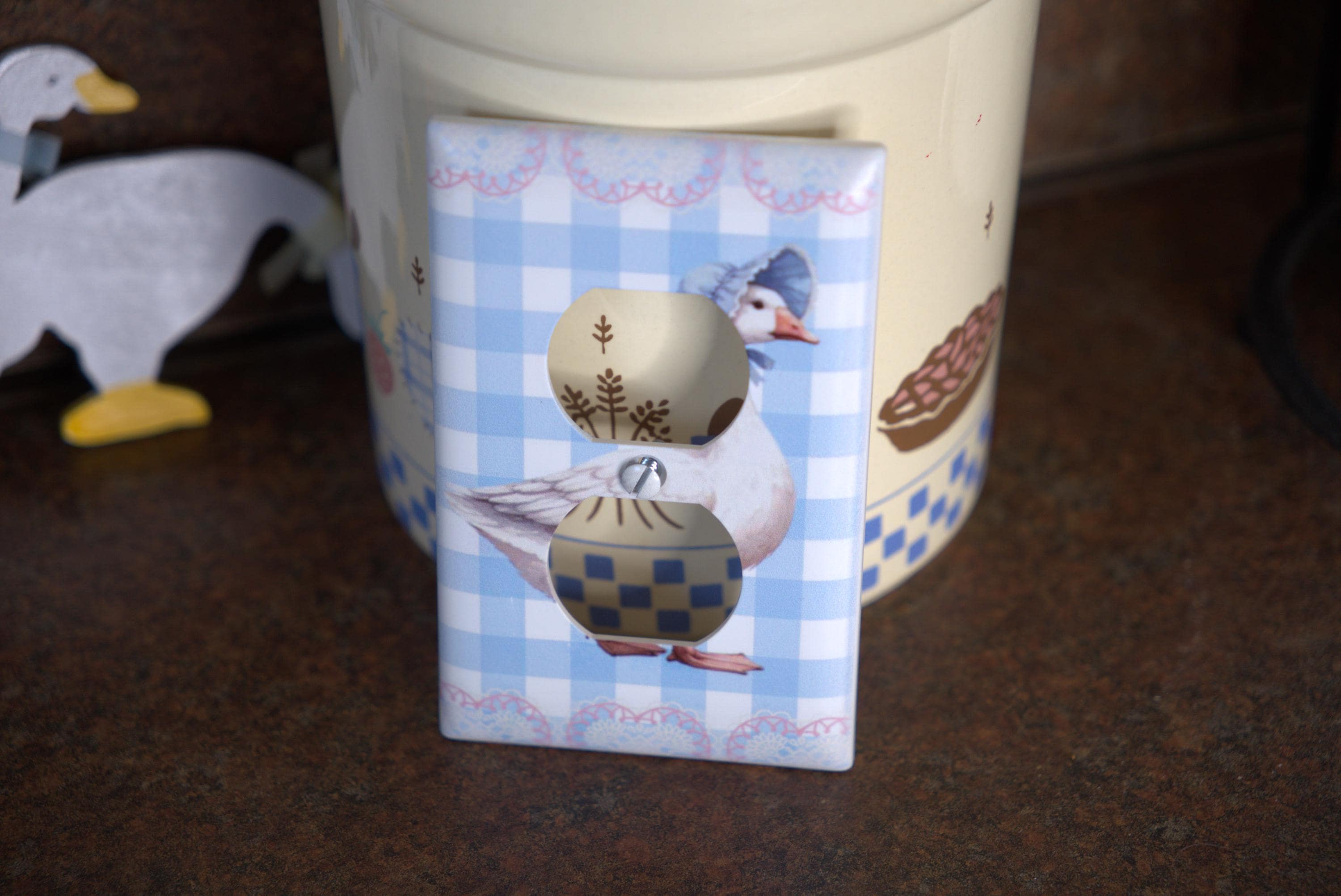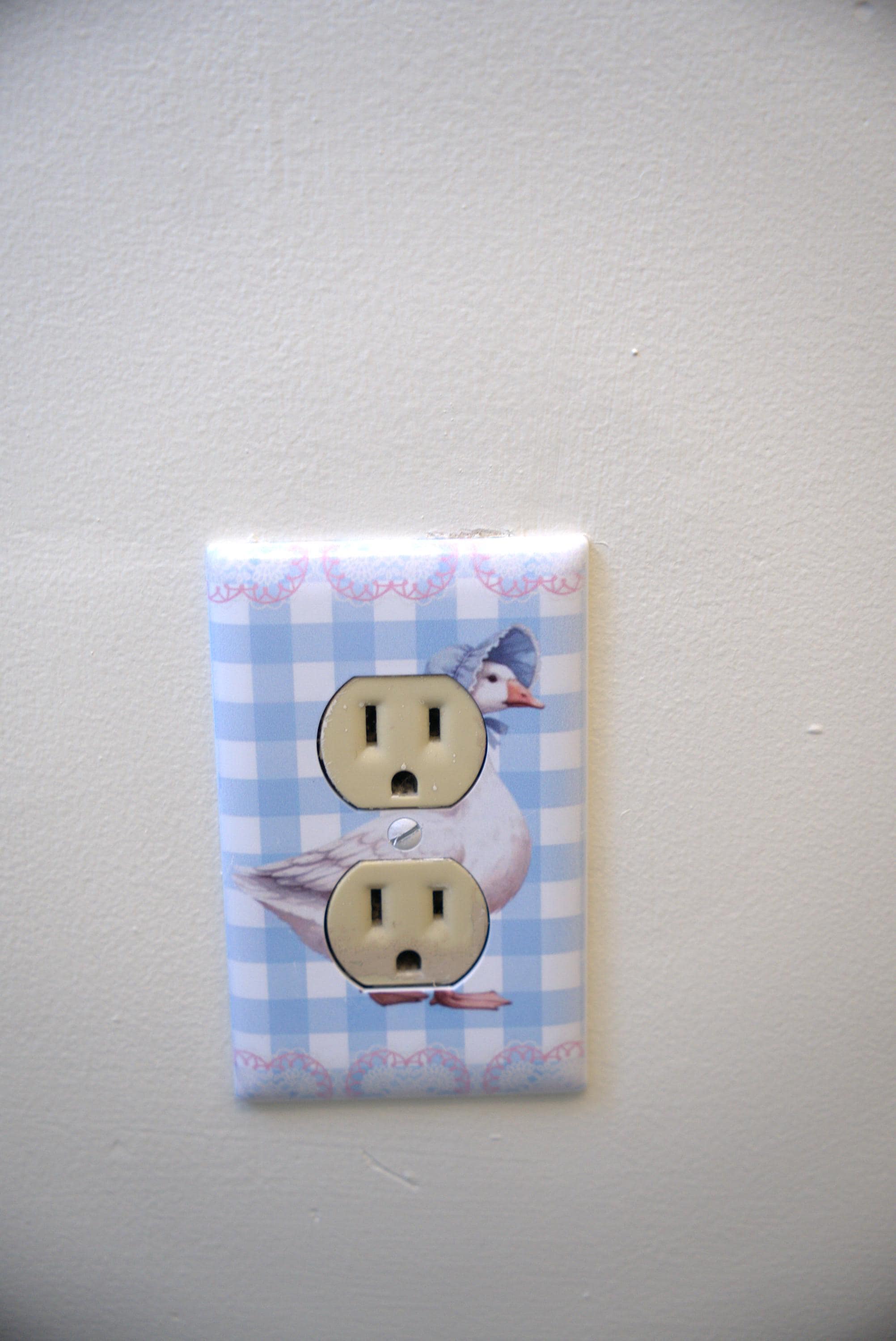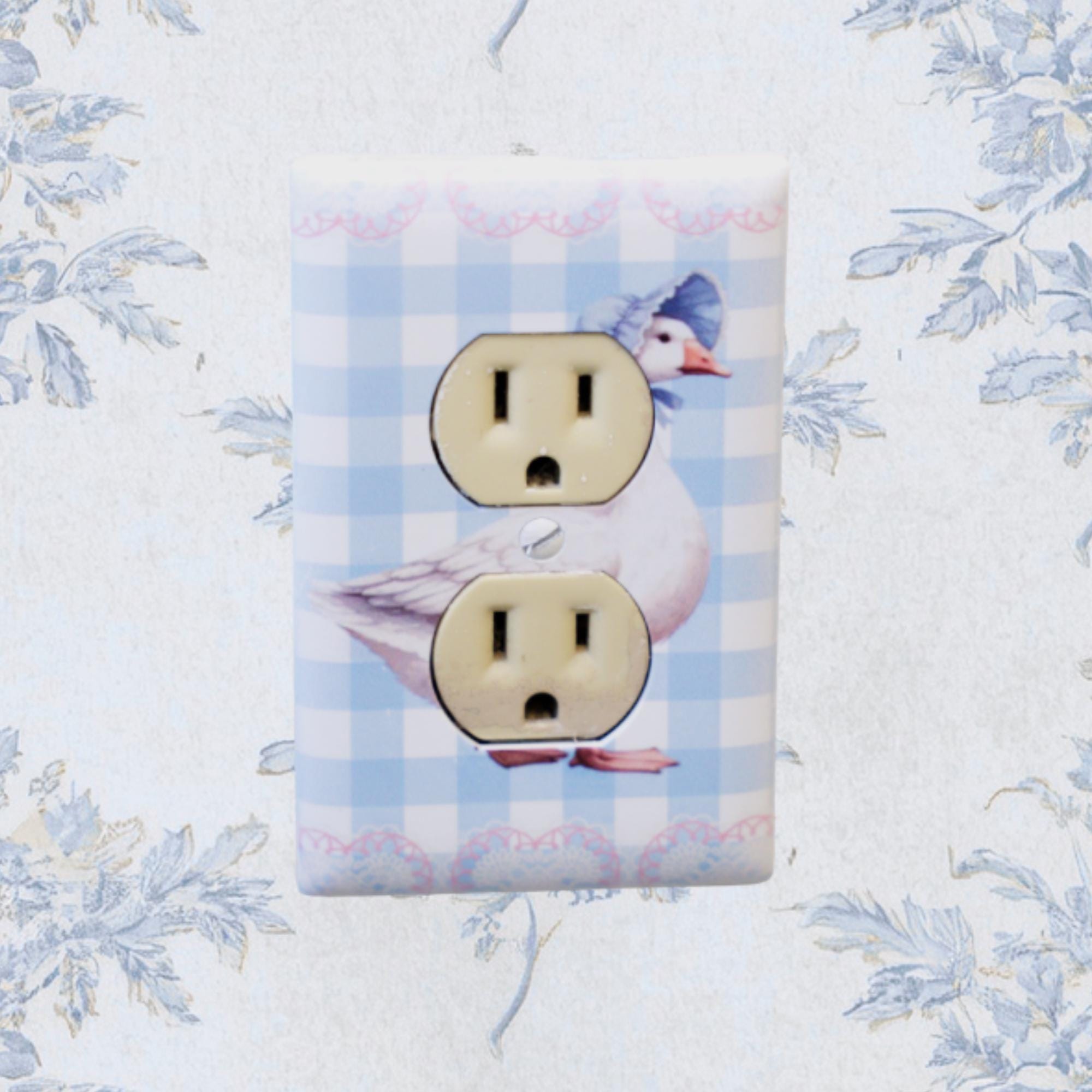Goose Gingham Outlet Cover – Vintage‑Style Goose with Bonnet on Blue Checkered Background for Cute Cottagecore Home Decor