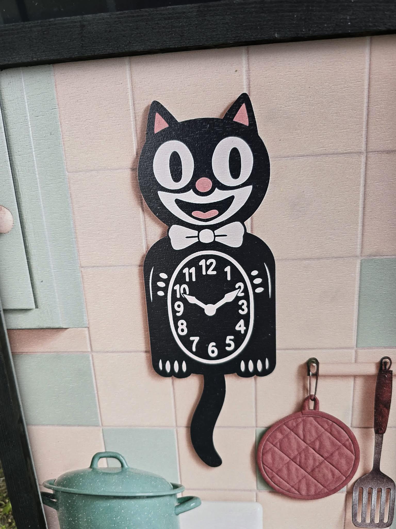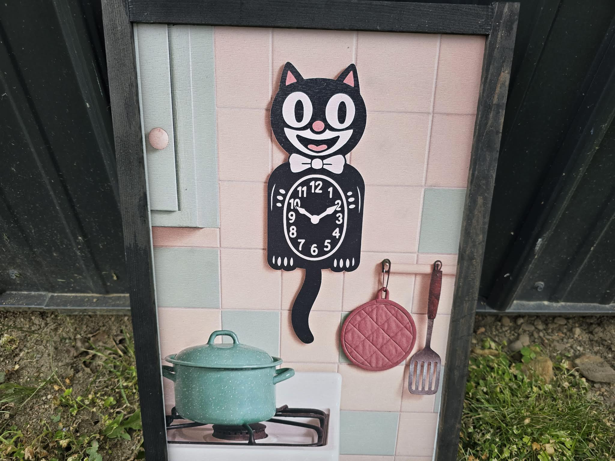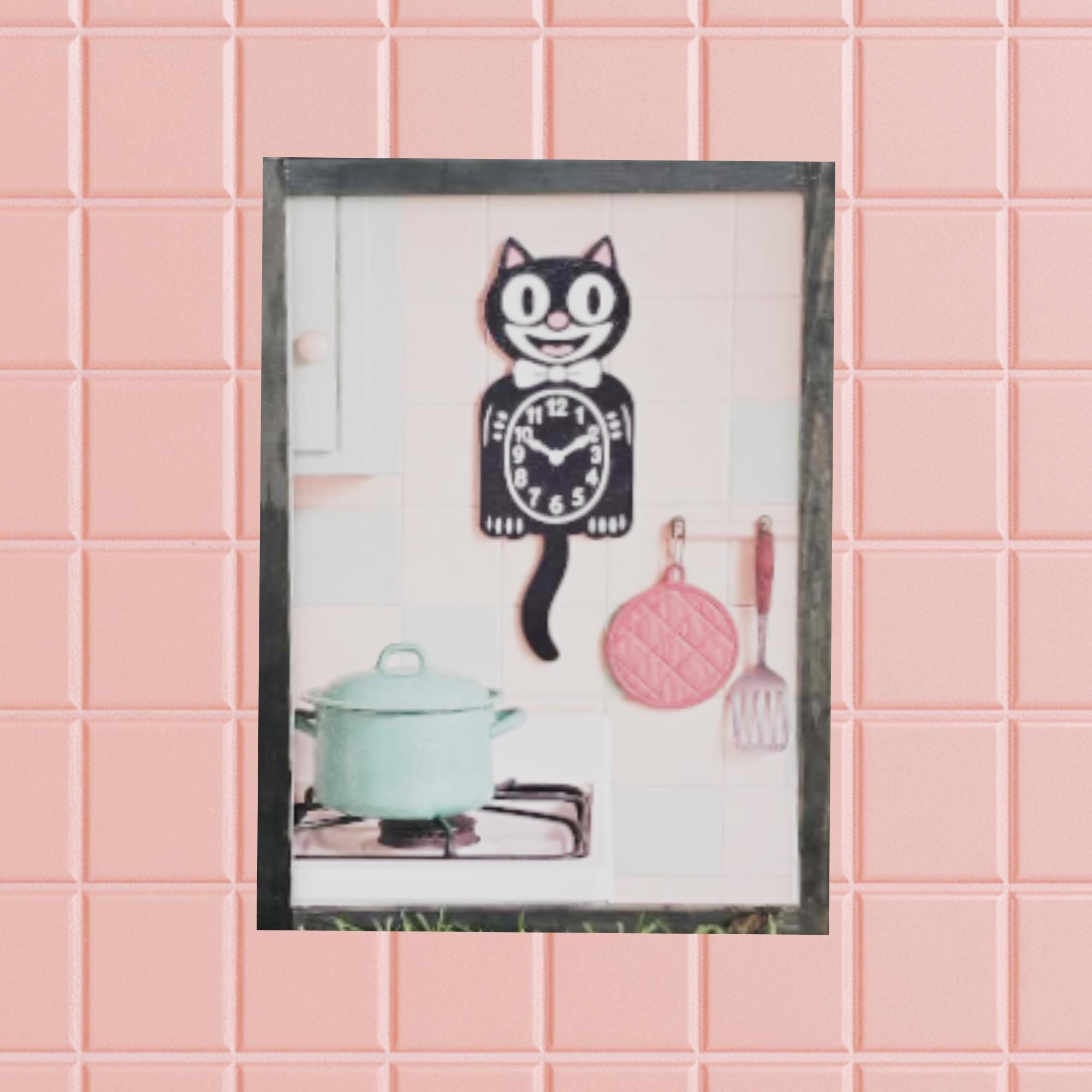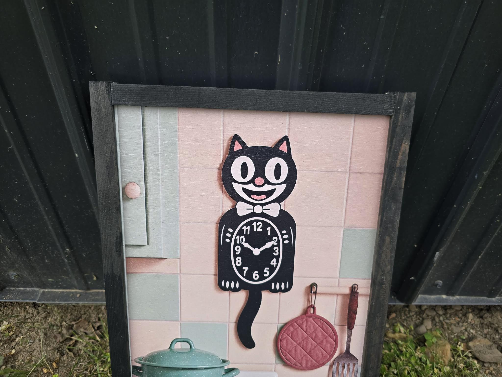 Retro Cat Kitchen Sign – Vintage‑Style Black Cat Clock with Pastel Cookware for Cute Whimsical Kitchen Wall Decor
