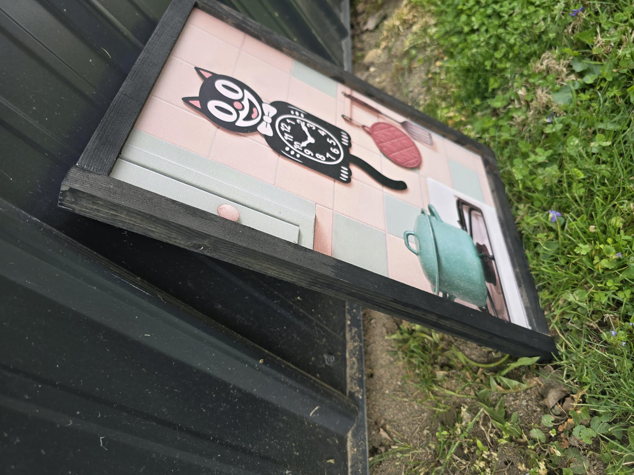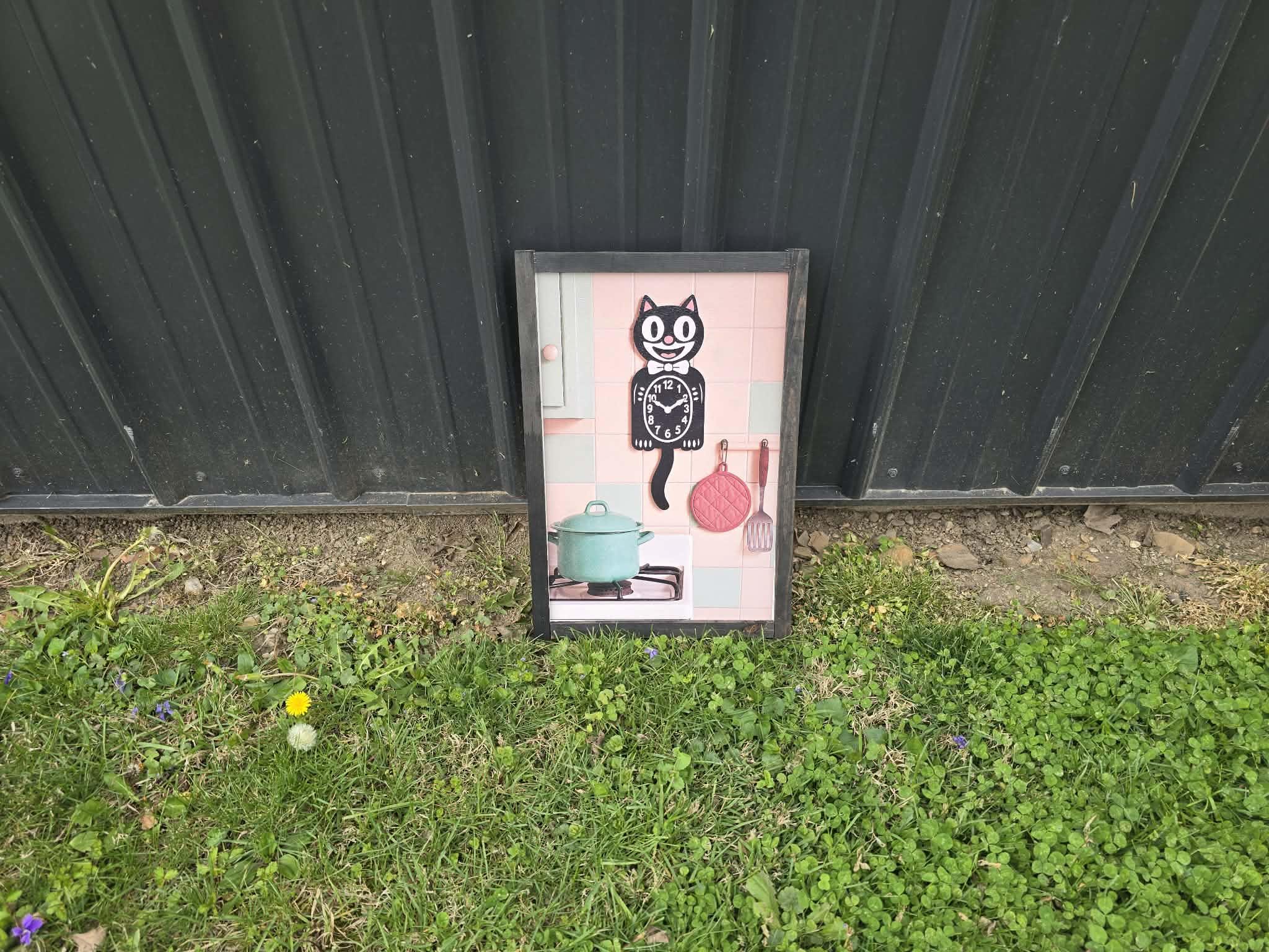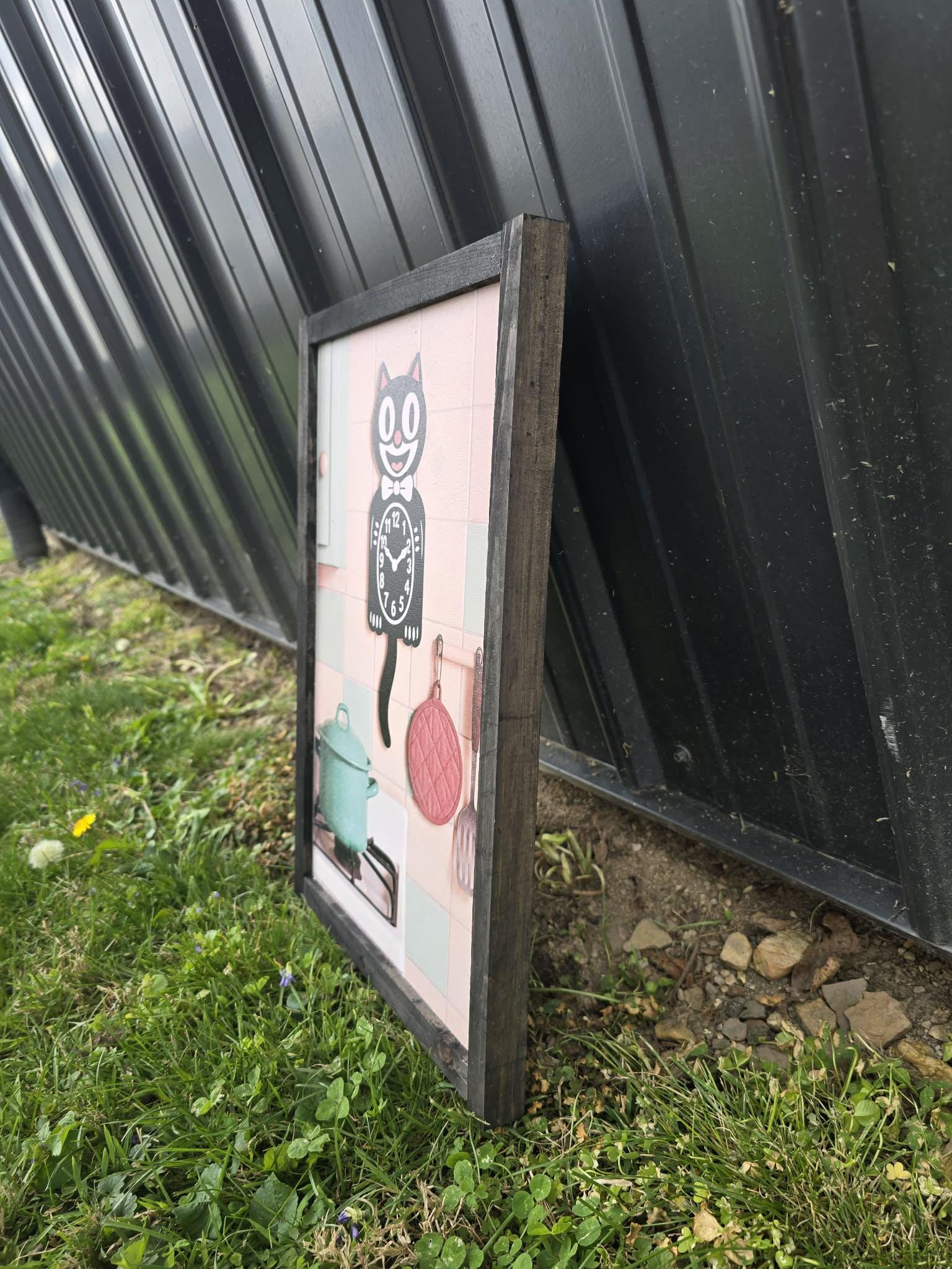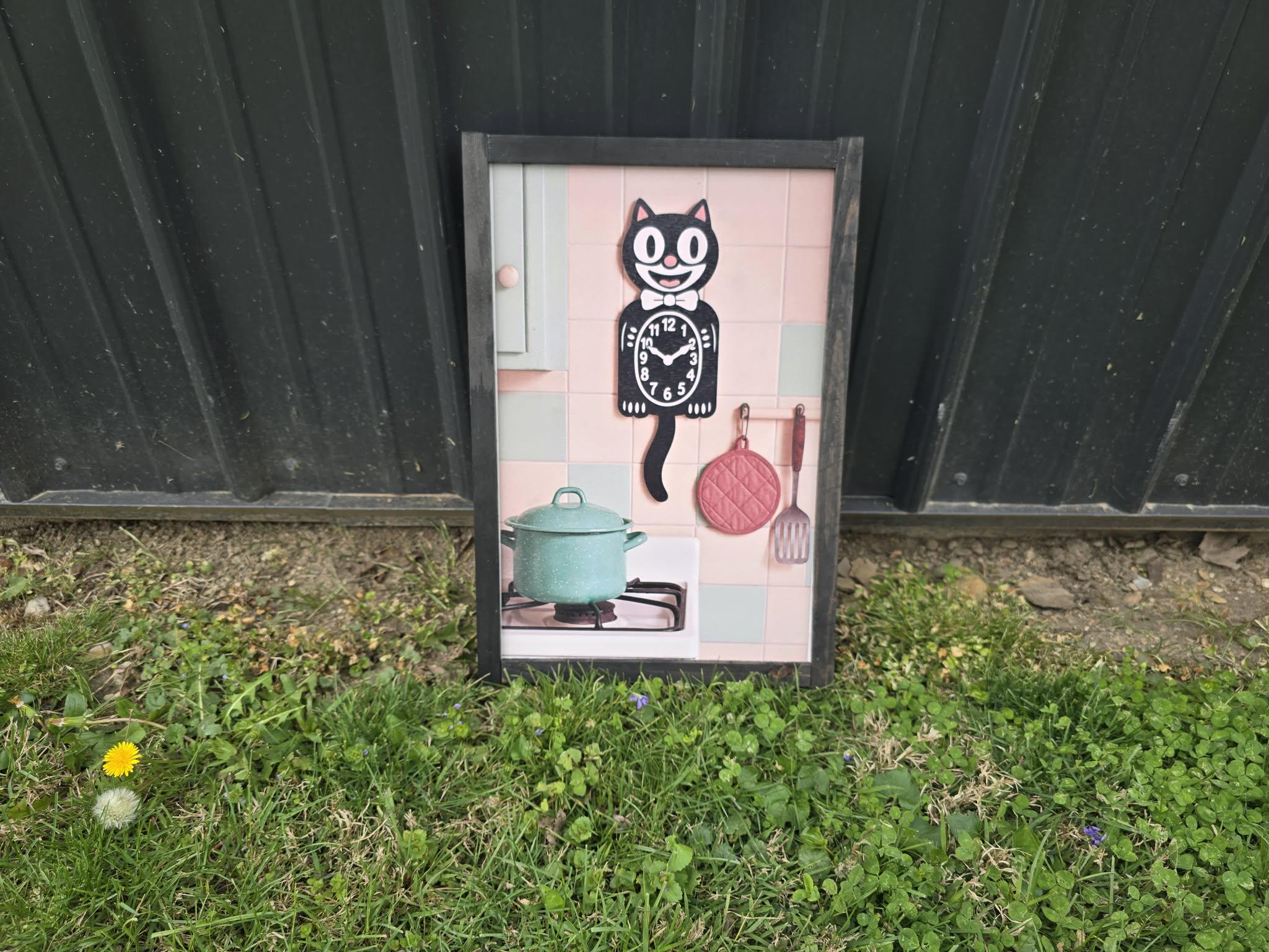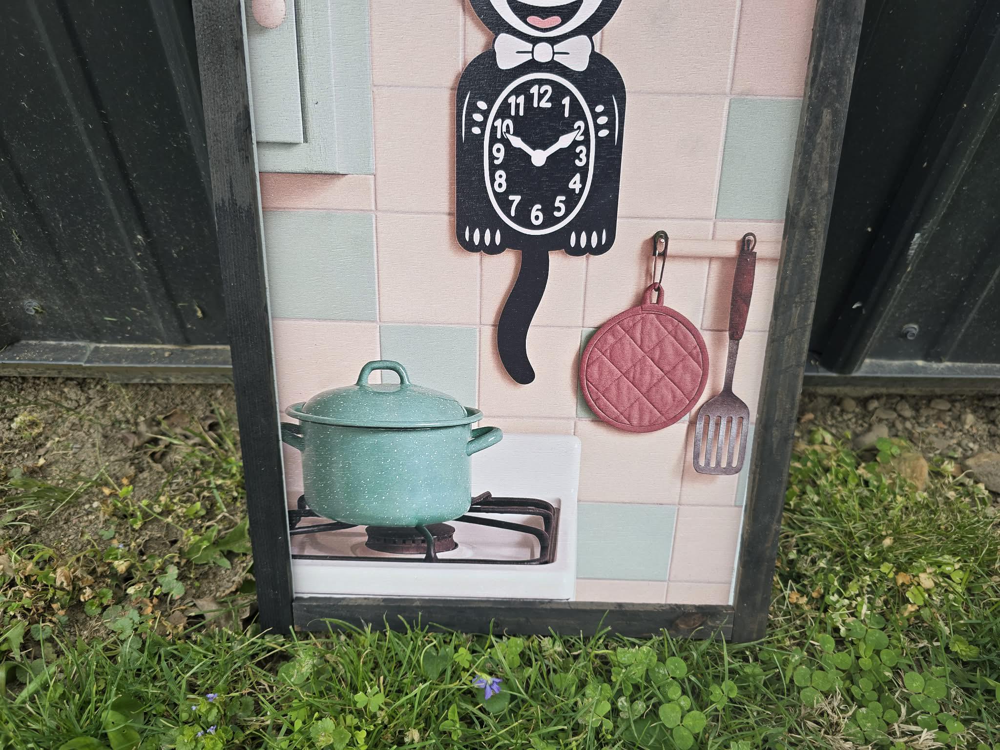 Retro Cat Kitchen Sign – Vintage‑Style Black Cat Clock with Pastel Cookware for Cute Whimsical Kitchen Wall Decor