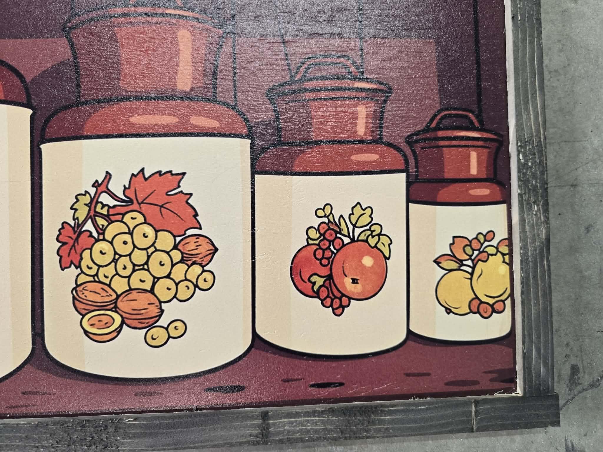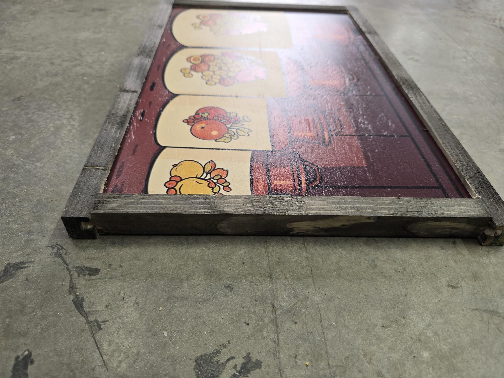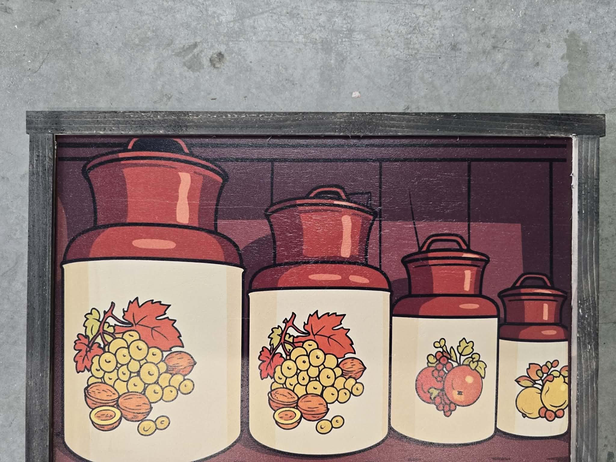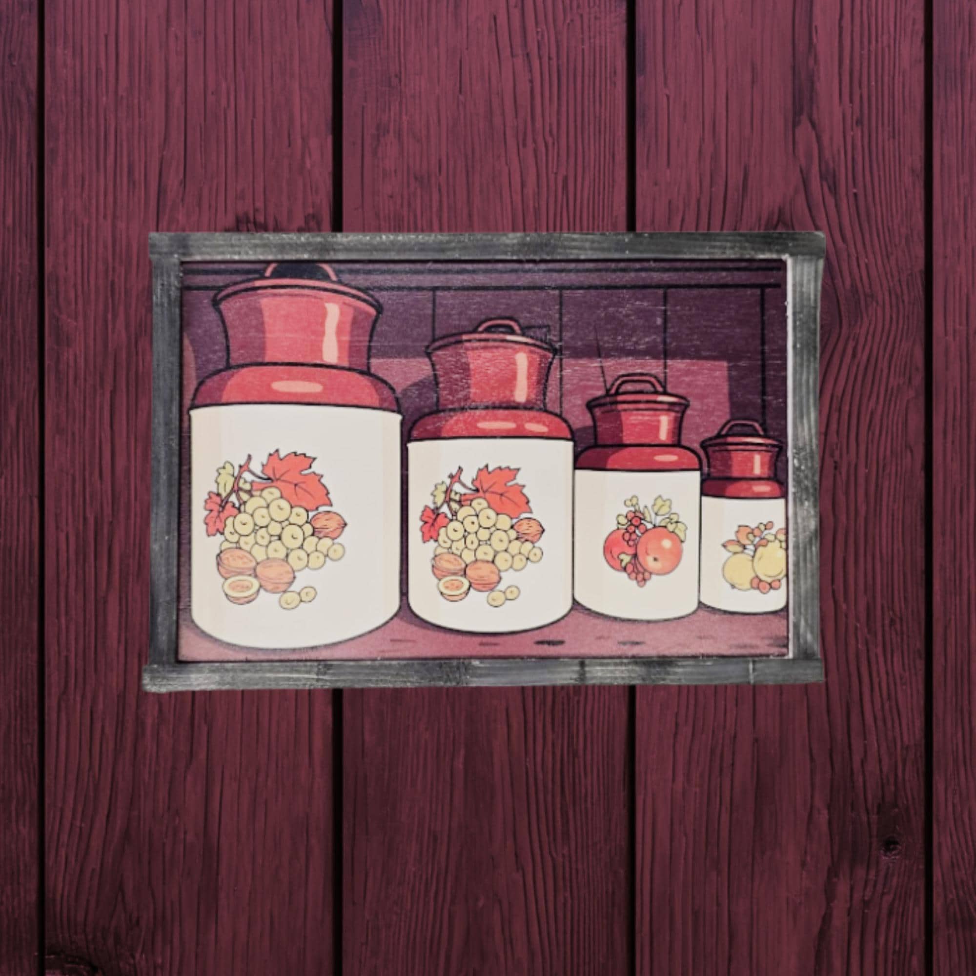 Vintage Fruit Jar Kitchen Sign – Retro Red‑Lid Canister Illustration on Rustic Wood Background for Classic Country or Cottage Home Decor