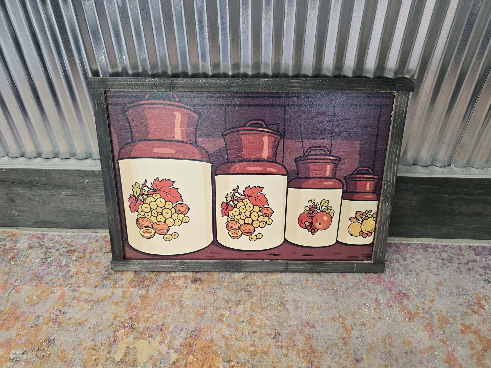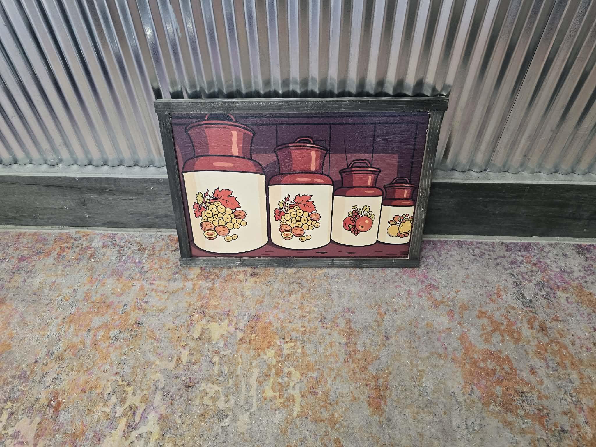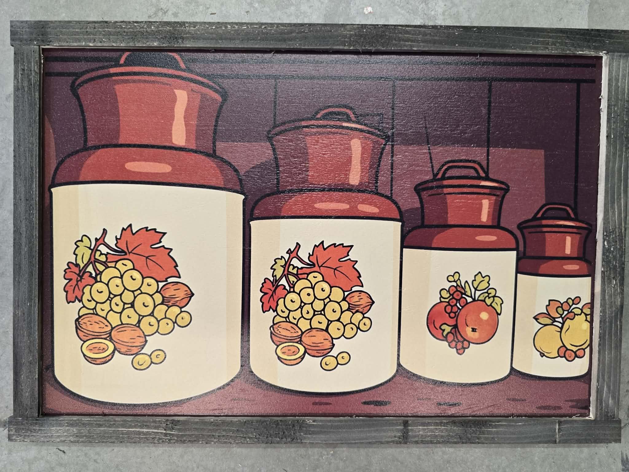 Vintage Fruit Jar Kitchen Sign – Retro Red‑Lid Canister Illustration on Rustic Wood Background for Classic Country or Cottage Home Decor