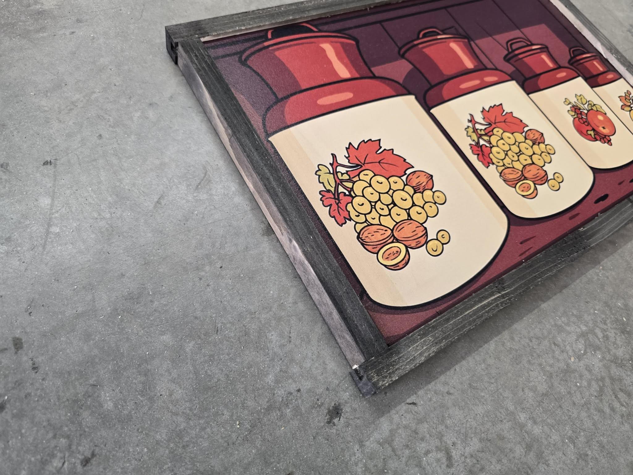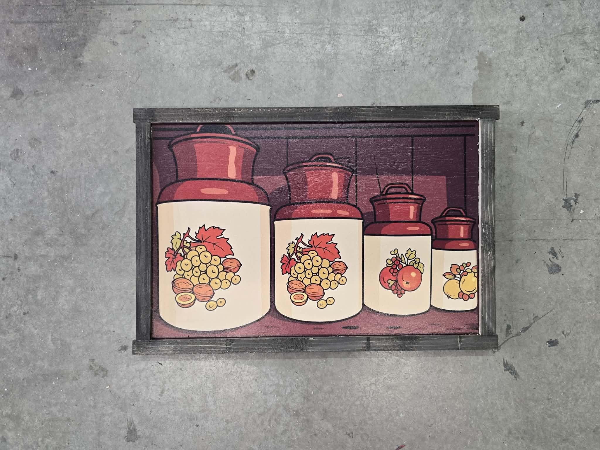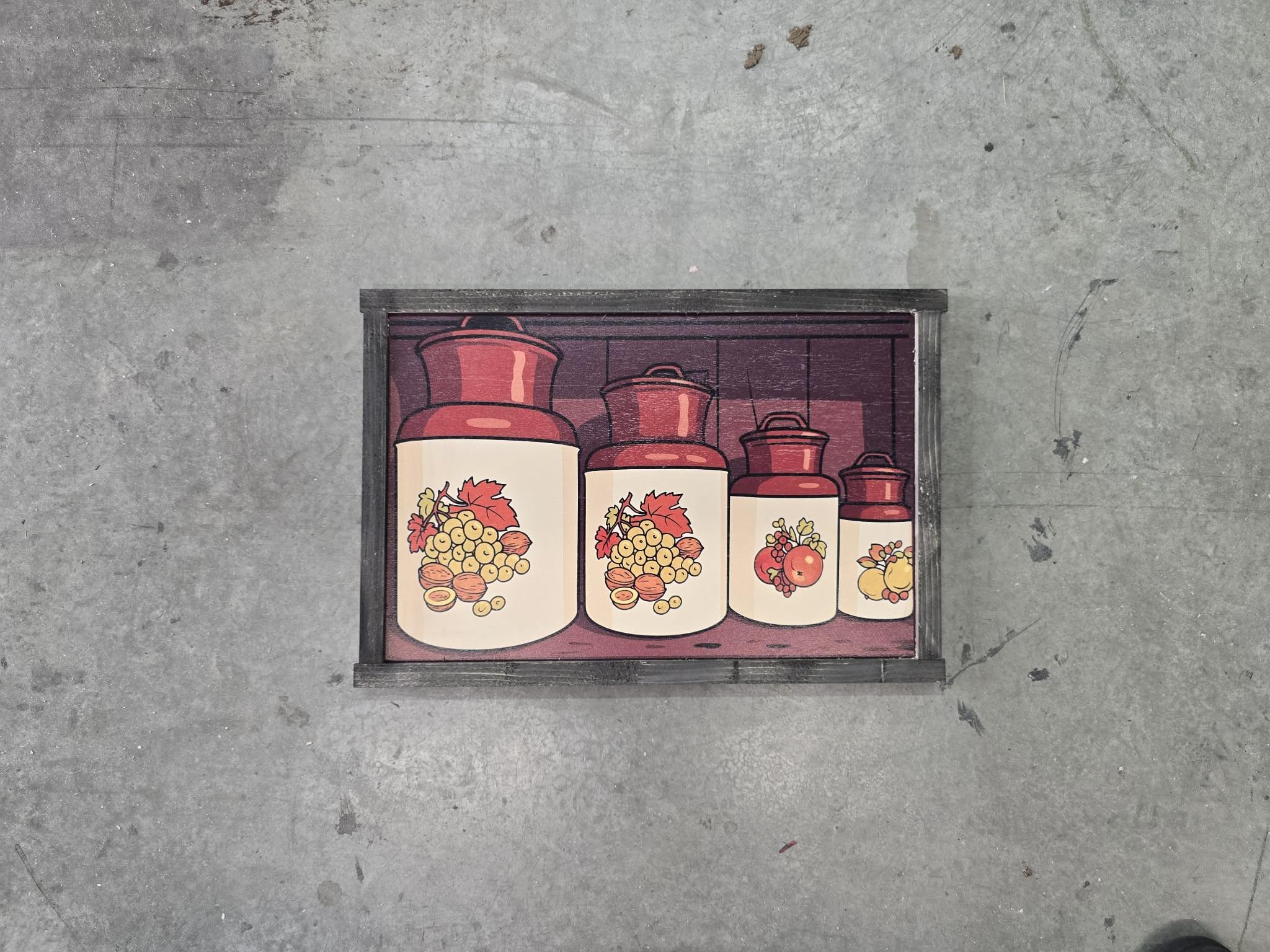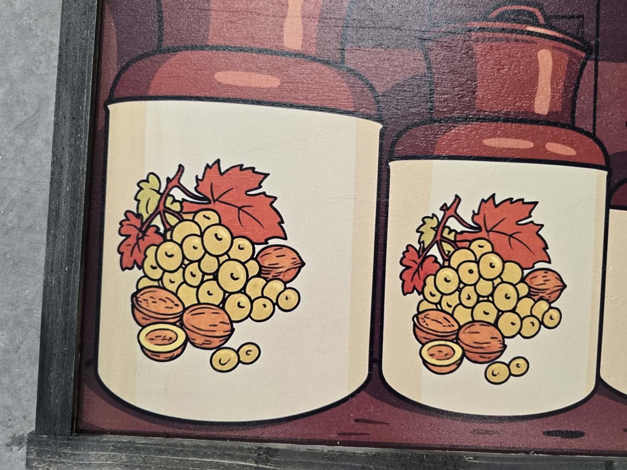 Vintage Fruit Jar Kitchen Sign – Retro Red‑Lid Canister Illustration on Rustic Wood Background for Classic Country or Cottage Home Decor