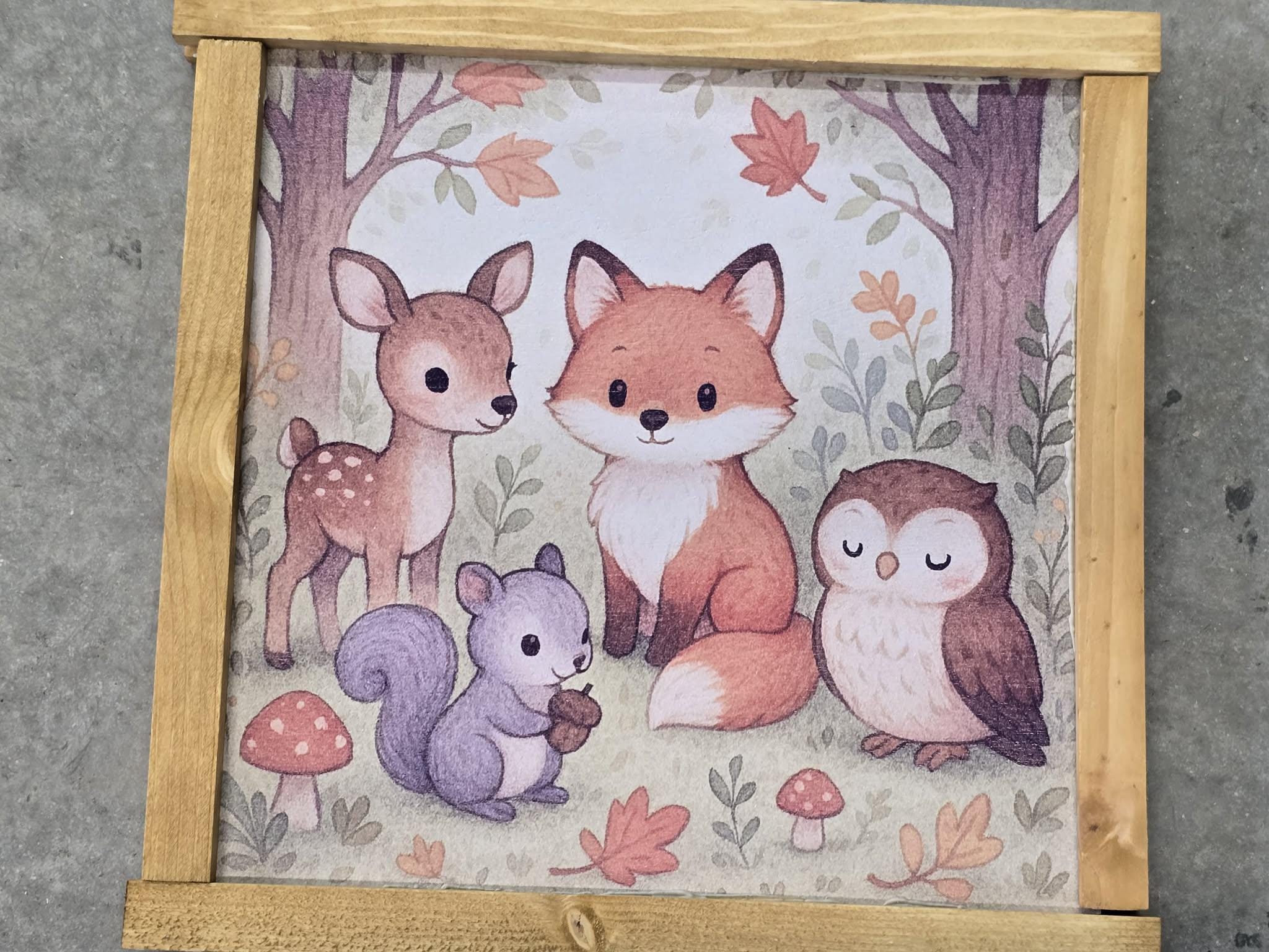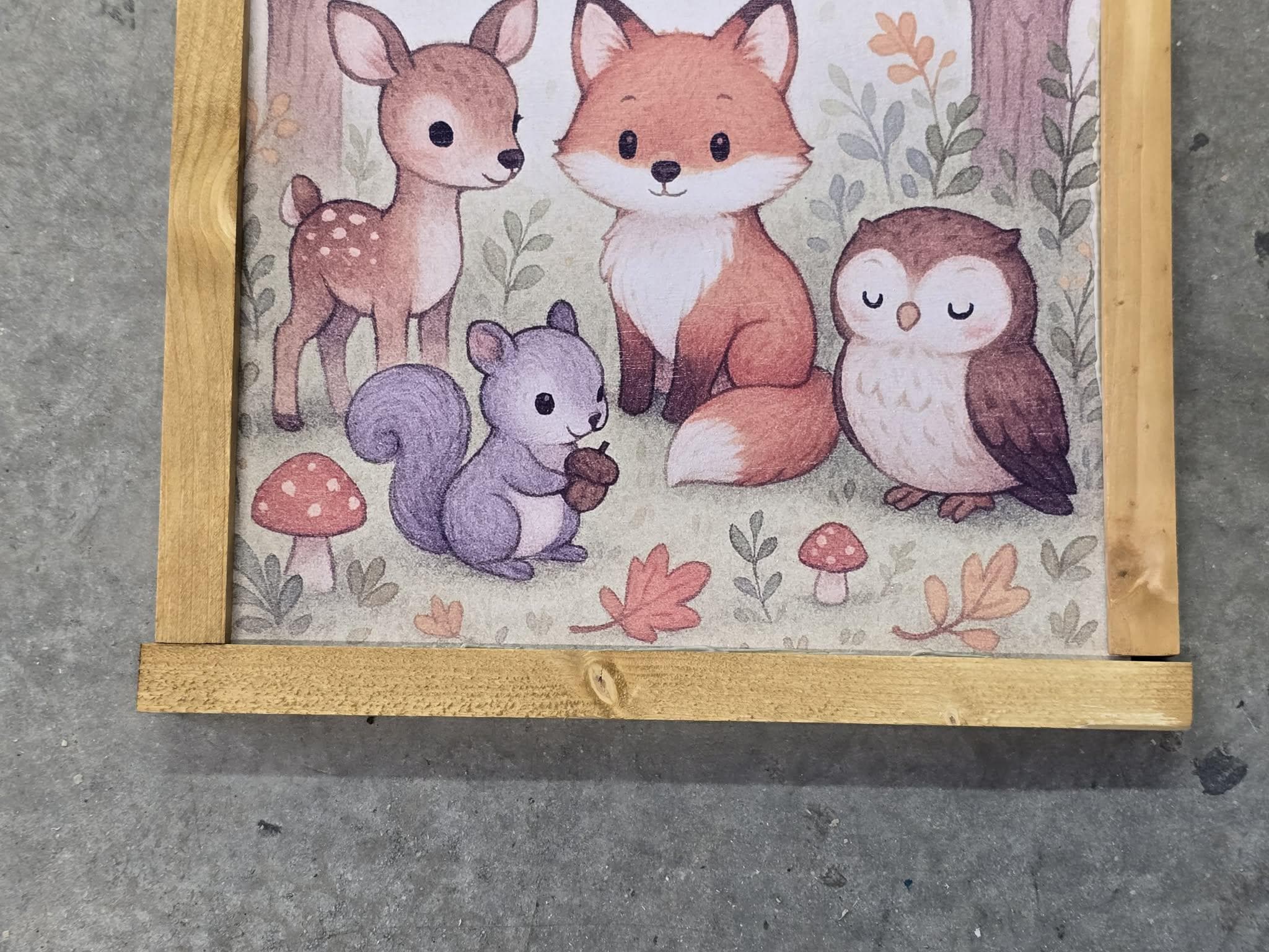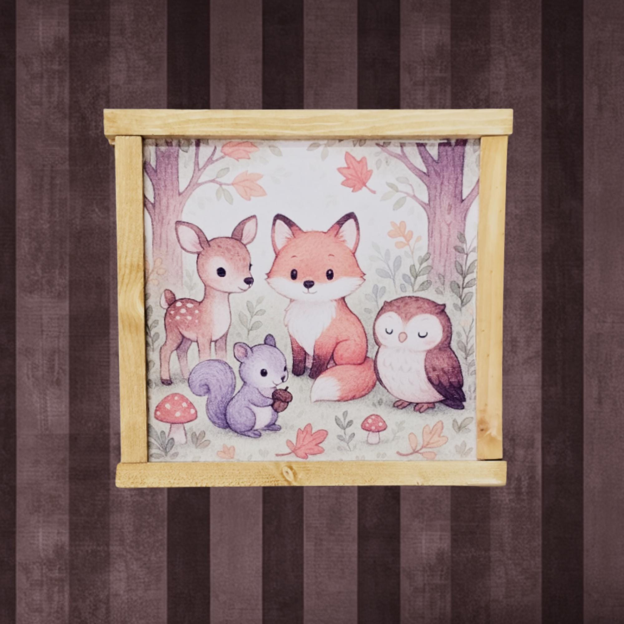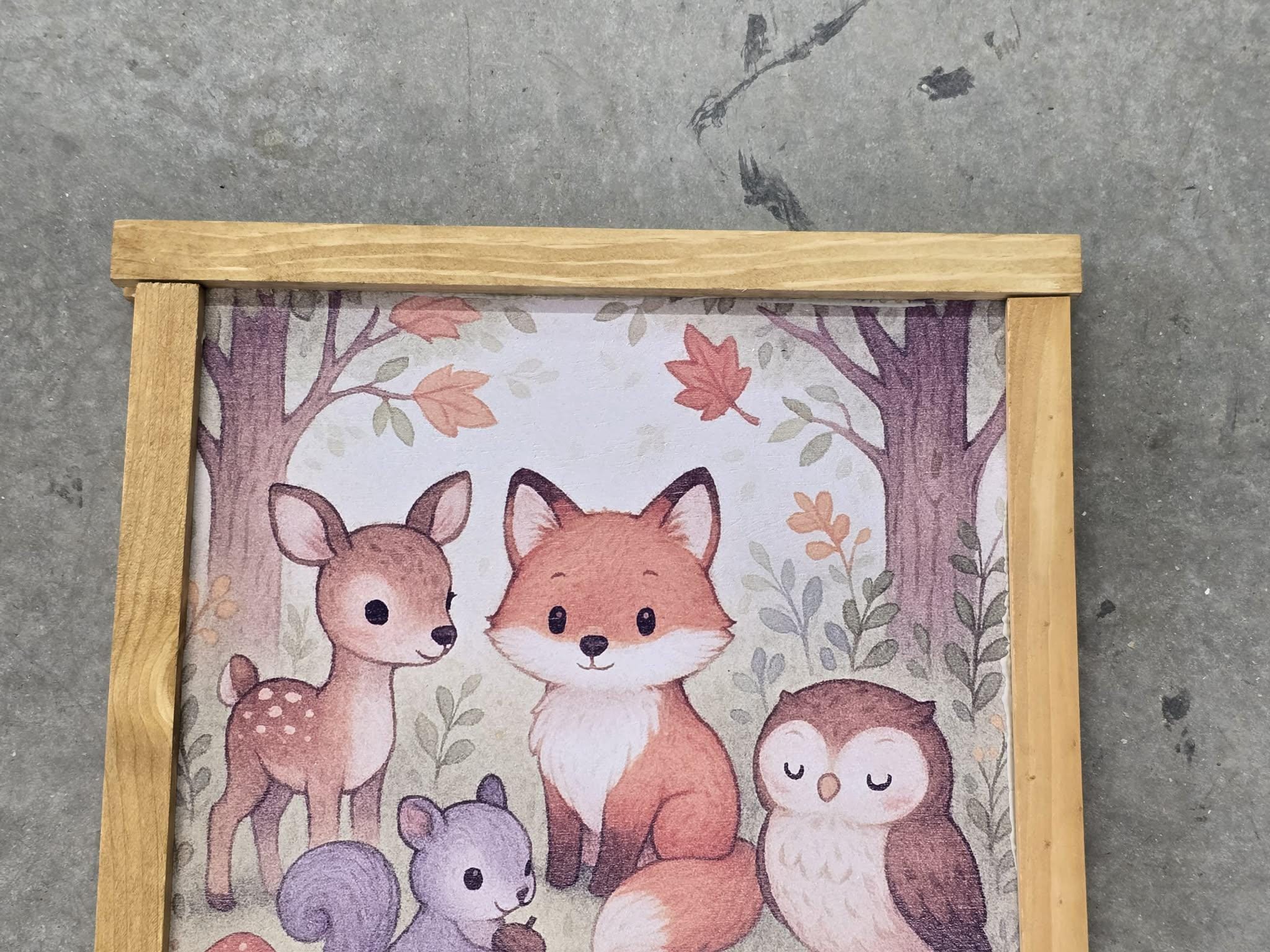 Pastel Woodland Animal Sign – Cute Deer, Fox, Squirrel, and Owl Illustration for Sweet Nursery, Playroom, or Cottage Kids’ Room Decor