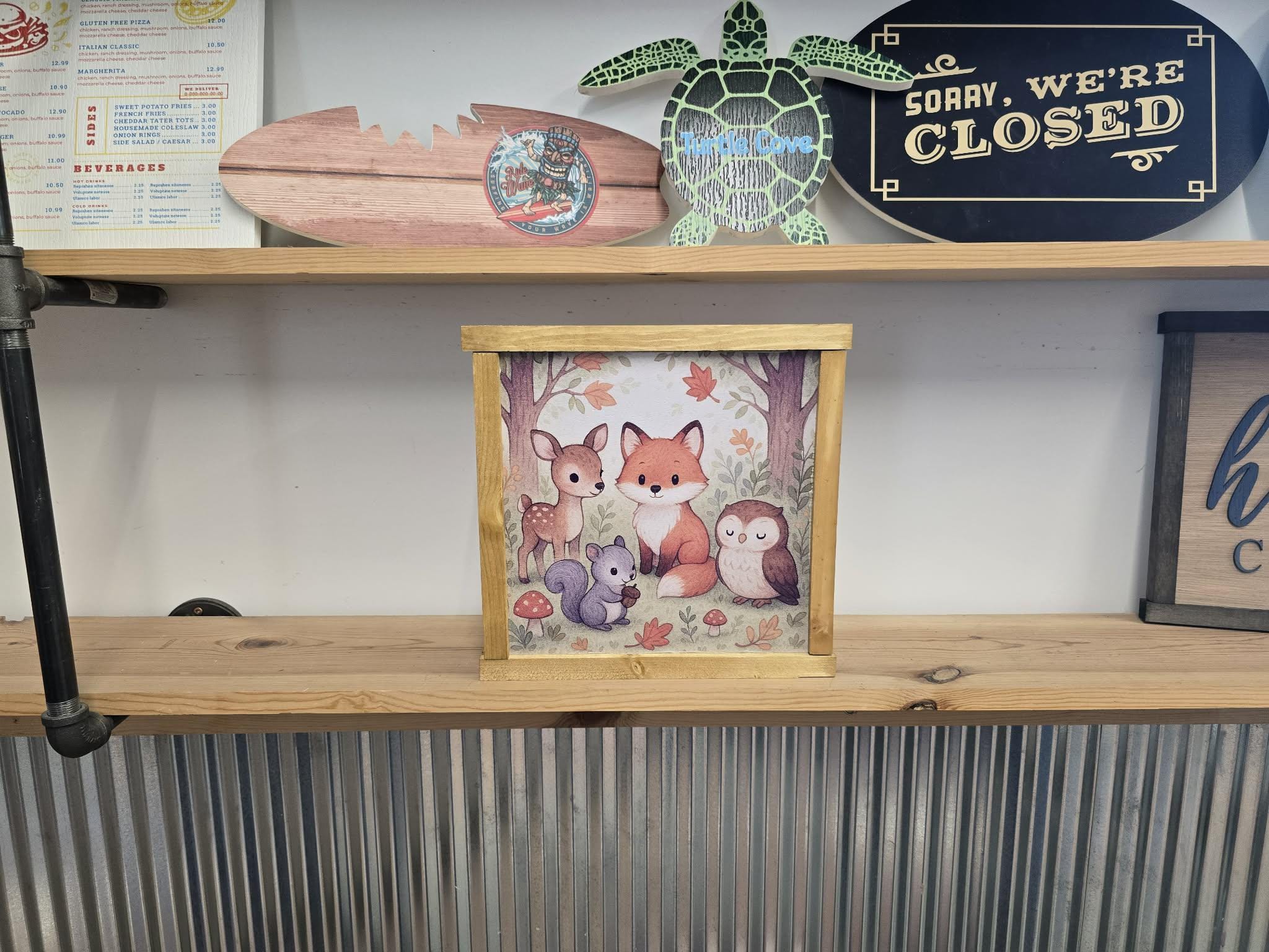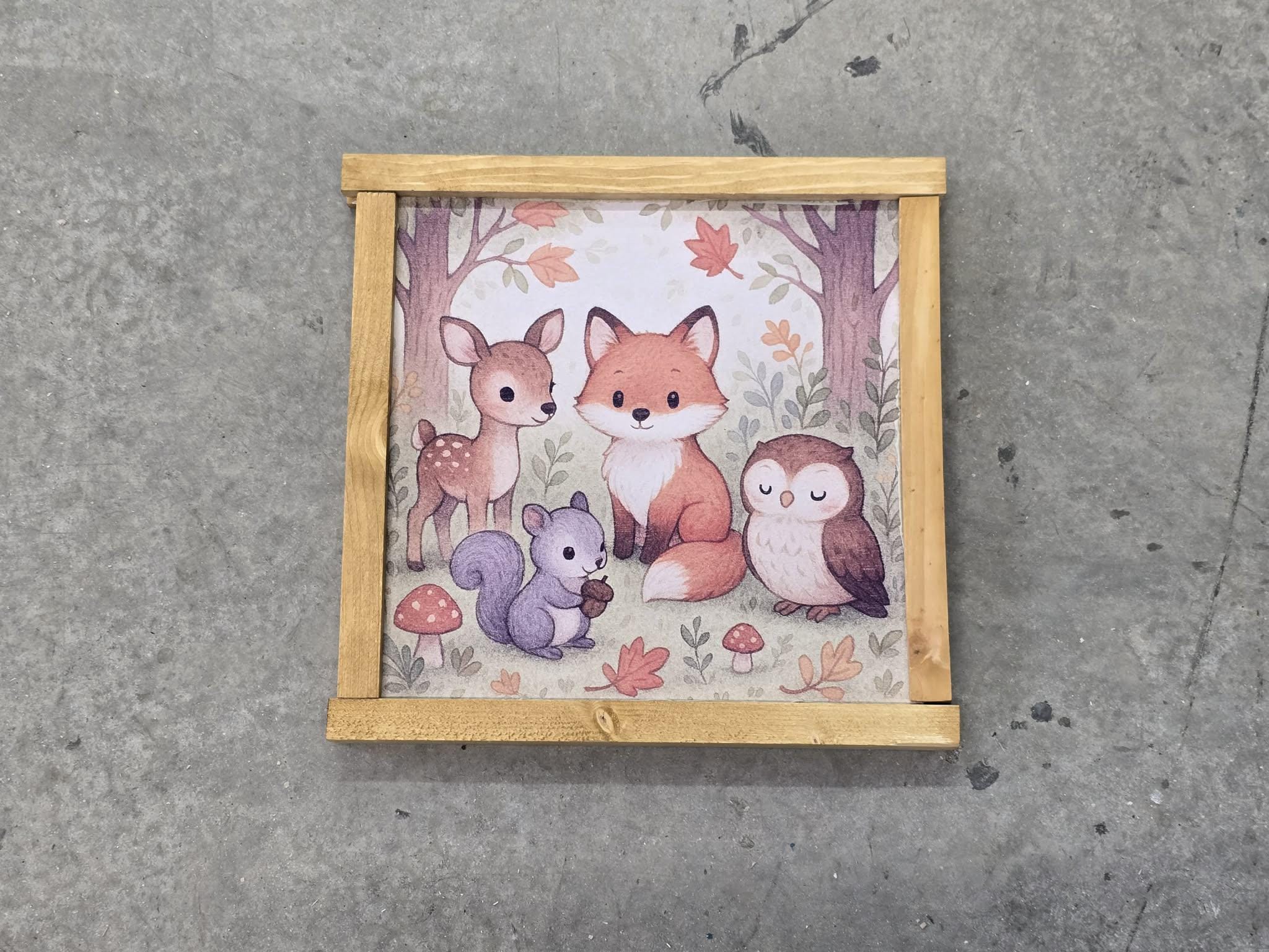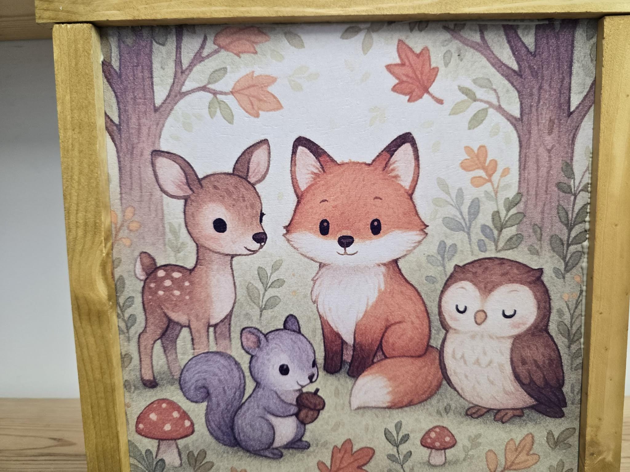 Pastel Woodland Animal Sign – Cute Deer, Fox, Squirrel, and Owl Illustration for Sweet Nursery, Playroom, or Cottage Kids’ Room Decor
