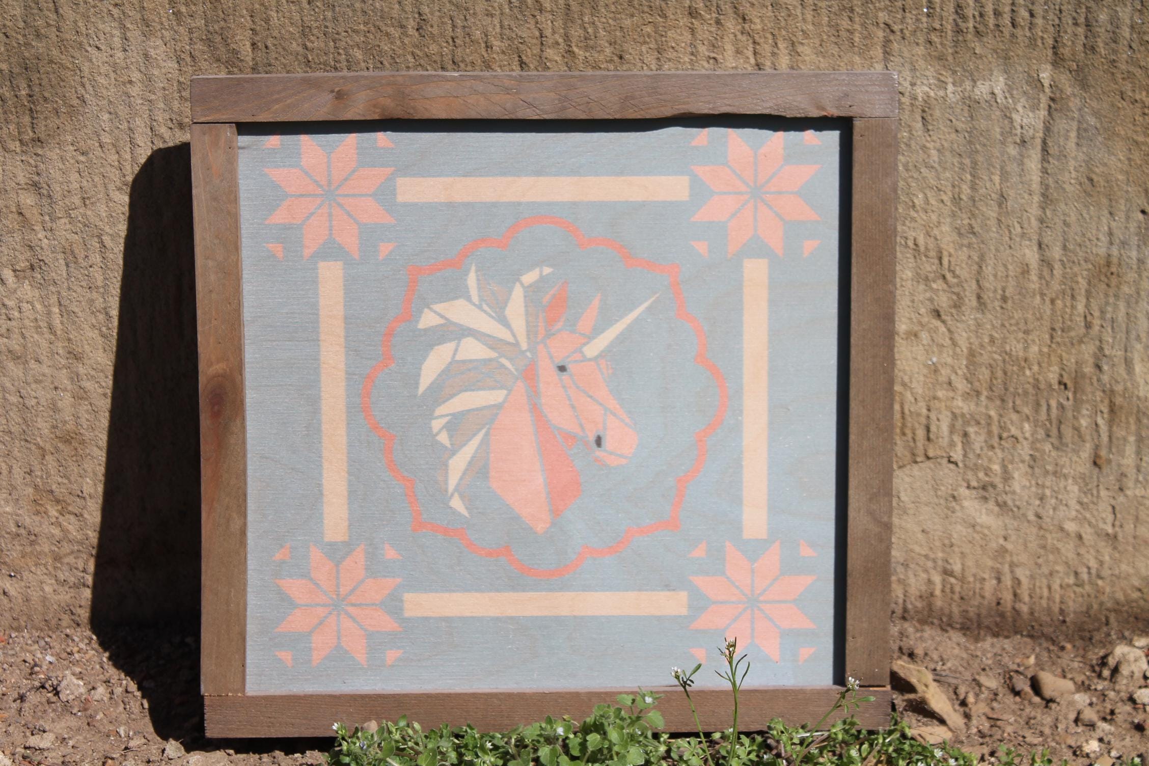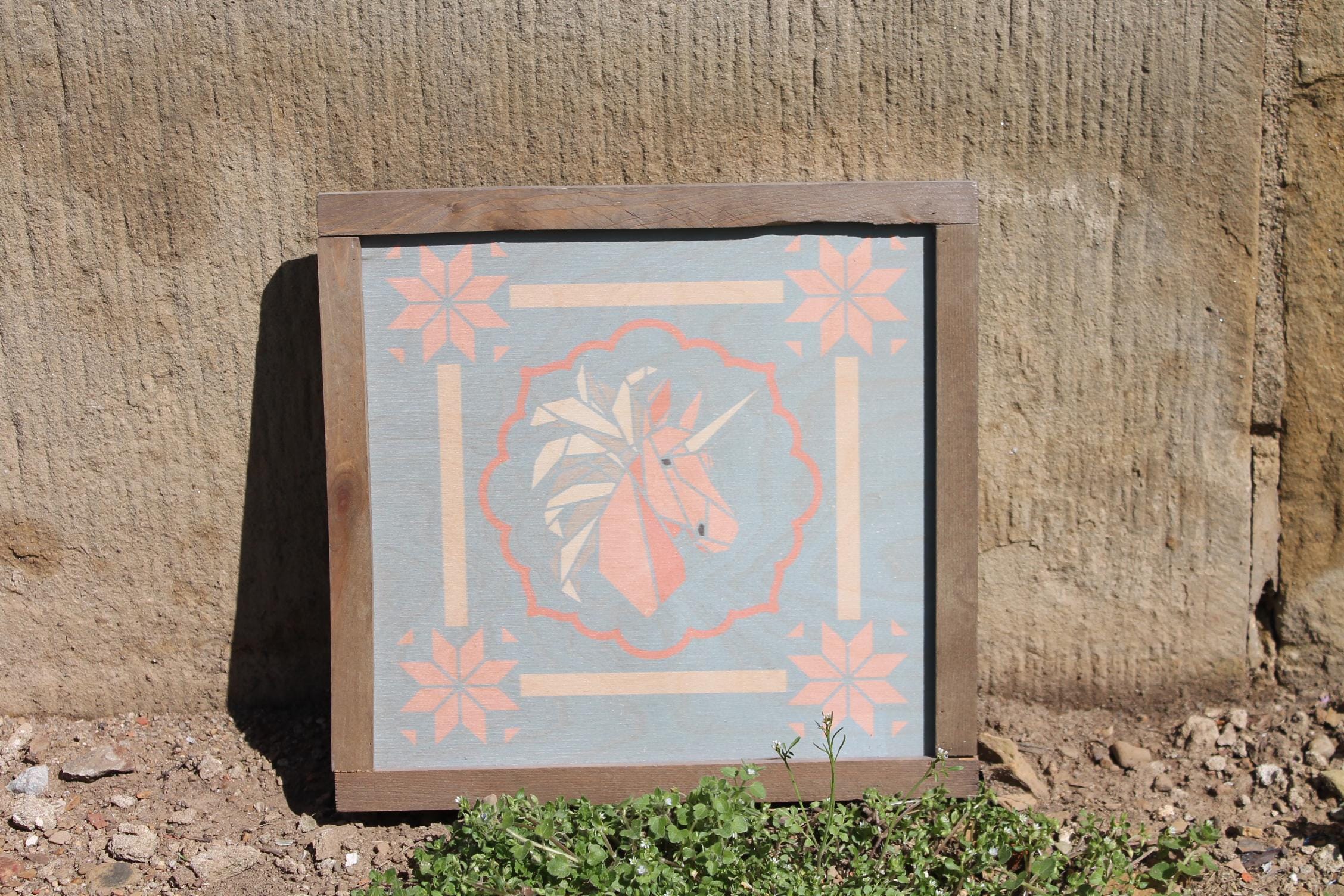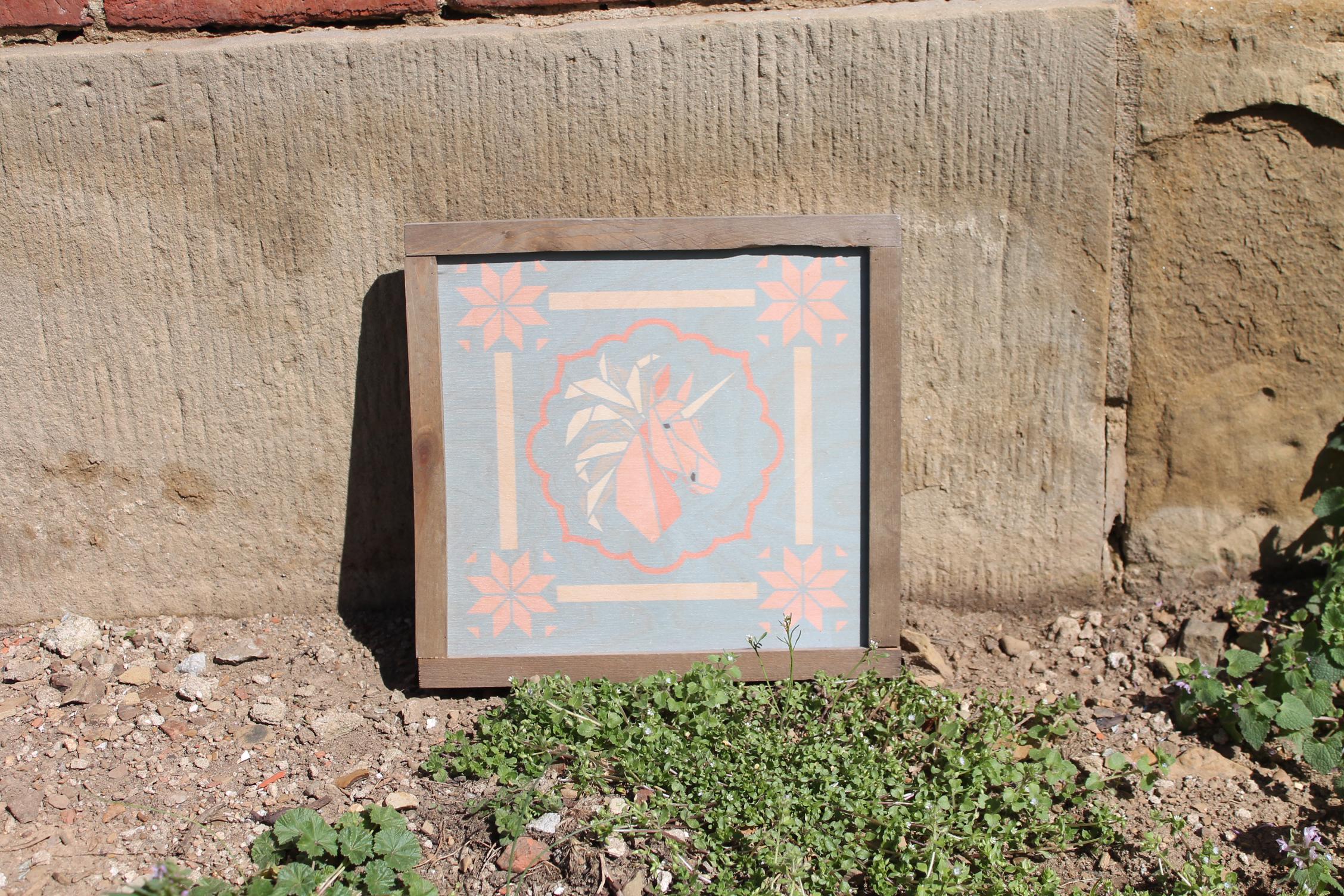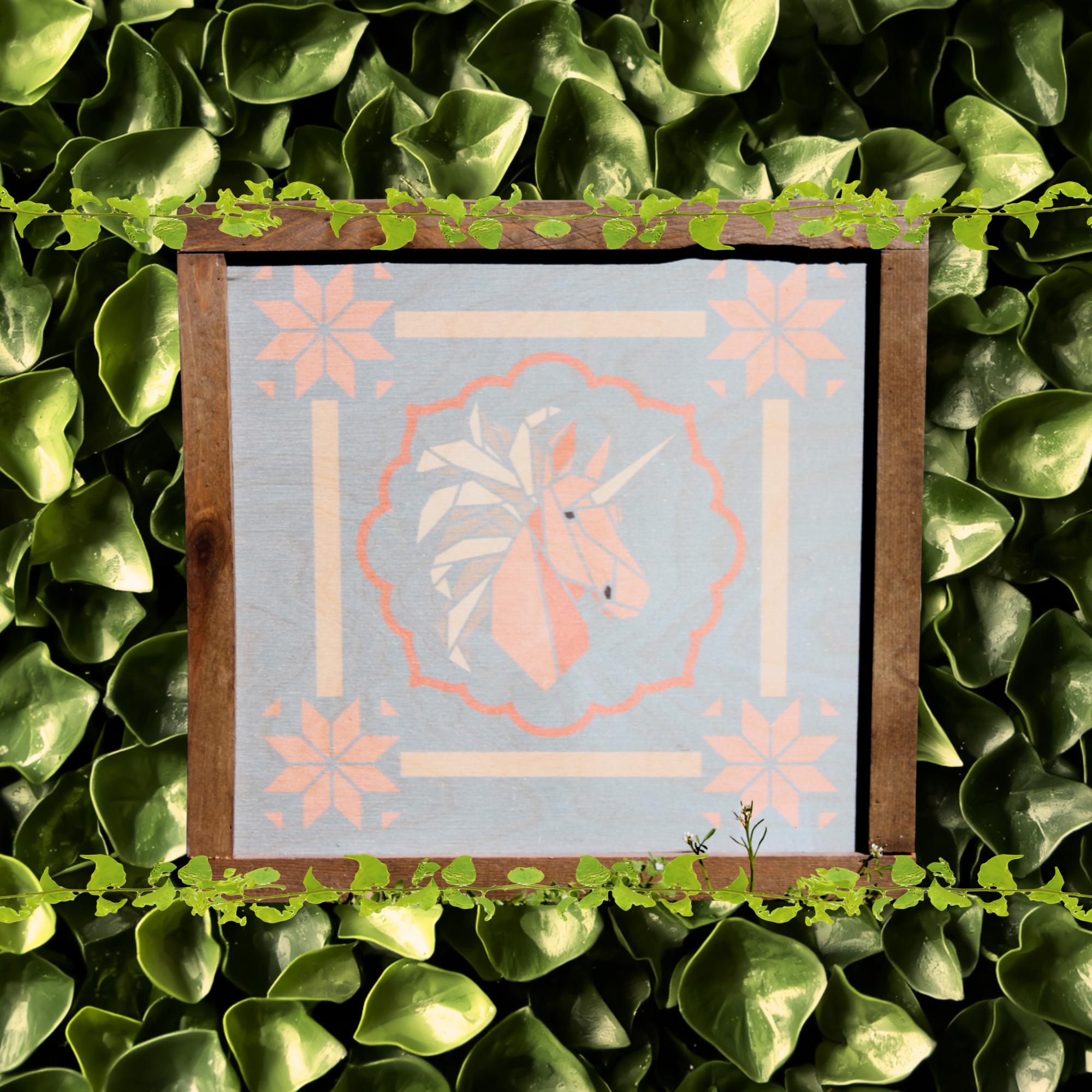 Pastel Geometric Unicorn Sign – Soft Pink and Peach Unicorn Illustration with Scalloped Border for Whimsical Nursery or Cottage Decor