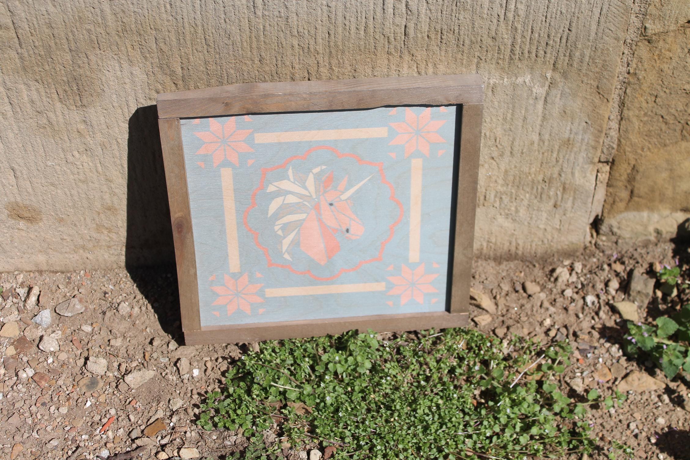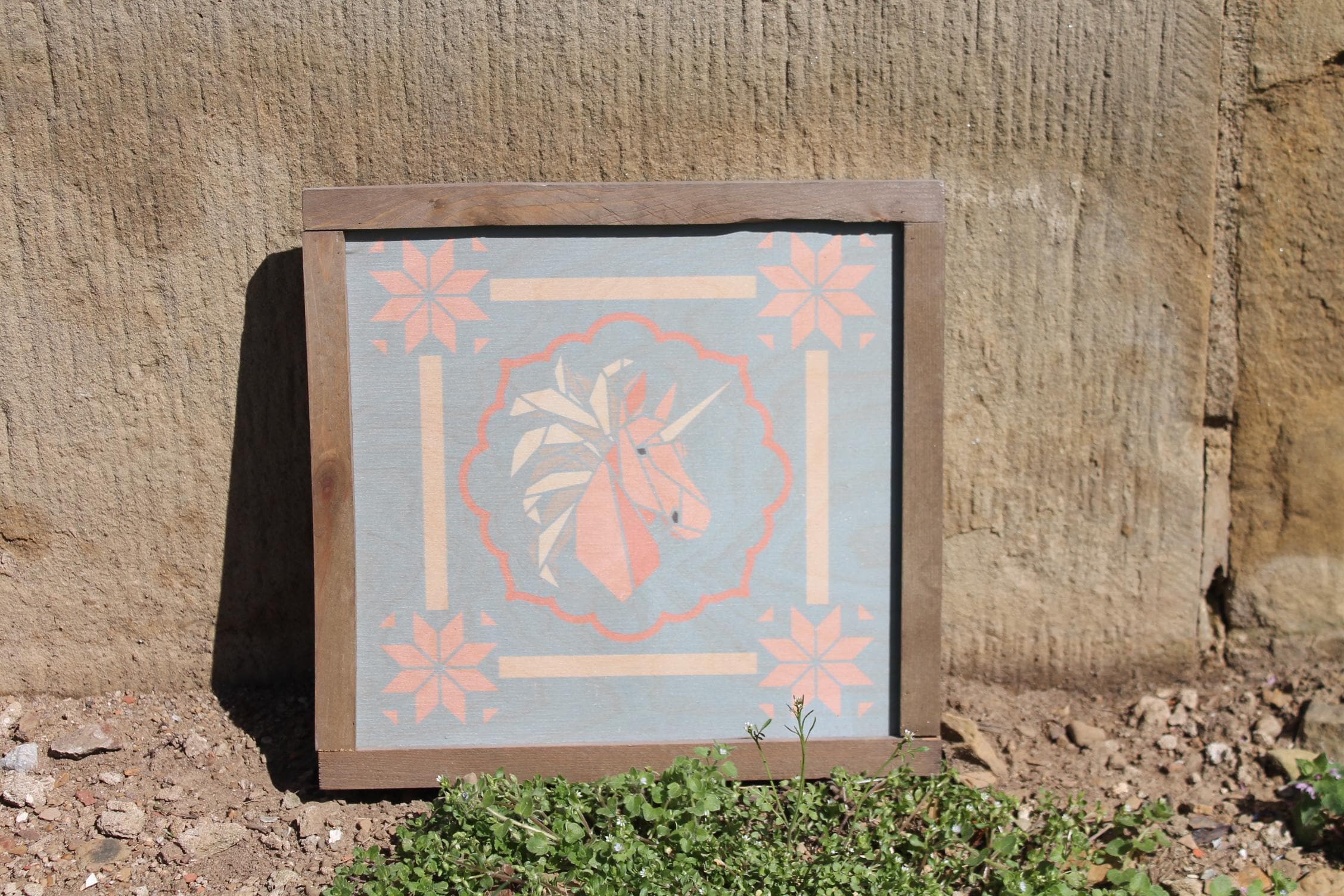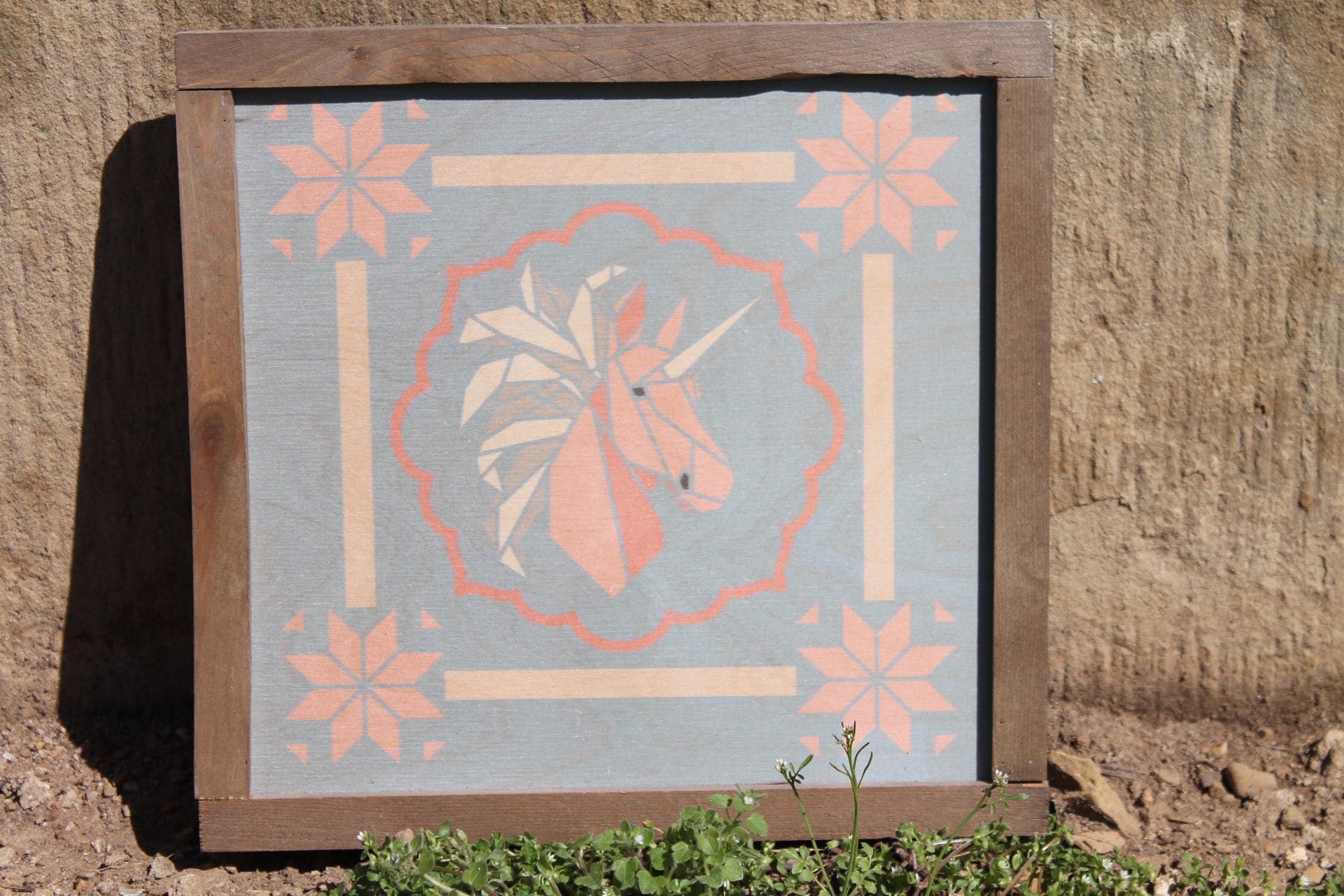 Pastel Geometric Unicorn Sign – Soft Pink and Peach Unicorn Illustration with Scalloped Border for Whimsical Nursery or Cottage Decor