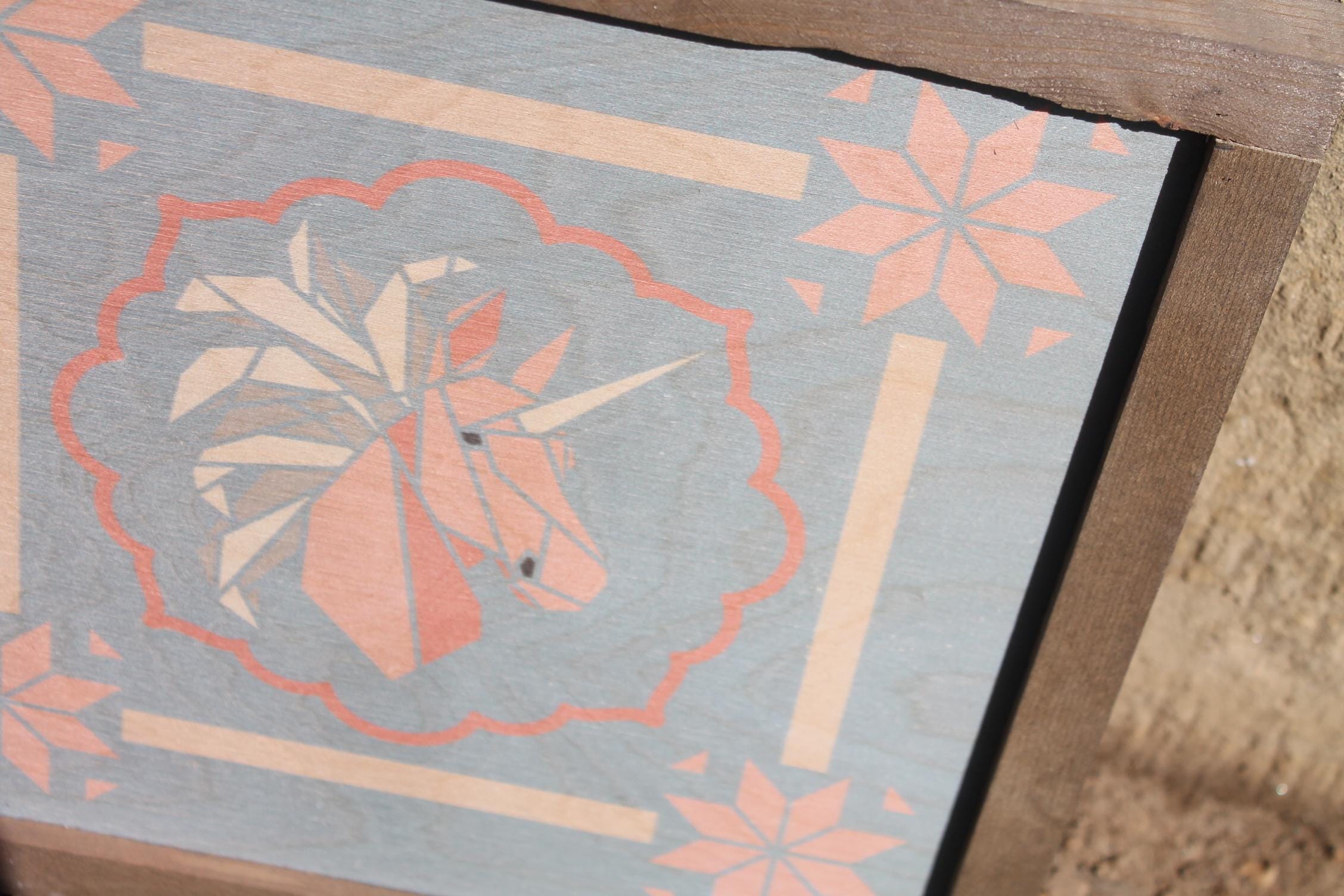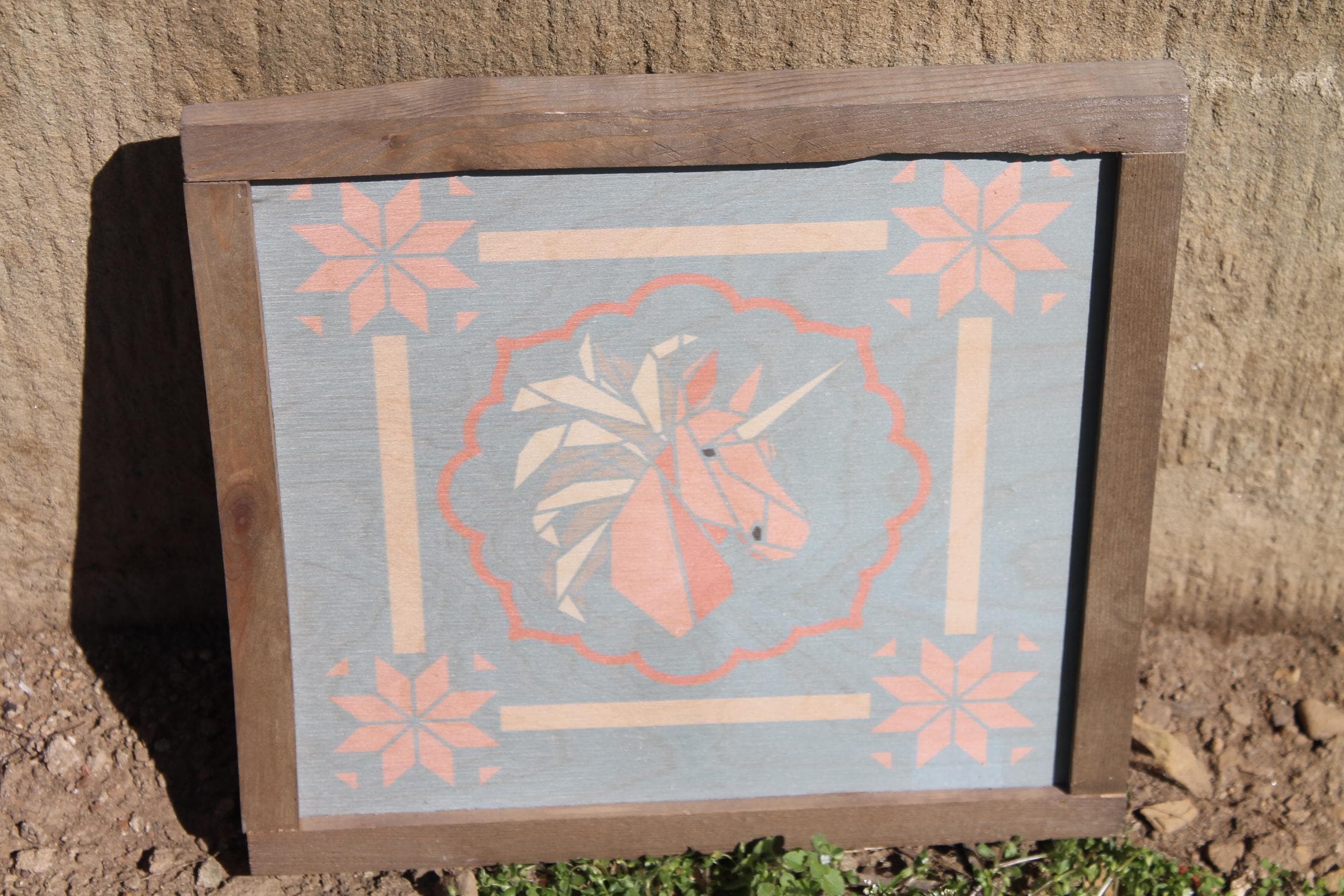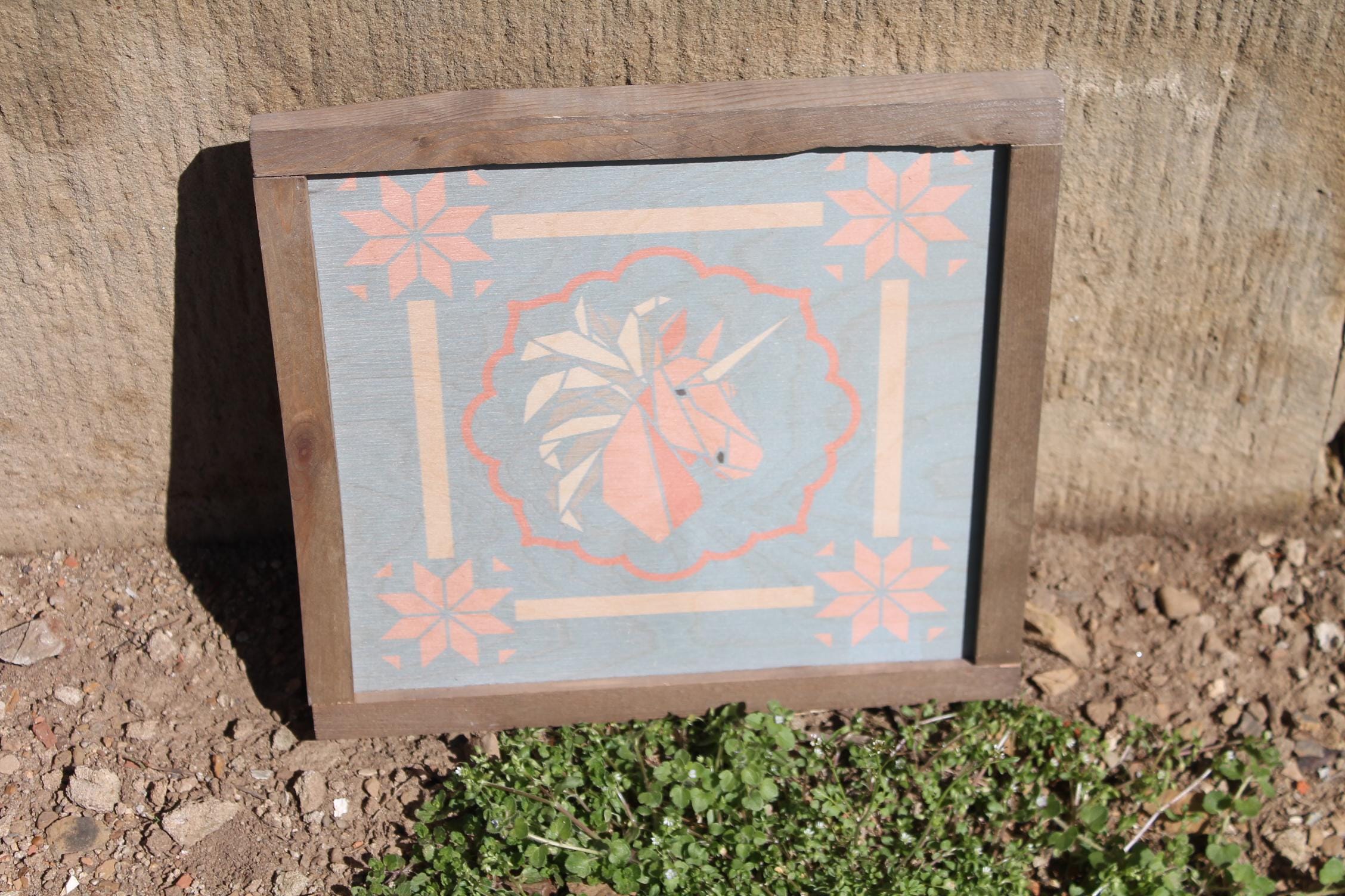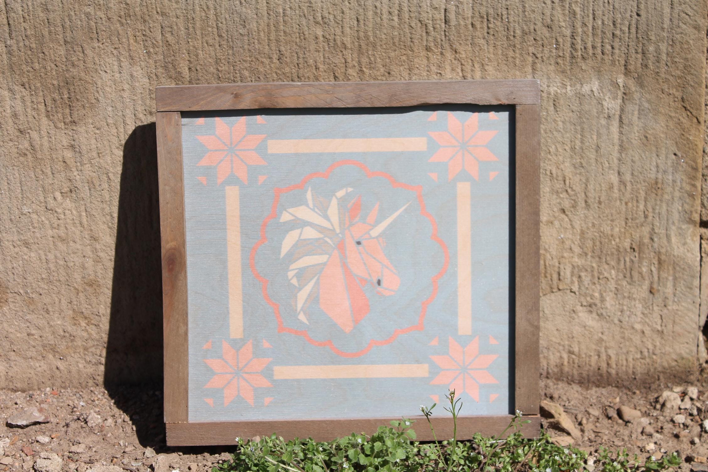 Pastel Geometric Unicorn Sign – Soft Pink and Peach Unicorn Illustration with Scalloped Border for Whimsical Nursery or Cottage Decor