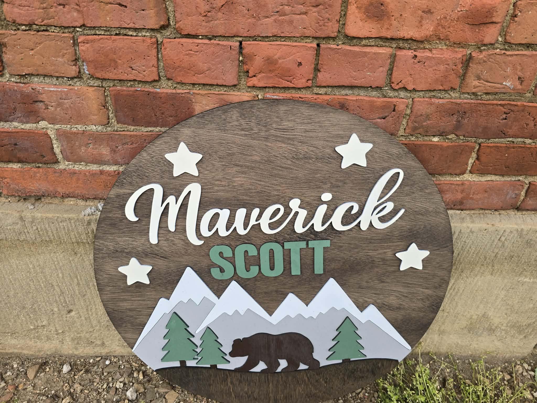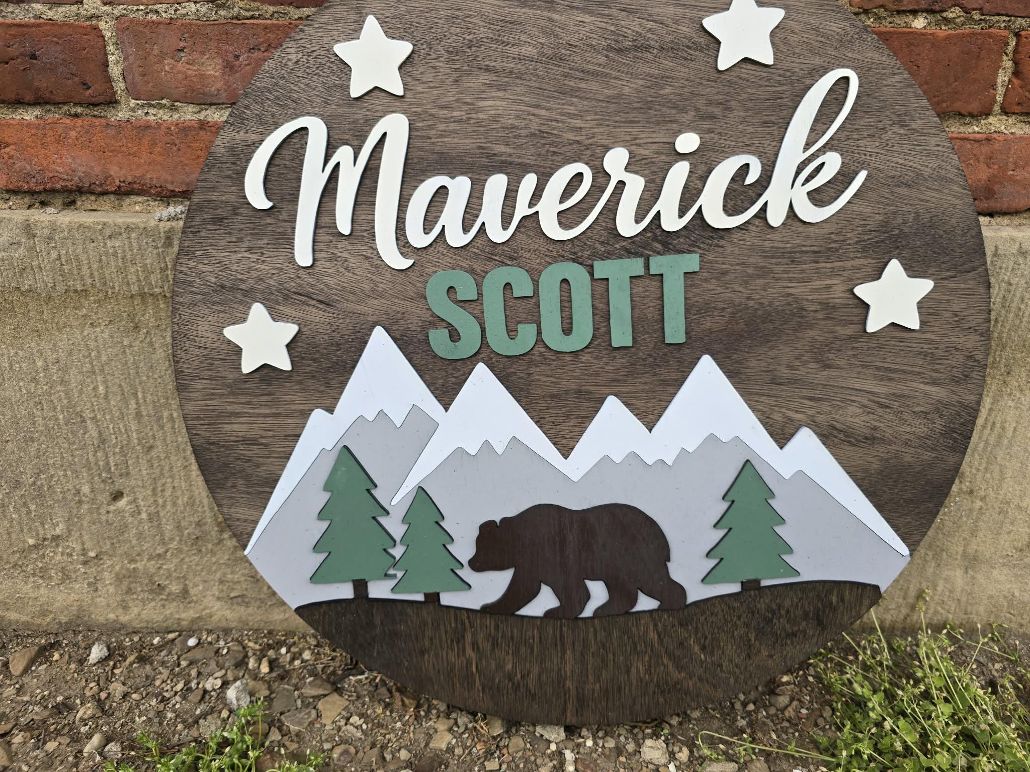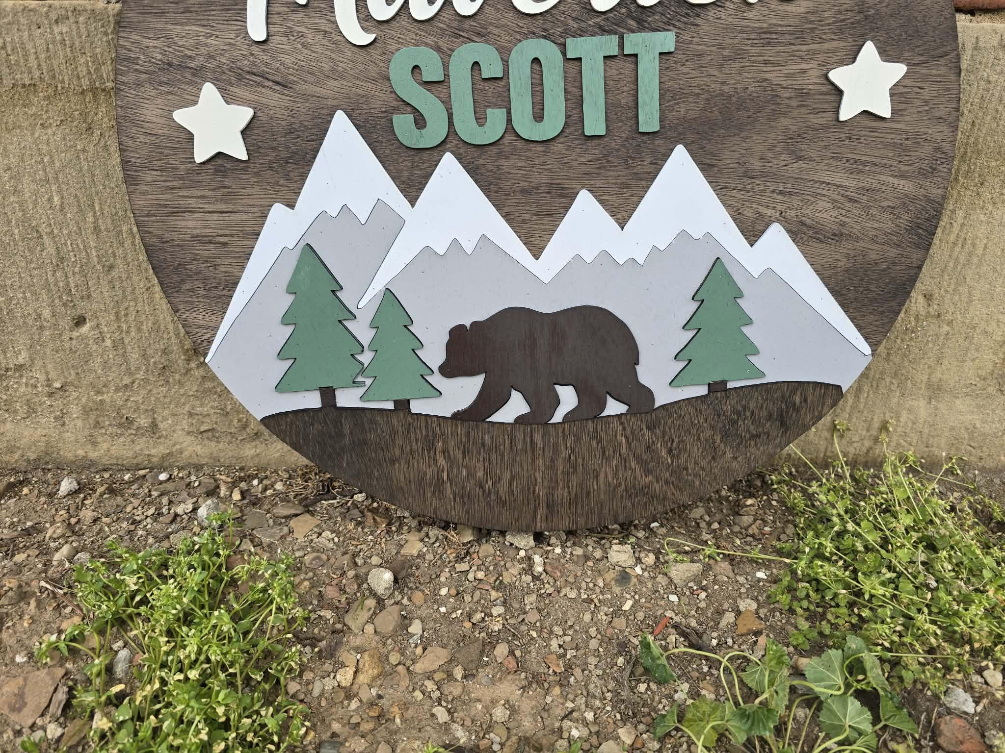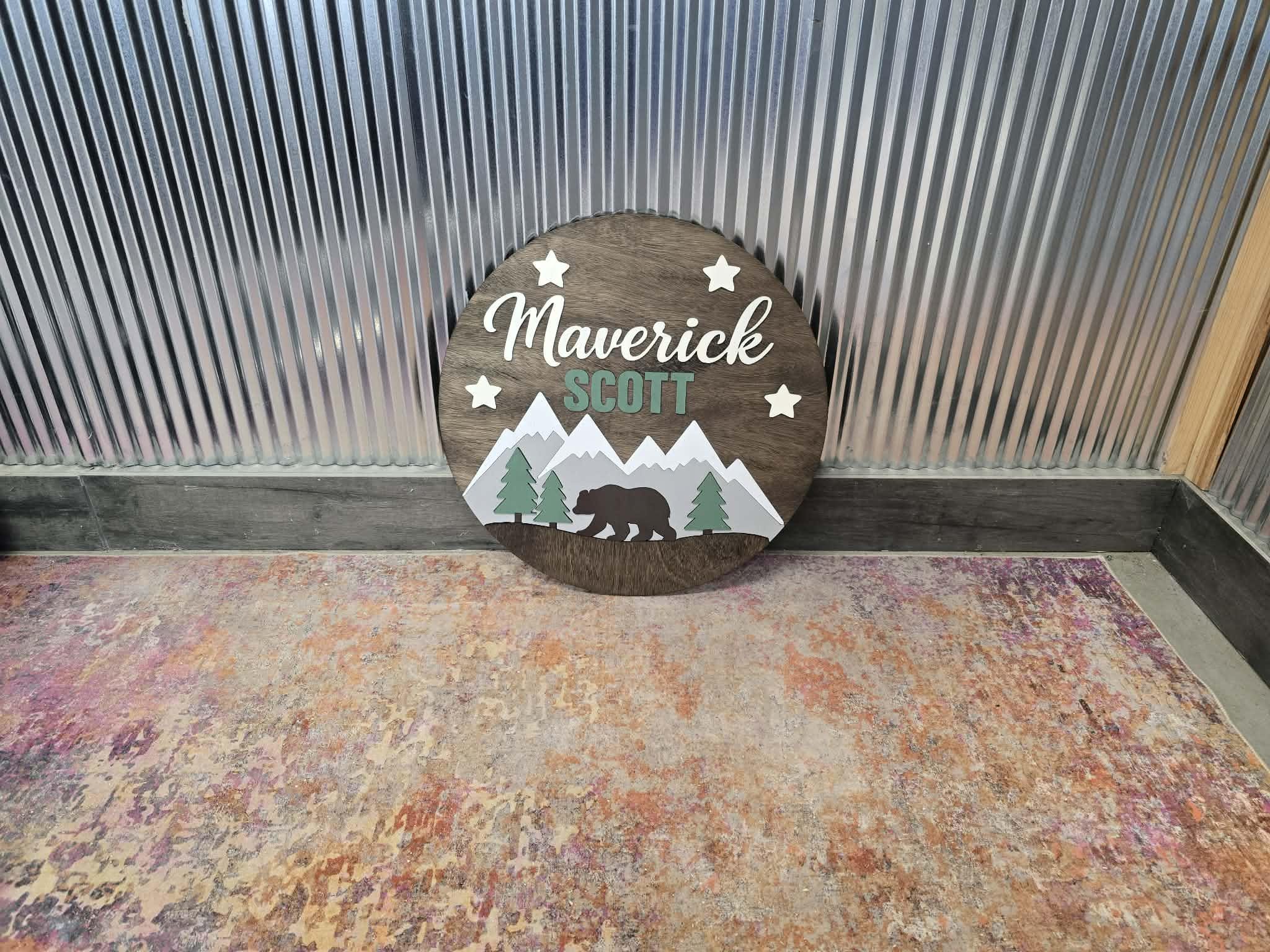 3D Custom Name Sign • Raised Woodland Bear & Mountains Decor • Personalized Adventure Nursery Wood Round