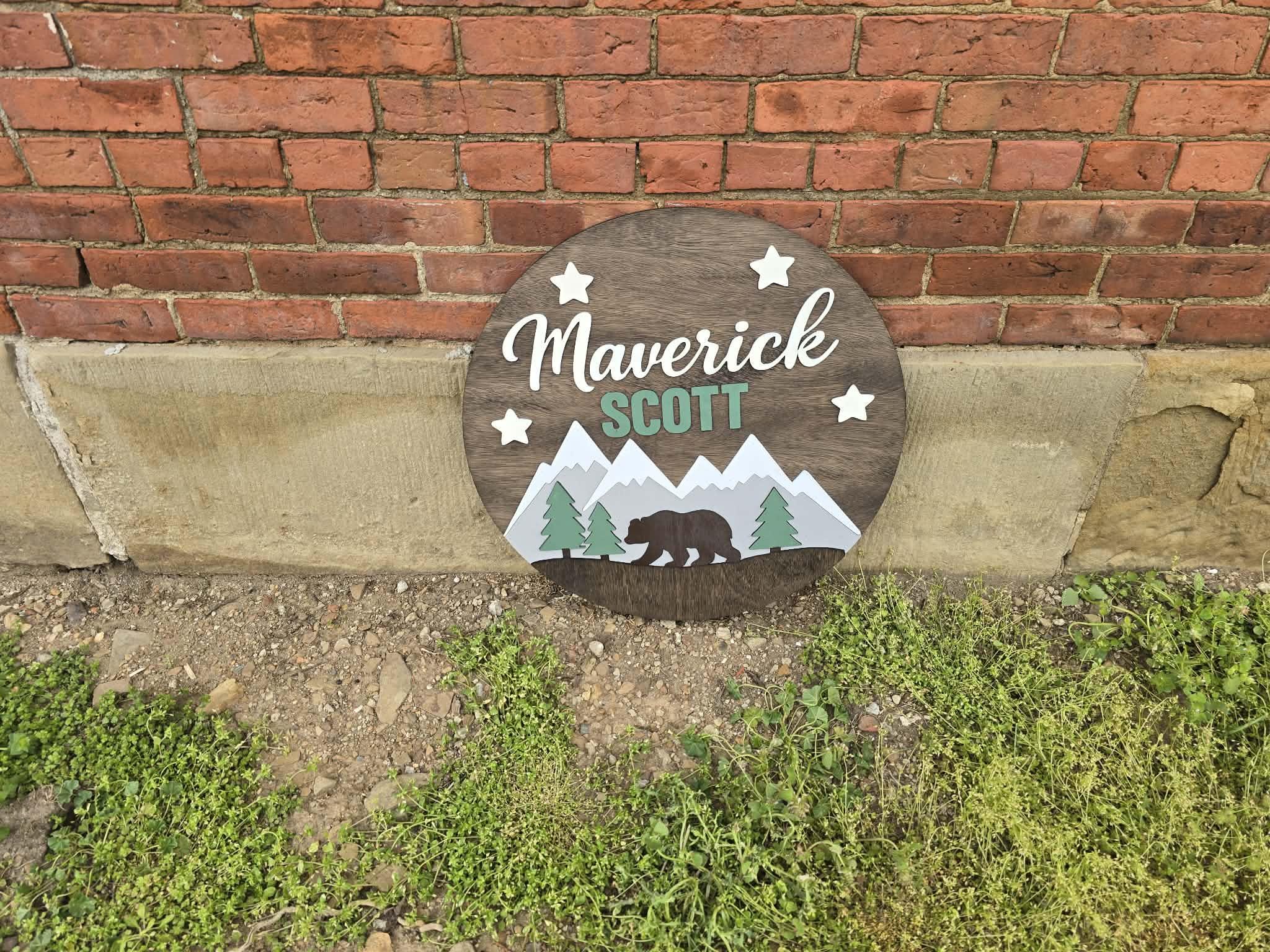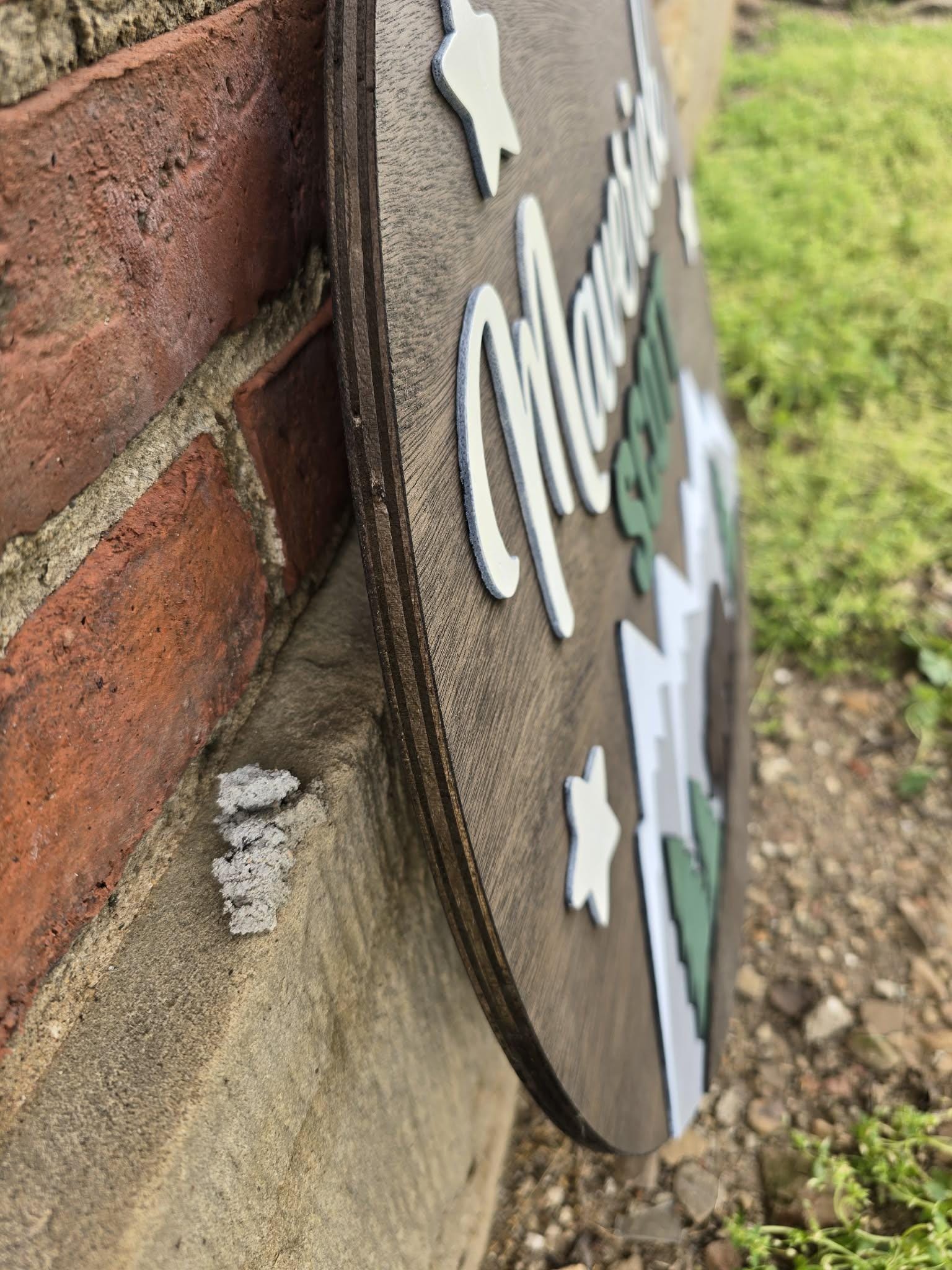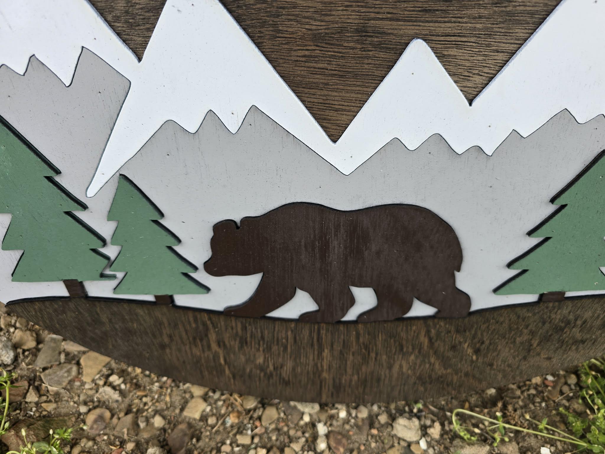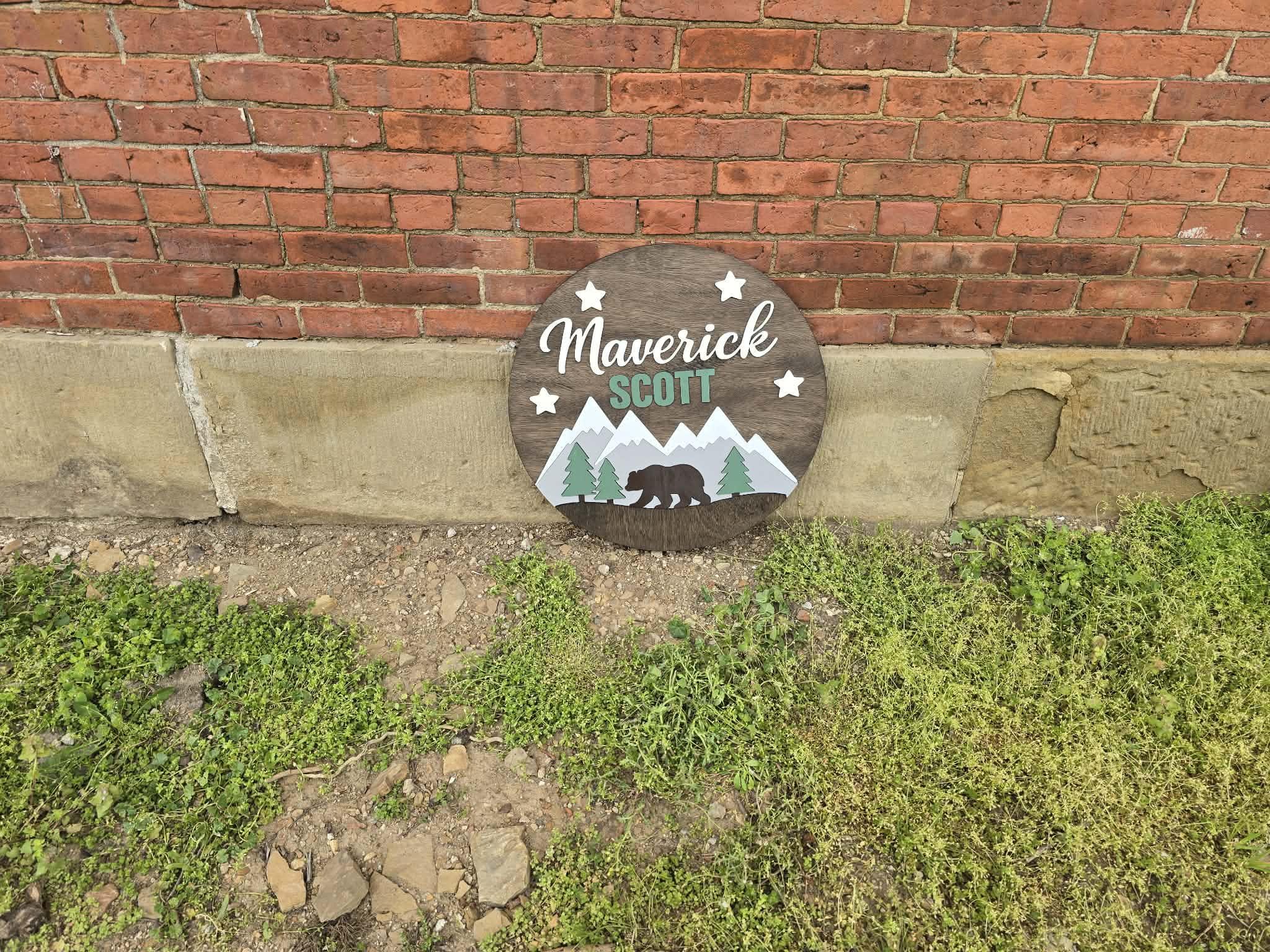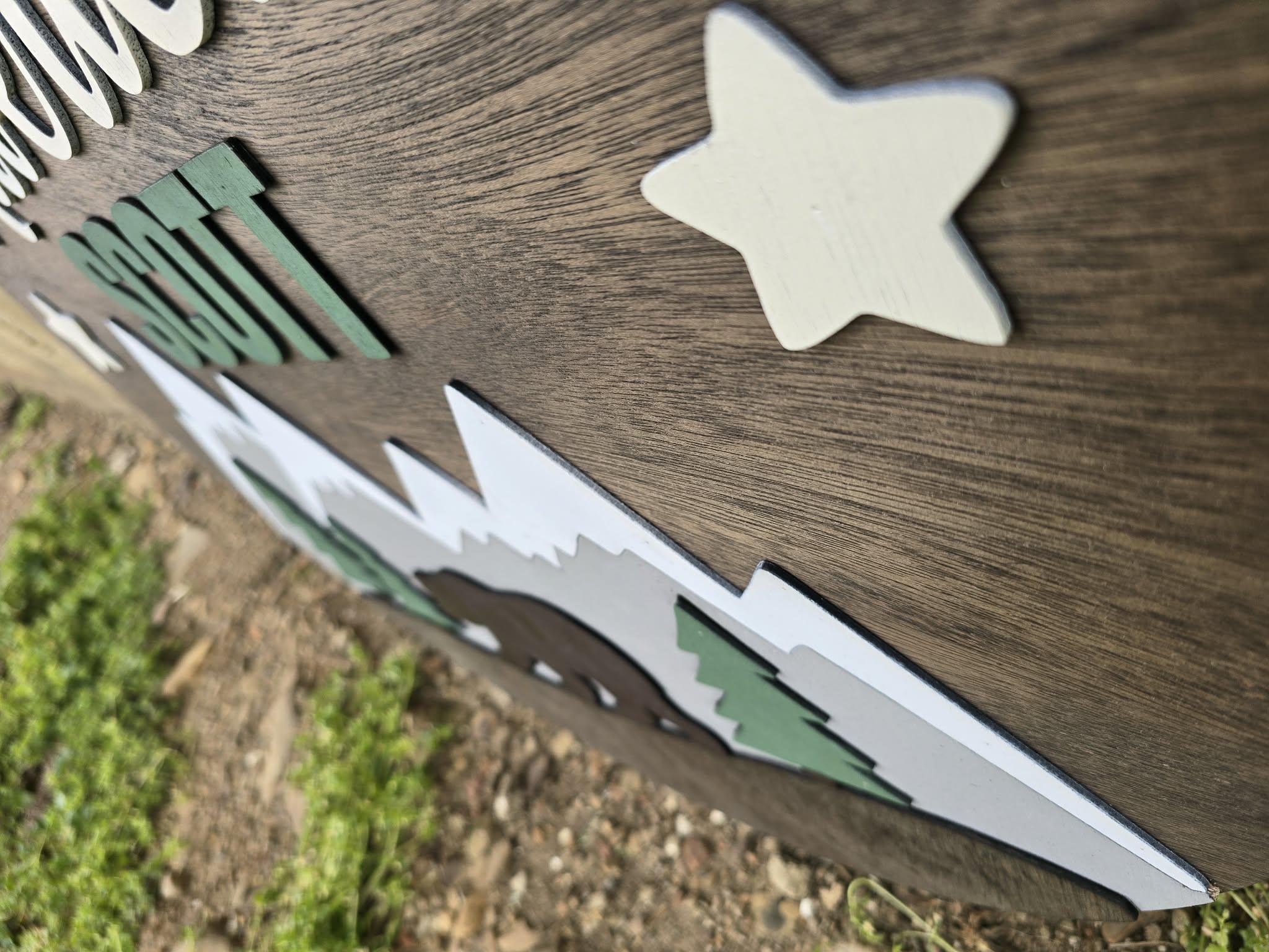 3D Custom Name Sign • Raised Woodland Bear & Mountains Decor • Personalized Adventure Nursery Wood Round