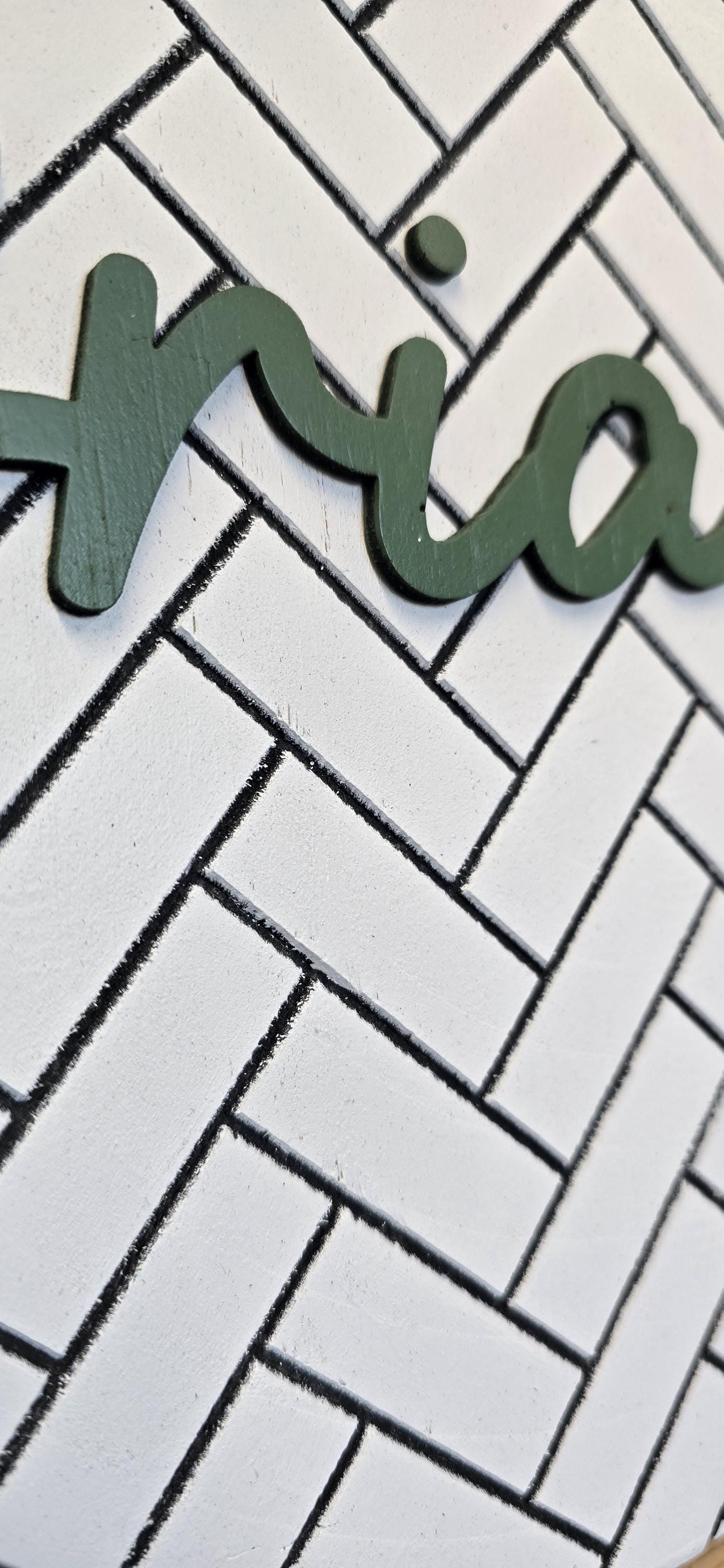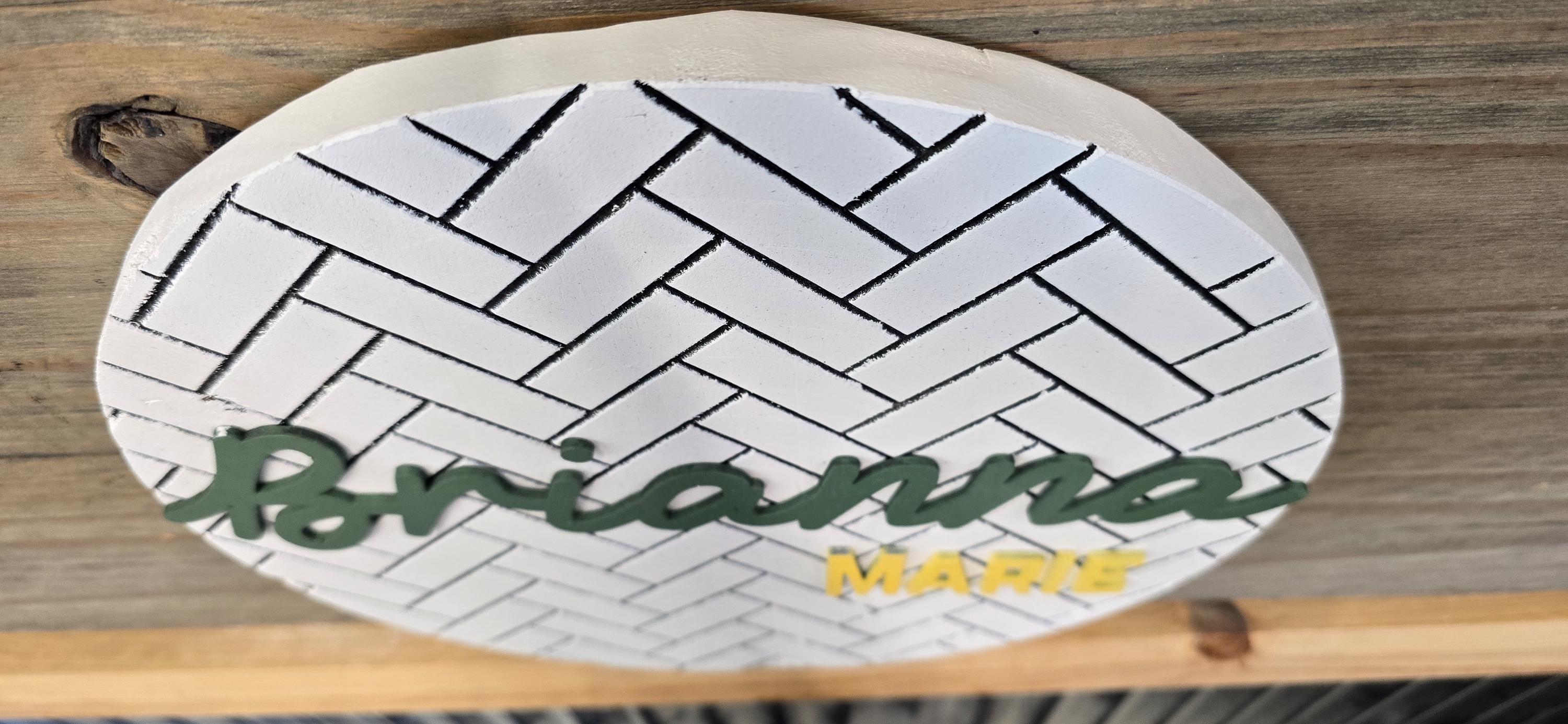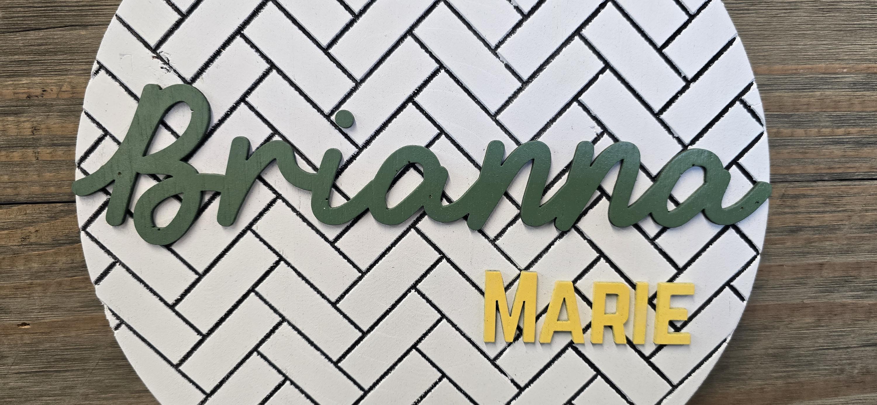 It has laser cut plywood letters and graphics. The backerboard has a herringbone pattern engraved into the back of it. Then the letters place on top.