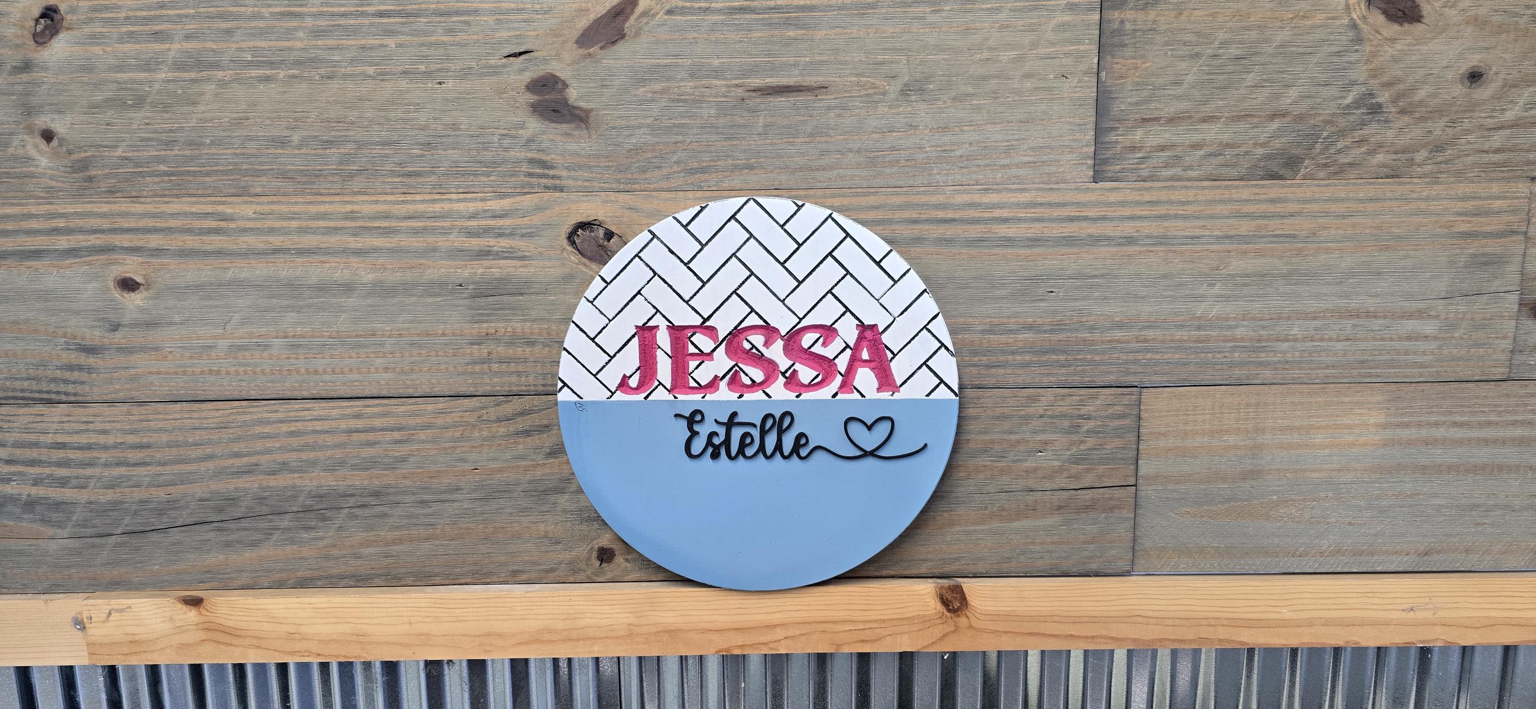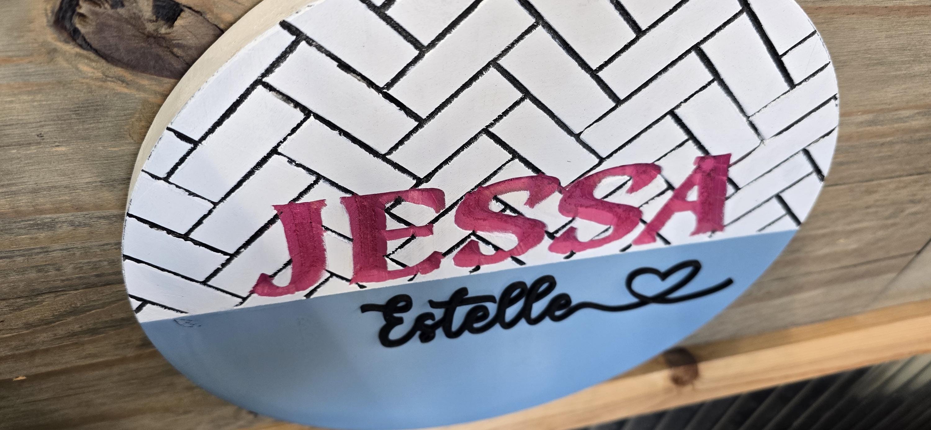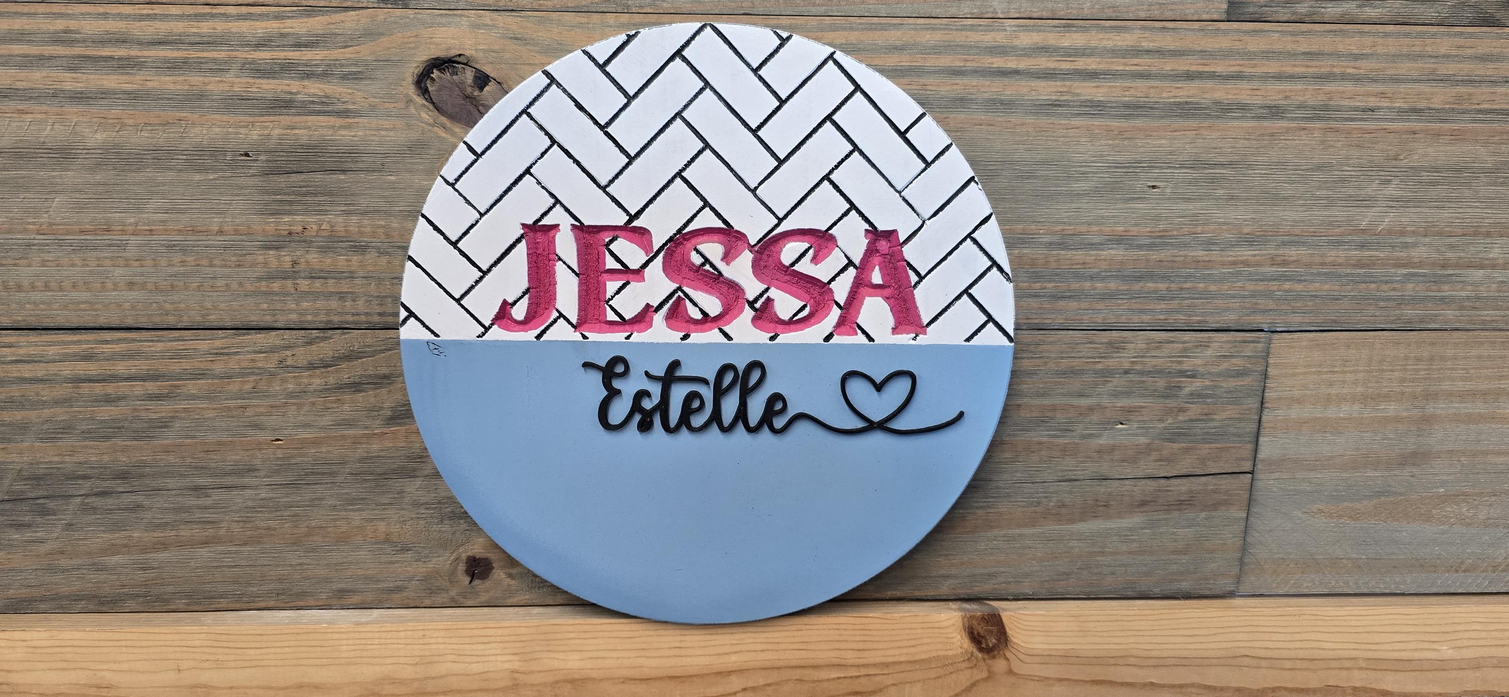 The backerboard has a herringbone pattern engraved into the back of it, then the first name is also engraved. The middle name is raised and cut with a laser.