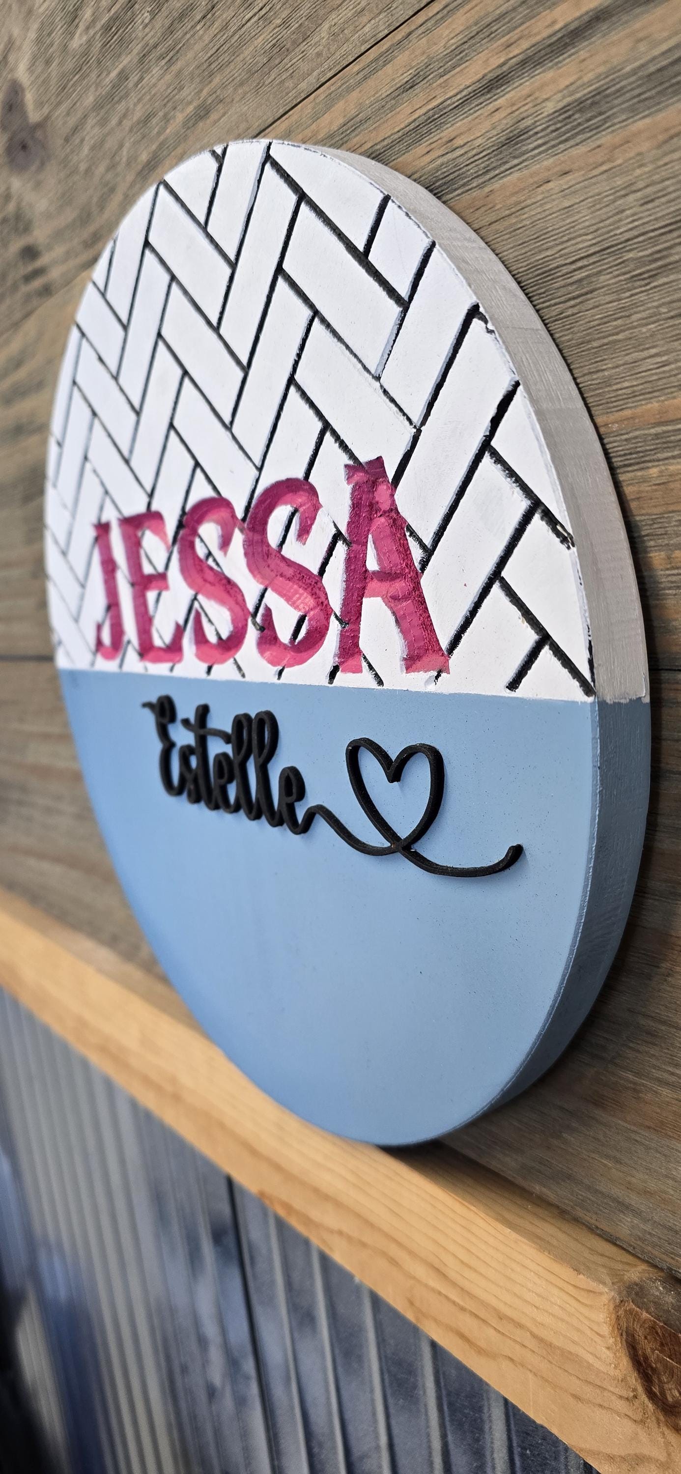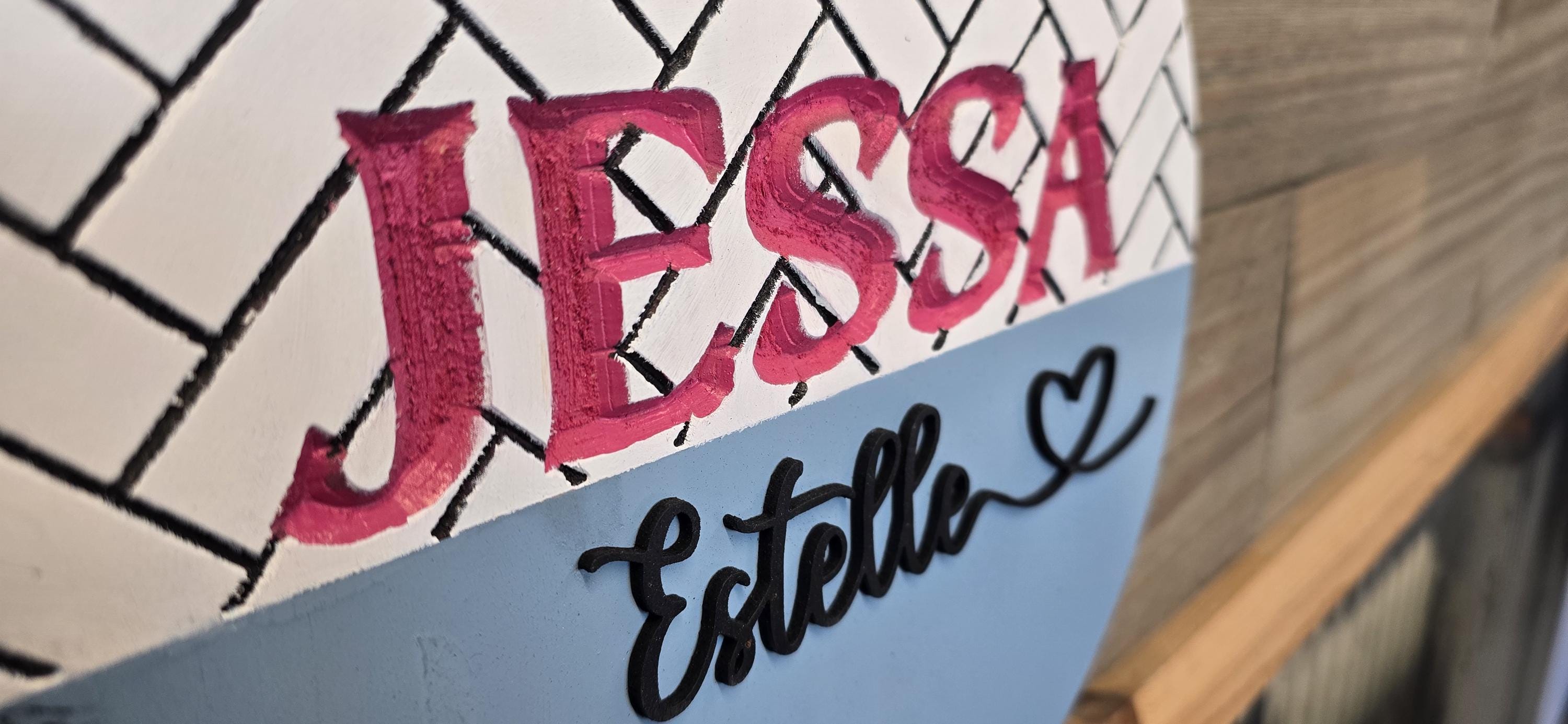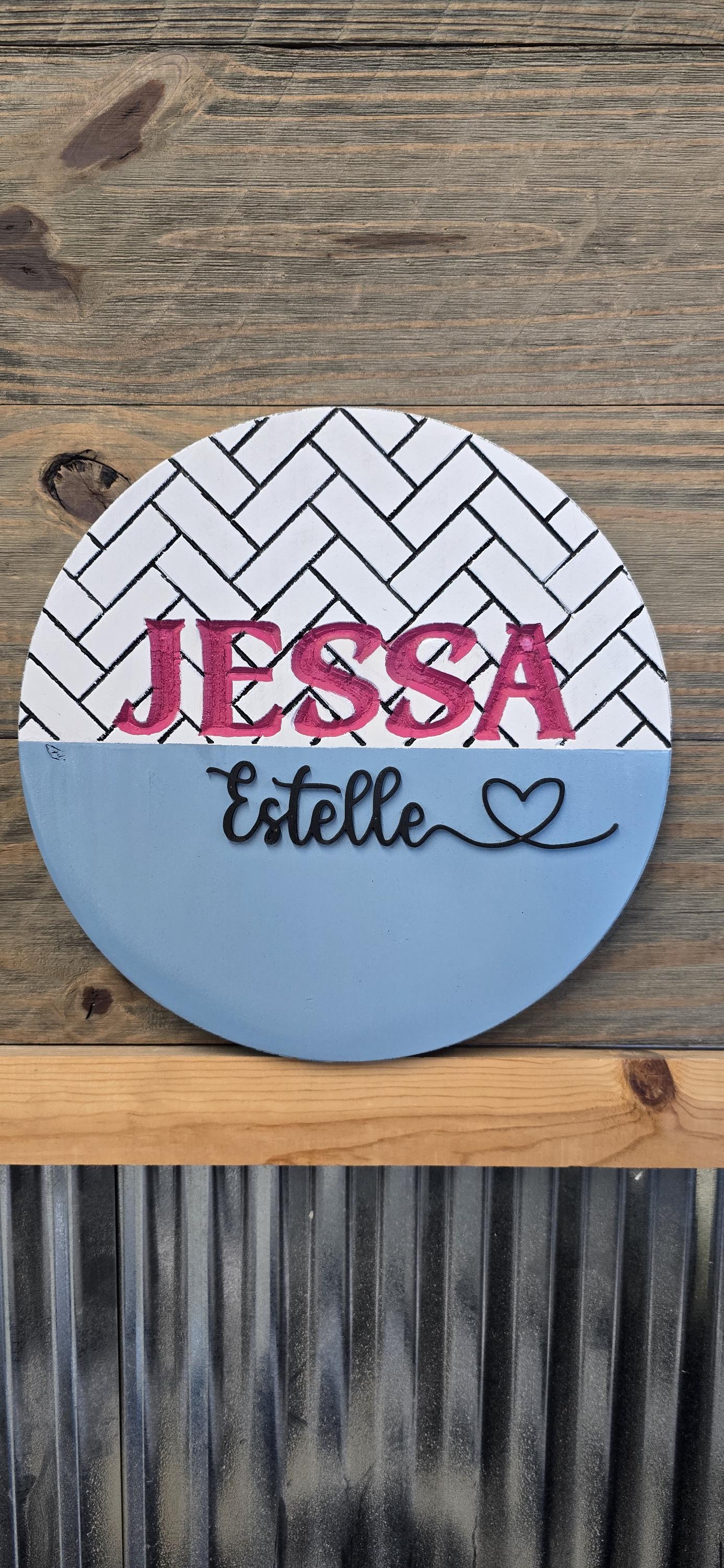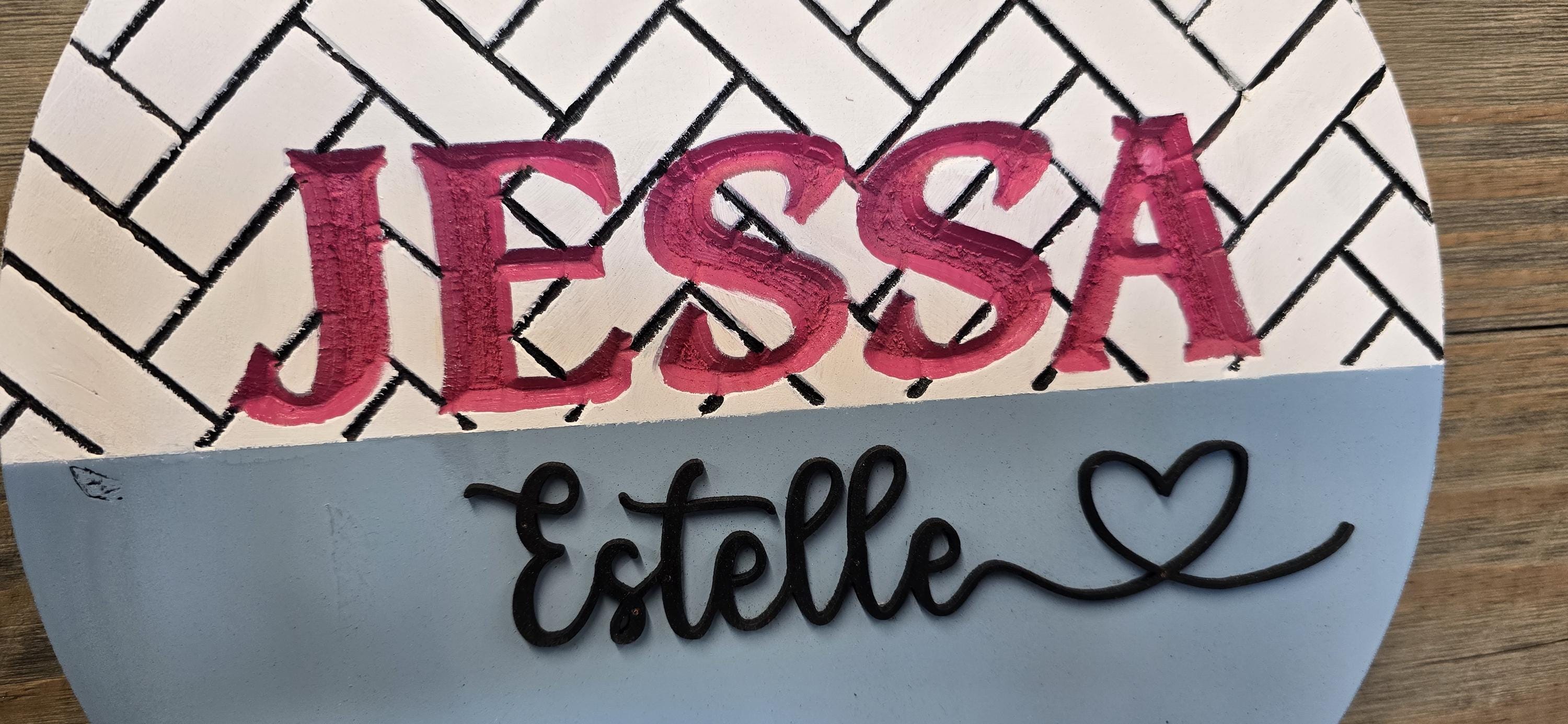 The backerboard has a herringbone pattern engraved into the back of it, then the first name is also engraved. The middle name is raised and cut with a laser.