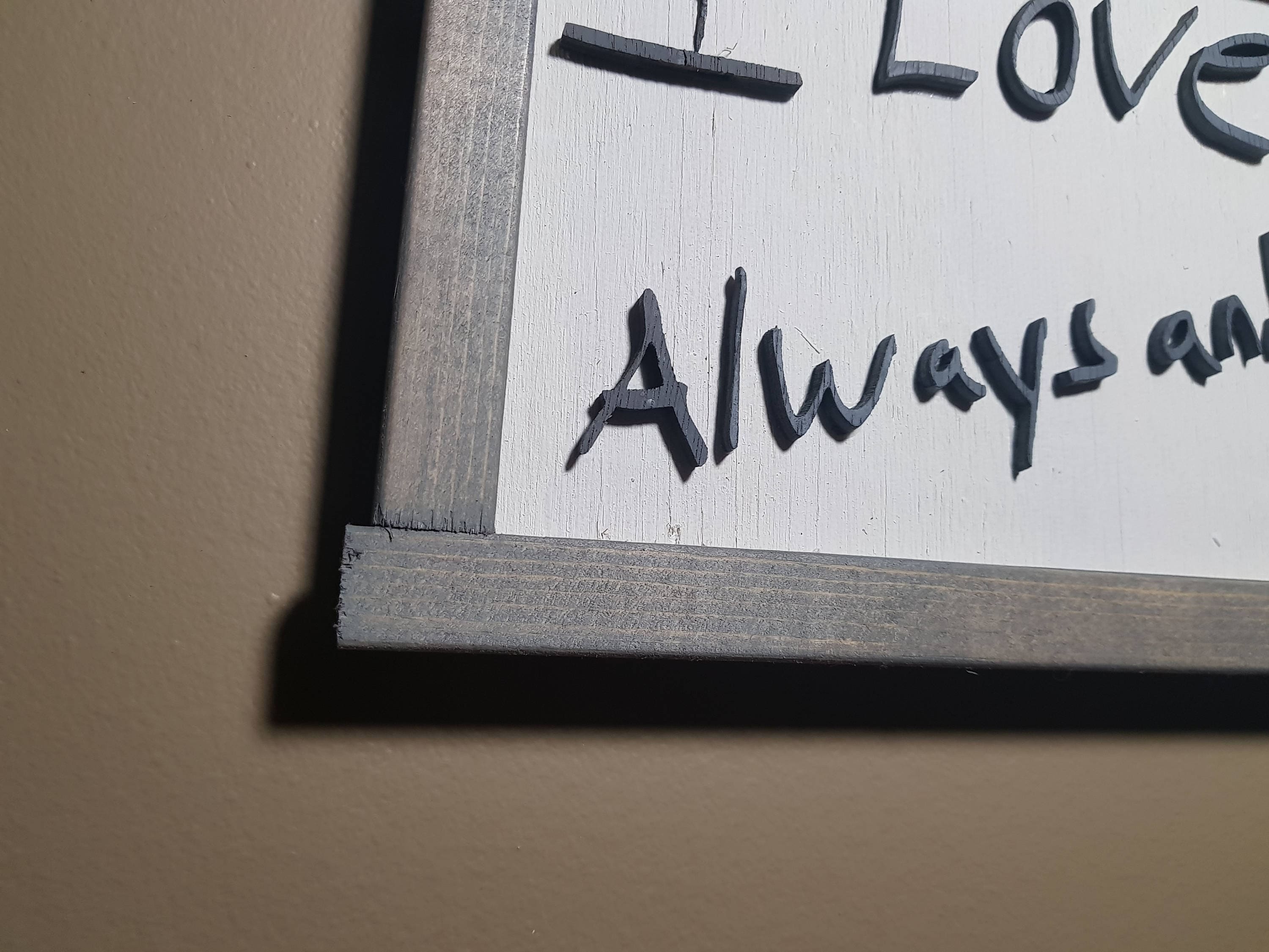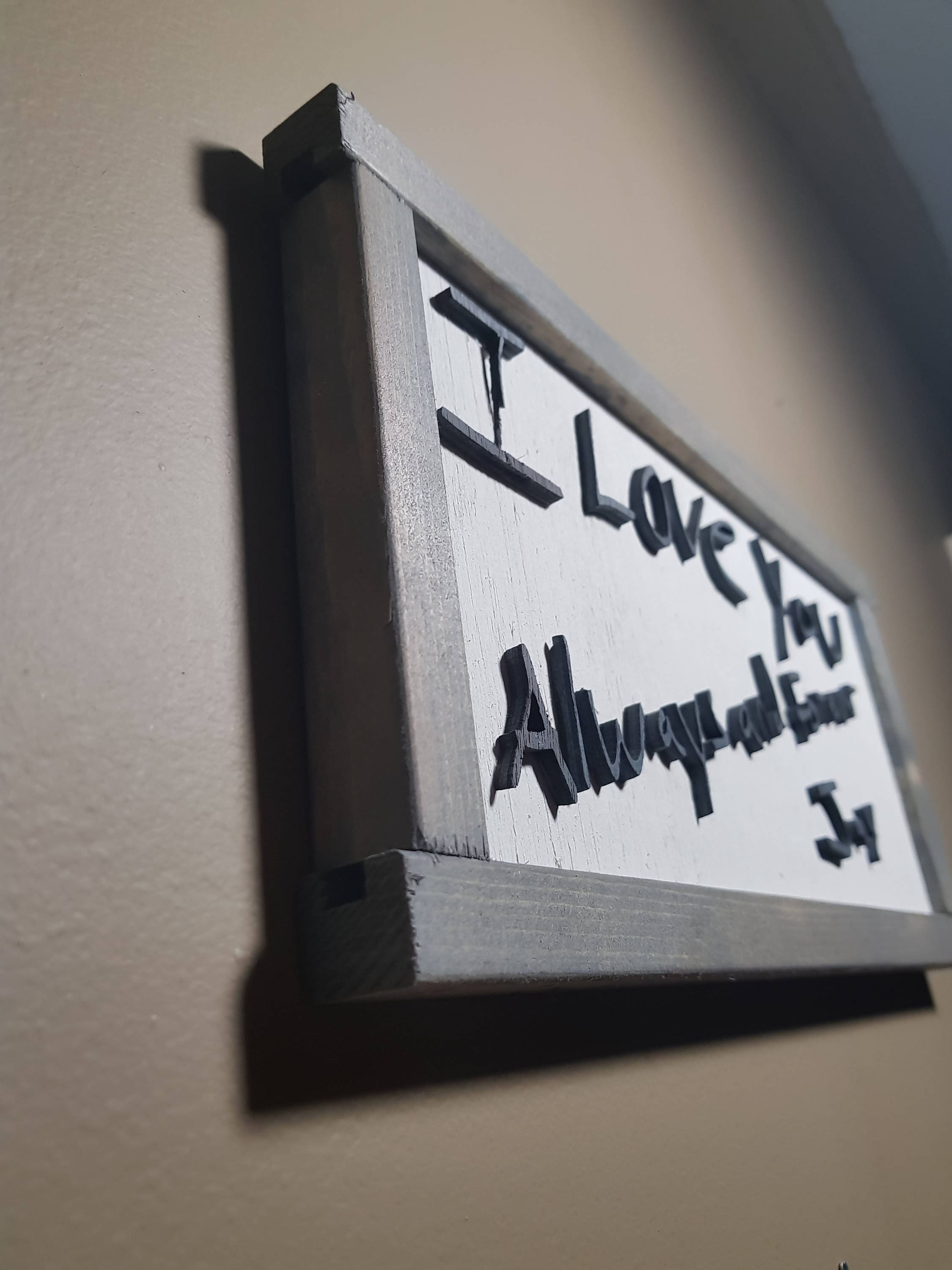 we take your handwriting, love letter, or proposal. cut it out of wood and attach it to a backer board and frame