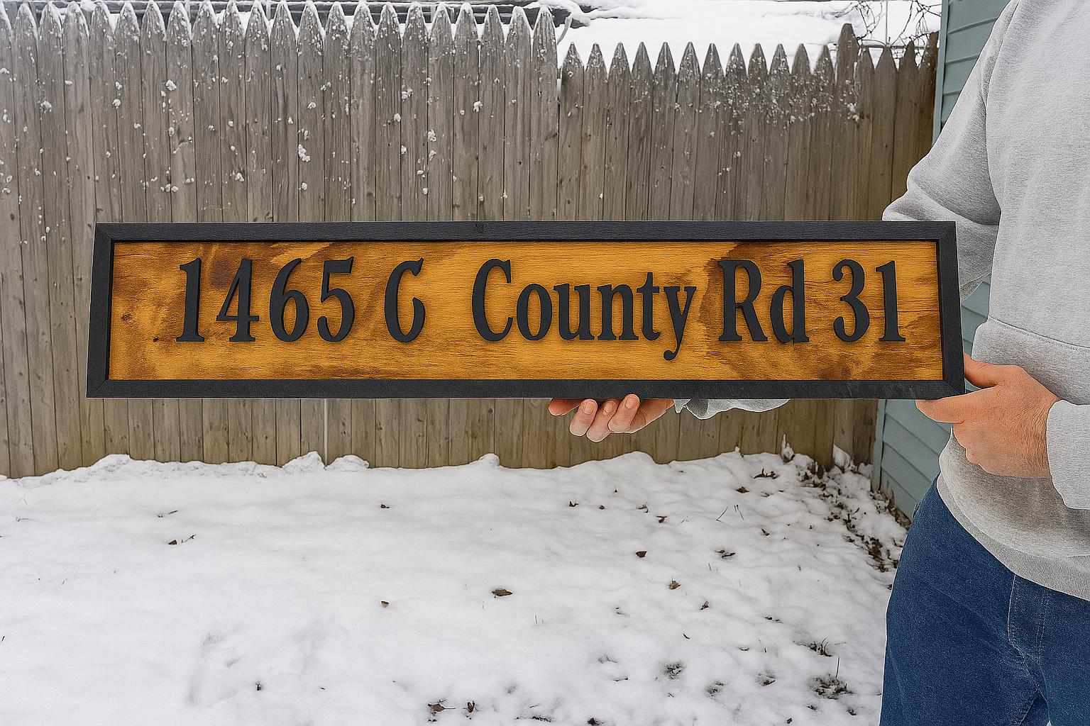📝 Description: Welcome guests with timeless charm! This handcrafted wooden address sign features bold, raised black lettering on a warm honey-toned wood base, framed in a sleek black border. Perfect for farmhouse, cabin, or country home aesthetics, each sign is made to order and great for outdoor / indoor
