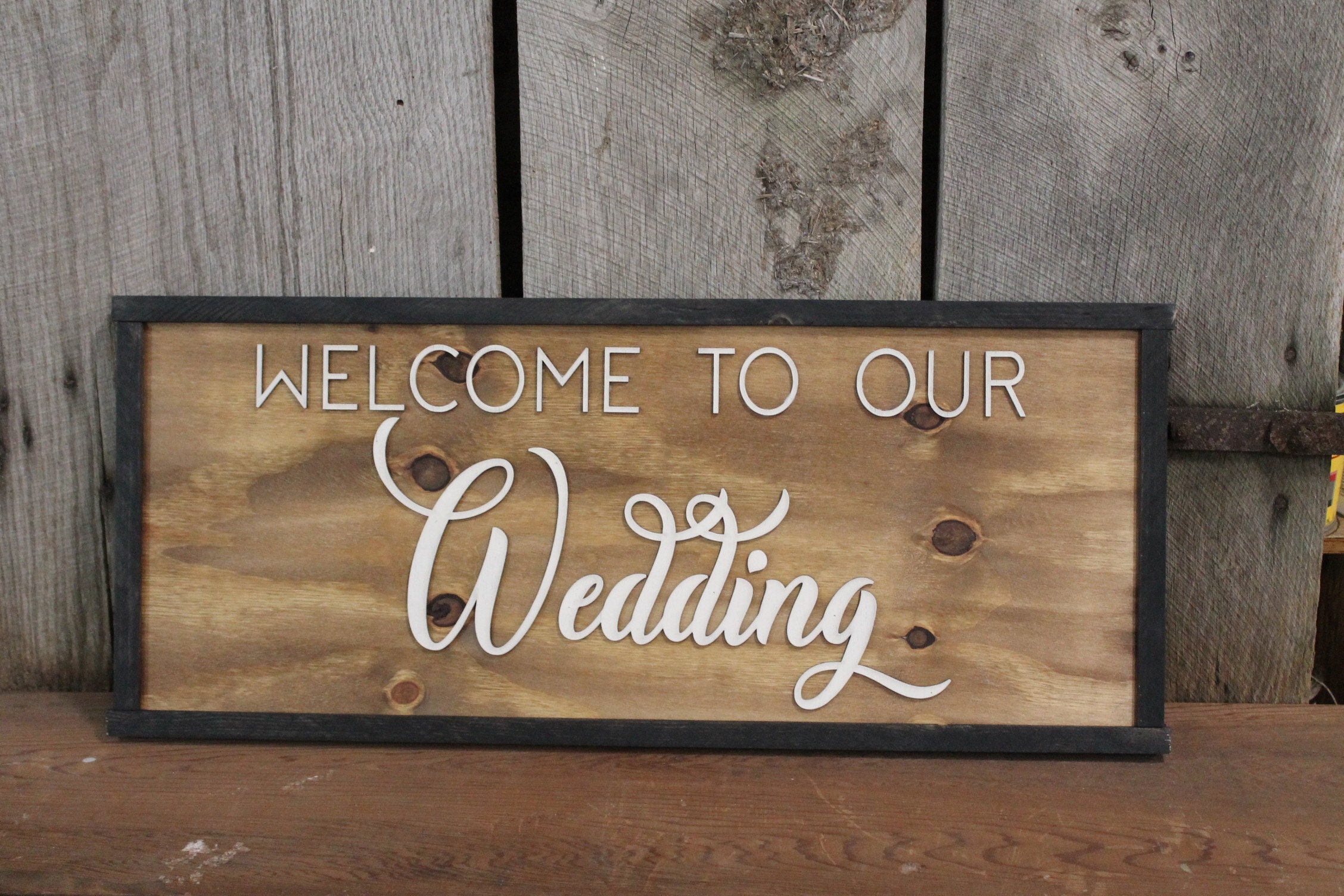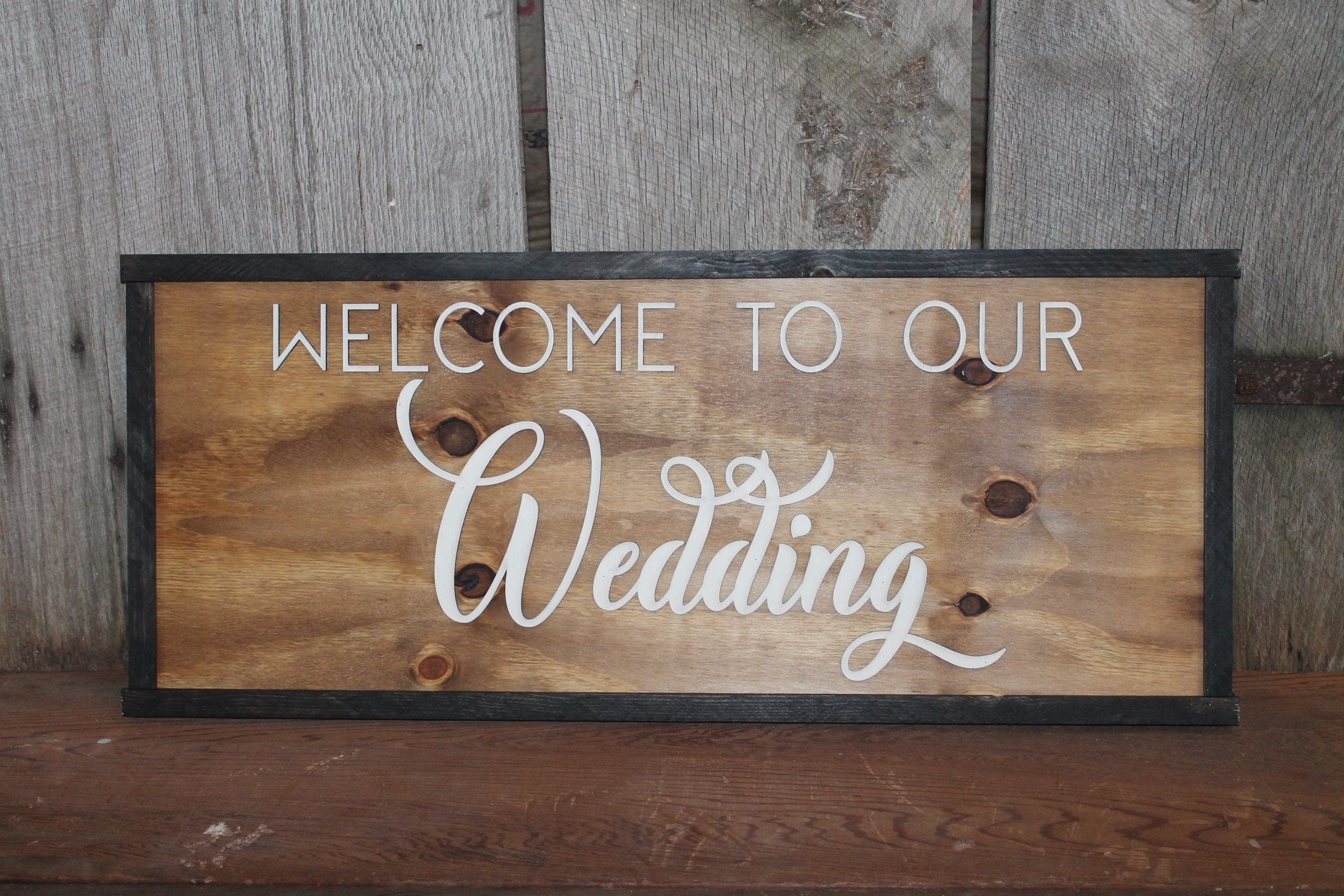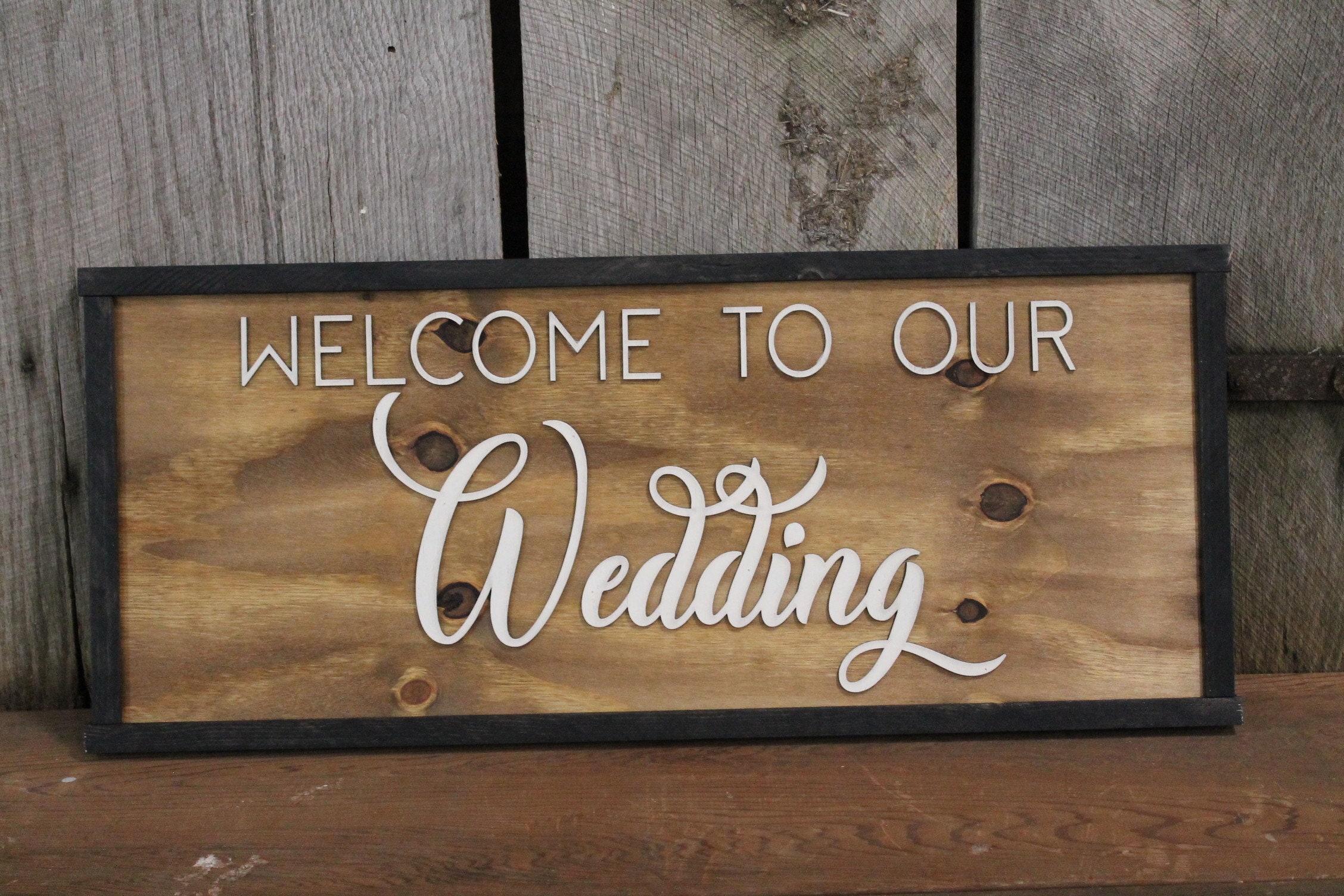 Rustic Welcome to Our Wedding Sign Raised Text Large Framed Primitive Barn Wood Country Signage 3D Reception Decoration Table
