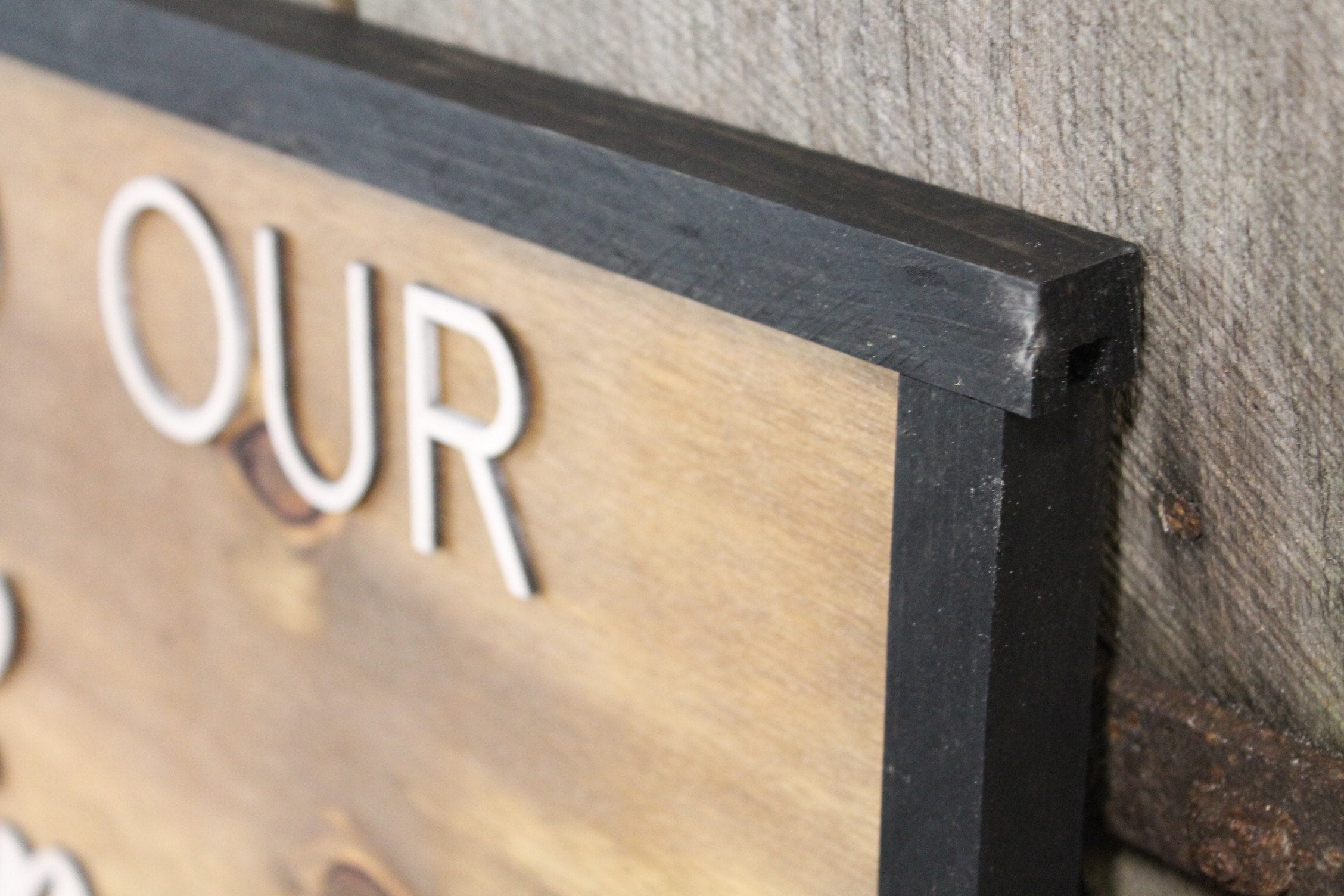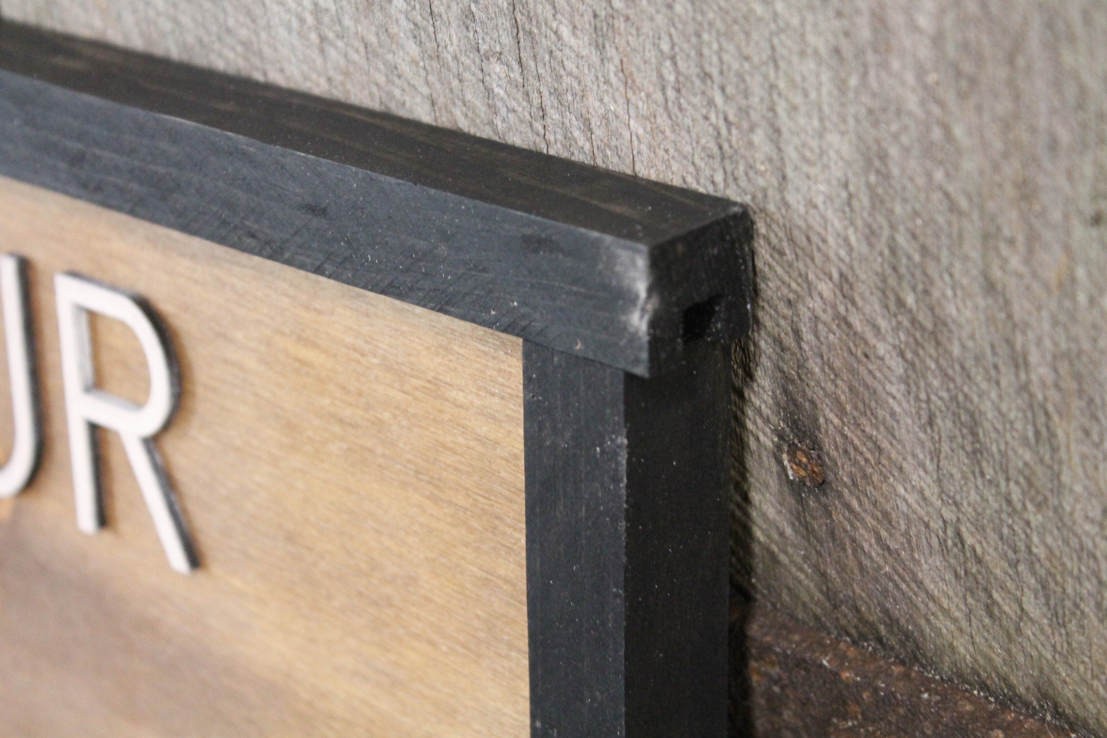 The item we are offering is a wonderful handmade, decorative sign. We are offering this sign in new sizes, so please review the pull-down menu of the listing! The size is in inches, and it is the overall size of the size, frame included. It is mounted on medium brown stained 3/8 inch plywood with 1/4 inch laser cut plywood letters. Complete with solid wood frame. The frame is stained in an ebony coloring.